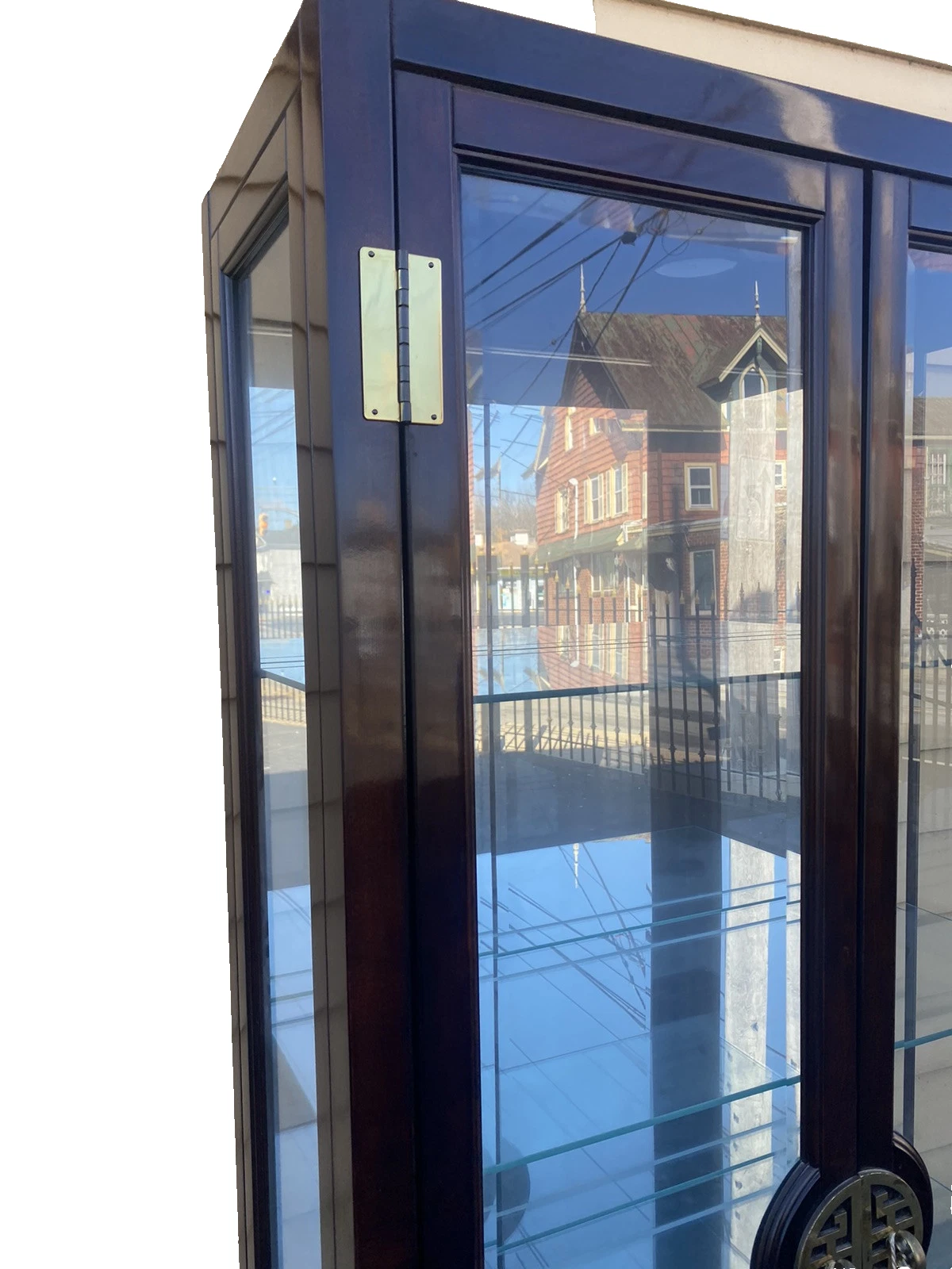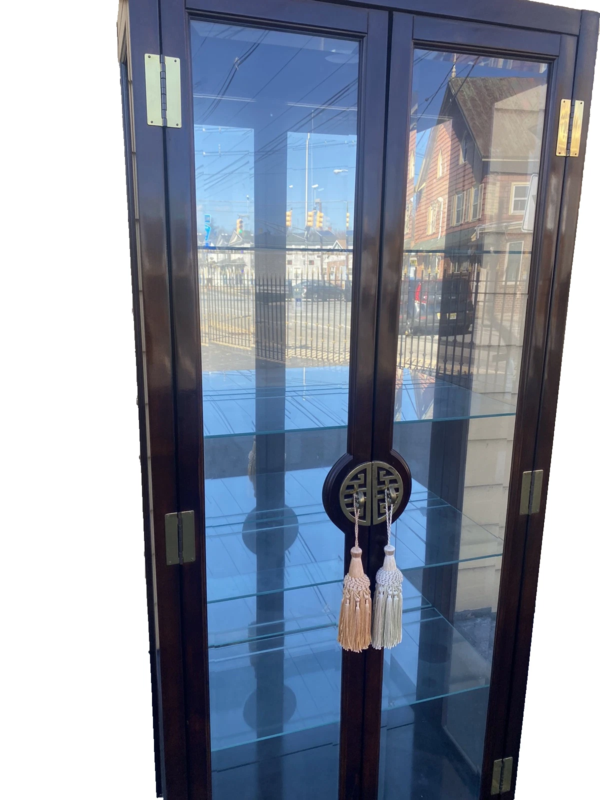 This exquisite American Furniture Oriental Curio China Cabinet embodies the fine craftsmanship of post-1950 design, combining traditional aesthetics with functional elegance. Meticulously handmade, its rich wood finish showcases intricate detailing that highlights its sturdy construction. With two doors revealing four spacious shelves, this curio cabinet is perfect for displaying cherished collectibles or heirlooms, adding a touch of warmth and character to any room. Embrace the charm of this unique piece that tells a story of craftsmanship and family heritage.