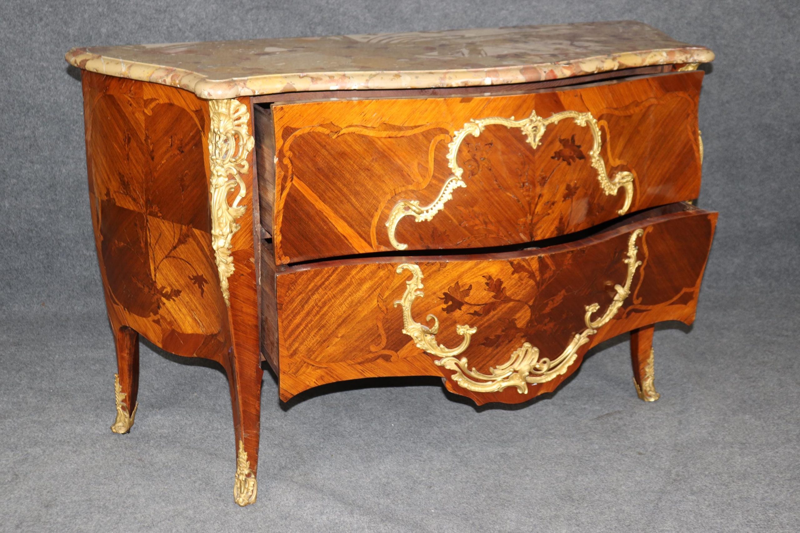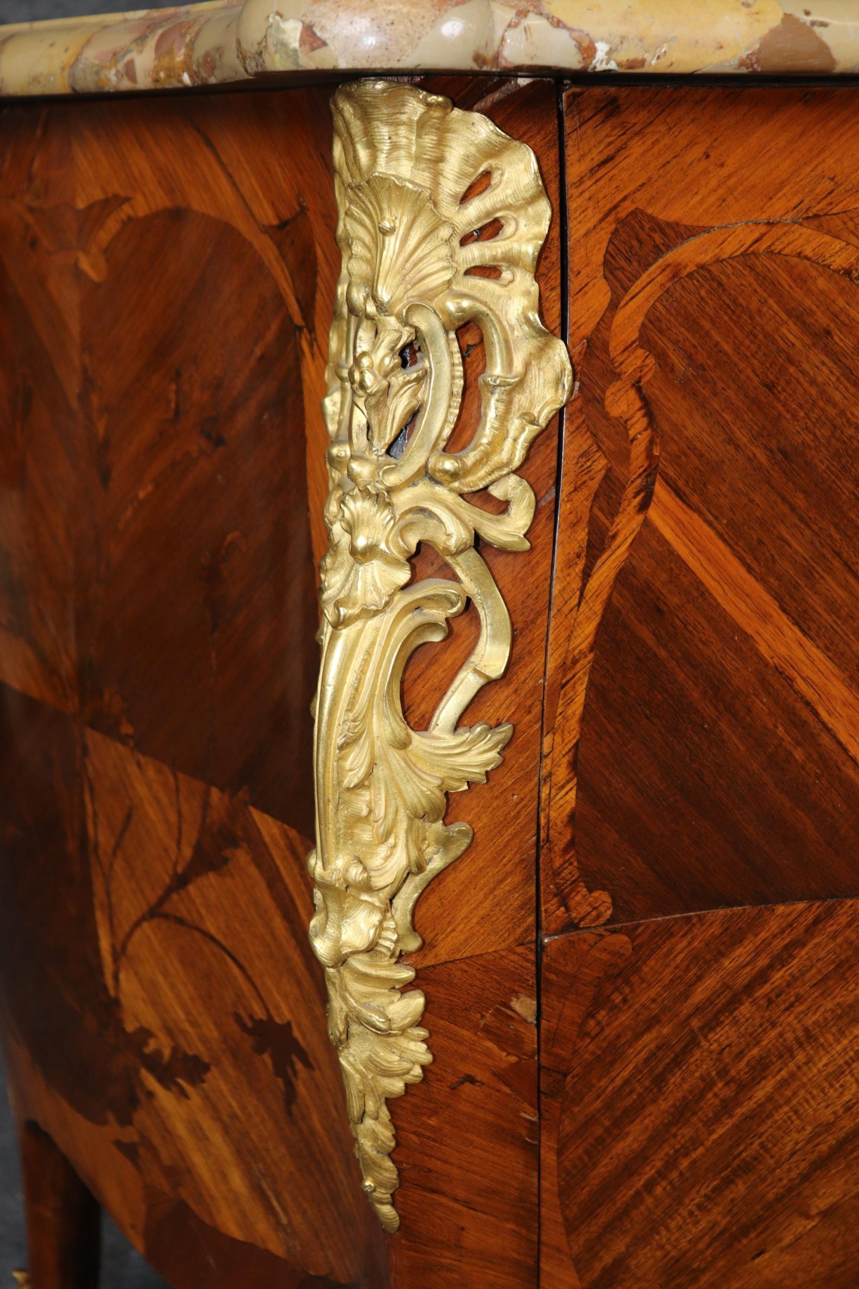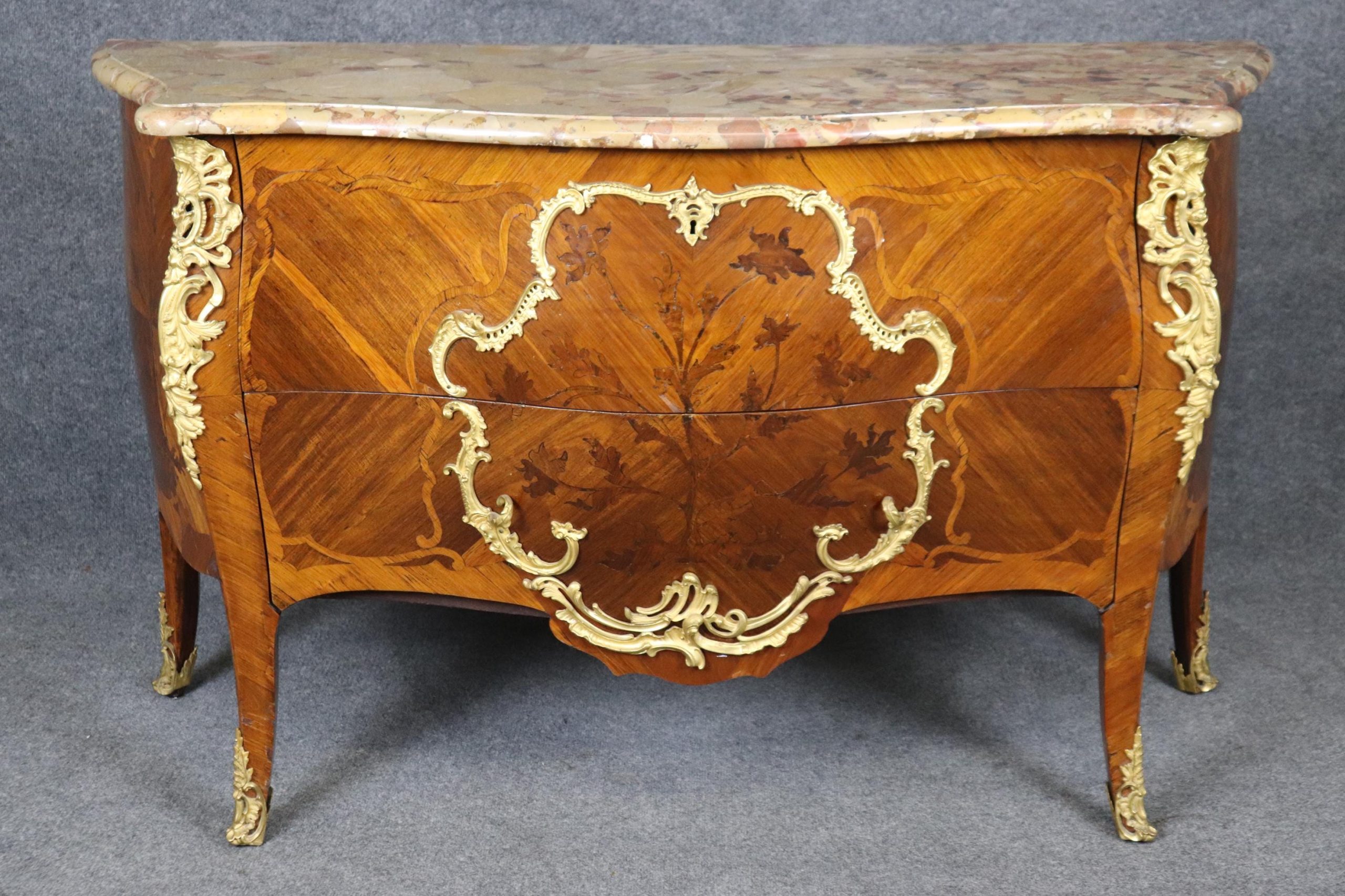 This 18th C. French Louis XV style inlaid marble top commode with ormolu mounts is an incredible example of 18th century French furniture! This piece is made of the highest quality and is equipped with two drawers as well as a marble top which truly separates it from the others. If you look closely you will also see the incredibly crisp bronze ormolu mounts. This piece is bound to bring a sense of elegance and sophistication into your home or place of choosing and will certainly be a topic of conversation at your next gathering or event! One nice thing about this piece is its lockable storage which makes it easy to keep your personal belongings safe and secure. This piece is an investment that can be passed down through multiple generations all while capturing a piece of history in your home. The commode is in good antique condition with the exception of some light surface scratches, minor veneer chips and some minor finish loss as to be expected with items of age and use.