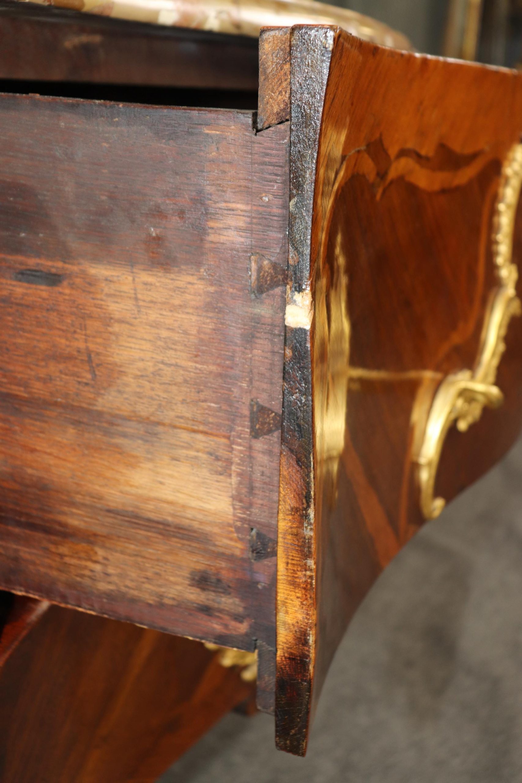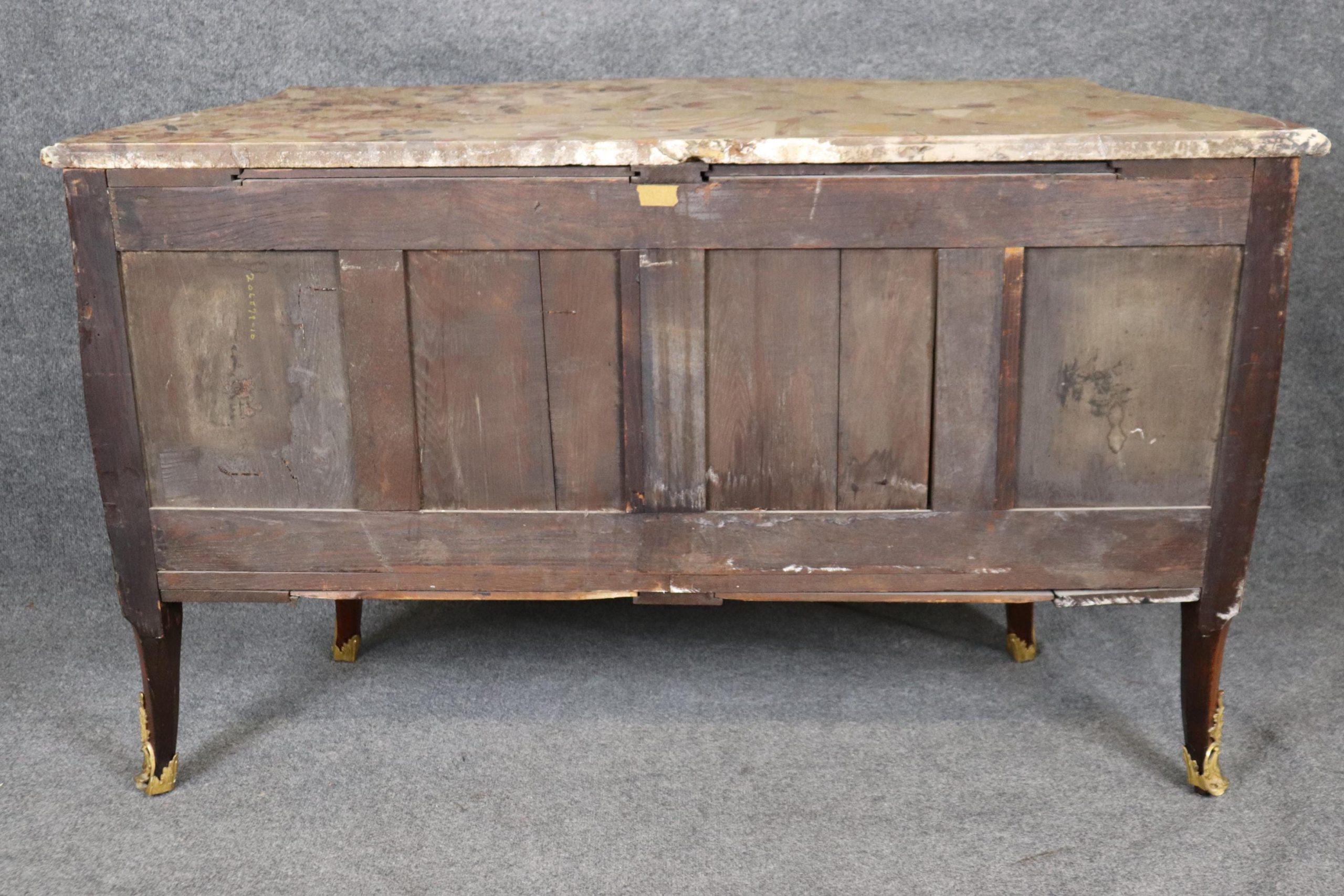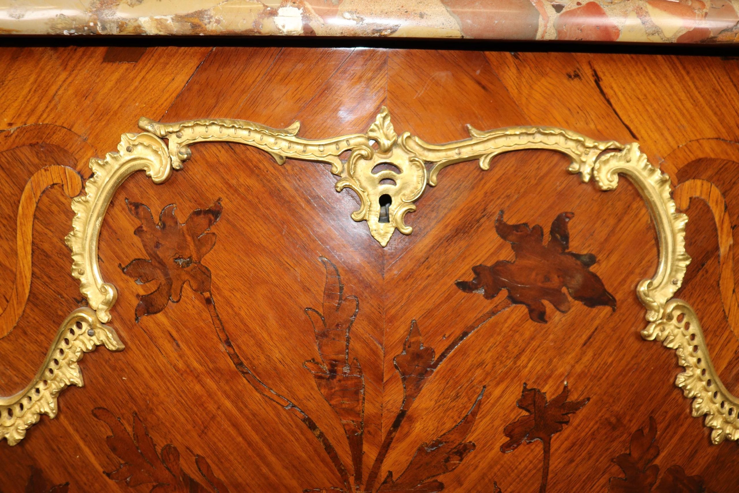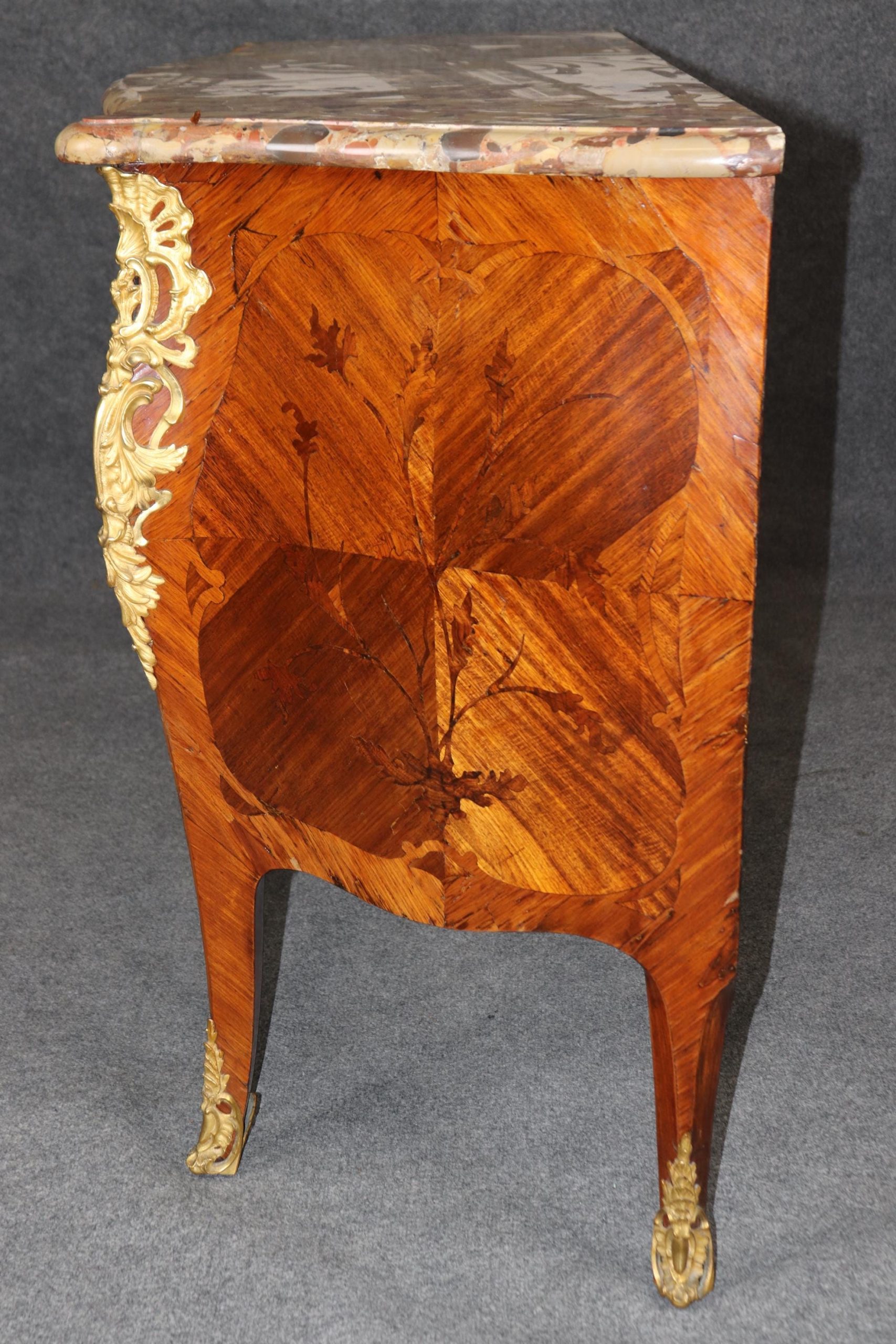 This 18th C. French Louis XV style inlaid marble top commode with ormolu mounts is an incredible example of 18th century French furniture! This piece is made of the highest quality and is equipped with two drawers as well as a marble top which truly separates it from the others. If you look closely you will also see the incredibly crisp bronze ormolu mounts. This piece is bound to bring a sense of elegance and sophistication into your home or place of choosing and will certainly be a topic of conversation at your next gathering or event! One nice thing about this piece is its lockable storage which makes it easy to keep your personal belongings safe and secure. This piece is an investment that can be passed down through multiple generations all while capturing a piece of history in your home. The commode is in good antique condition with the exception of some light surface scratches, minor veneer chips and some minor finish loss as to be expected with items of age and use.