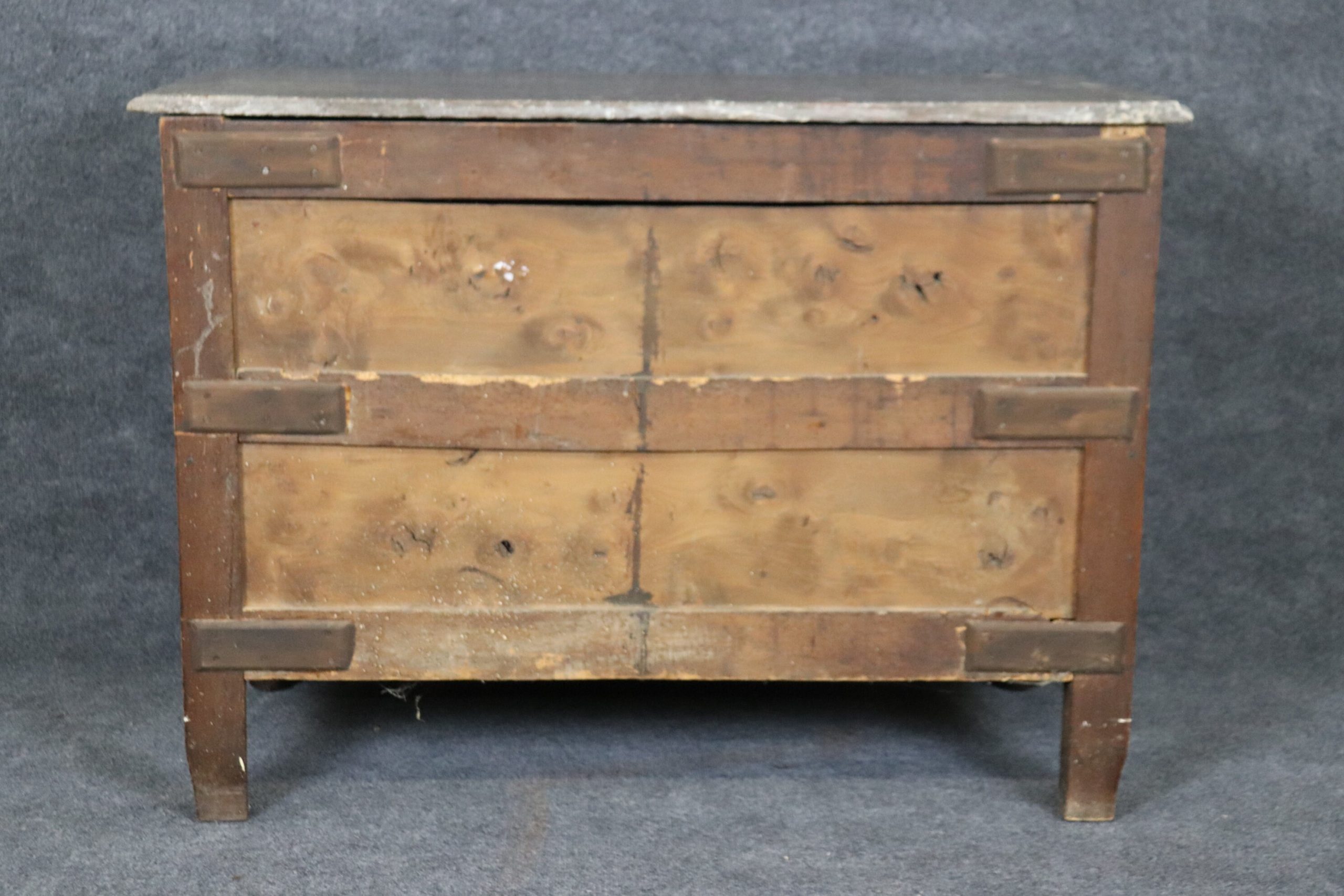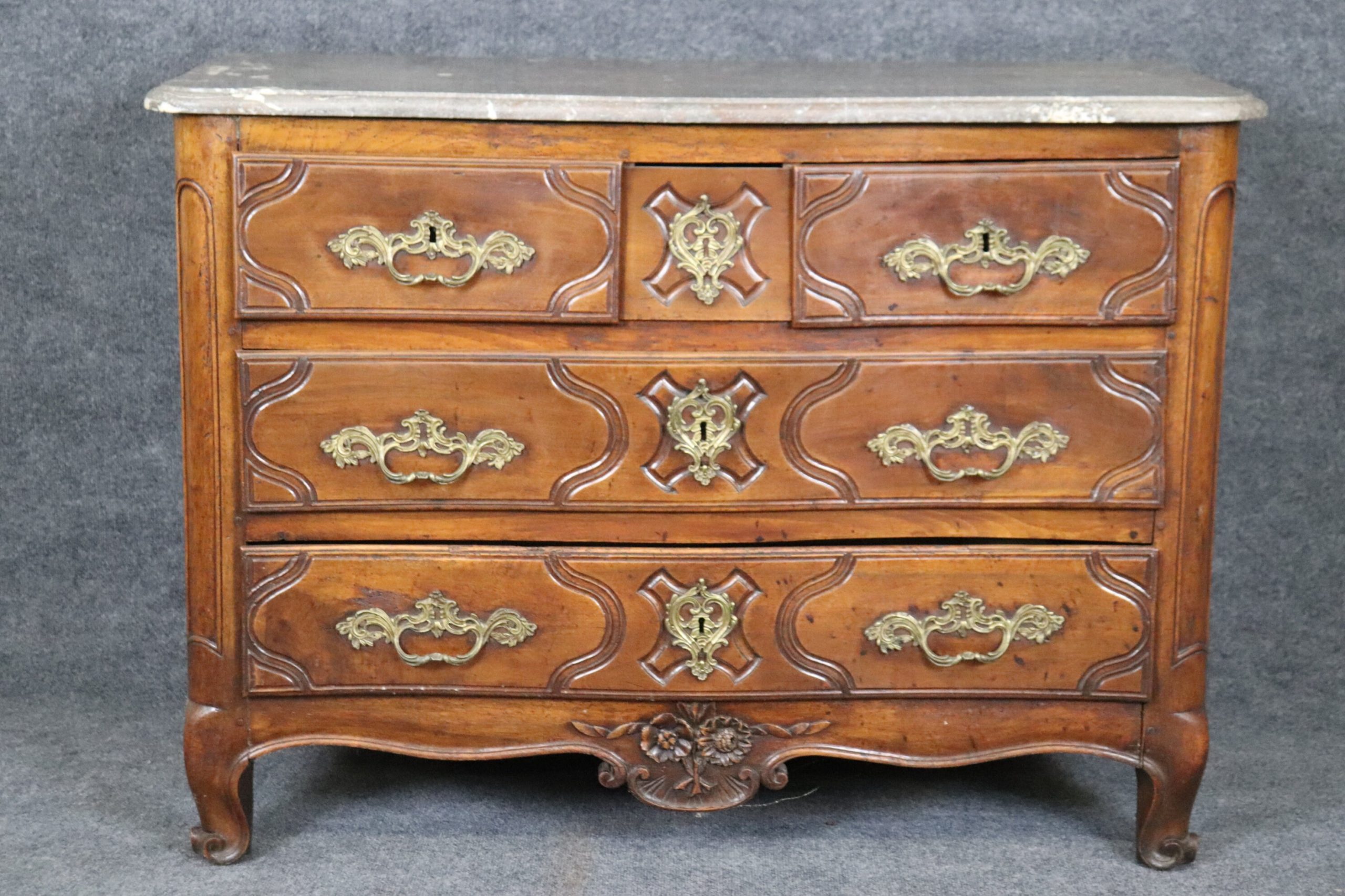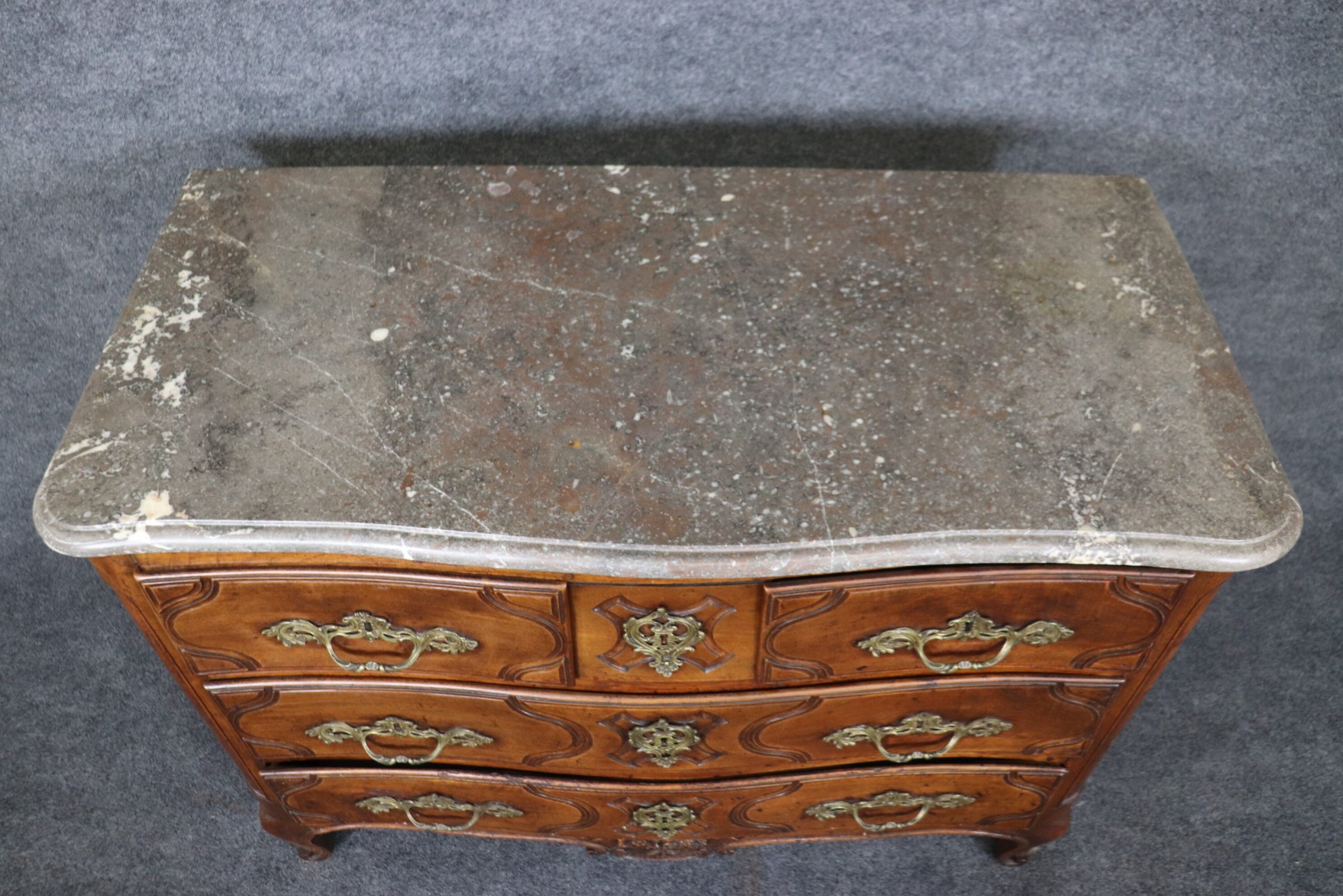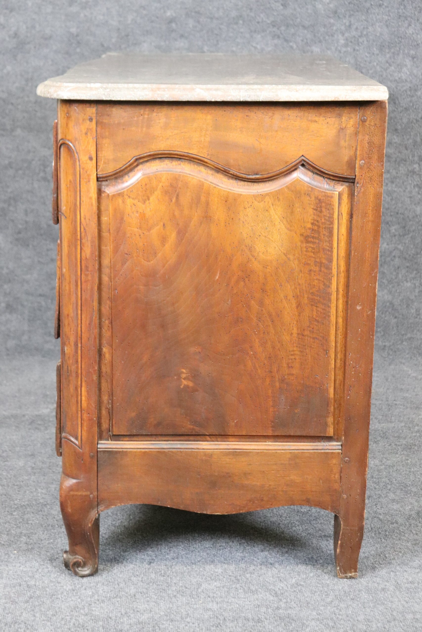 This antique 18th C. Country French marble top commode is a great example of quality french furniture! The commode has 4 drawers, perfect for storing your personal belongings all while delivering a nice look into your home! This is a piece that will last you for many years and will add a sense of luxury into your entryway, living room, office or place of your choosing! One indicator that lets us know that this piece is in-fact 18th century is the small pegs you can see at the joints of the furniture as well as construction of the drawer and the dovetailing on the side of each drawer. The commode is in good antique condition with some minor surface scratches and blemishes/ Minor finish loss and worm holes, otherwise good condition and completely normal for an item of this age.
