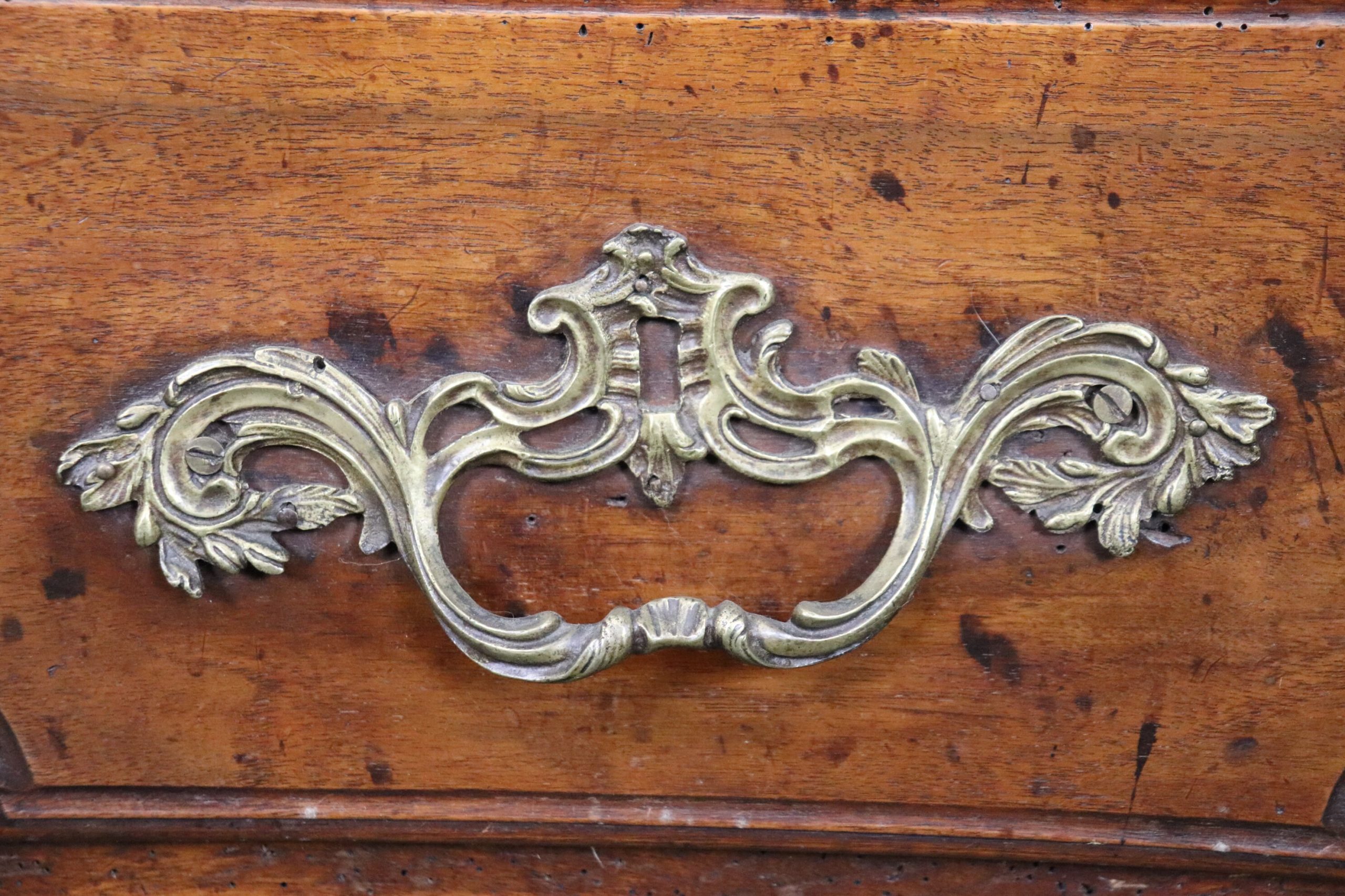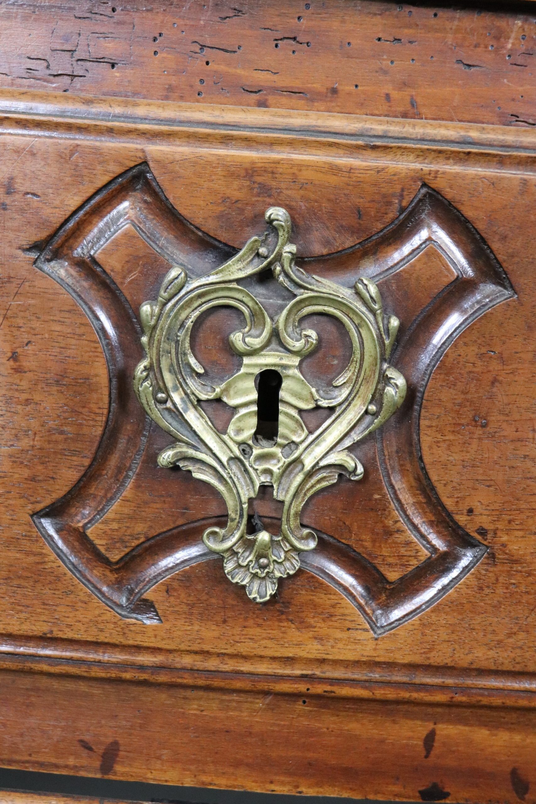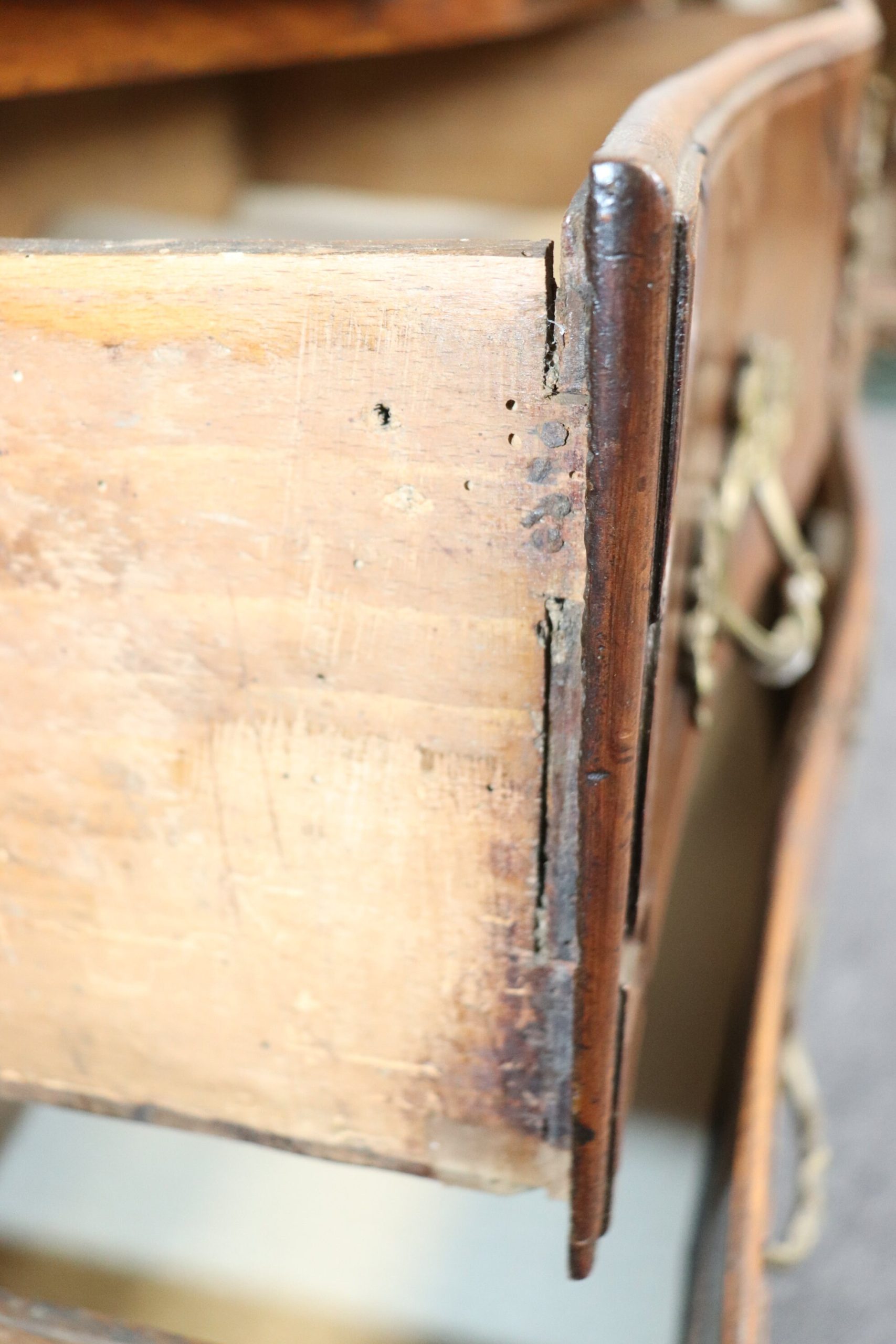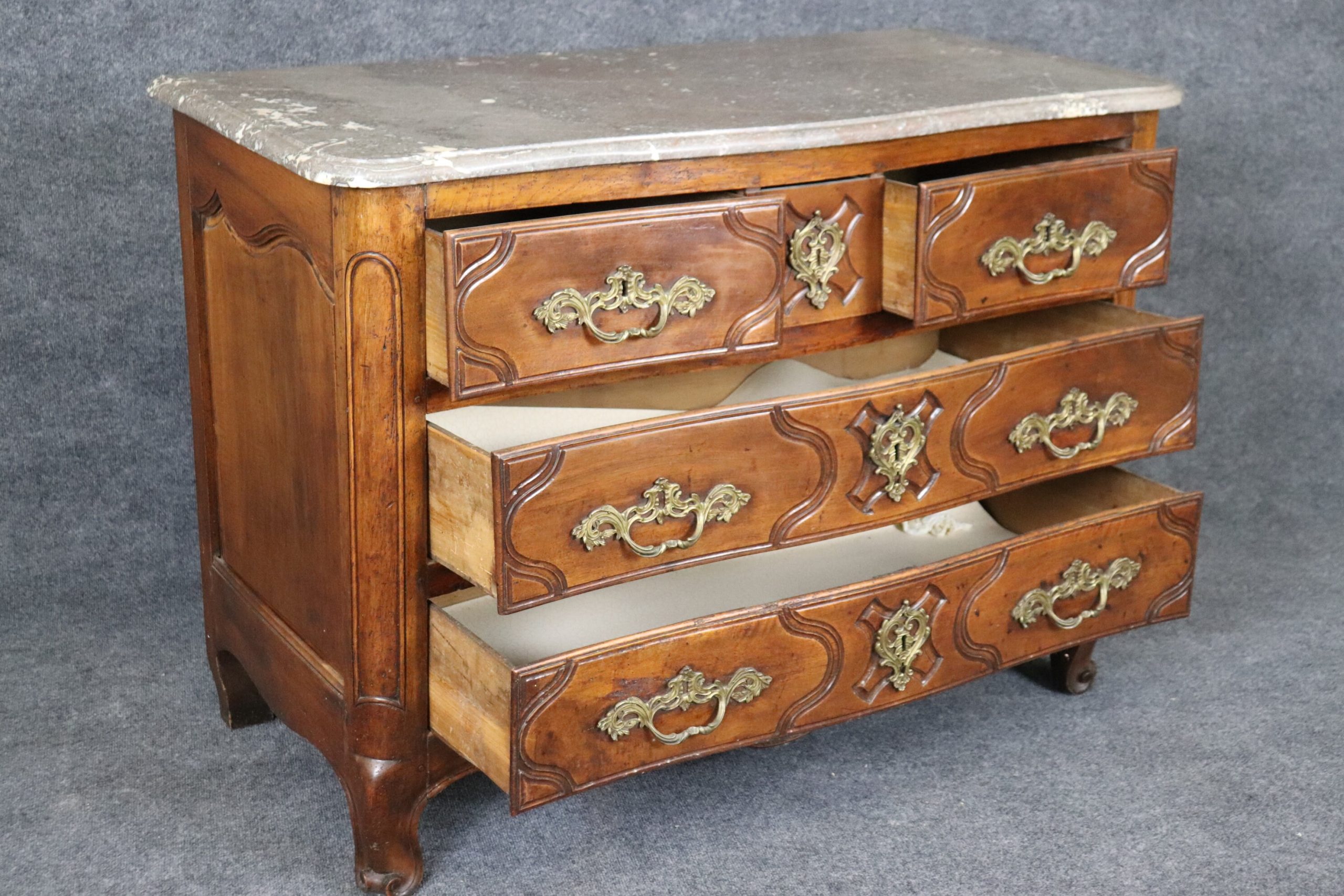This antique 18th C. Country French marble top commode is a great example of quality french furniture! The commode has 4 drawers, perfect for storing your personal belongings all while delivering a nice look into your home! This is a piece that will last you for many years and will add a sense of luxury into your entryway, living room, office or place of your choosing! One indicator that lets us know that this piece is in-fact 18th century is the small pegs you can see at the joints of the furniture as well as construction of the drawer and the dovetailing on the side of each drawer. The commode is in good antique condition with some minor surface scratches and blemishes/ Minor finish loss and worm holes, otherwise good condition and completely normal for an item of this age.
