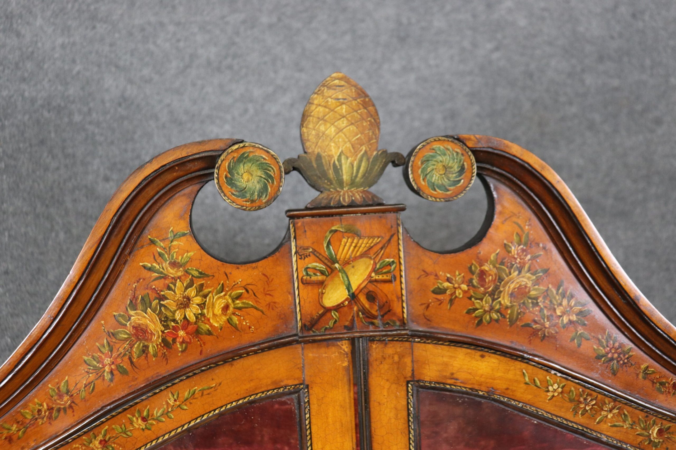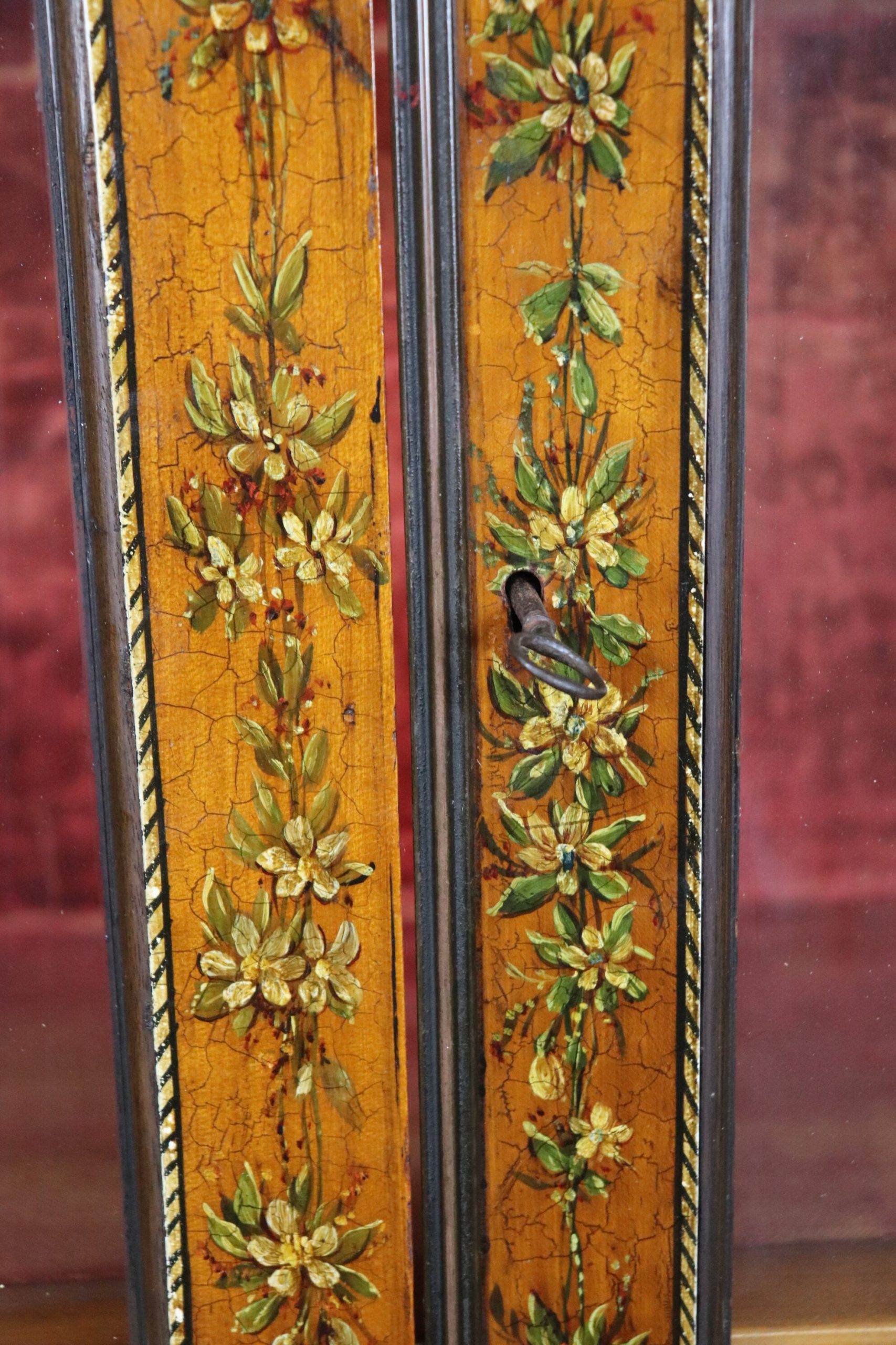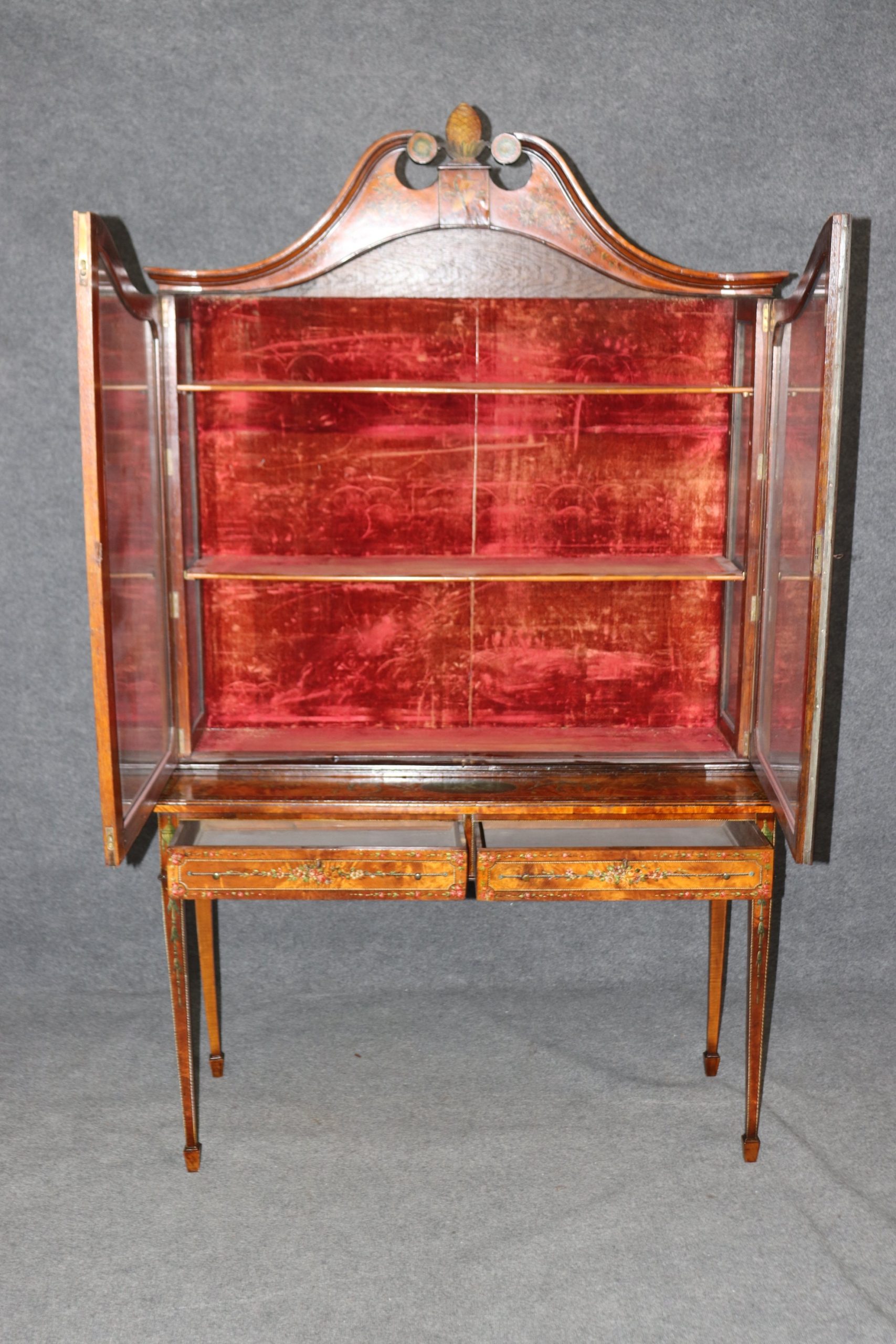 This antique 19th century English Adams style curio cabinet vitrine is made of the highest quality! If you look at the photos provided, you will see the beautiful ornate paint decoration throughout the piece! This is a perfect conversation piece for any entryway, living room, office or place of your choosing and will surely have your guests mesmerized by its attention to detail and fine craftsmanship! This is equipped 3 shelves, perfect for showcasing your personal belongings, and 2 drawers, all while bringing a sense of luxury and class into your home! Antique furniture has stood the test of time and this display cabinet/china cabinet is no exception! The cabinet is in good antique condition with some finish loss and surface scratches as well as severe wear to the original velvet lining on the shelves as to be expected, otherwise in good condition.