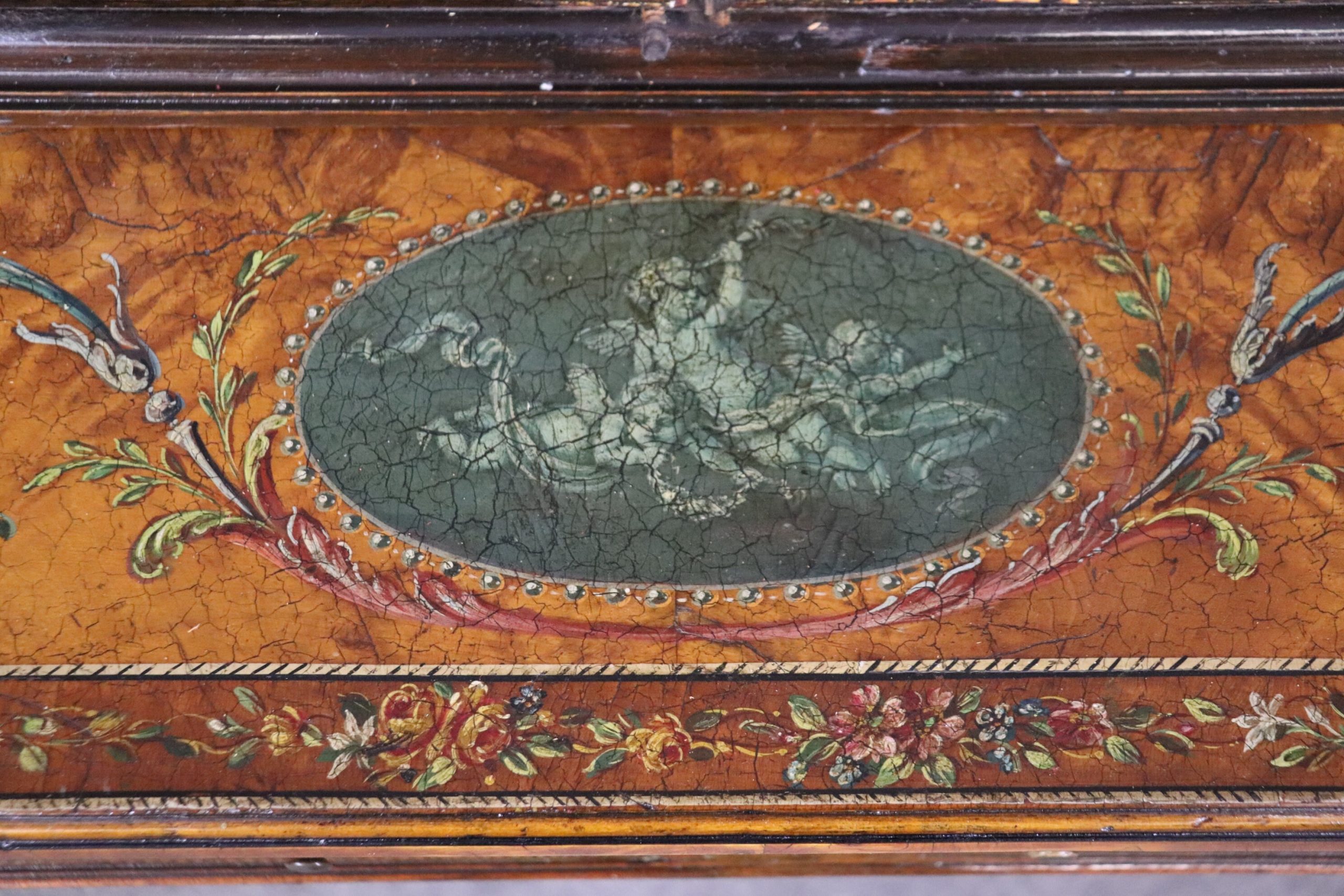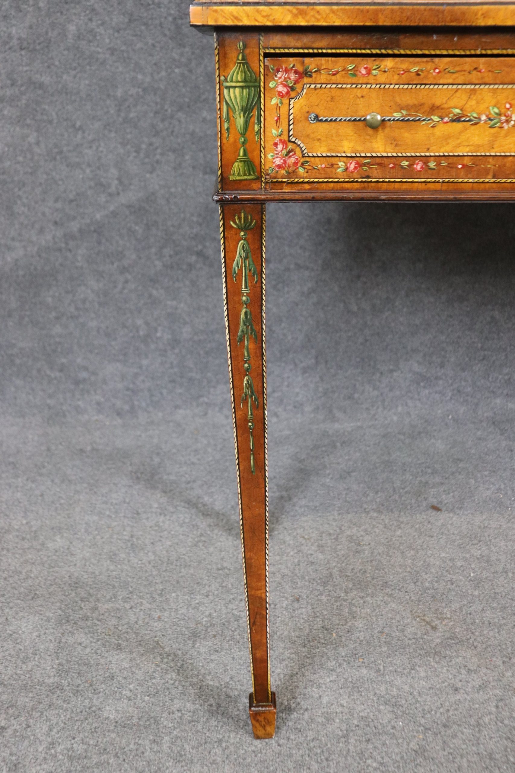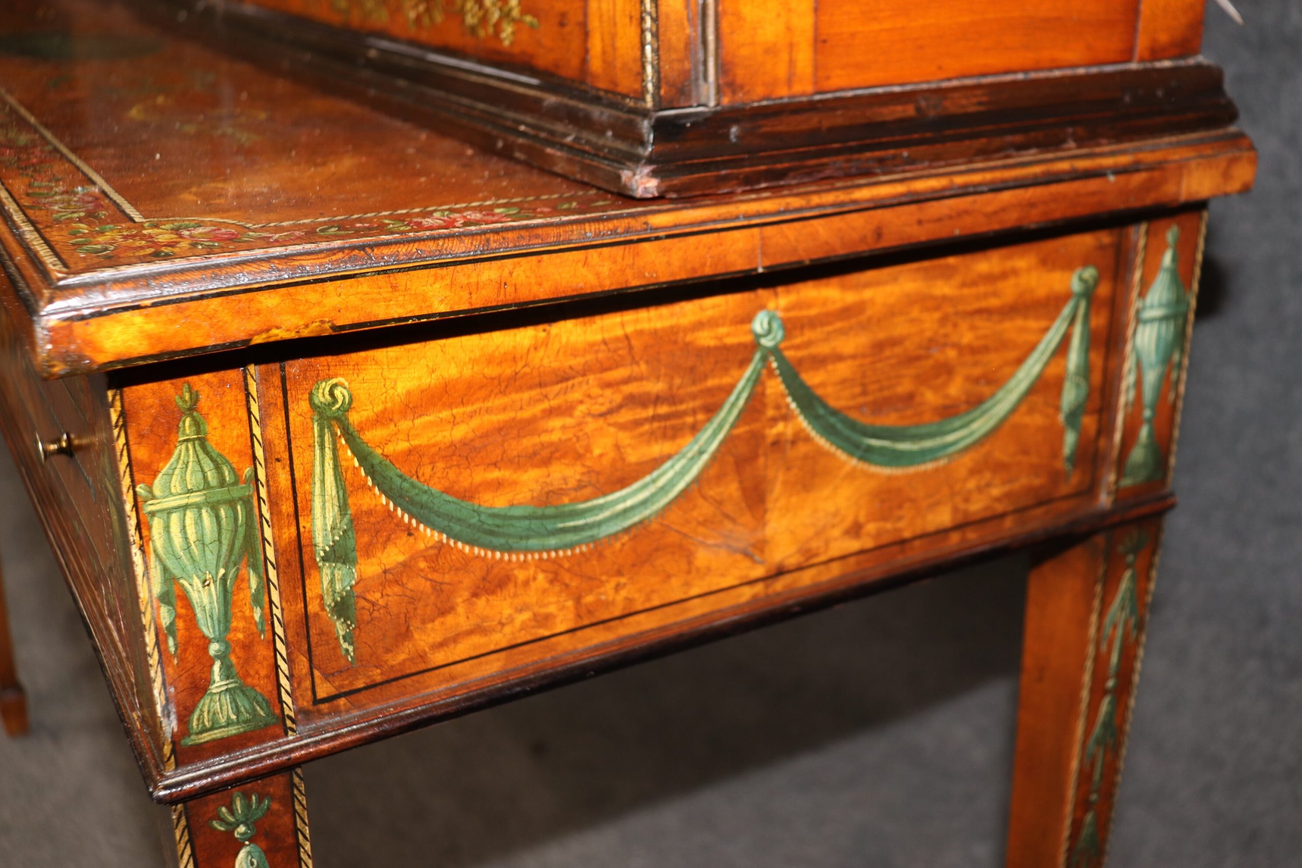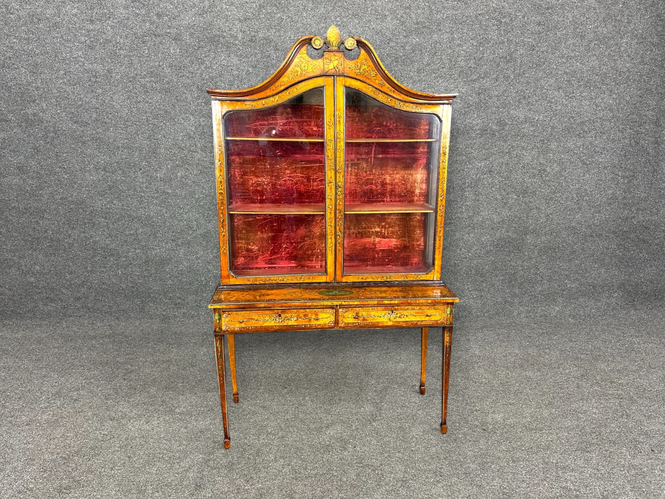 This antique 19th century English Adams style curio cabinet vitrine is made of the highest quality! If you look at the photos provided, you will see the beautiful ornate paint decoration throughout the piece! This is a perfect conversation piece for any entryway, living room, office or place of your choosing and will surely have your guests mesmerized by its attention to detail and fine craftsmanship! This is equipped 3 shelves, perfect for showcasing your personal belongings, and 2 drawers, all while bringing a sense of luxury and class into your home! Antique furniture has stood the test of time and this display cabinet/china cabinet is no exception! The cabinet is in good antique condition with some finish loss and surface scratches as well as severe wear to the original velvet lining on the shelves as to be expected, otherwise in good condition.