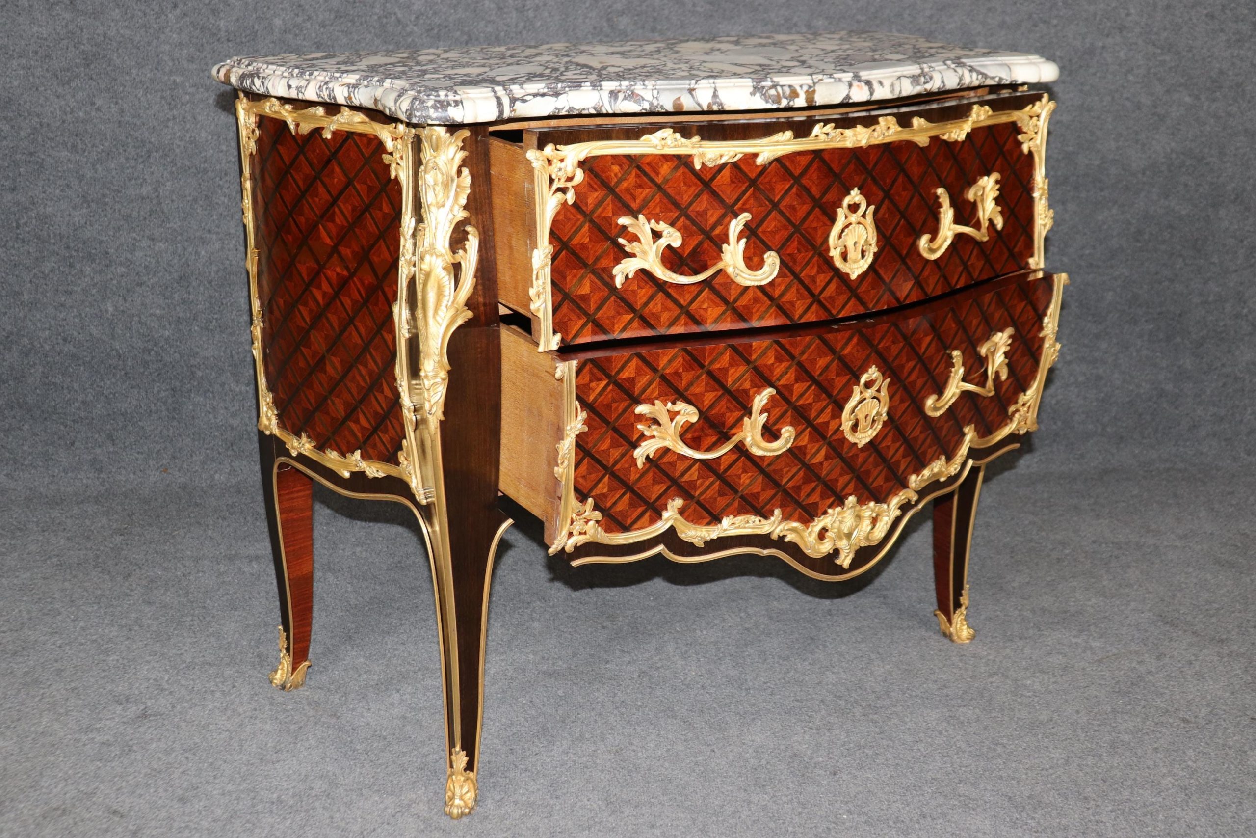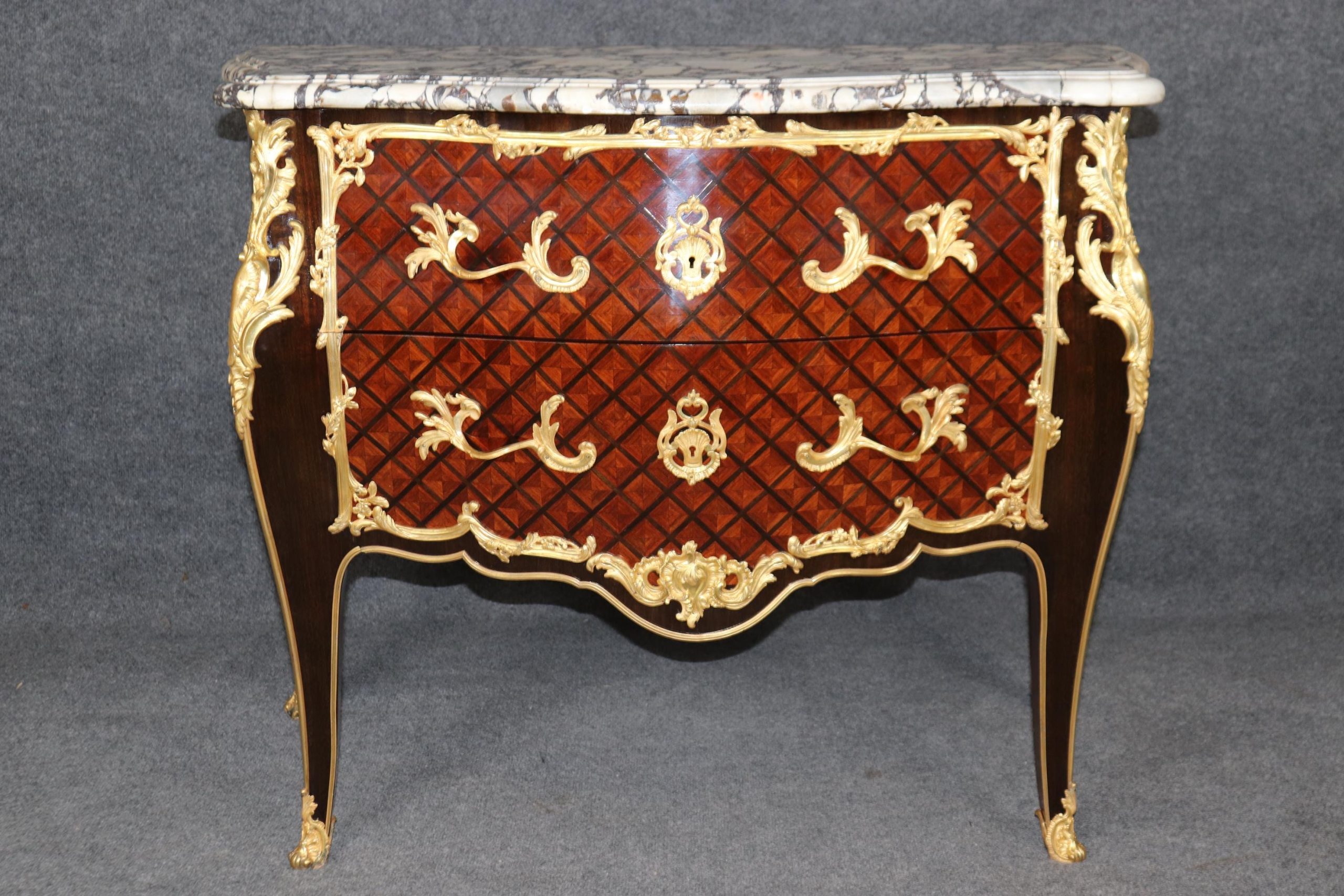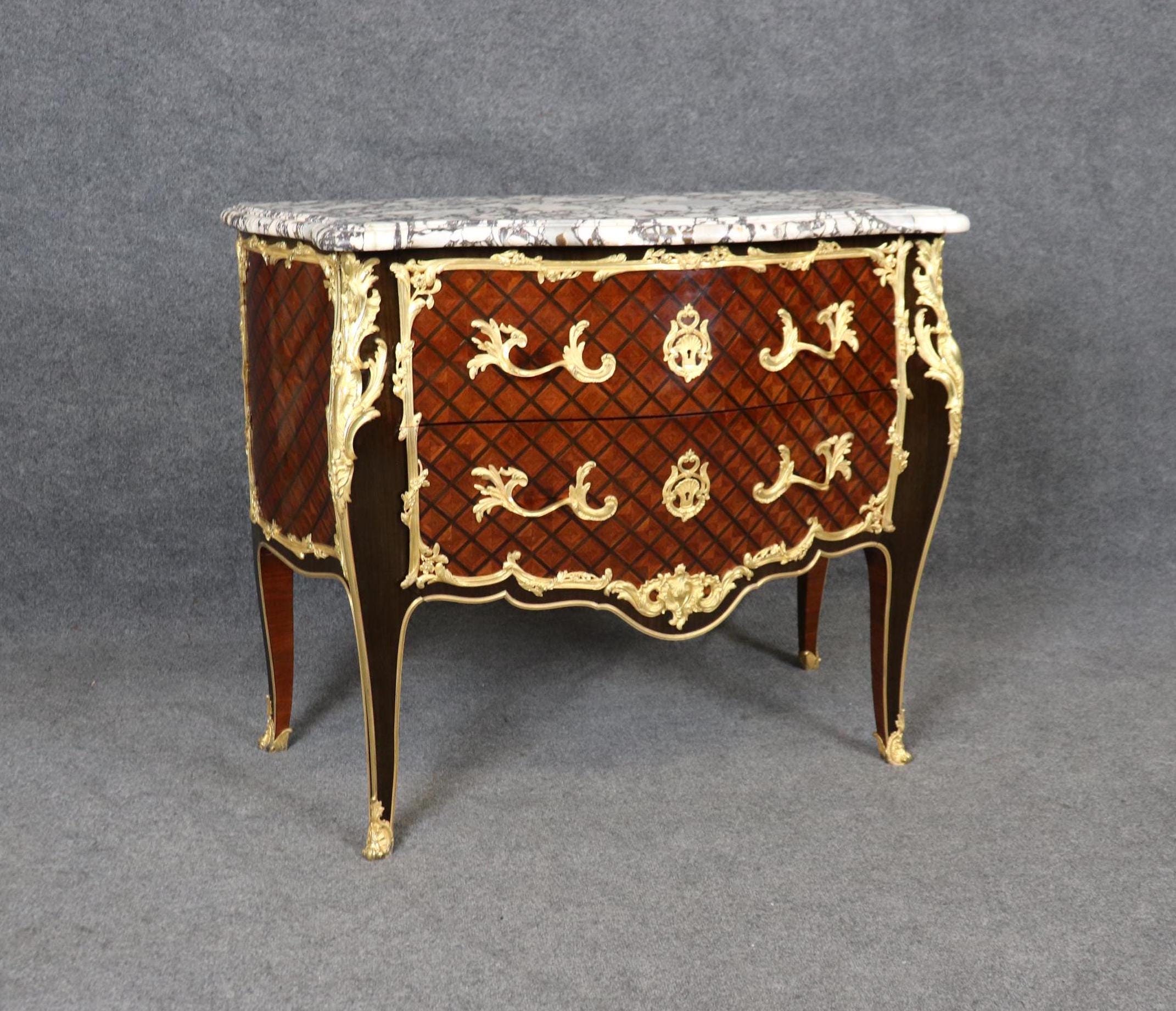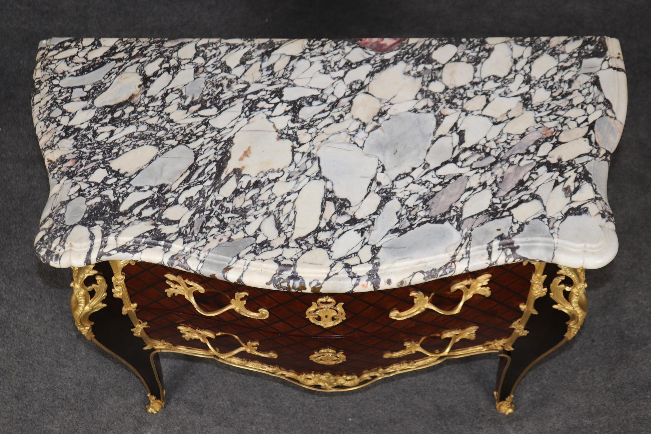 This RARE antique 19th century French Louis XV style ormolu mounted marble top commode by Maison Roudillon for Alavoine & Co. is an incredible example of 19th century French furniture! This piece is made of the highest quality and is equipped with two spacious drawers as well as a French Brèche Violette marble top which truly separates it from the others. If you look closely you will also see the incredibly crisp chased bronze ormolu mounts which are of the finest quality. This piece also features a lovely french polished finish something that takes weeks to complete. It involves applying over 50 coats of shellac by hand using rubber wrapped in a cloth and requires countless hours to create the high gloss glass like finish. This piece is bound to bring a sense of elegance and sophistication into your home or place of choosing and will certainly be a topic of conversation at your next gathering or event! One nice thing about this piece is its lockable storage which makes it easy to keep your personal belongings safe and secure. There is records of an almost identical commode that was made by the Famous Francois Linke Both of the same quality standard. This piece is an investment that can be passed down through multiple generations all while capturing a piece of history from a bygone era. The commode is in good antique condition with the exception of some light surface scratches and some minor finish loss as to be expected with items of age and use.