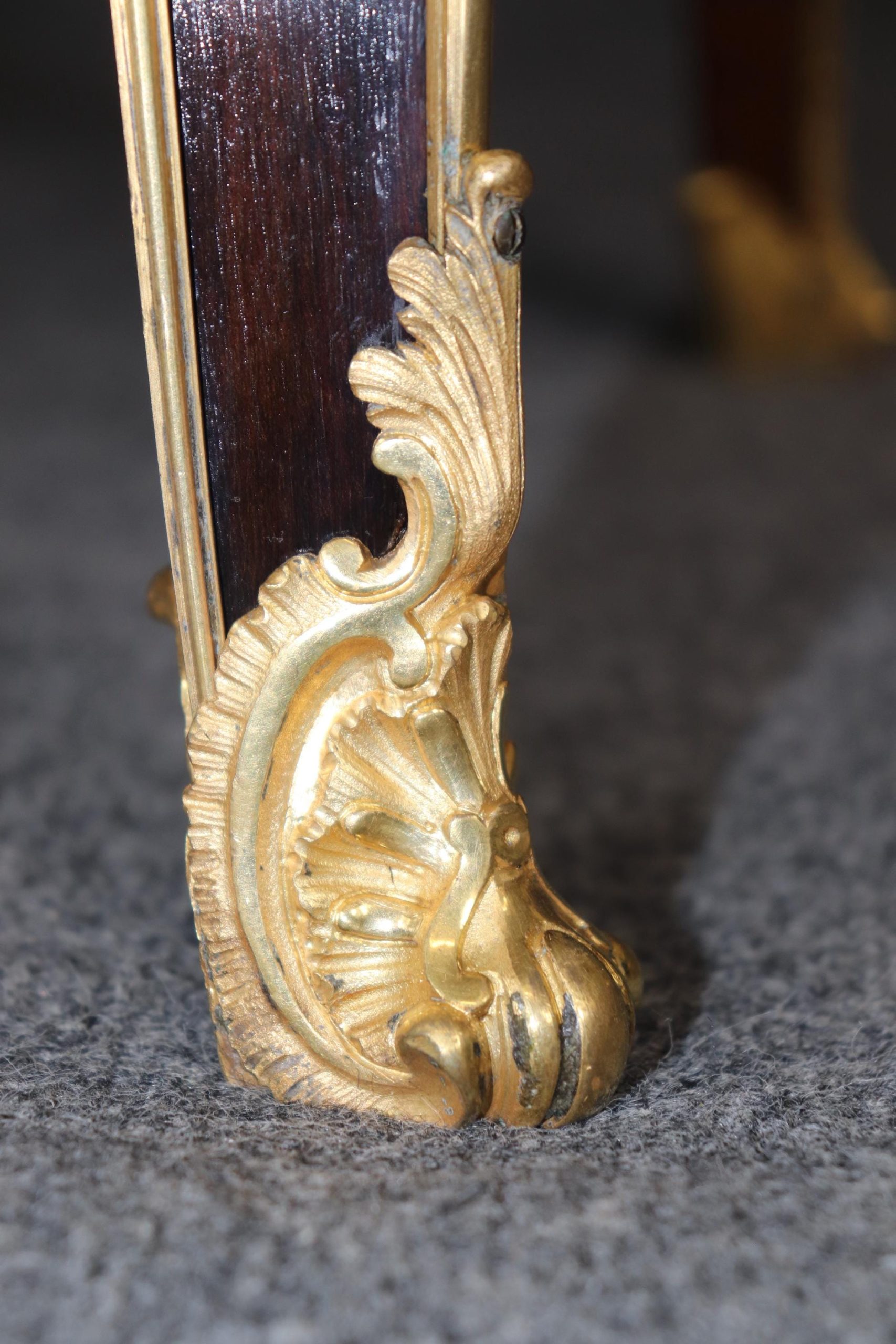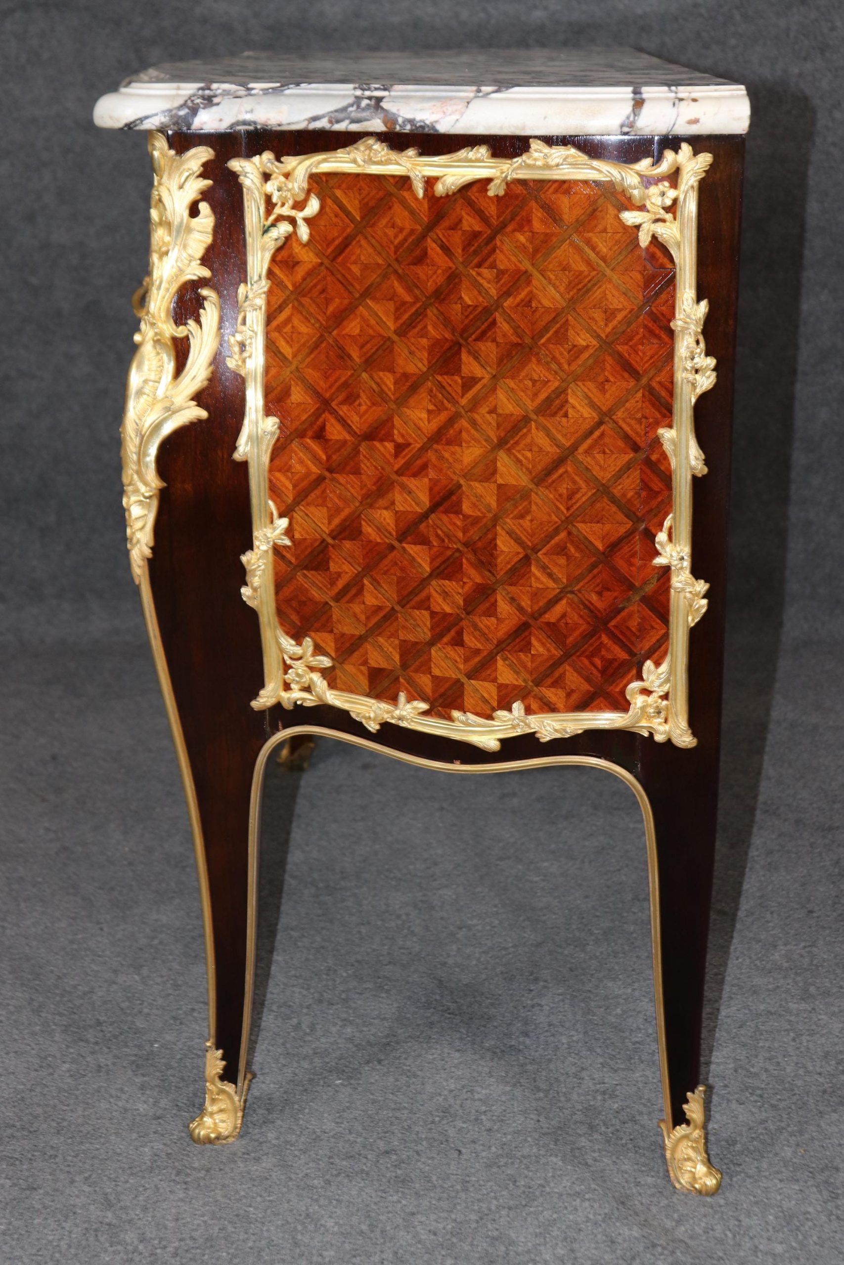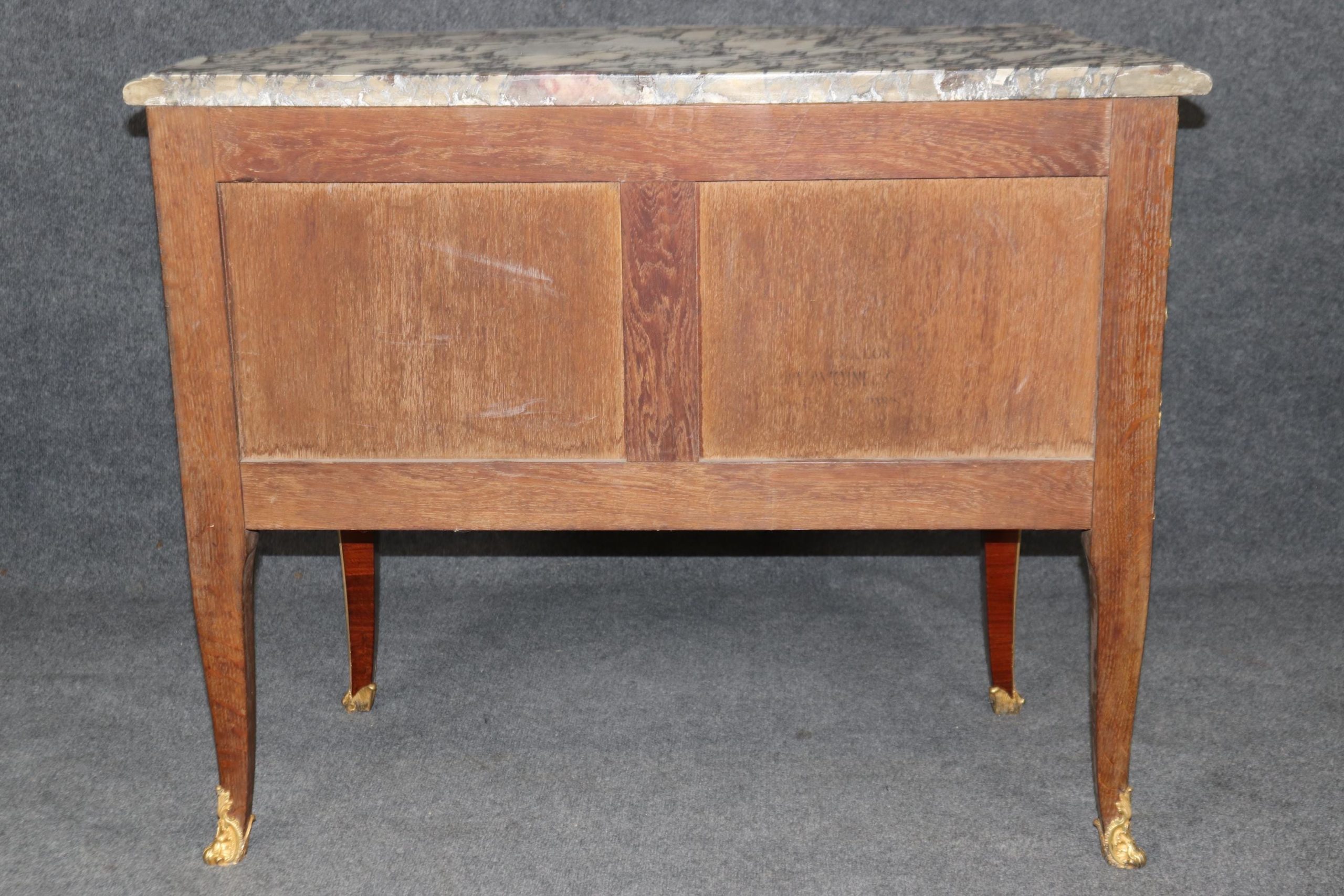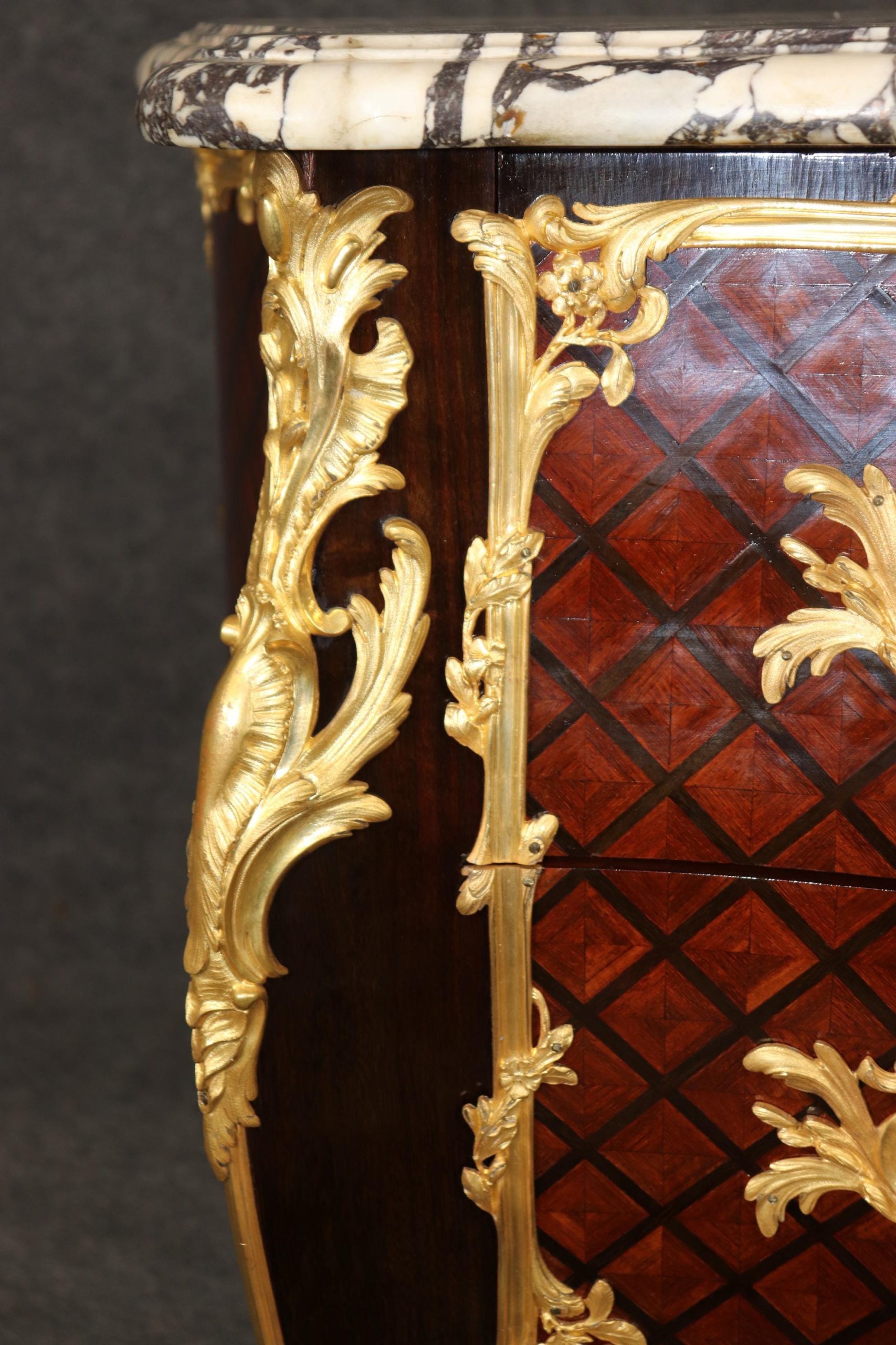 This RARE antique 19th century French Louis XV style ormolu mounted marble top commode by Maison Roudillon for Alavoine & Co. is an incredible example of 19th century French furniture! This piece is made of the highest quality and is equipped with two spacious drawers as well as a French Brèche Violette marble top which truly separates it from the others. If you look closely you will also see the incredibly crisp chased bronze ormolu mounts which are of the finest quality. This piece also features a lovely french polished finish something that takes weeks to complete. It involves applying over 50 coats of shellac by hand using rubber wrapped in a cloth and requires countless hours to create the high gloss glass like finish. This piece is bound to bring a sense of elegance and sophistication into your home or place of choosing and will certainly be a topic of conversation at your next gathering or event! One nice thing about this piece is its lockable storage which makes it easy to keep your personal belongings safe and secure. There is records of an almost identical commode that was made by the Famous Francois Linke Both of the same quality standard. This piece is an investment that can be passed down through multiple generations all while capturing a piece of history from a bygone era. The commode is in good antique condition with the exception of some light surface scratches and some minor finish loss as to be expected with items of age and use.