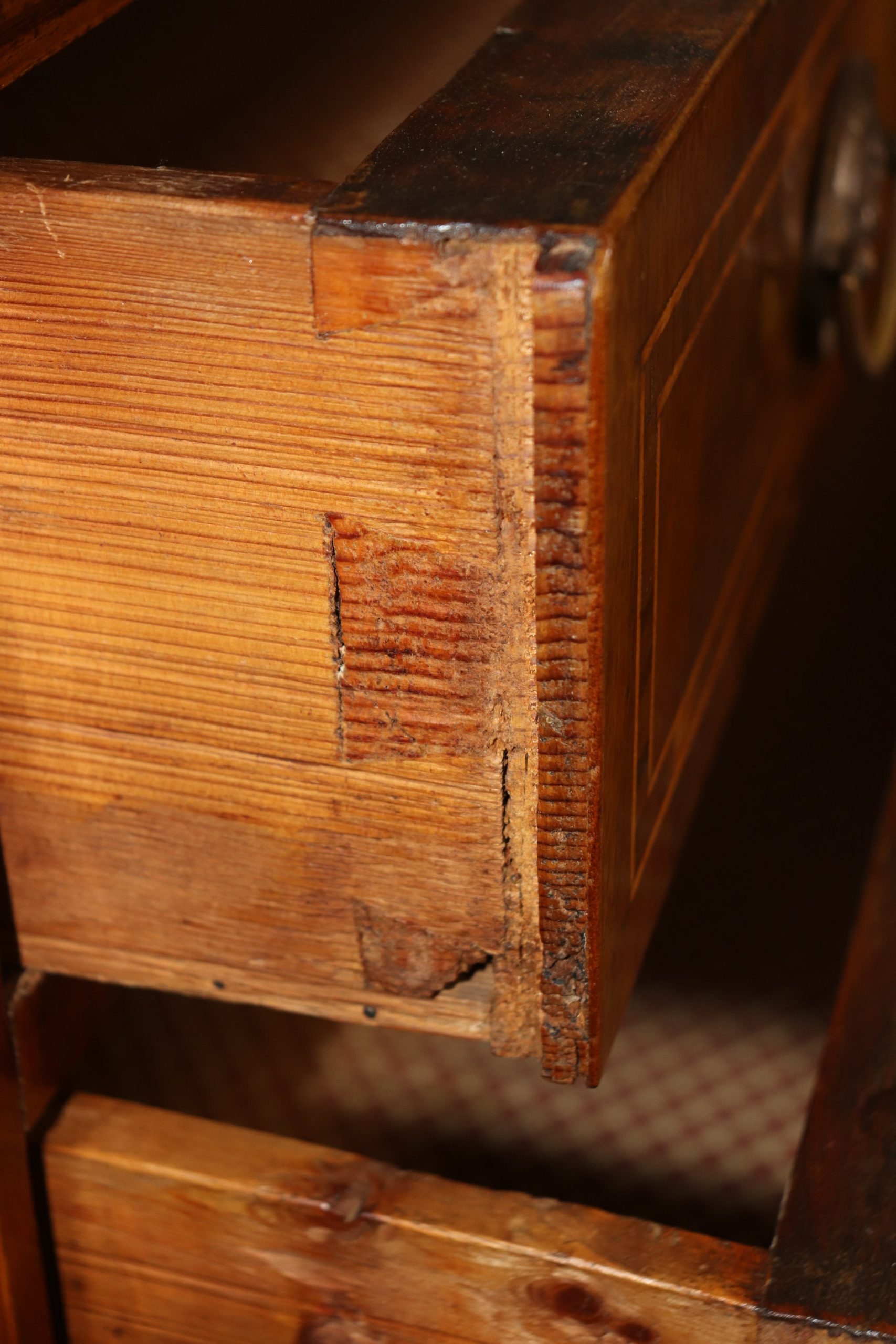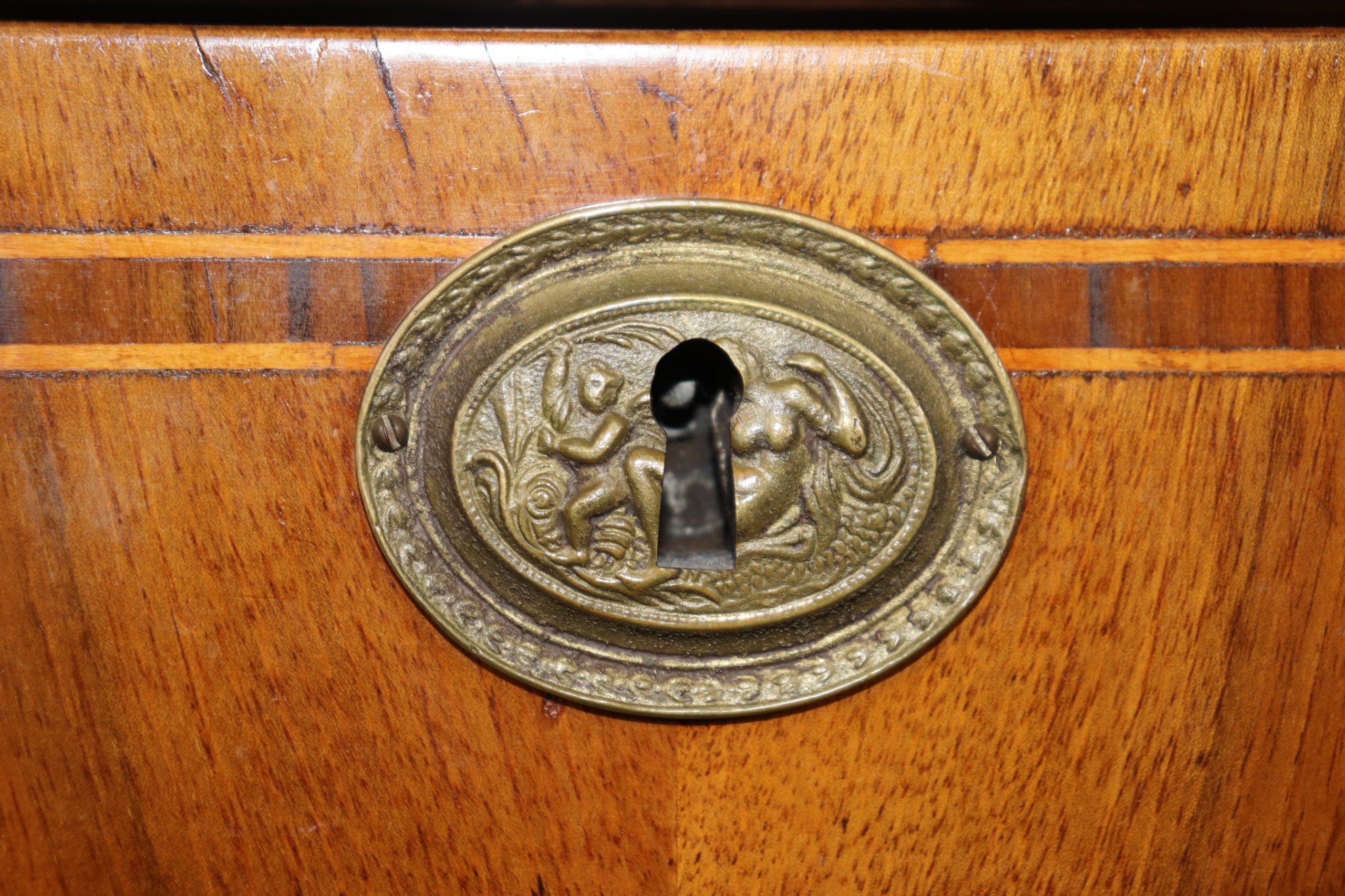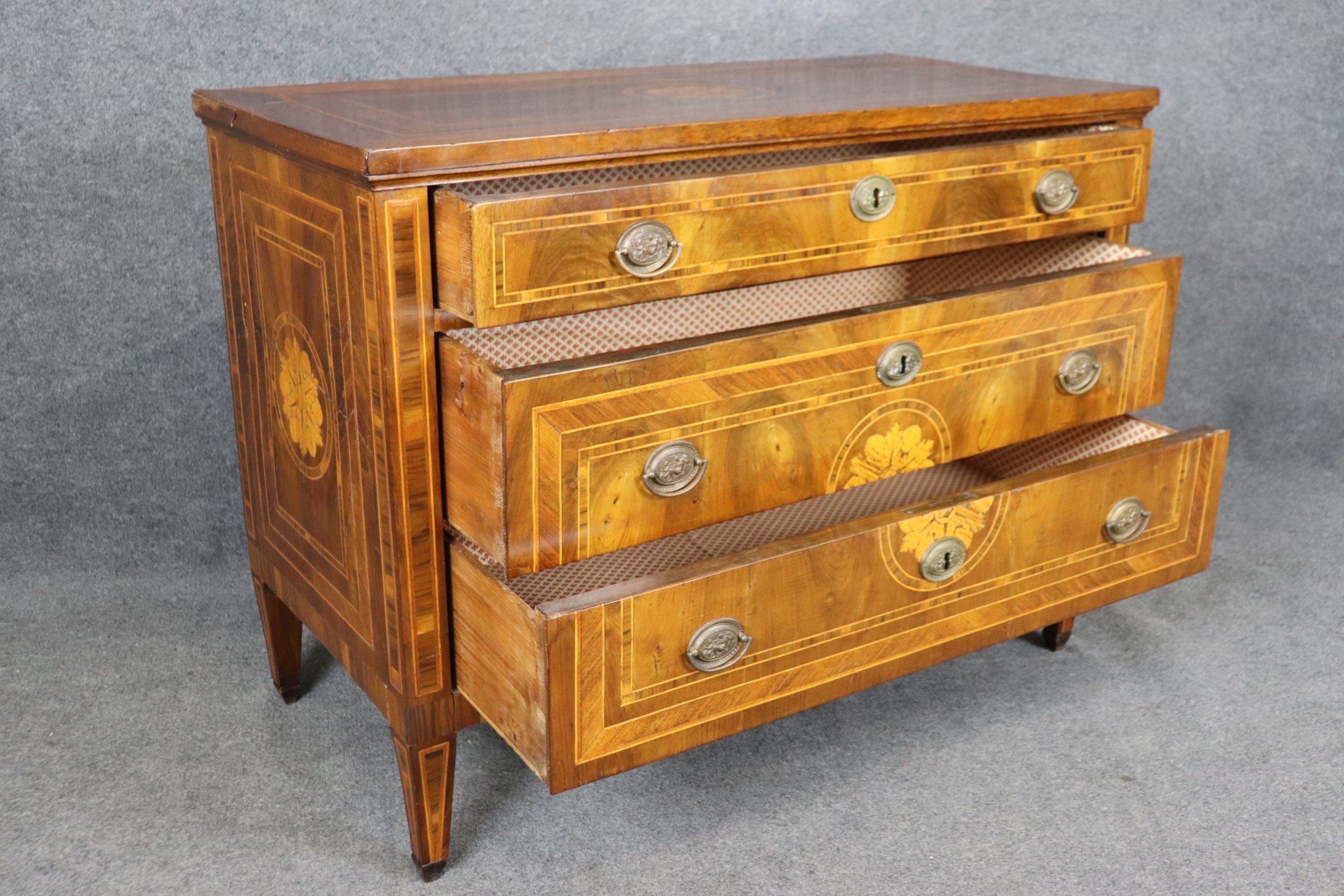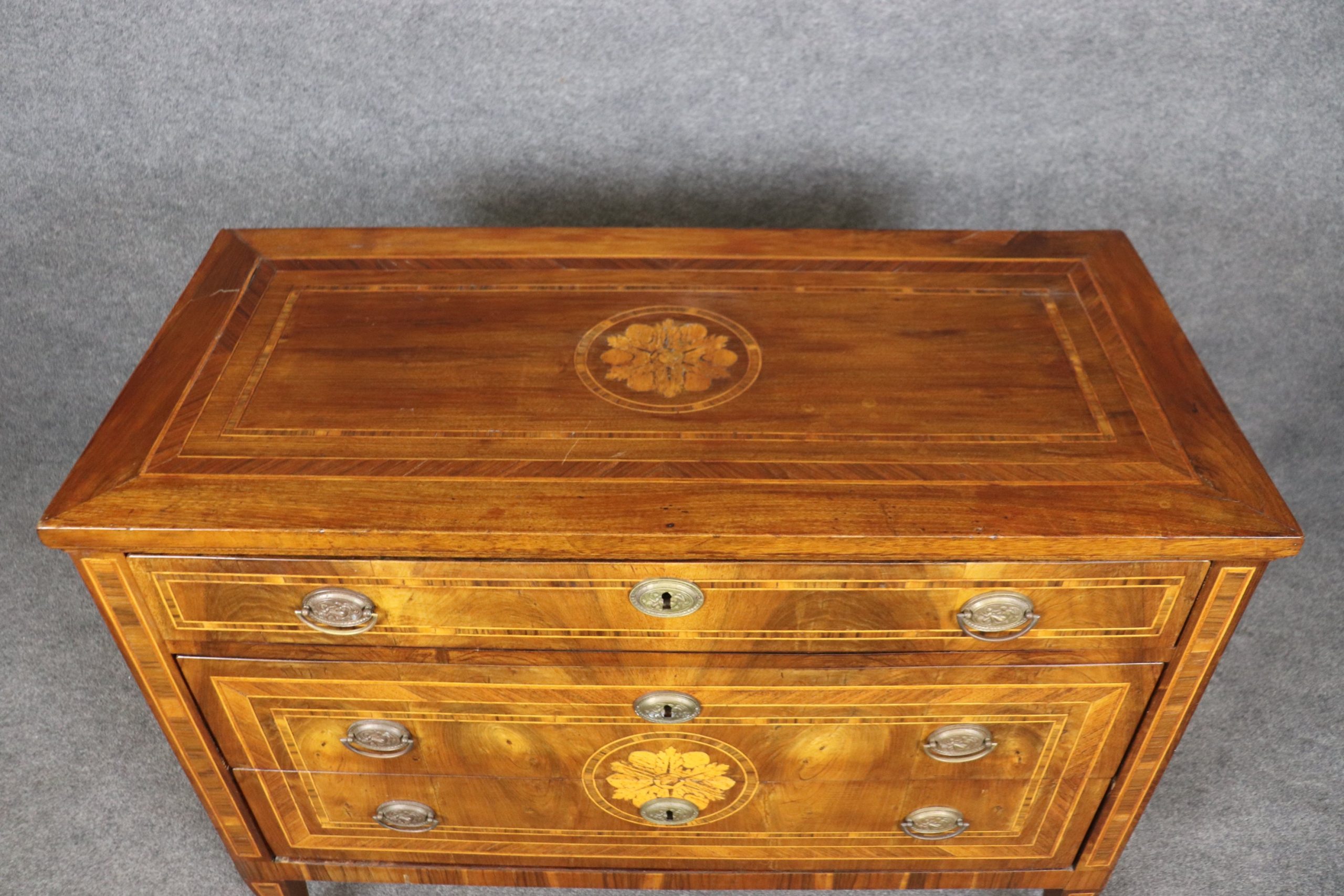 This antique 19th century inlaid commode, chest of drawers is a great example of quality Italian furniture! If you look at the photos provided, you will see the detail in the beautiful inlay. There are 3 spacious drawers, perfect for storing your personal belongings and keeping them safe as each drawer has a lock. This is a piece that will last you for many years and will add a sense of luxury into your entryway, living room, office or place of your choosing! The commode is in good antique condition considering the age with some minor surface scratches and blemishes to the finish, otherwise good condition.