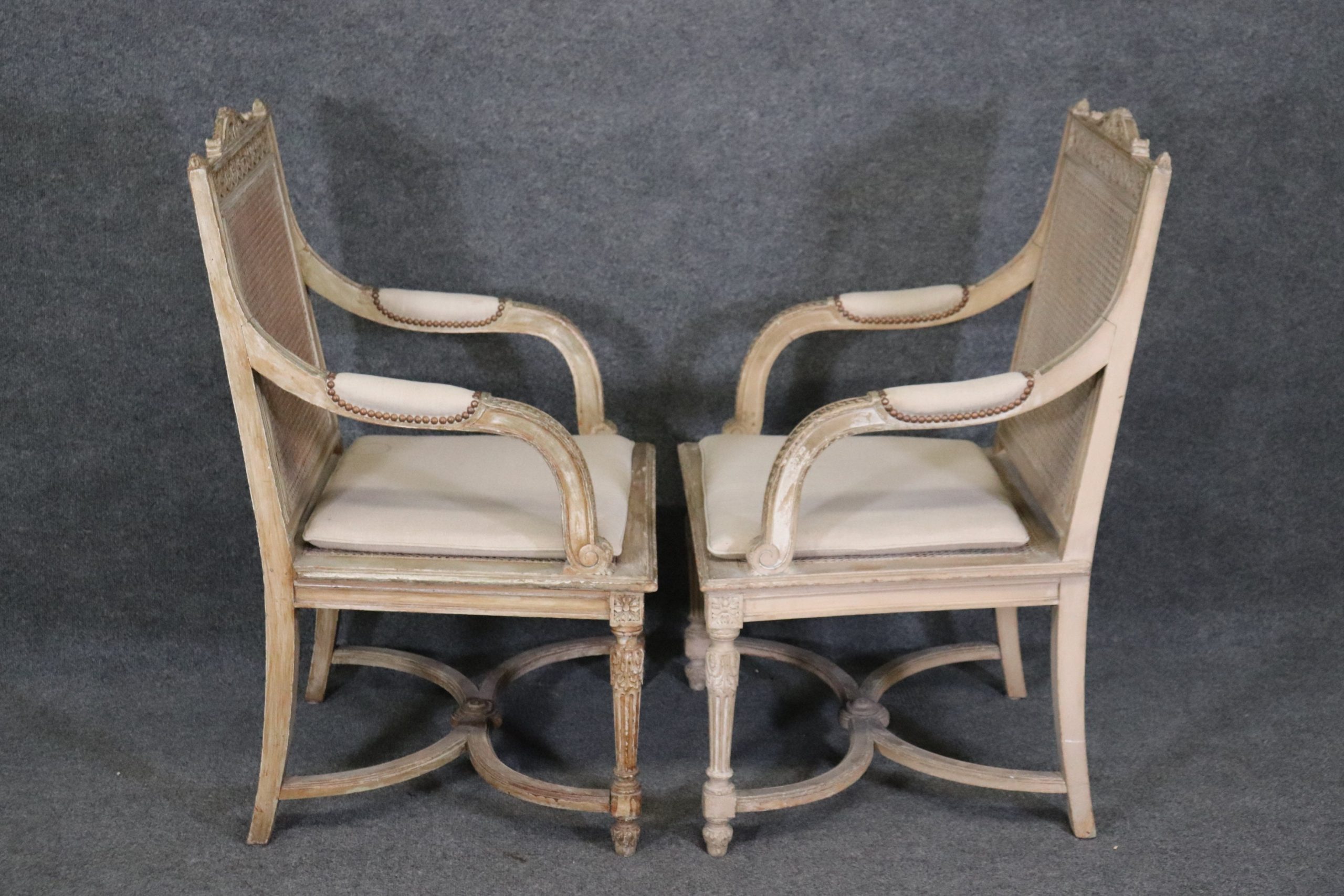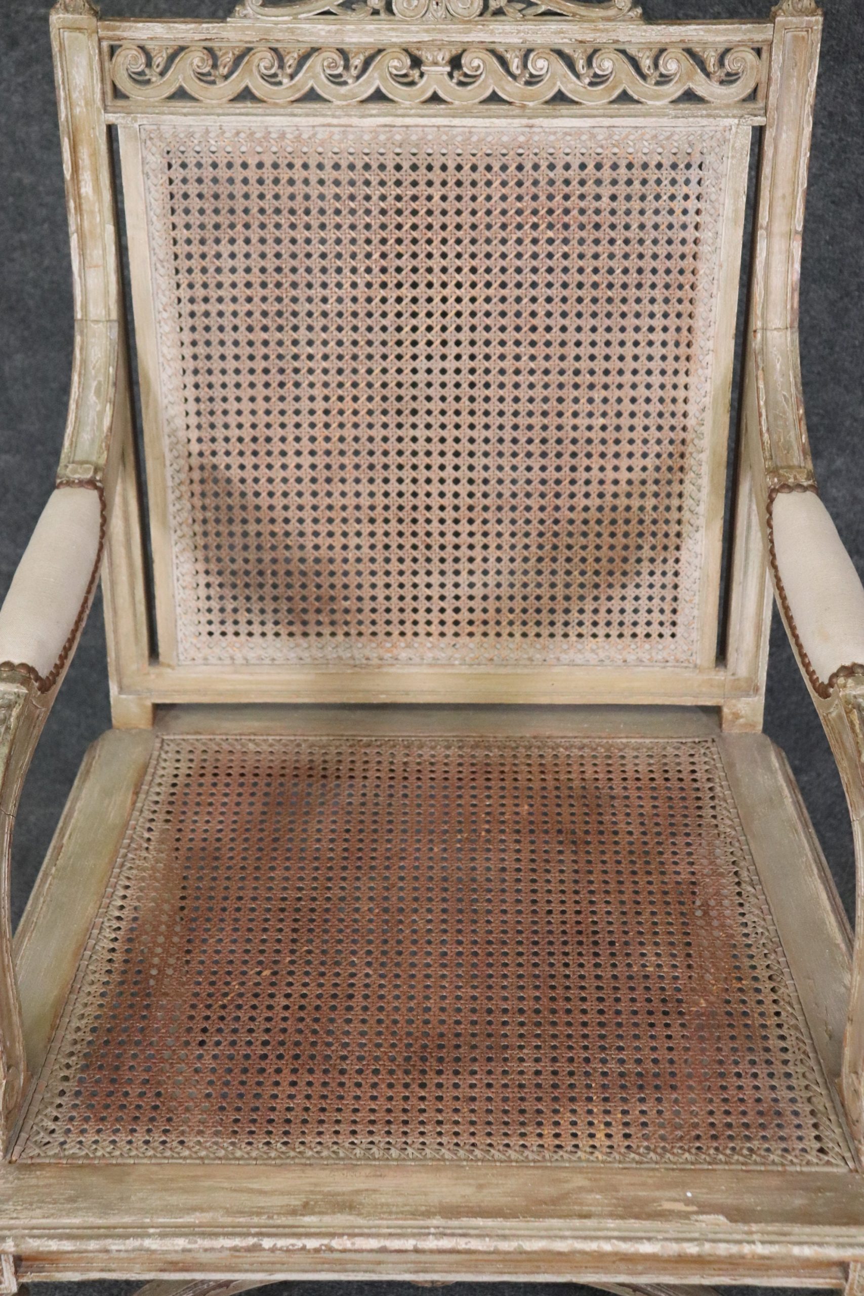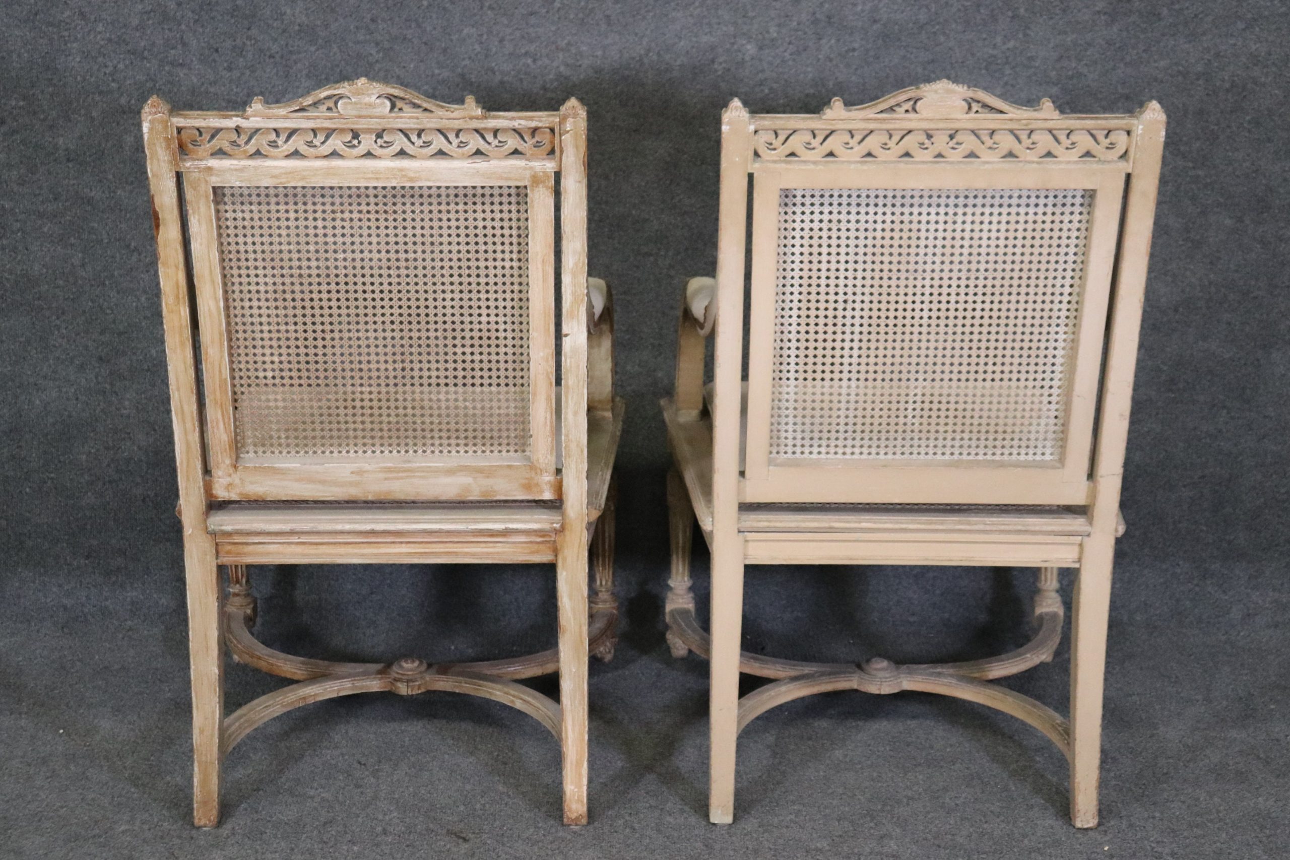 Antique 19th Century Louis XVI Directoire Style Distressed Painted Cane Armchairs, Accent Chairs