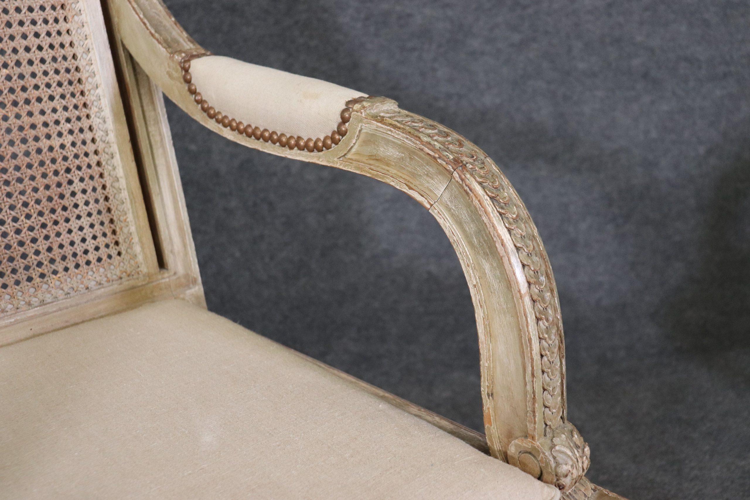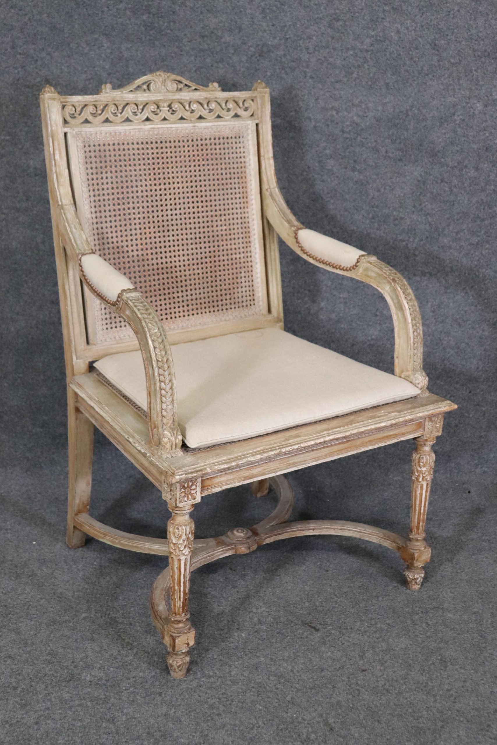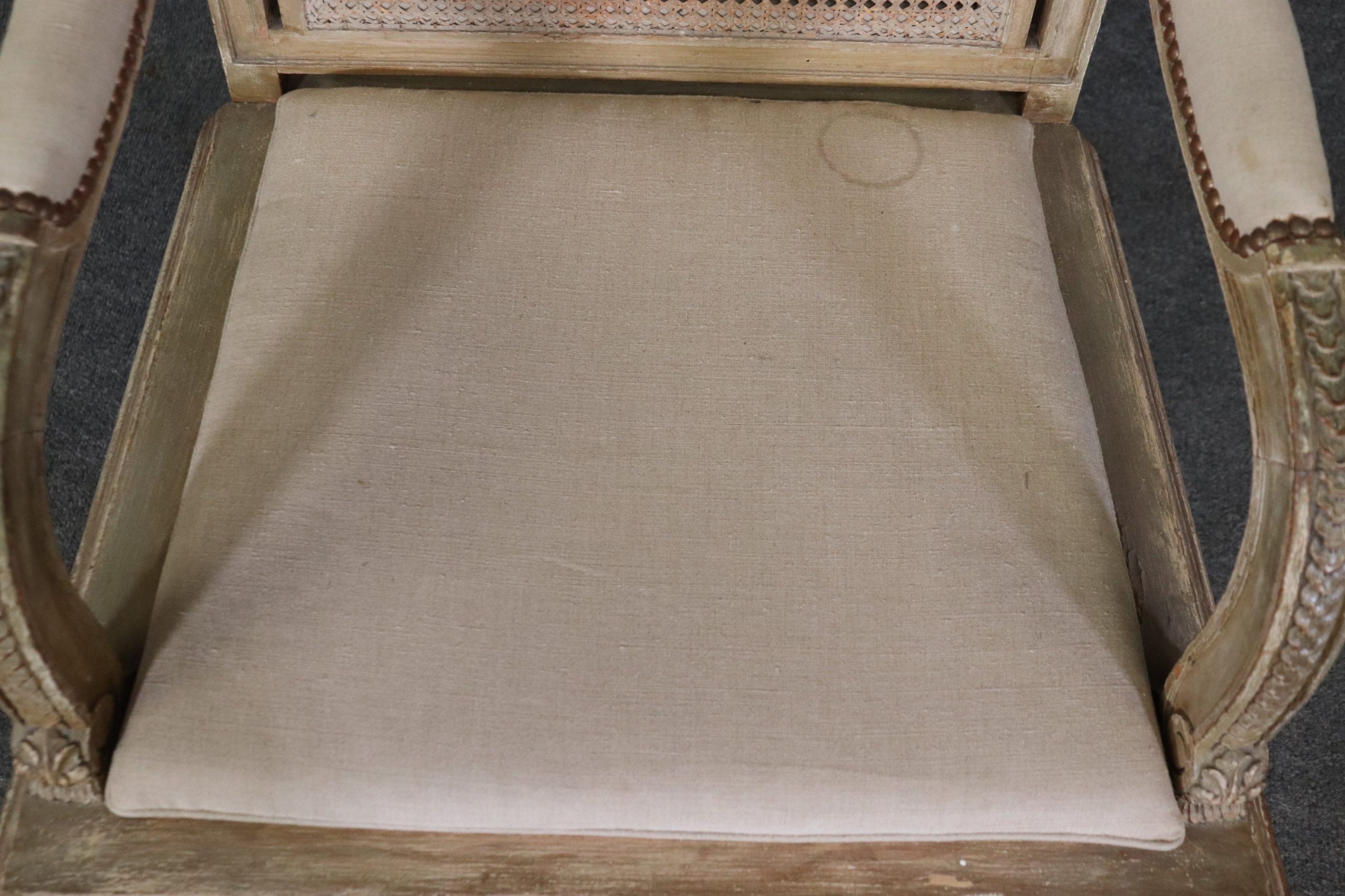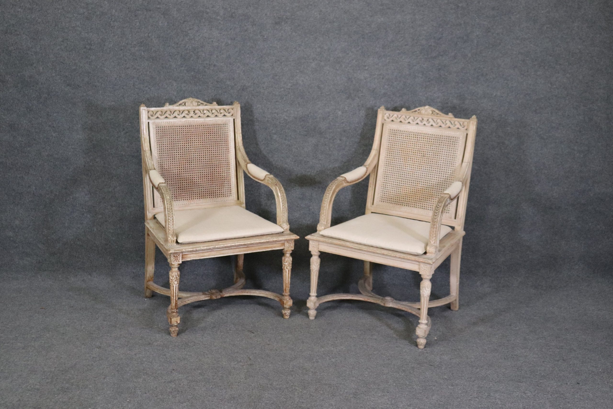 Antique 19th Century Louis XVI Directoire Style Distressed Painted Cane Armchairs, Accent Chairs