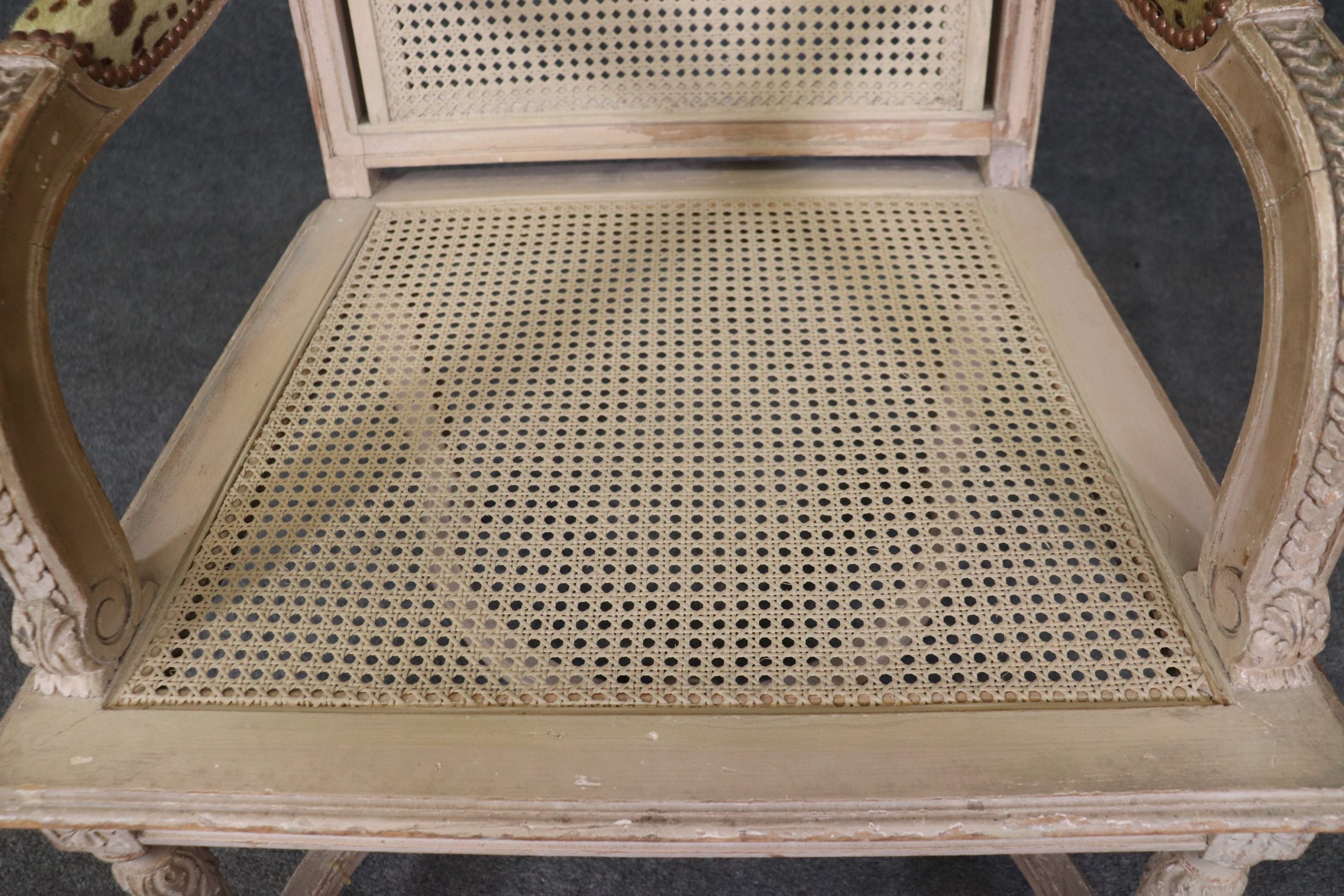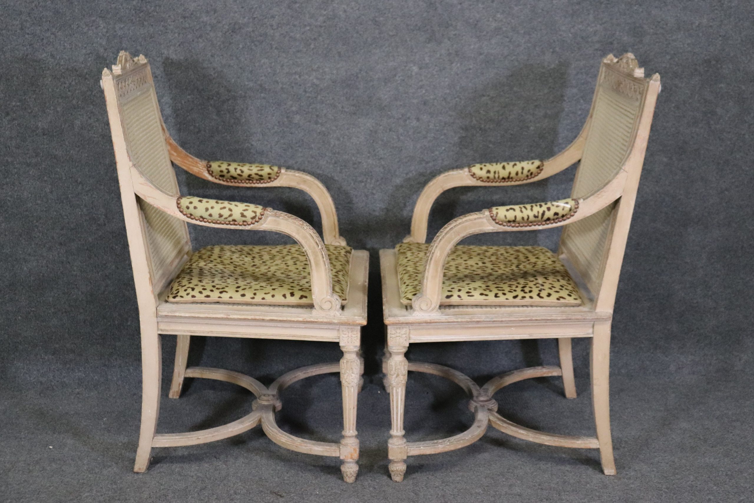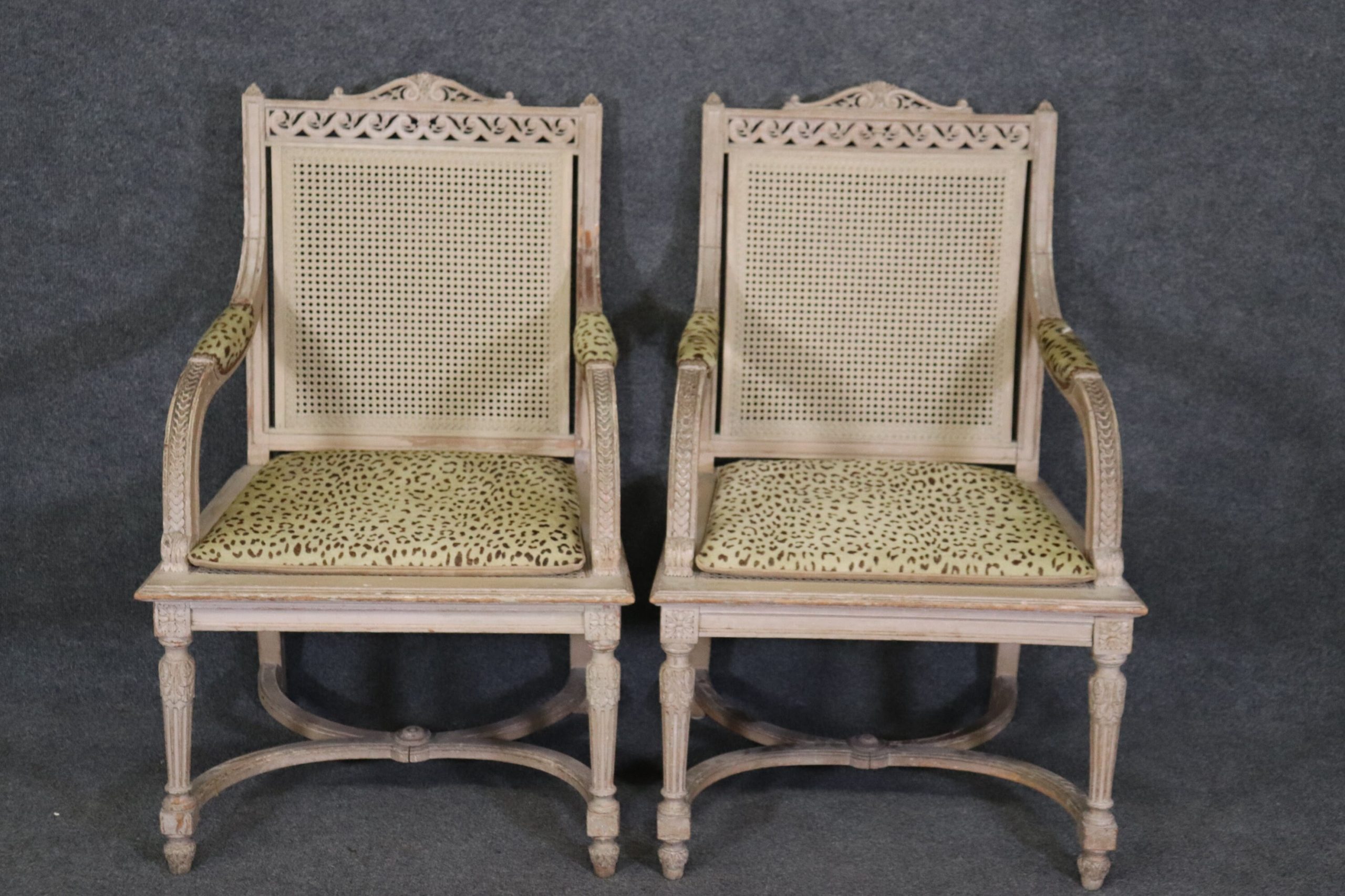 This pair of antique Louis XVI Directoire style distressed painted armchairs fauteuils with cane seats and backs is perfect for you and your home and are a lovely example of high quality furniture from the 19th century! If you look at the photos provided you will see the attention to detail within the carved frames as well as the fine cane backs and seats, which do not have any holes or breaks. The pair is accompanied by cheetah print upholstered cushions that can be removed if you desire. This pair is perfect for any entryway, living room, bedroom or office and is bound to bring that little extra sense of character and class into your home. One nice thing about this pair is their ability to be paired with a variety of other styles including, Art Deco, Art Nouveau, Louis XV, Louis XVI, Mid Century Modern and Contemporary! The chairs are in good antique/vintage condition with light surface scratches and minor finish loss/distressing to the frames but otherwise good condition. Upholstery does have some staining as shown.