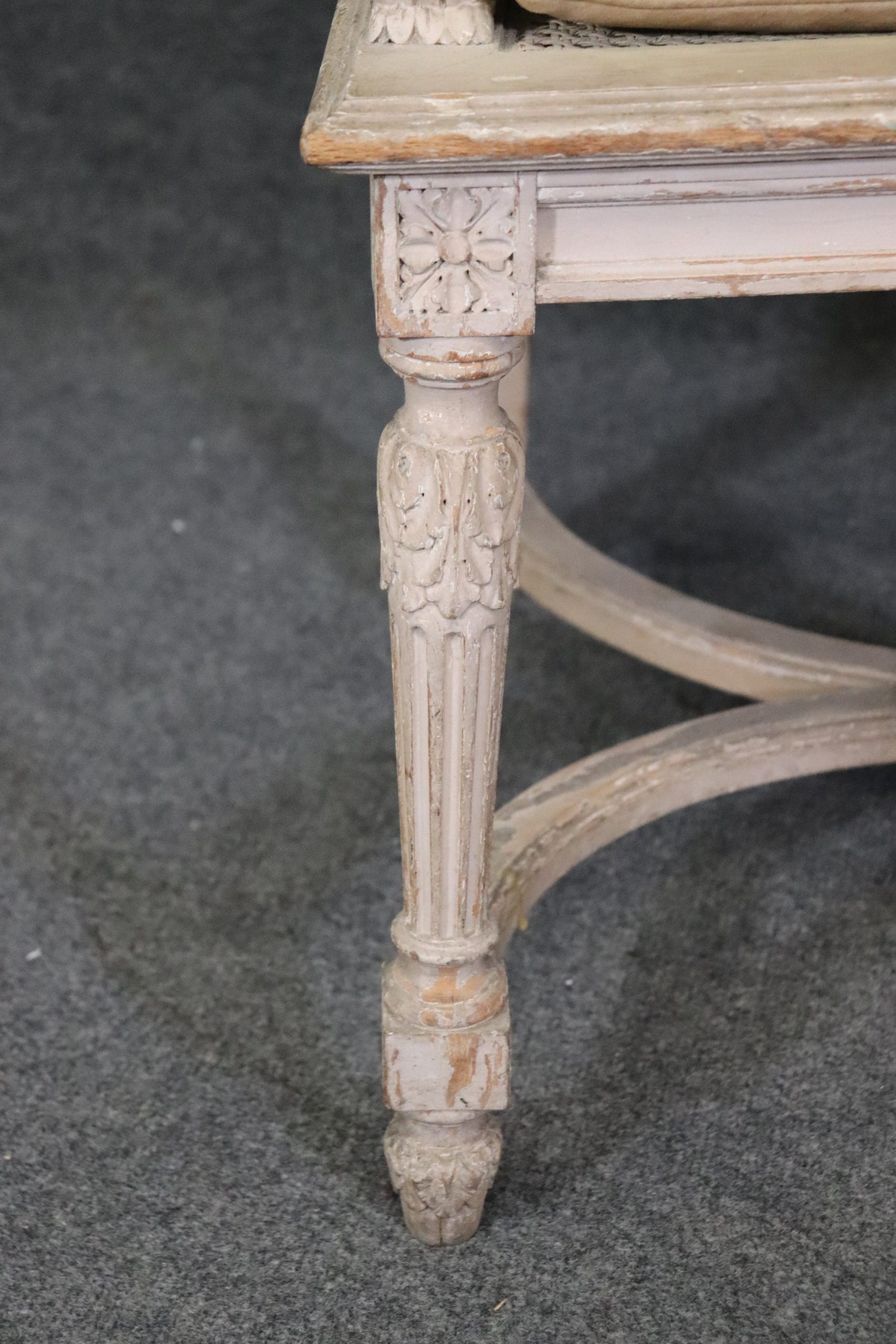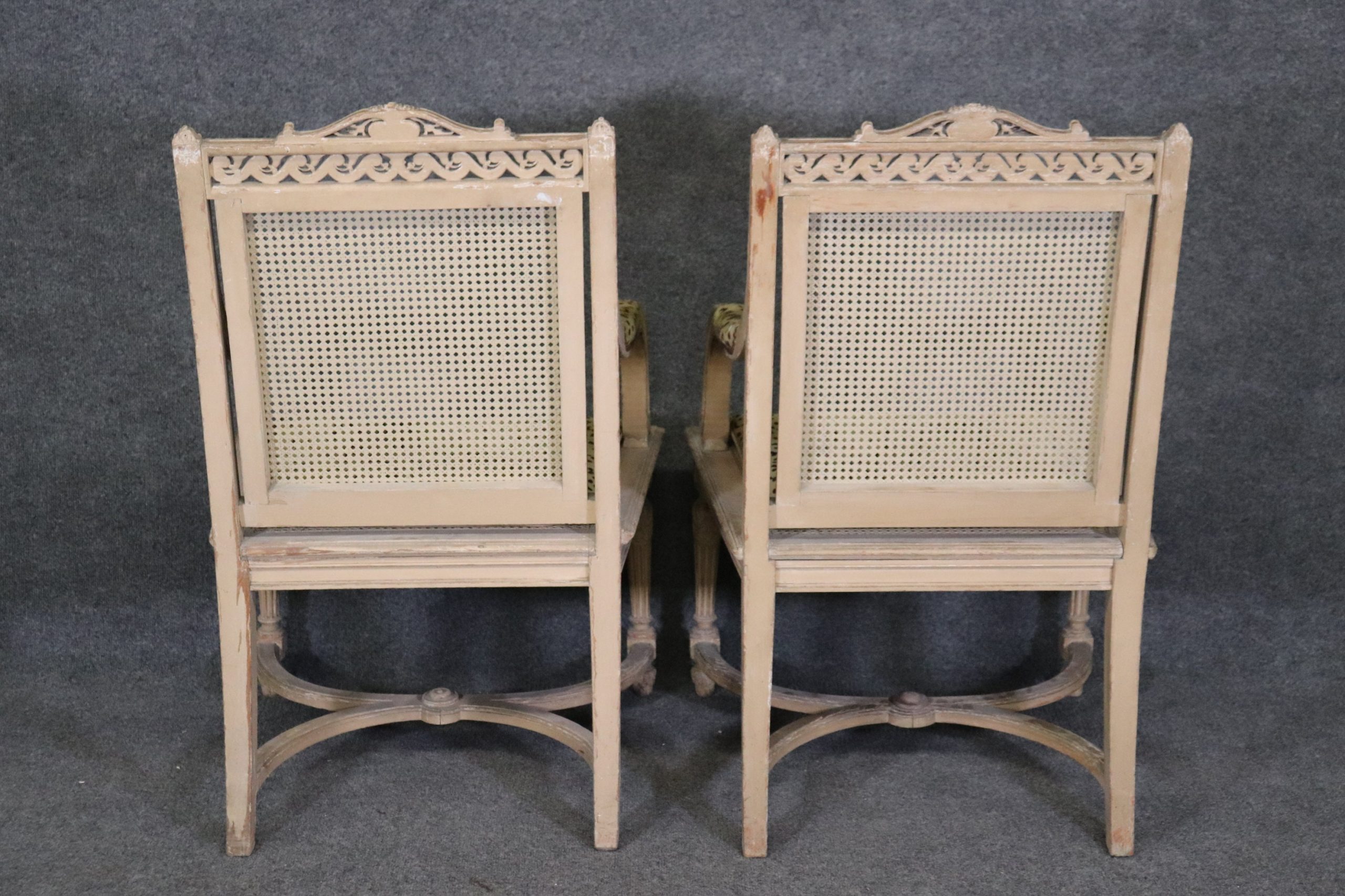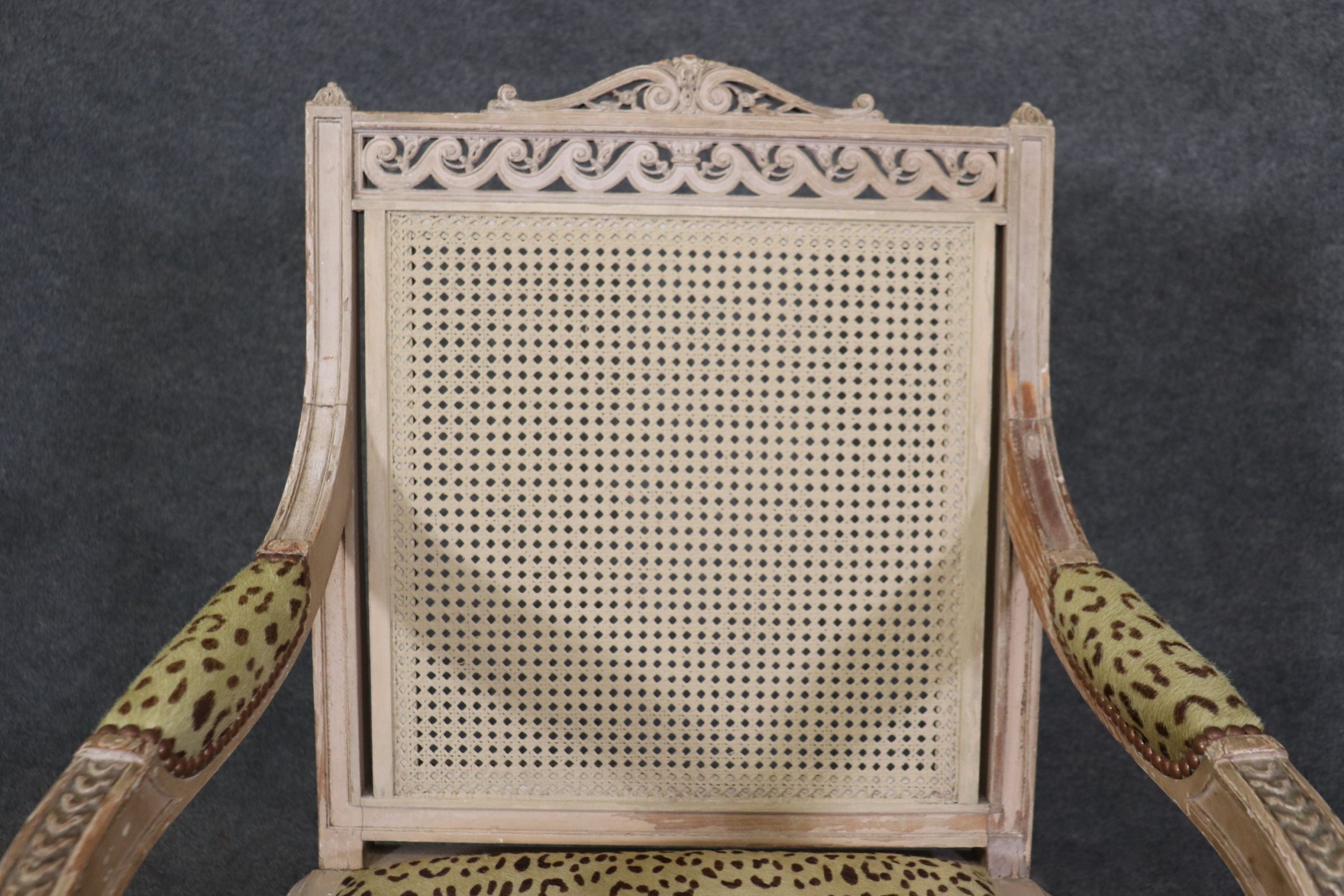 This pair of antique Louis XVI Directoire style distressed painted armchairs fauteuils with cane seats and backs is perfect for you and your home and are a lovely example of high quality furniture from the 19th century! If you look at the photos provided you will see the attention to detail within the carved frames as well as the fine cane backs and seats, which do not have any holes or breaks. The pair is accompanied by cheetah print upholstered cushions that can be removed if you desire. This pair is perfect for any entryway, living room, bedroom or office and is bound to bring that little extra sense of character and class into your home. One nice thing about this pair is their ability to be paired with a variety of other styles including, Art Deco, Art Nouveau, Louis XV, Louis XVI, Mid Century Modern and Contemporary! The chairs are in good antique/vintage condition with light surface scratches and minor finish loss/distressing to the frames but otherwise good condition. Upholstery does have some staining as shown.