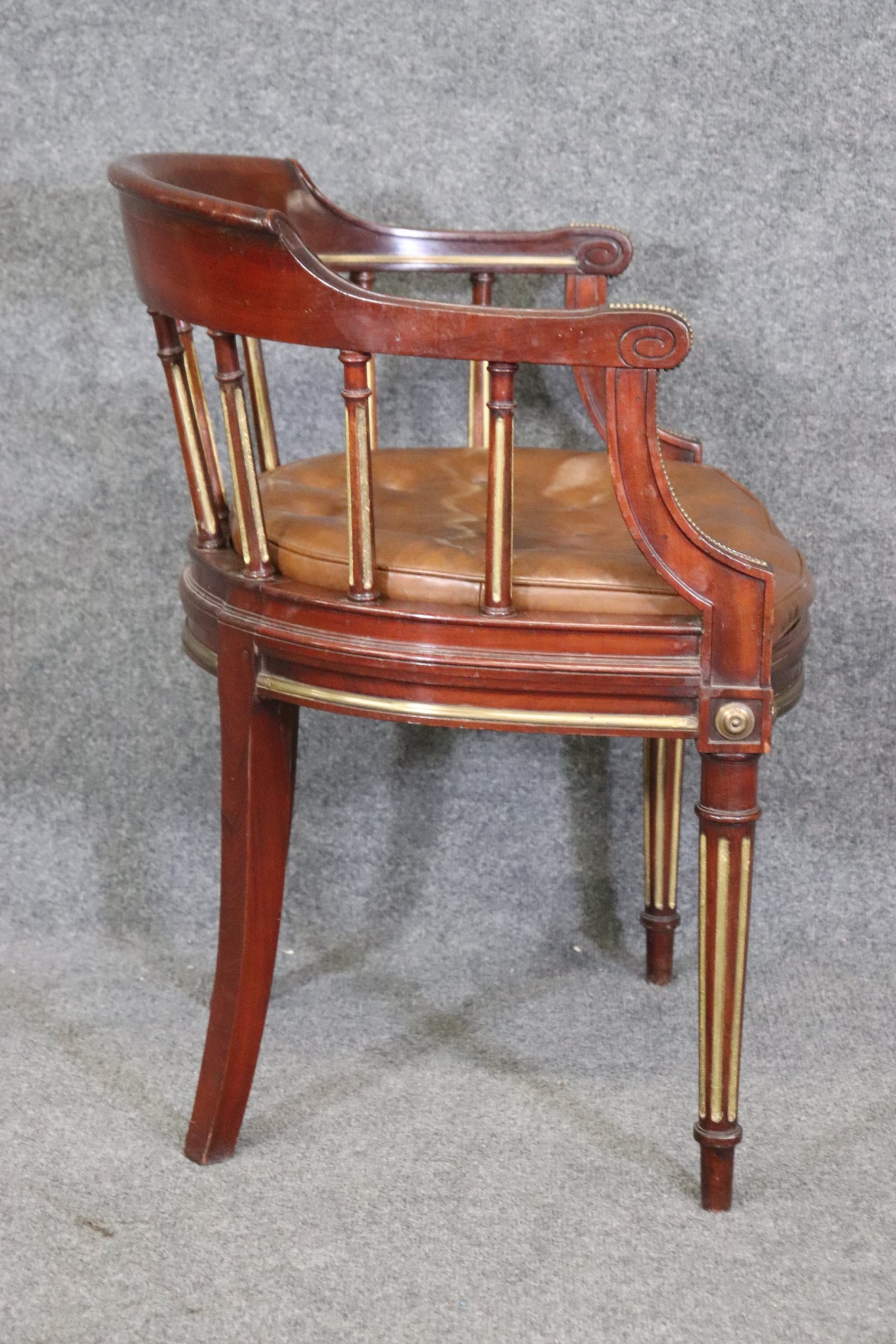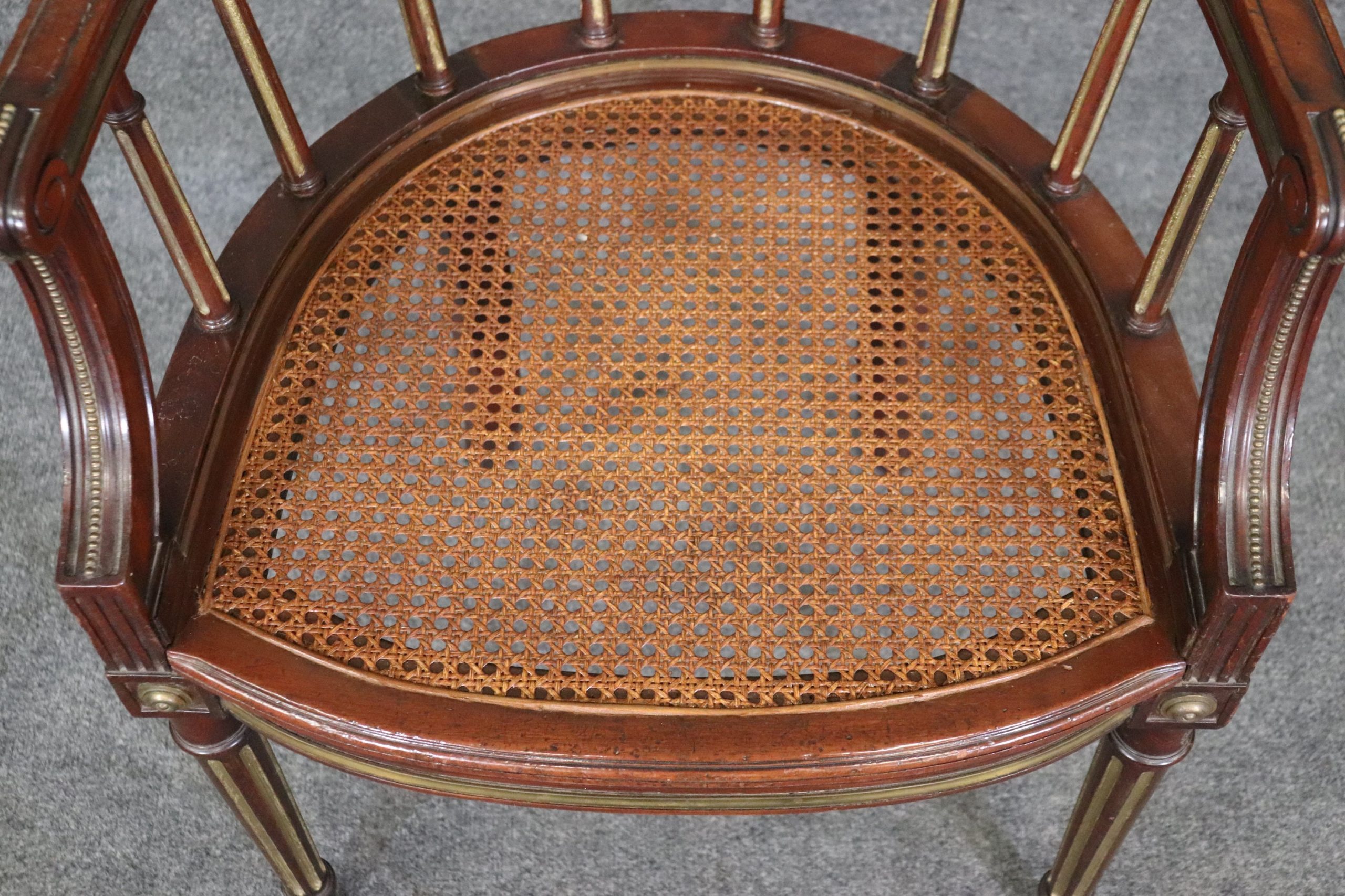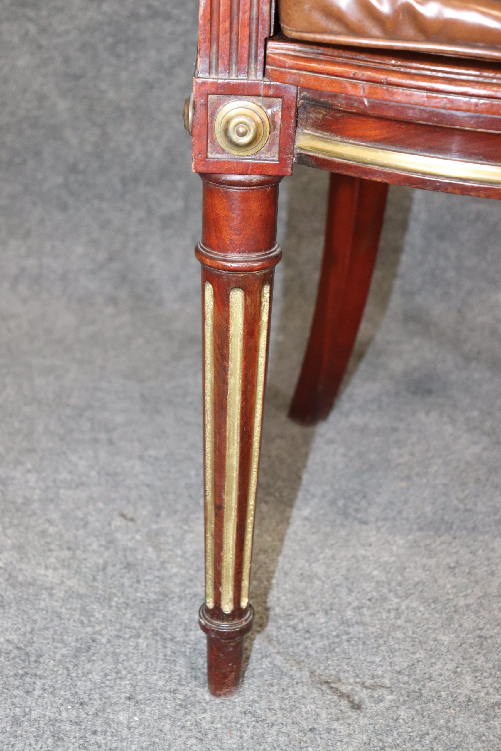 This antique 19th century Louis XVI style armchair club chair is made of the highest quality! This chair is equipped with a leather tufted cushion. If you look at the photos, you can see the cane seat and gilt accents. This chair is perfect for any entryway, living room, bedroom, or office and is bound to bring an overwhelming sense of sophisticated luxury as well as character into your home or place of choosing! This piece can also be paired with a variety of other styles you may already have in your home. The chair is in good antique condition with some minor finish loss, surface scratches to the frame, and wear to the leather as you would expect for a chair of this age.