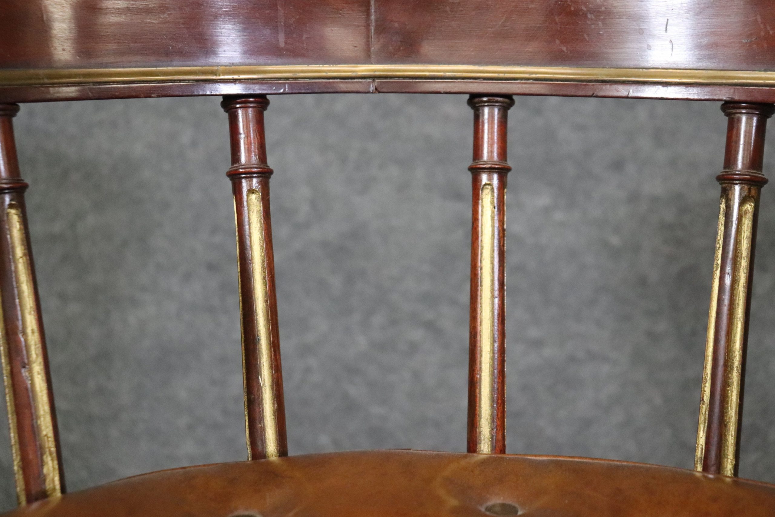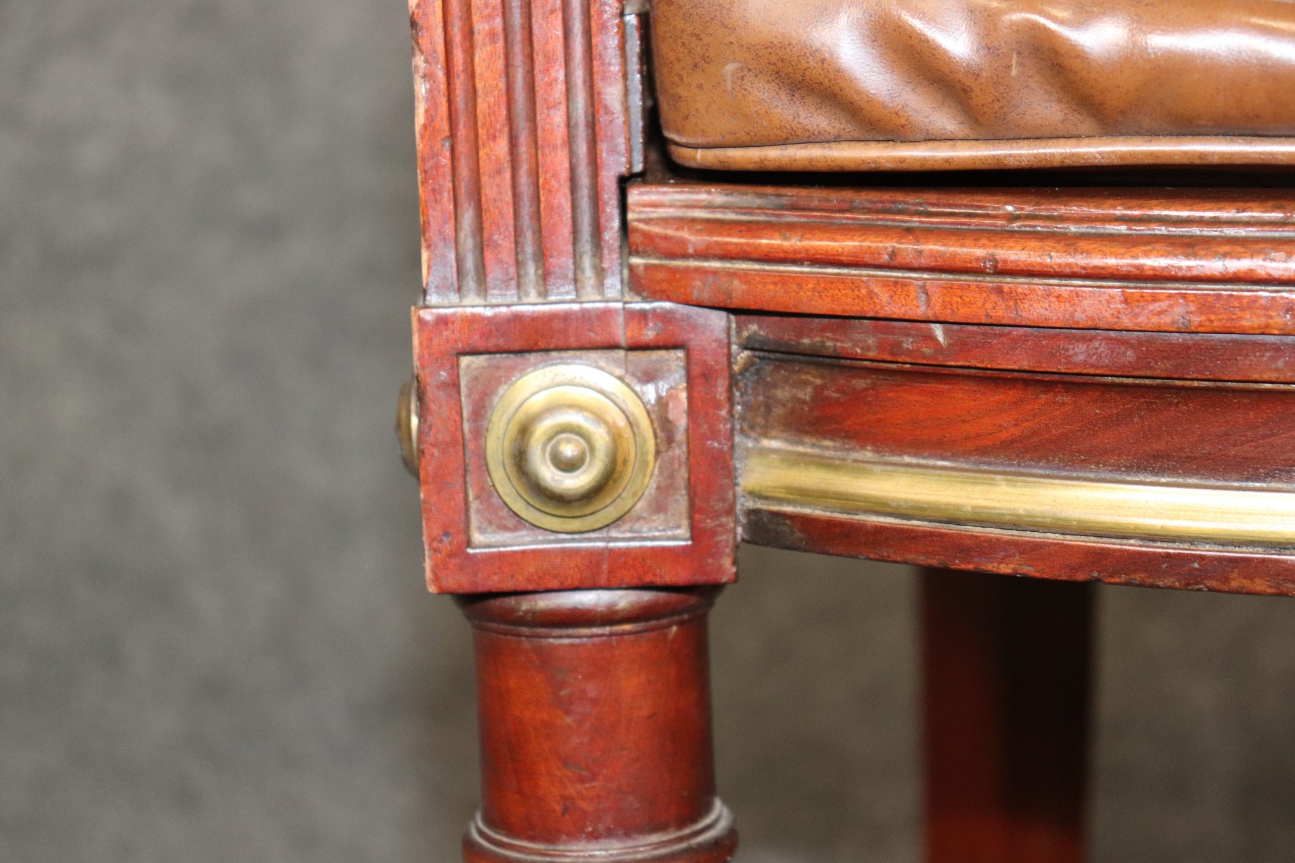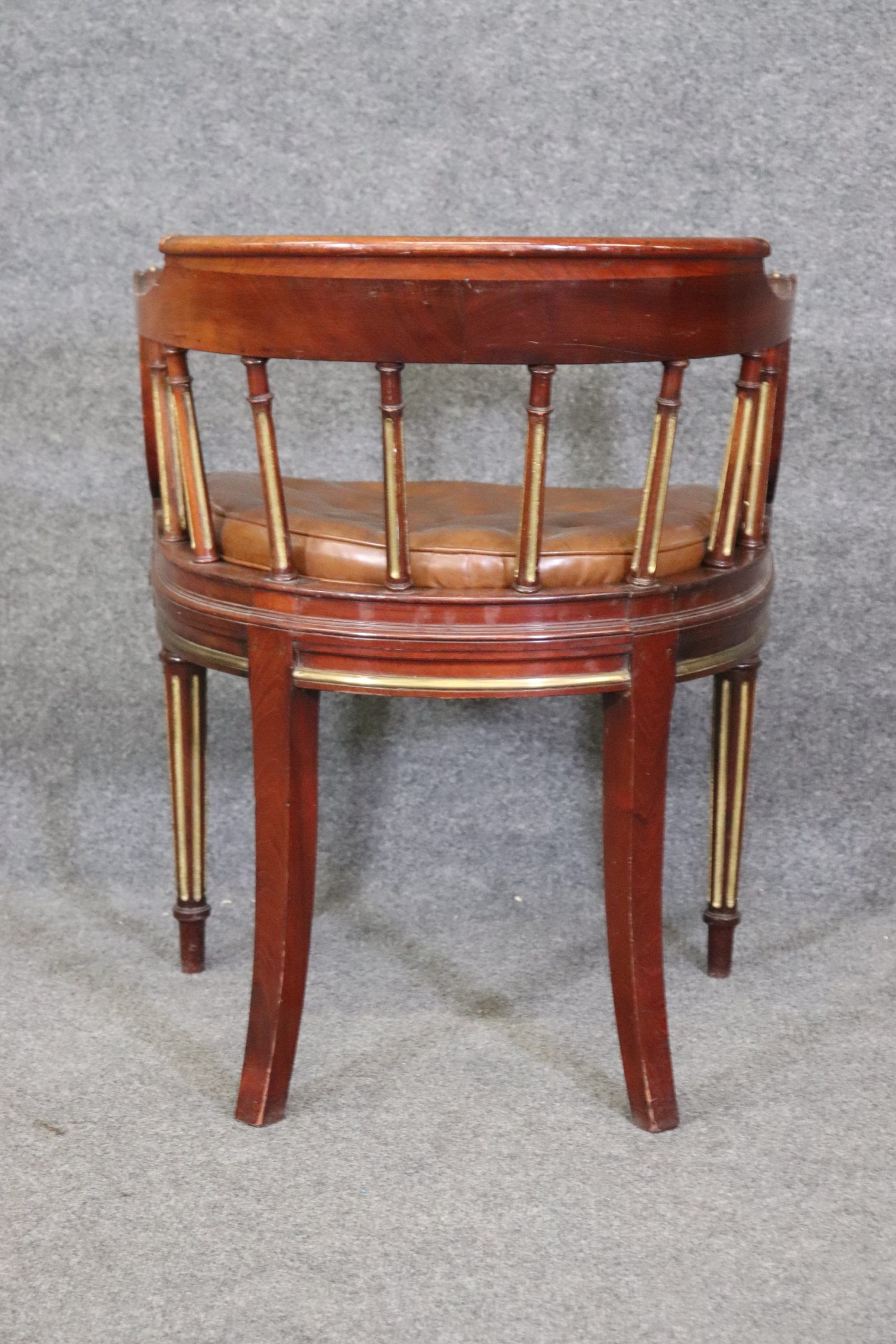 This antique 19th century Louis XVI style armchair club chair is made of the highest quality! This chair is equipped with a leather tufted cushion. If you look at the photos, you can see the cane seat and gilt accents. This chair is perfect for any entryway, living room, bedroom, or office and is bound to bring an overwhelming sense of sophisticated luxury as well as character into your home or place of choosing! This piece can also be paired with a variety of other styles you may already have in your home. The chair is in good antique condition with some minor finish loss, surface scratches to the frame, and wear to the leather as you would expect for a chair of this age.