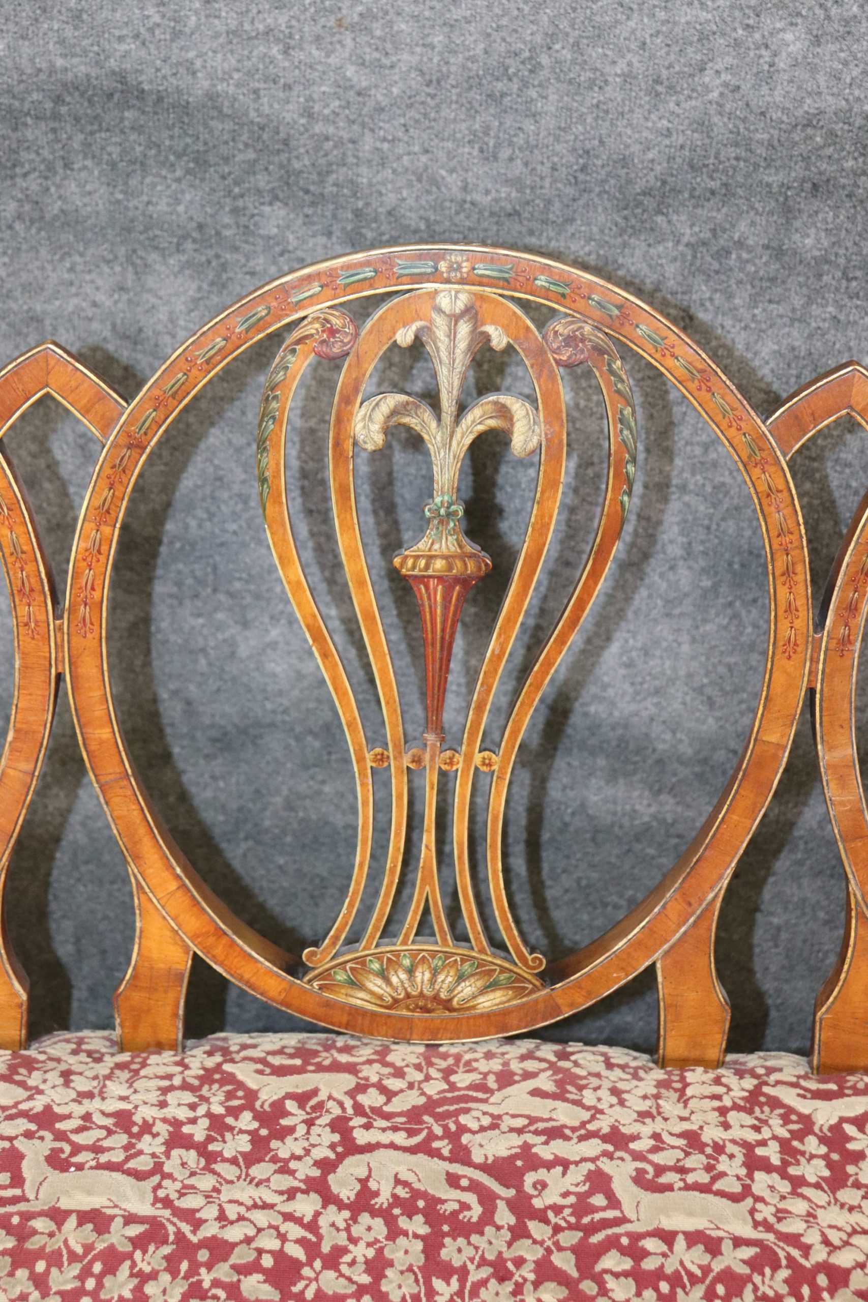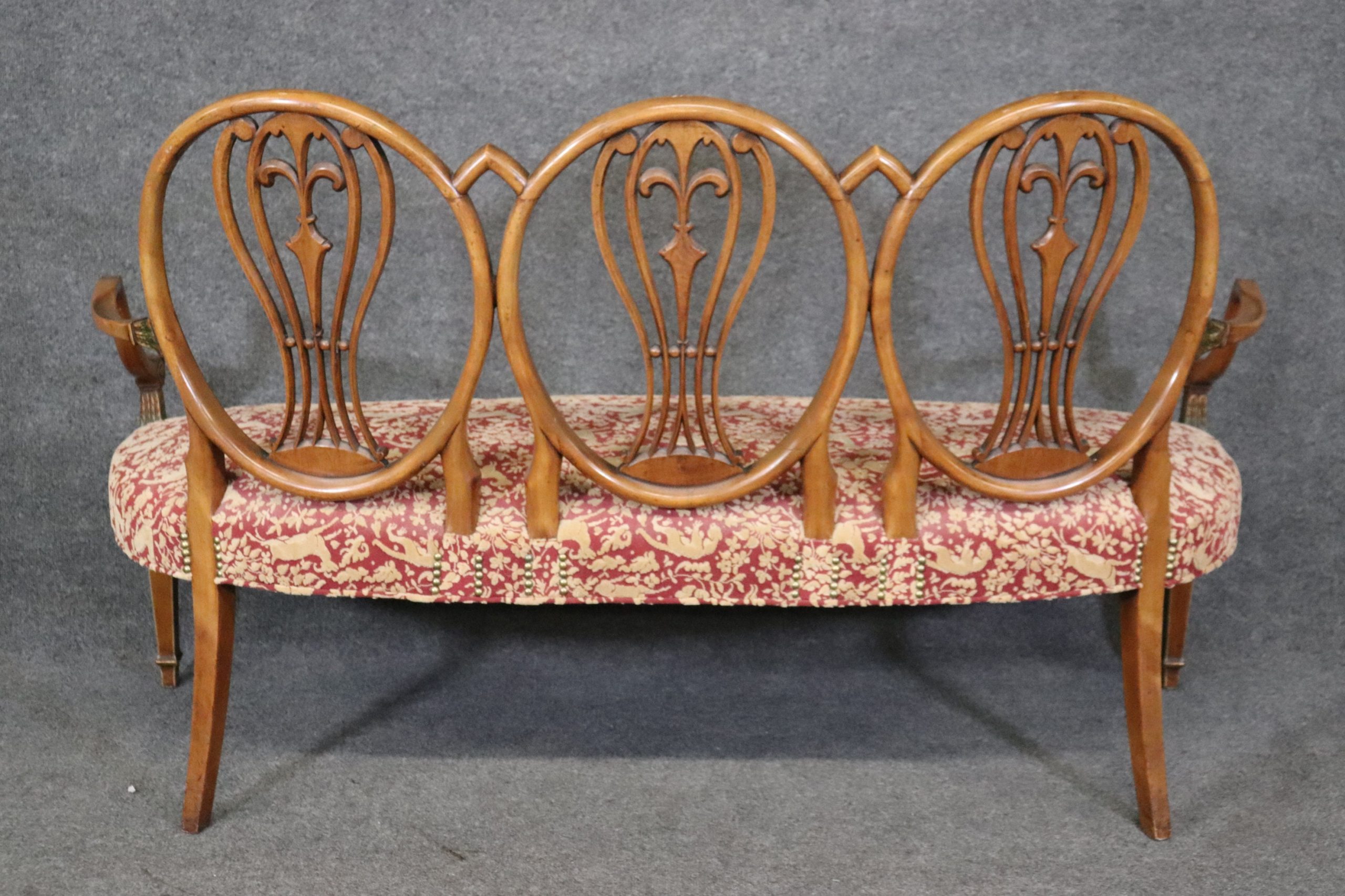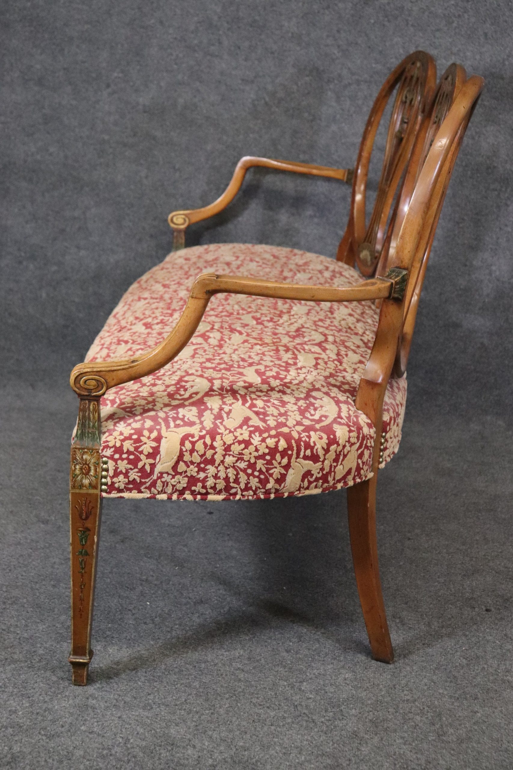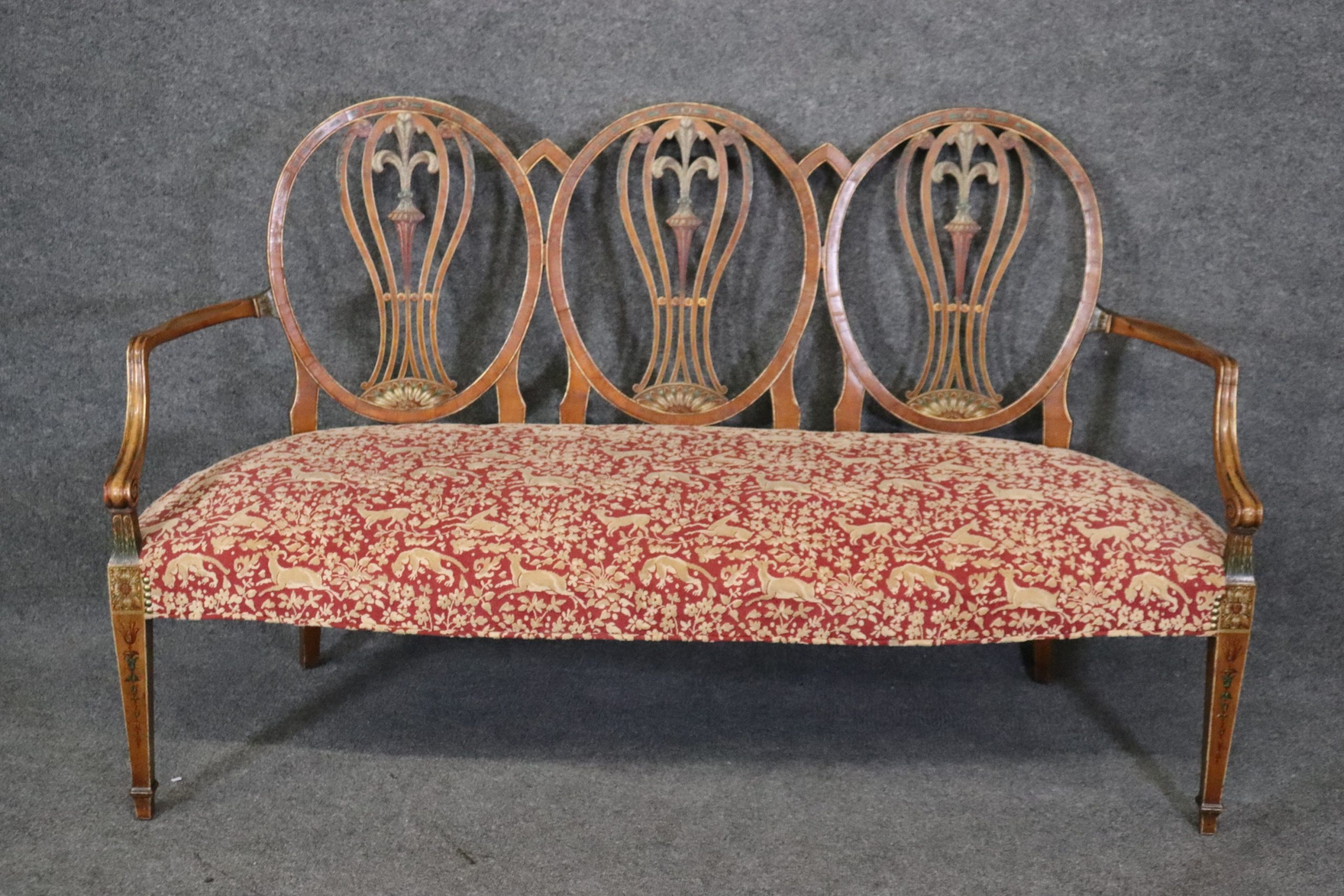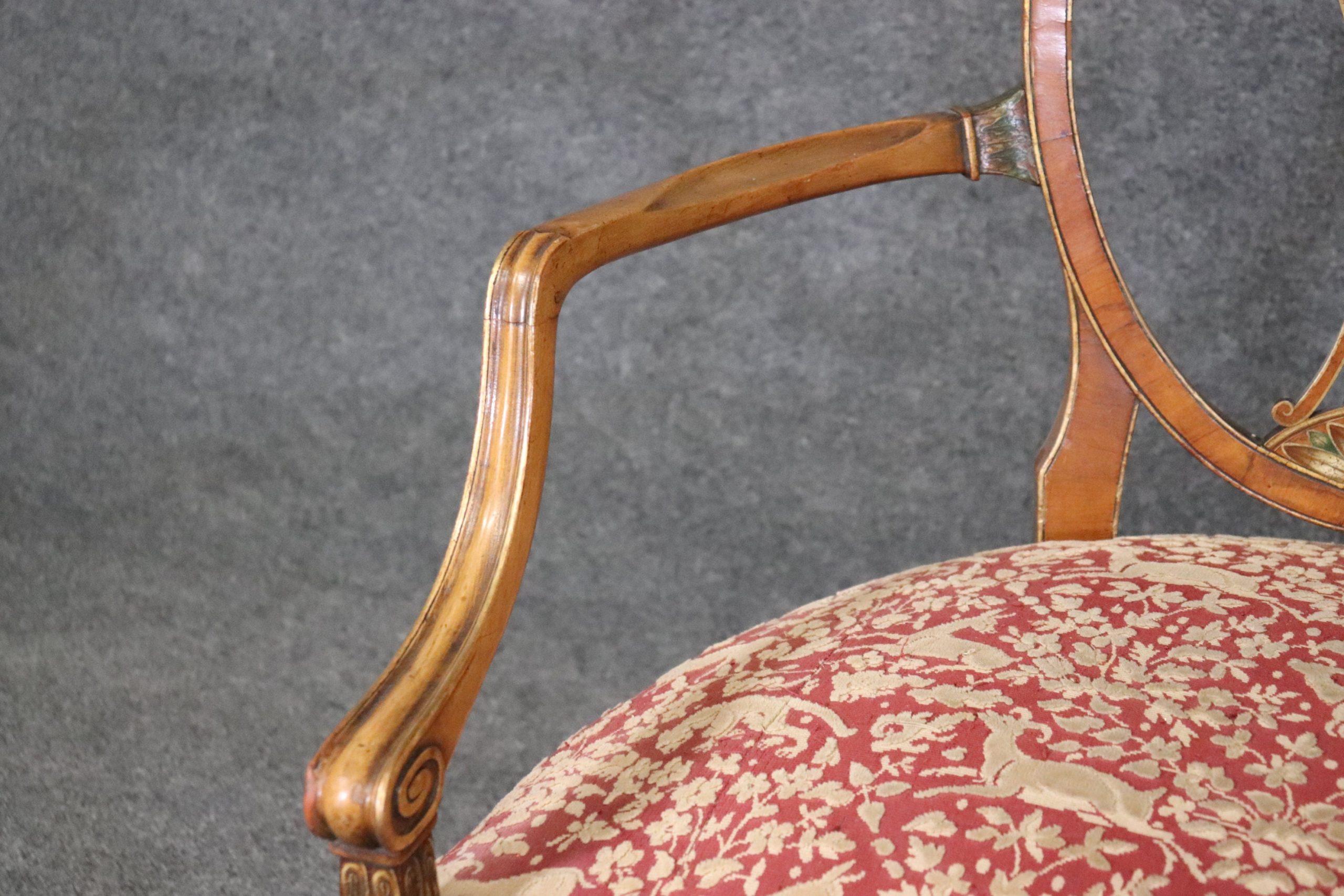 This antique Adams style paint decorated settee sofa is made of the highest quality! If you look at the photos provided, you will see the beautiful paint decoration including the Fleur de Lis, as well as the luxurious textured upholstery! This piece is perfect for any living room, den, foyer, entryway or office and gives off a sense of class and sophistication like you wouldn’t believe! This piece is in good antique condition with some light surface scratches and minor chips as well as some light finish loss as to be expected with an item of this age!