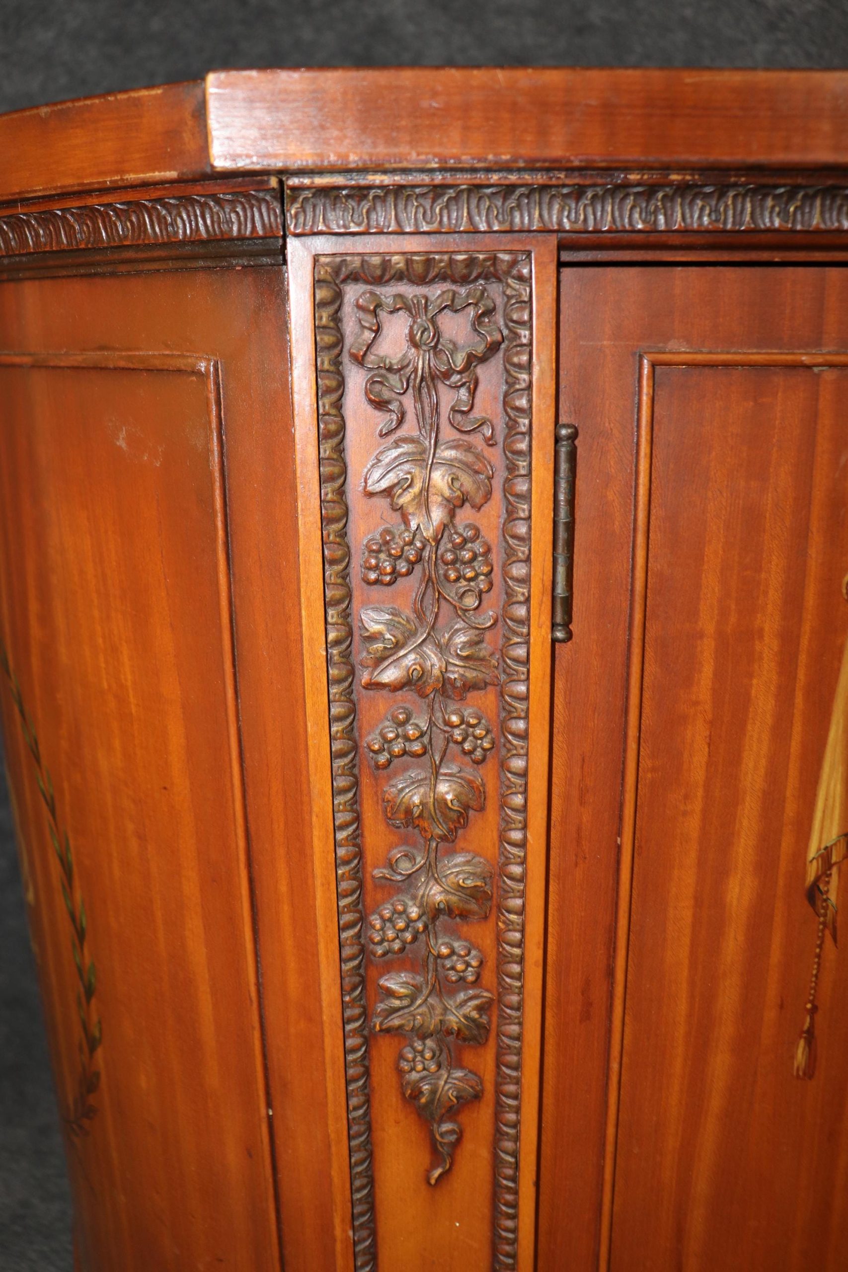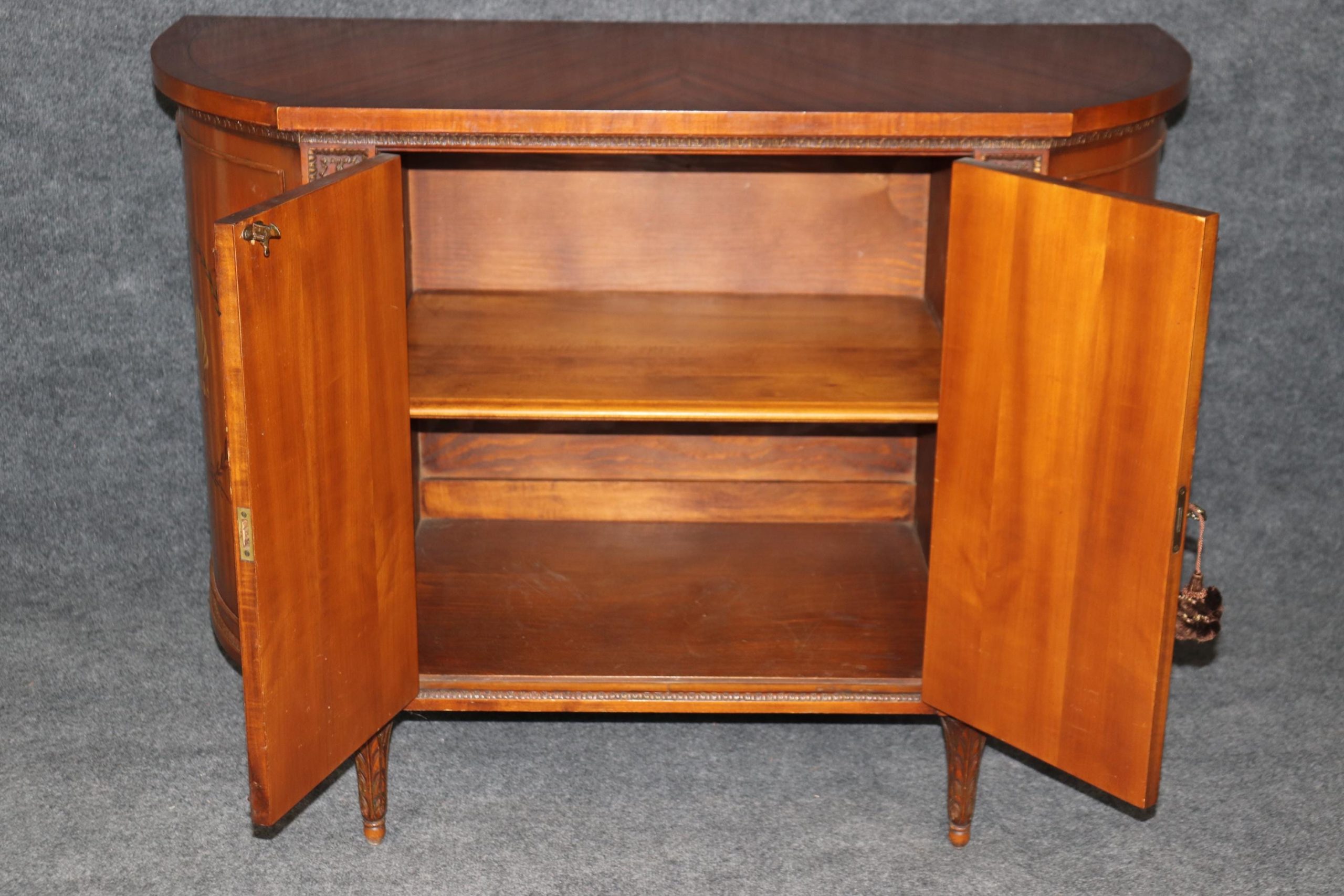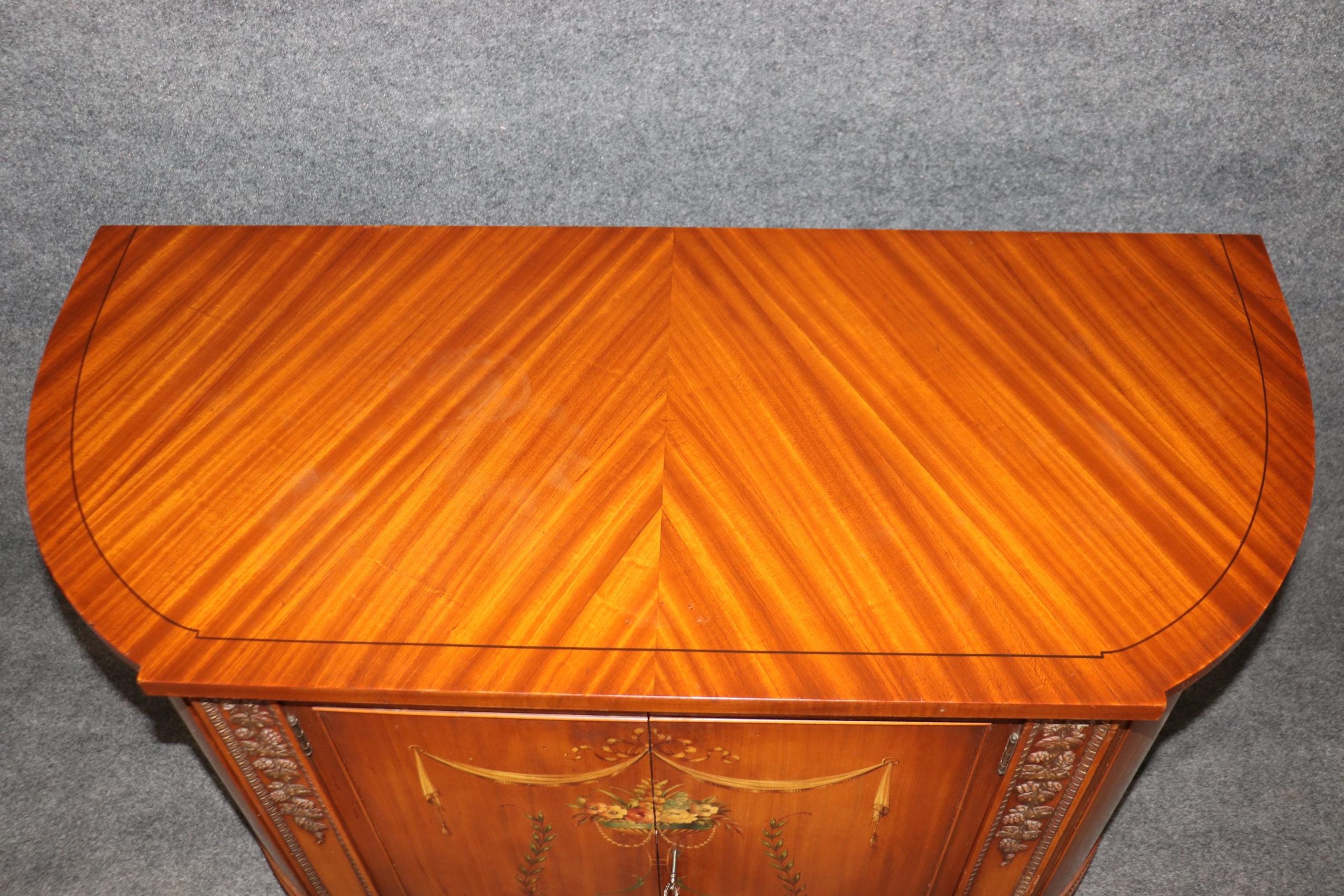 This antique English Adams style paint decorated satinwood demilune commode is of the highest quality! If you look closely at the photos provided, you will see the detail in the paint decoration throughout the piece! There is one locking door that contains one shelf – perfect for storing your personal belongings. This piece is truly a show stopper and will certainly be a conversation starter at your next gathering! This piece is perfect for any bedroom, living room, foyer, entryway or office! This piece gives off an overwhelming sense of luxury and glamour and can be paired with a variety of other styles you may already have in your home or place of choosing! Antique furniture and vintage pieces have stood the test of time and this commode is no exception! With its quality materials and great craftsmanship this piece is bound to last you and your family for many years to come. The commode is in good antique condition with minor surface scratches and finish loss, as to be expected of an item from the 1920s.