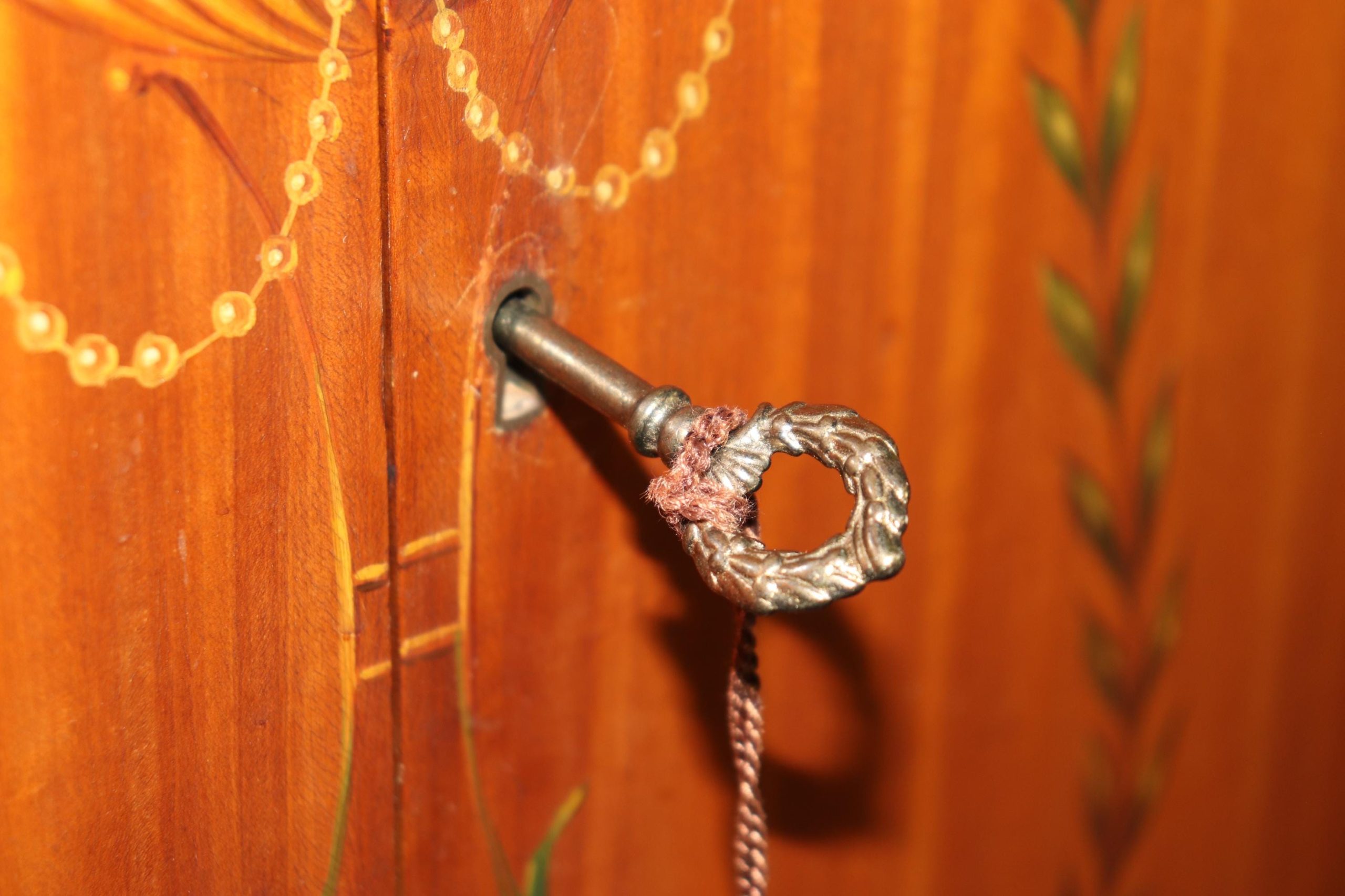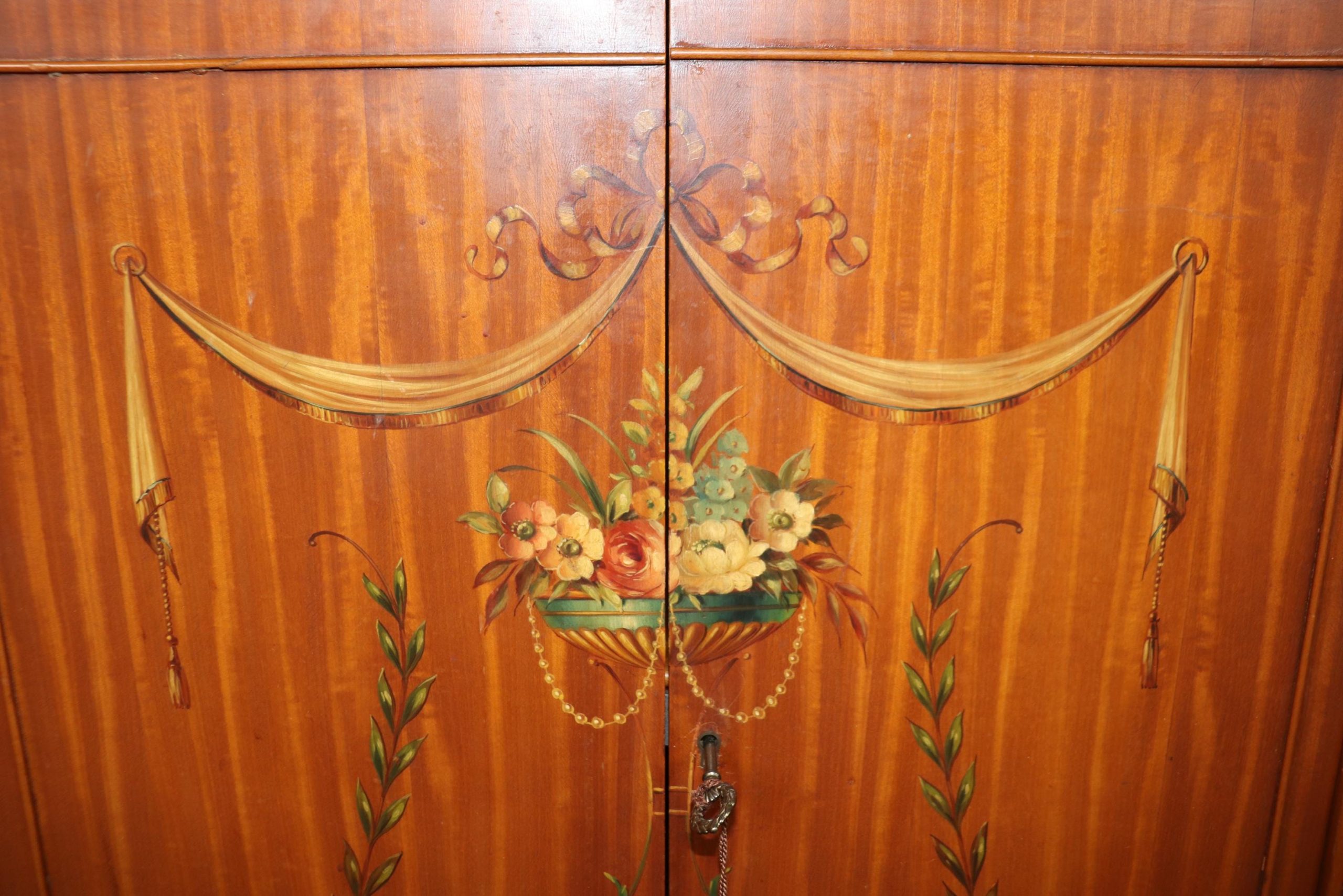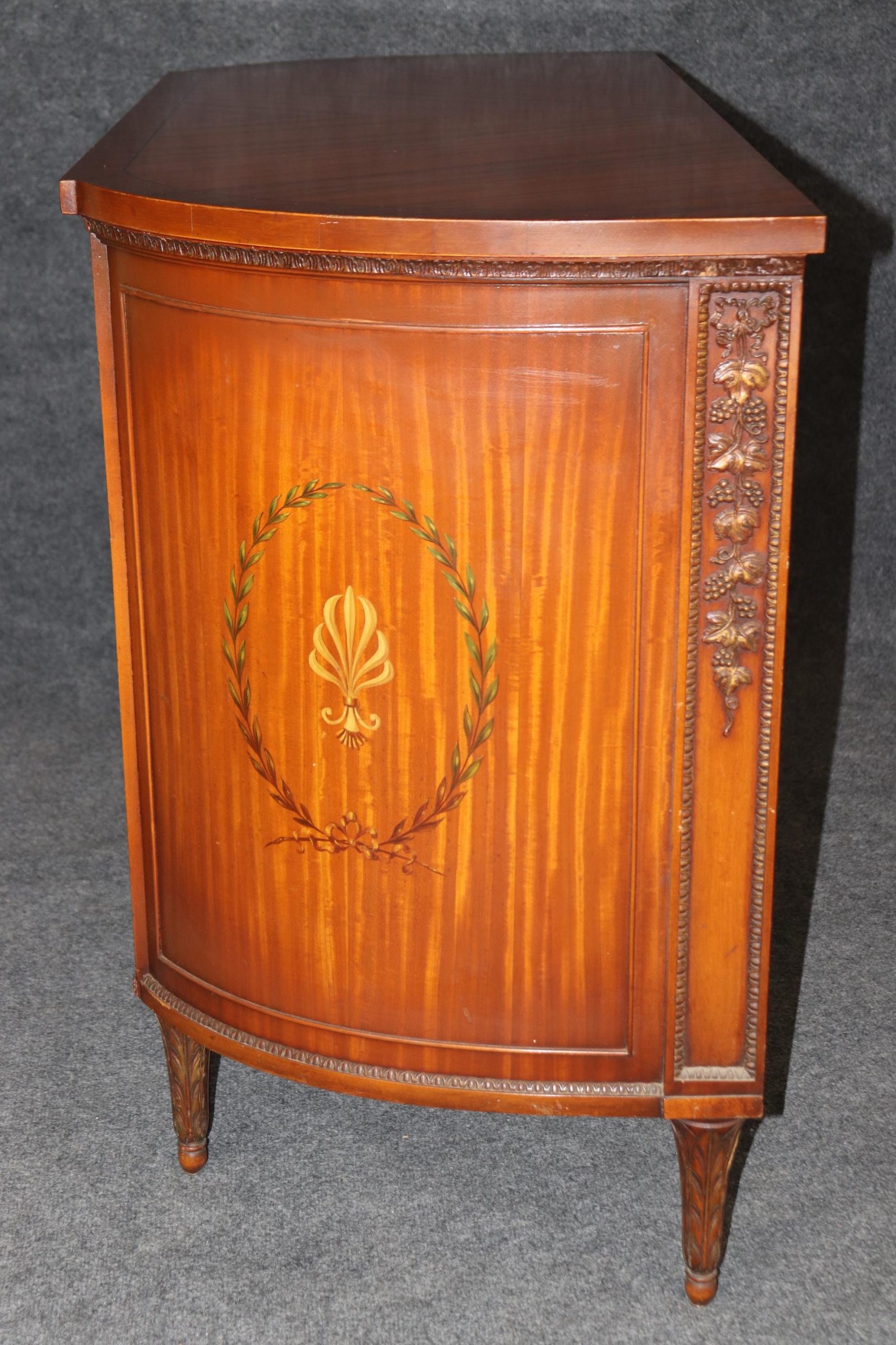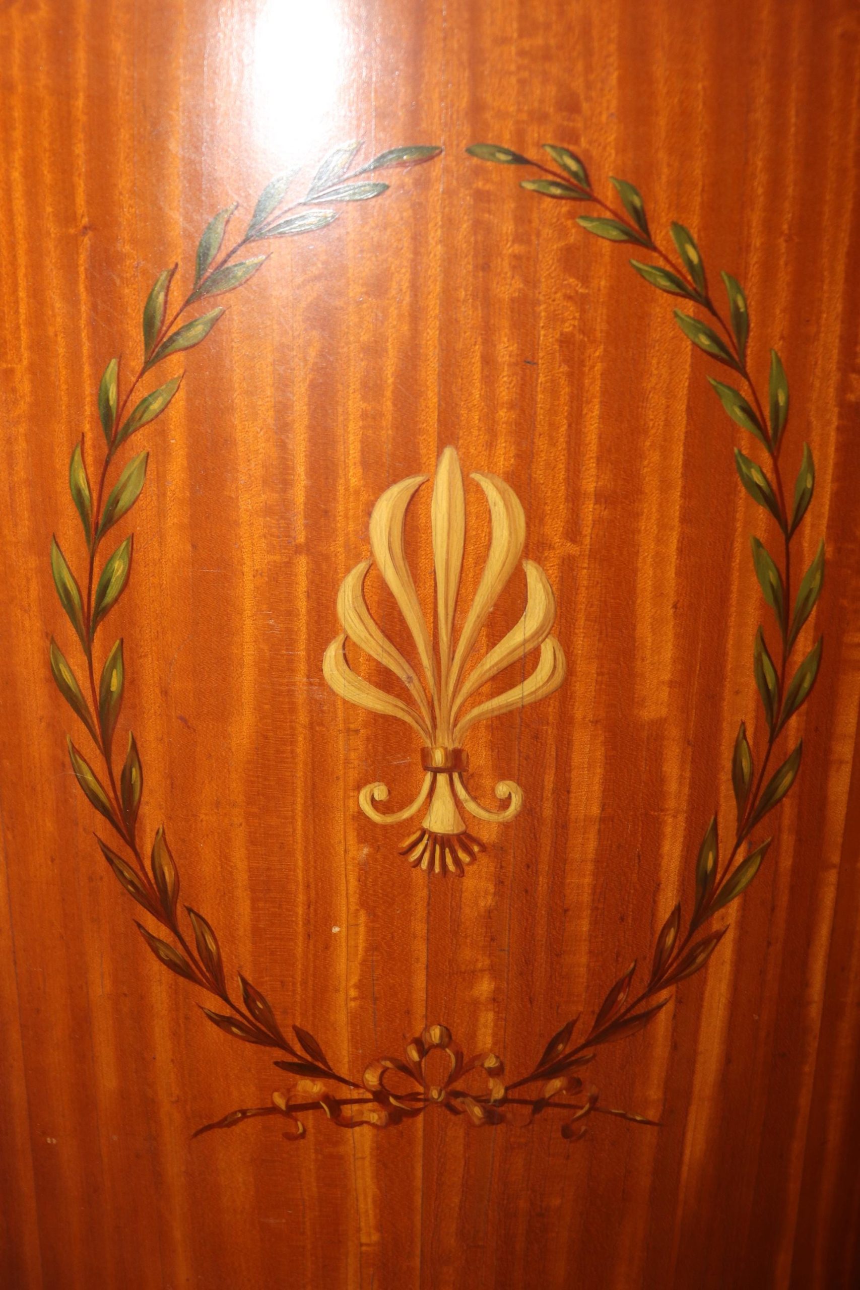 This antique English Adams style paint decorated satinwood demilune commode is of the highest quality! If you look closely at the photos provided, you will see the detail in the paint decoration throughout the piece! There is one locking door that contains one shelf – perfect for storing your personal belongings. This piece is truly a show stopper and will certainly be a conversation starter at your next gathering! This piece is perfect for any bedroom, living room, foyer, entryway or office! This piece gives off an overwhelming sense of luxury and glamour and can be paired with a variety of other styles you may already have in your home or place of choosing! Antique furniture and vintage pieces have stood the test of time and this commode is no exception! With its quality materials and great craftsmanship this piece is bound to last you and your family for many years to come. The commode is in good antique condition with minor surface scratches and finish loss, as to be expected of an item from the 1920s.