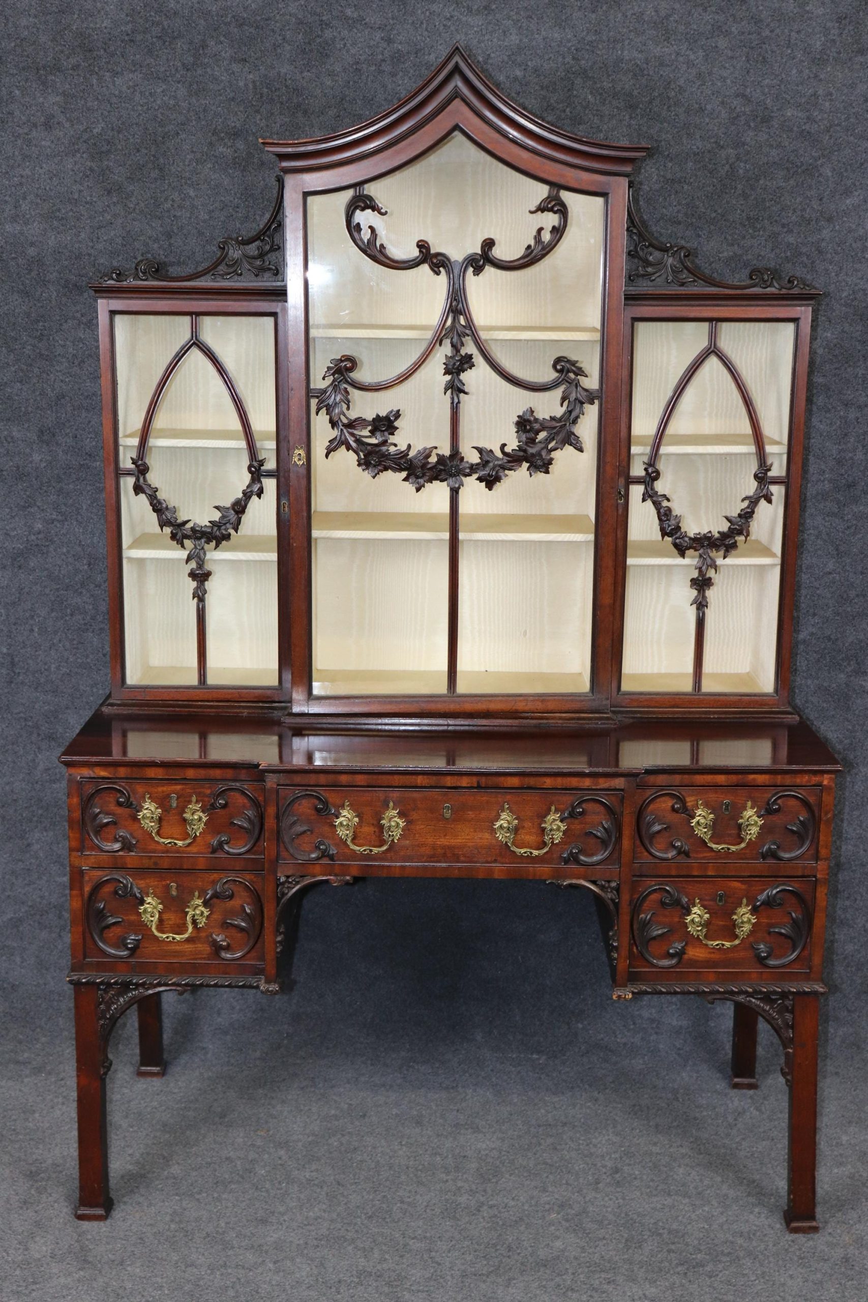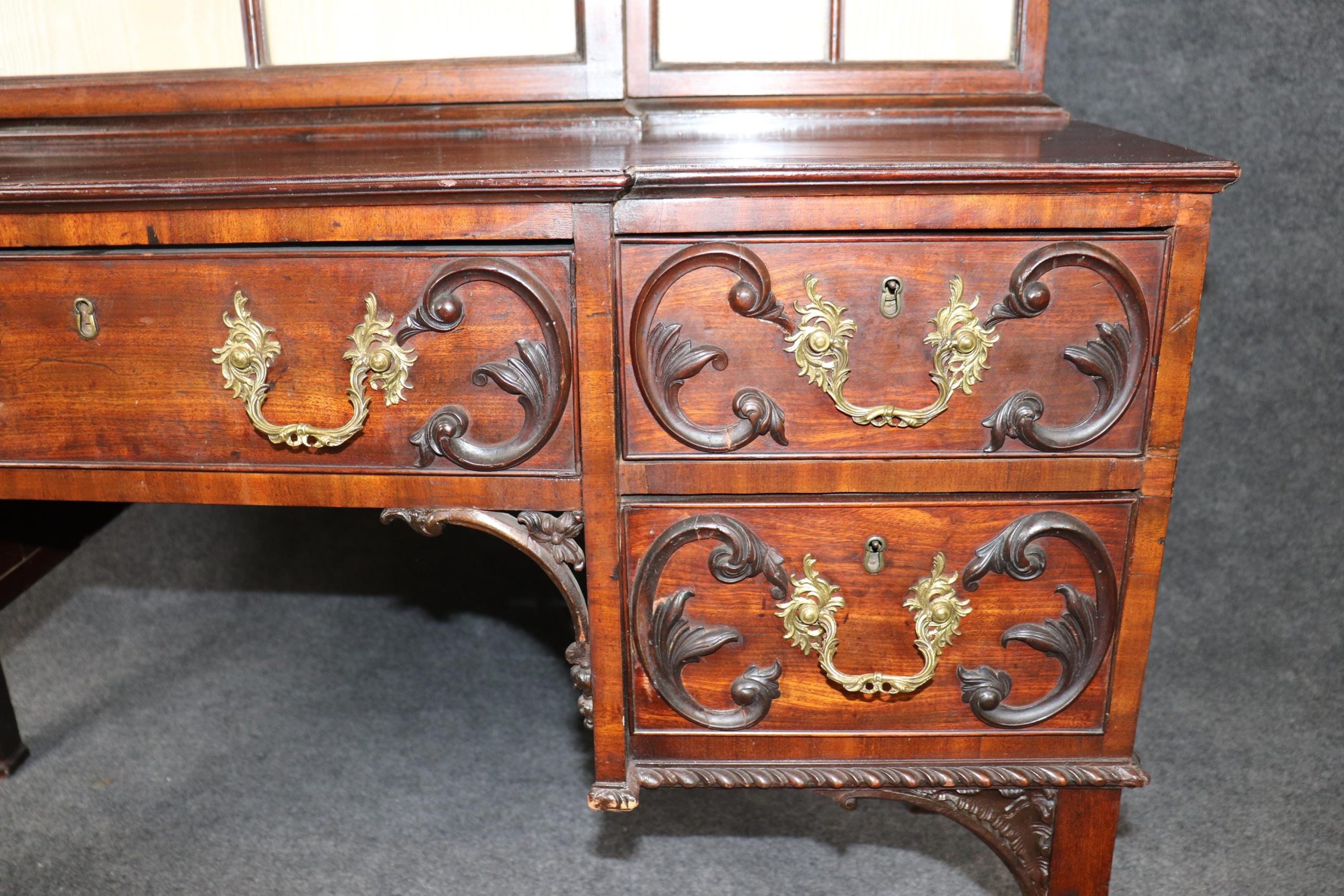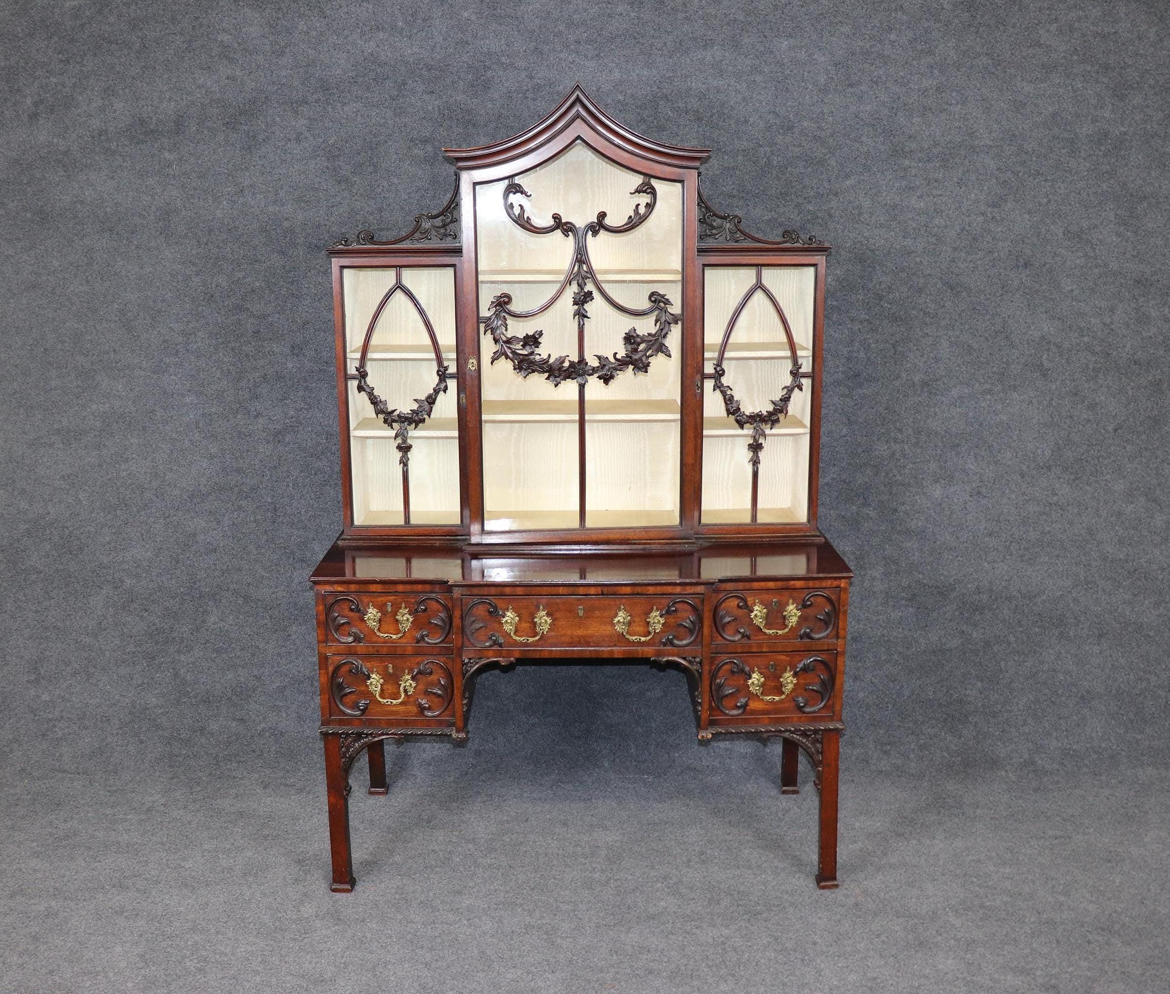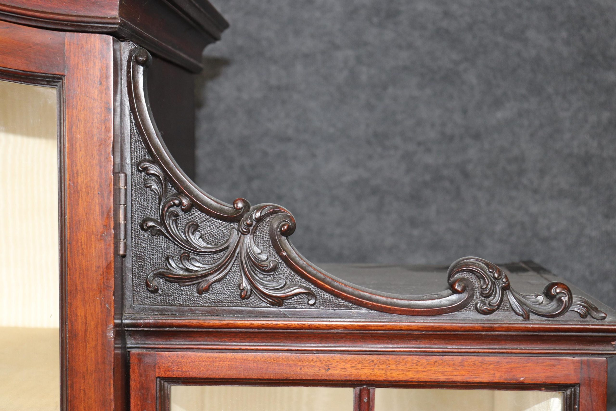 This antique English 2 piece carved display cabinet is made of the highest quality! If you look at the photos provided, you will see the attention to detail within the carvings on this piece. The piece has six shelves behind glass doors, perfect for showcasing some of your favorite objects! It also has 5 drawers, perfect for stowing items you don’t want displayed. This display cabinet is perfect for any entryway, dining room, living room or office and will bring a sense of luxury and class into your place of choosing and will certainly be a topic of conversation at your next gathering! Antique furniture and vintage pieces have stood the test of time and this cabinet is no exception! With its quality materials and great craftsmanship this is bound to last you and your family for many years to come. The piece is in antique condition with a crack in one class pane and a missing piece of wood, but otherwise good condition!