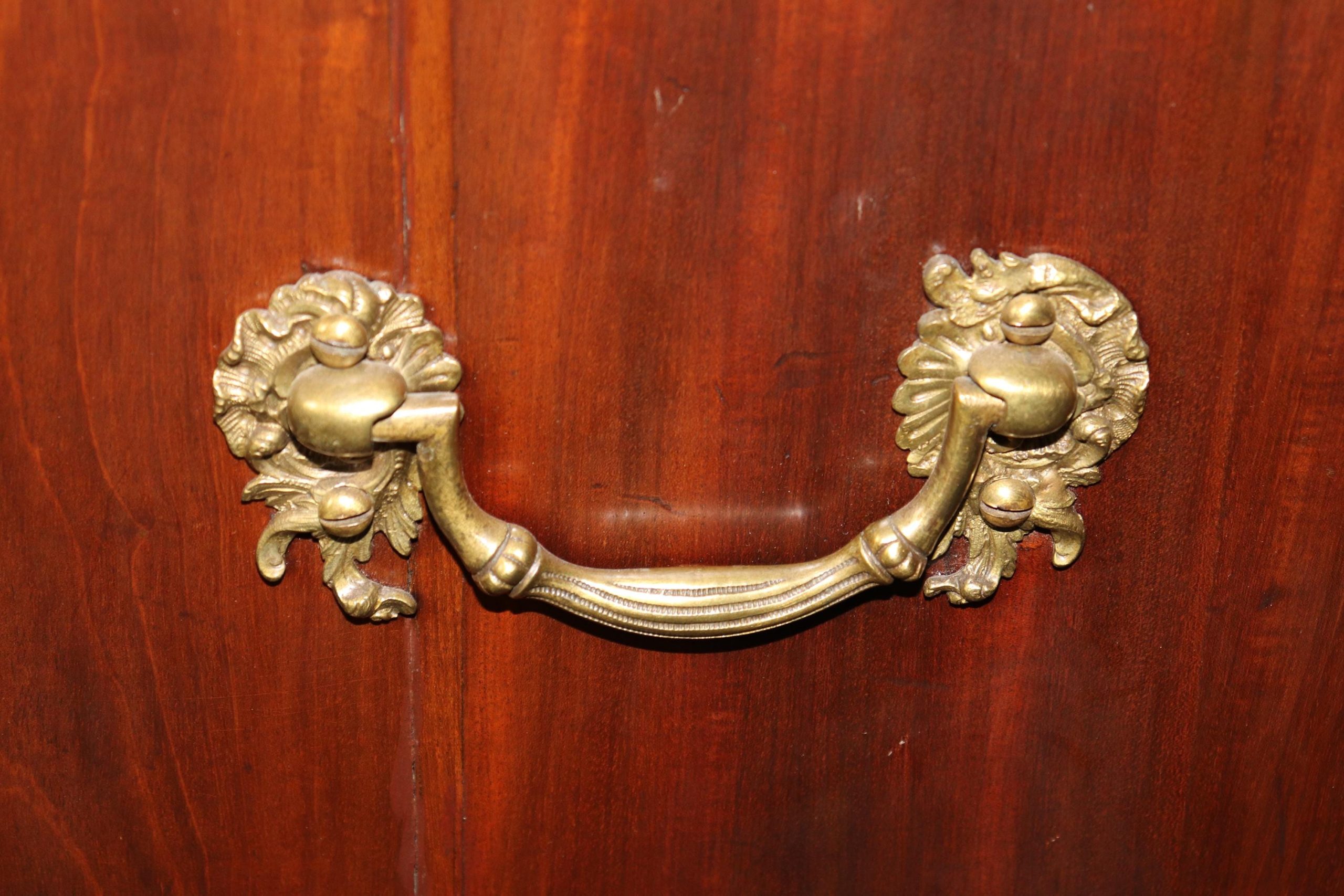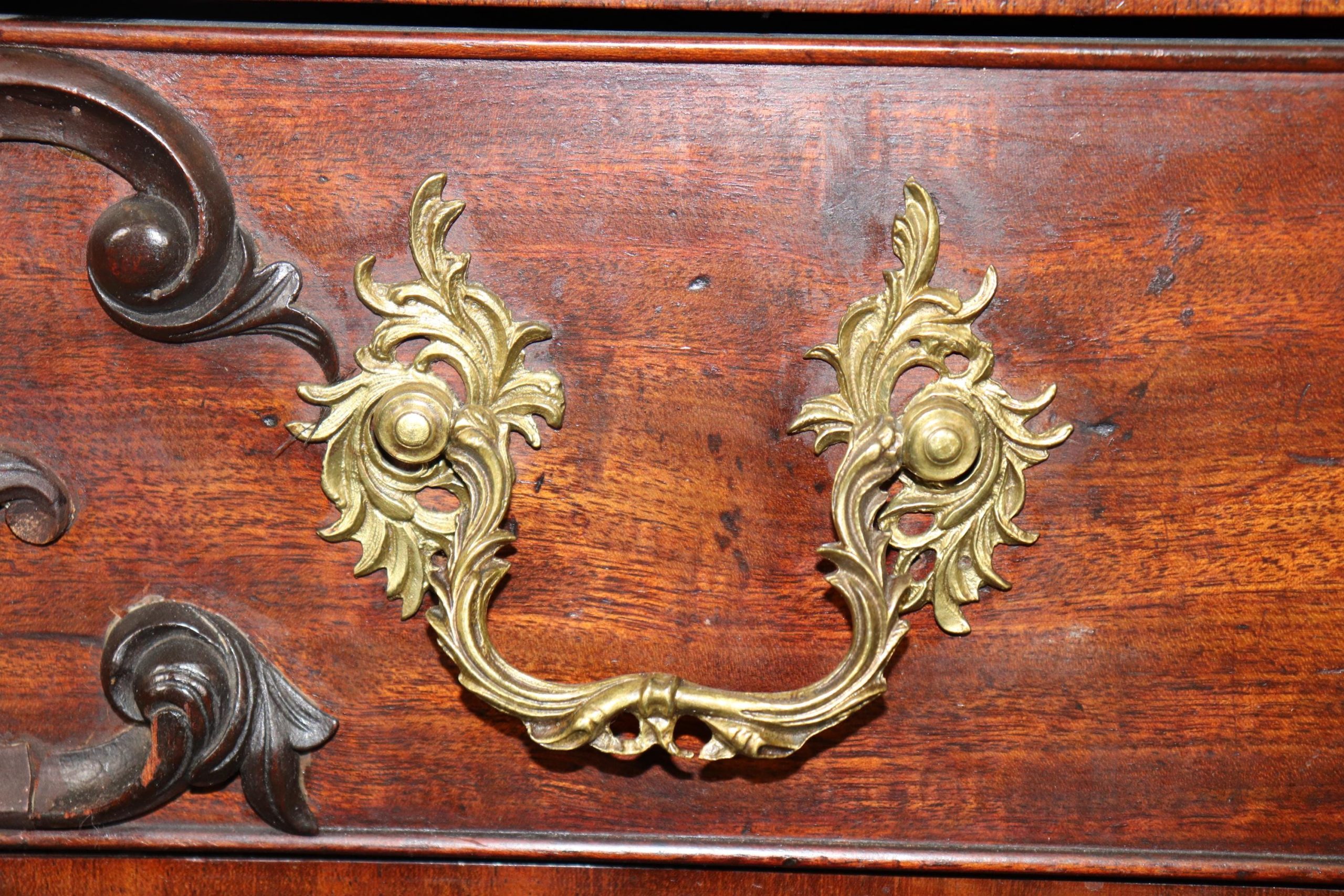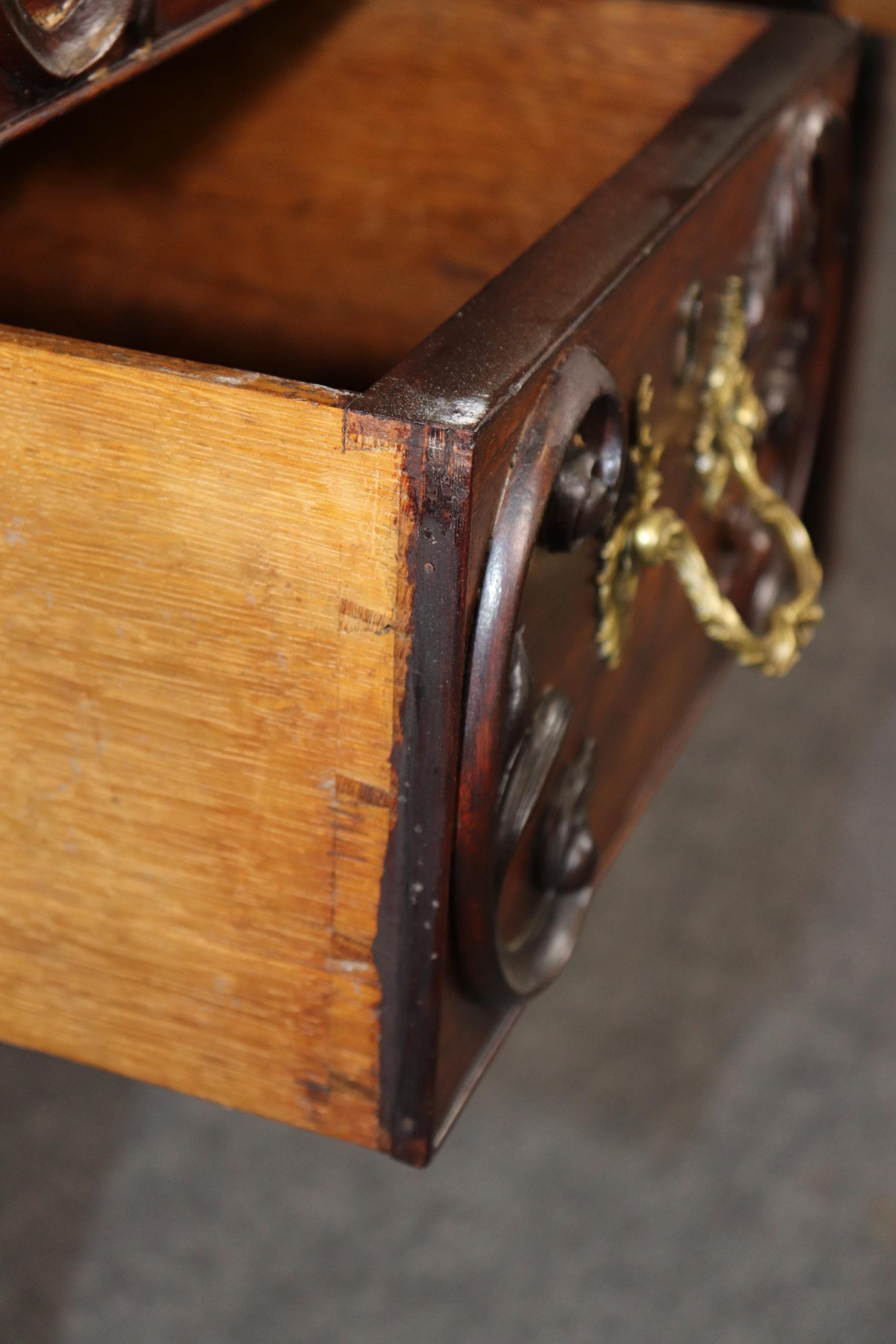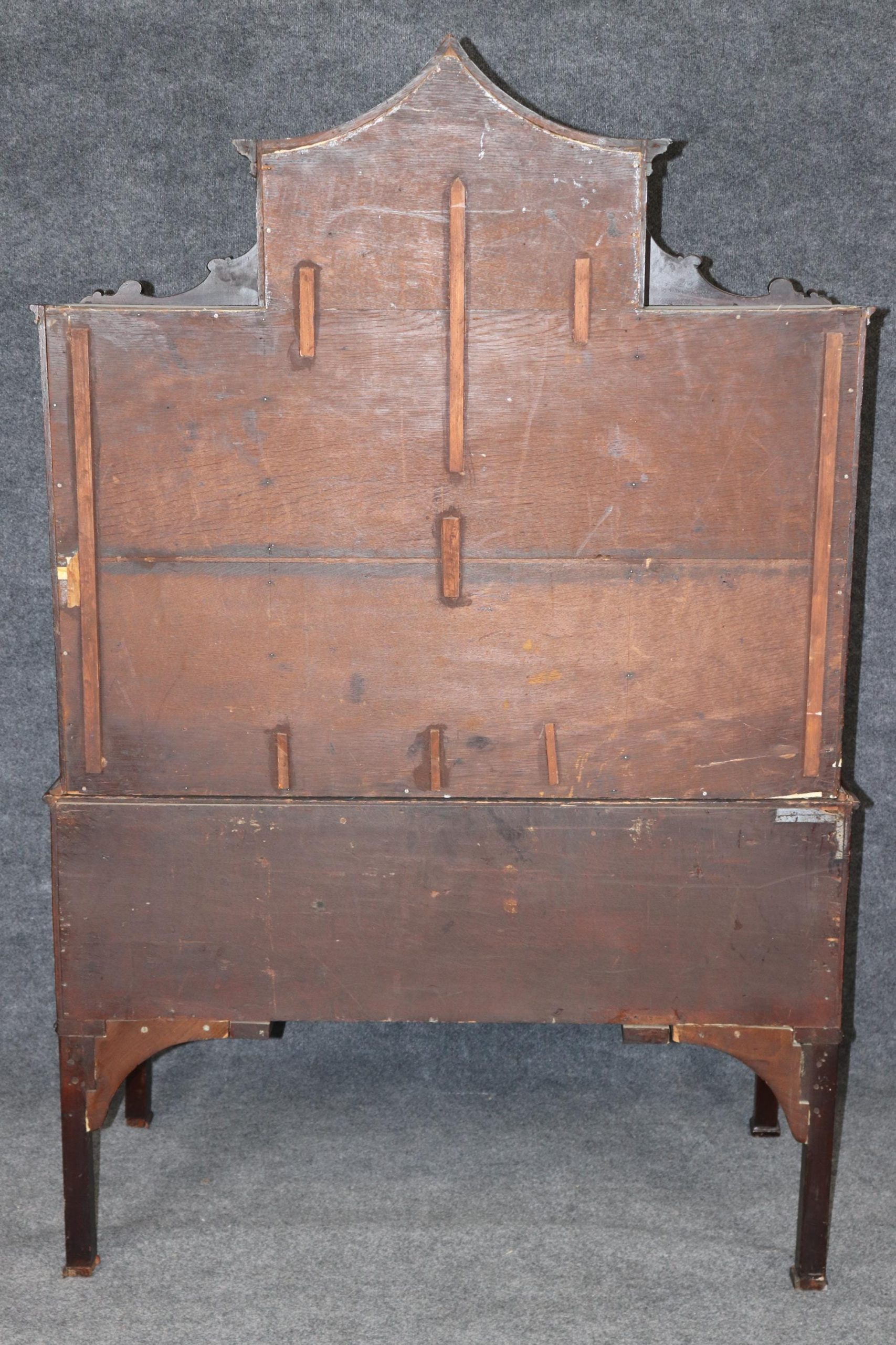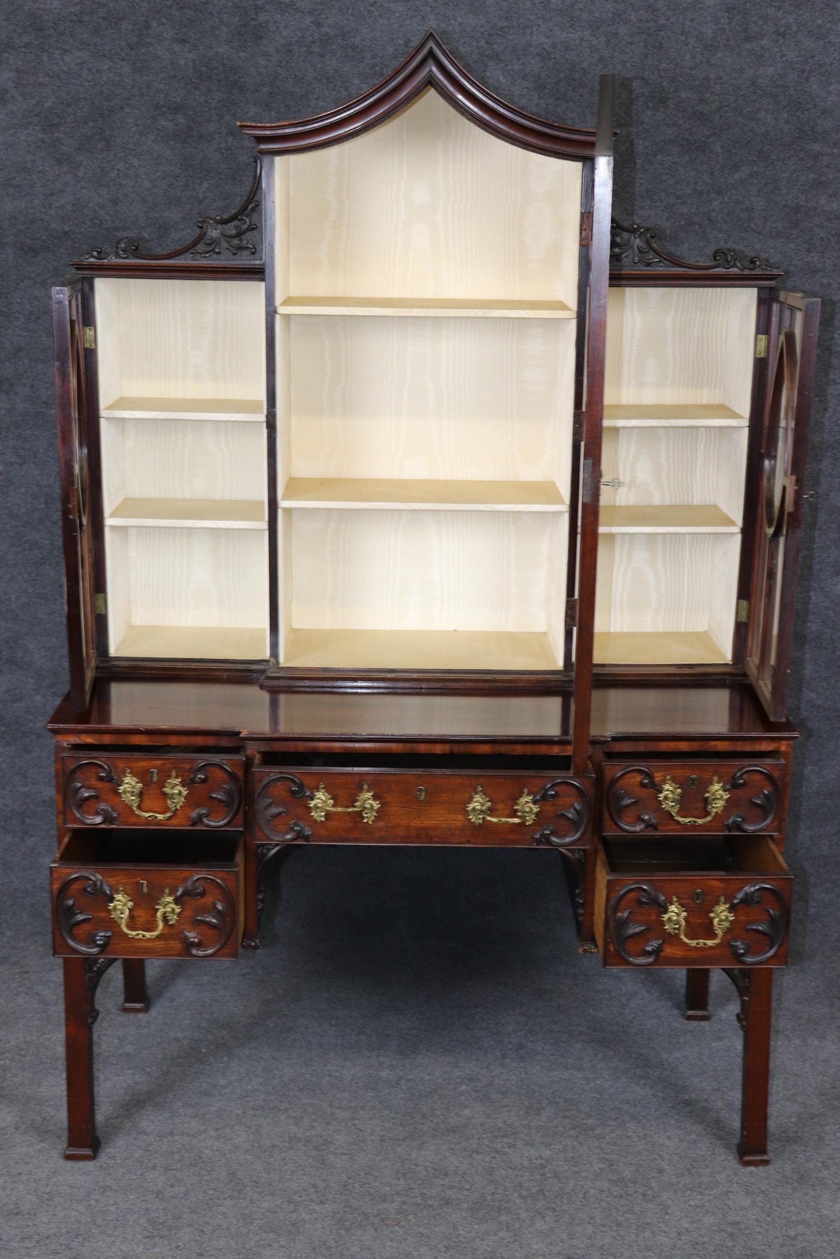This antique English 2 piece carved display cabinet is made of the highest quality! If you look at the photos provided, you will see the attention to detail within the carvings on this piece. The piece has six shelves behind glass doors, perfect for showcasing some of your favorite objects! It also has 5 drawers, perfect for stowing items you don’t want displayed. This display cabinet is perfect for any entryway, dining room, living room or office and will bring a sense of luxury and class into your place of choosing and will certainly be a topic of conversation at your next gathering! Antique furniture and vintage pieces have stood the test of time and this cabinet is no exception! With its quality materials and great craftsmanship this is bound to last you and your family for many years to come. The piece is in antique condition with a crack in one class pane and a missing piece of wood, but otherwise good condition!