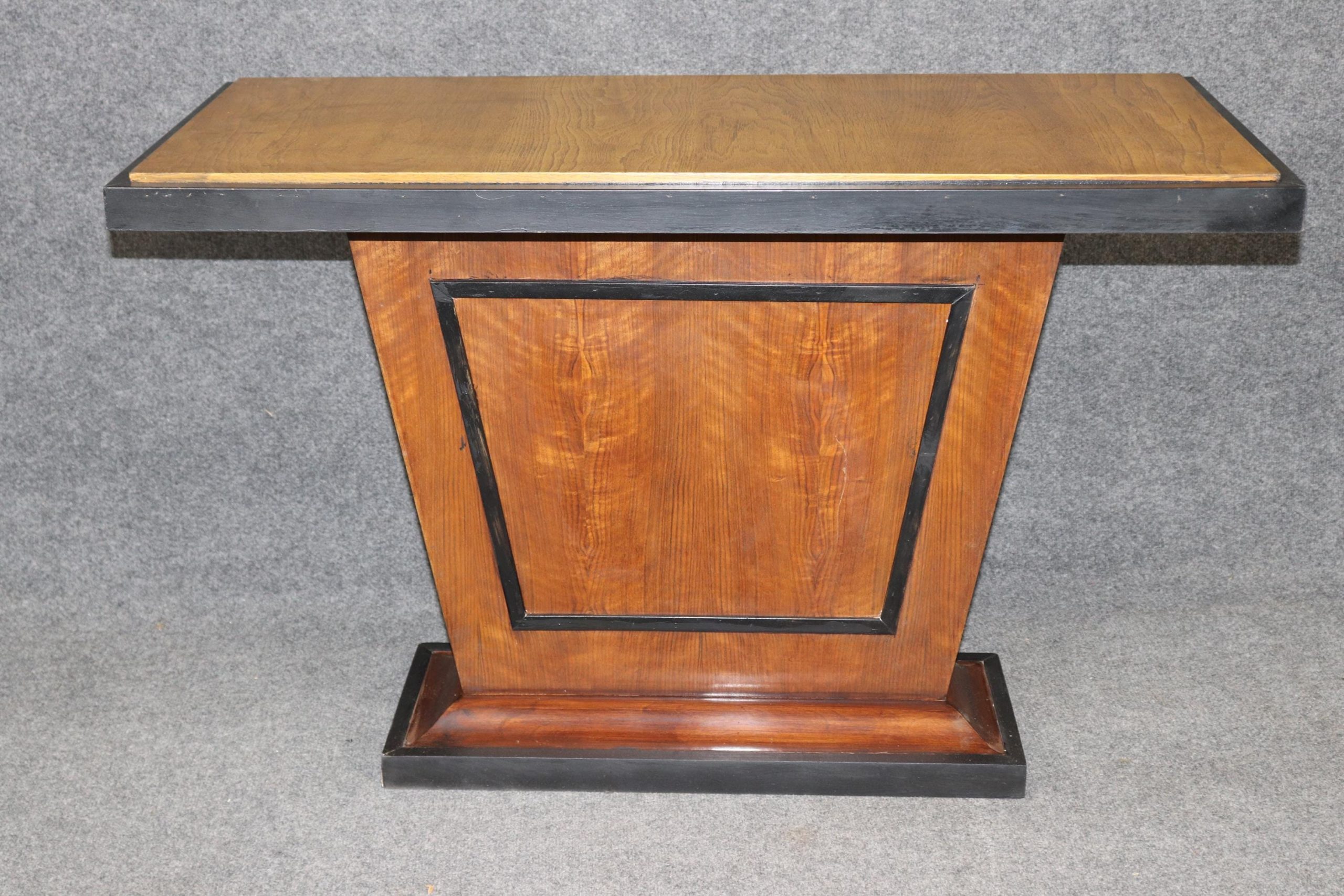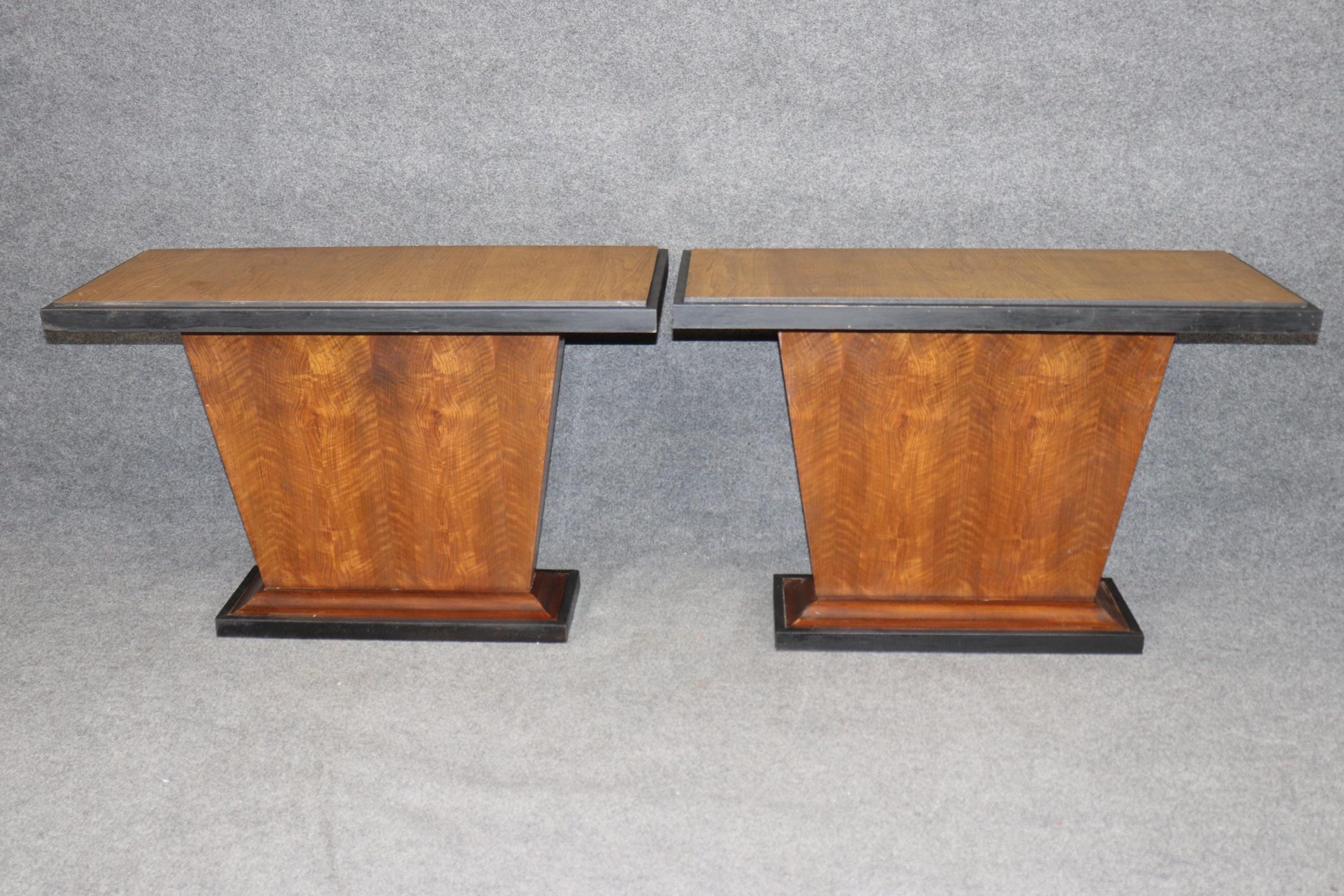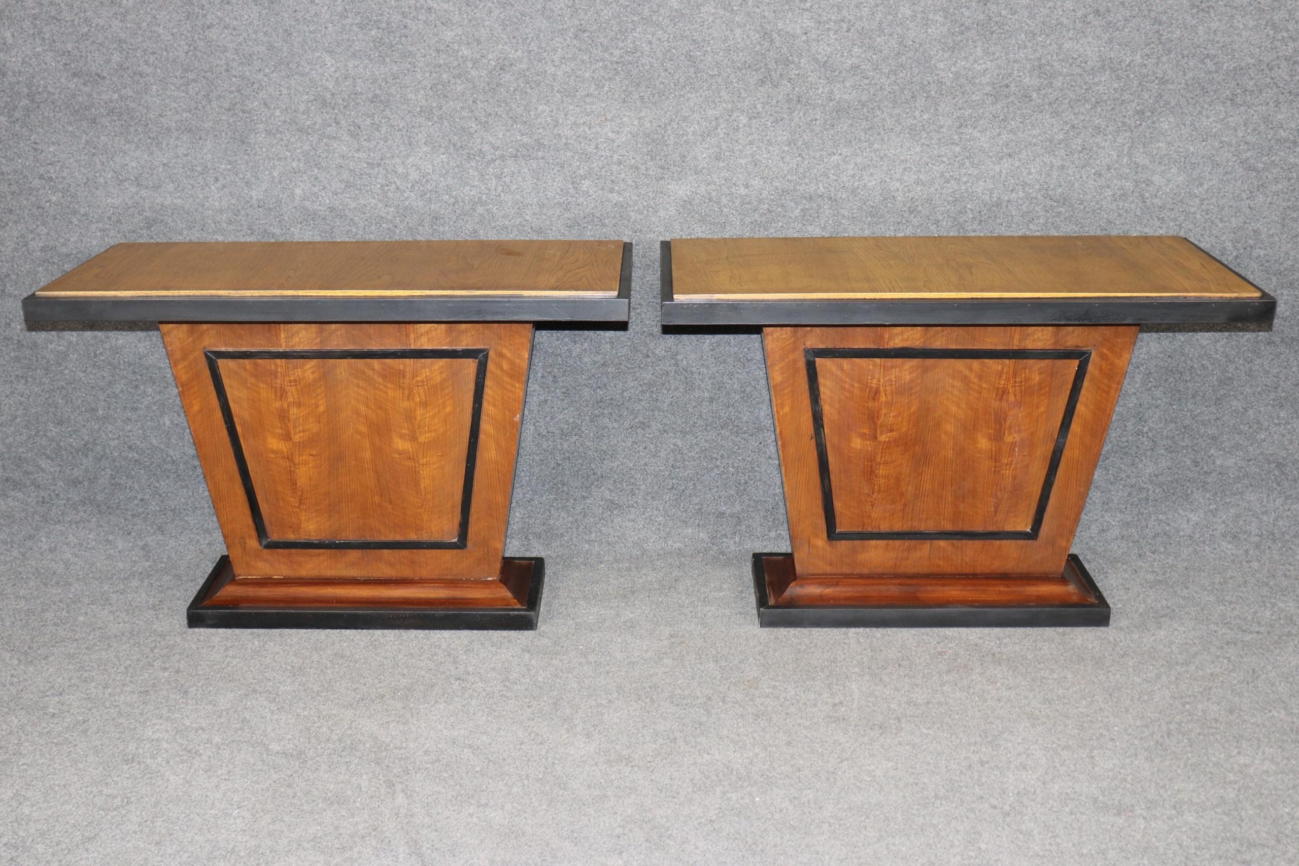 The rarity of finding a matched pair makes these console tables especially desirable. Whether placed symmetrically in a grand entry, flanking a doorway, or used individually in different rooms, they bring an unmistakable sense of Parisian Art Deco glamour while remaining practical and versatile in scale. The pair is in good antique condition with the exception of some light surface scratches, Minor finish loss and normal age related wear. As to be expected with items of age and use.