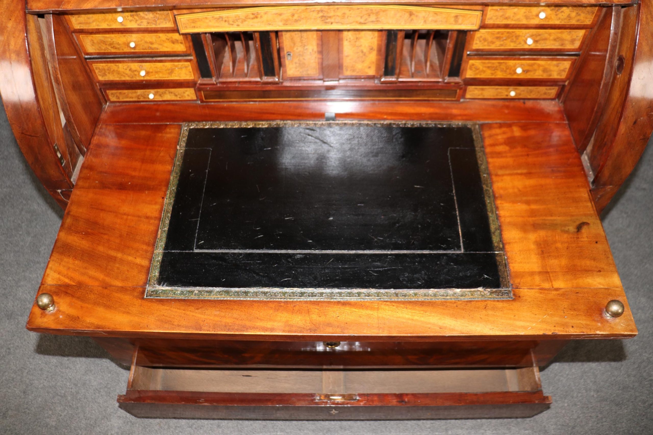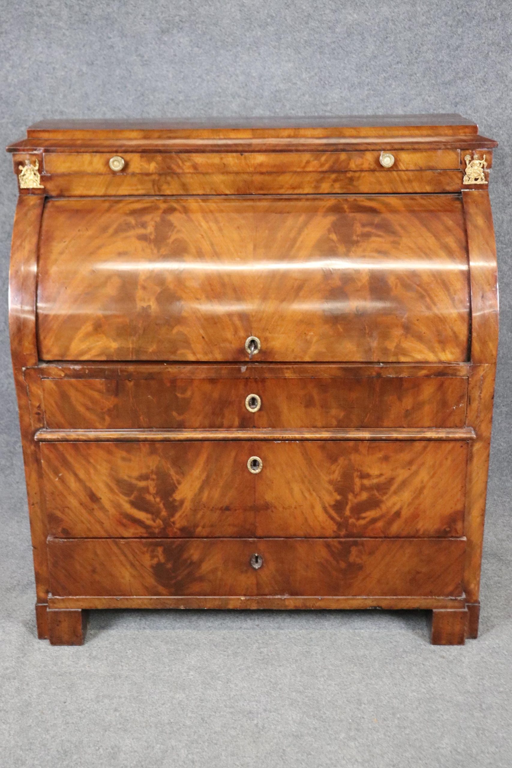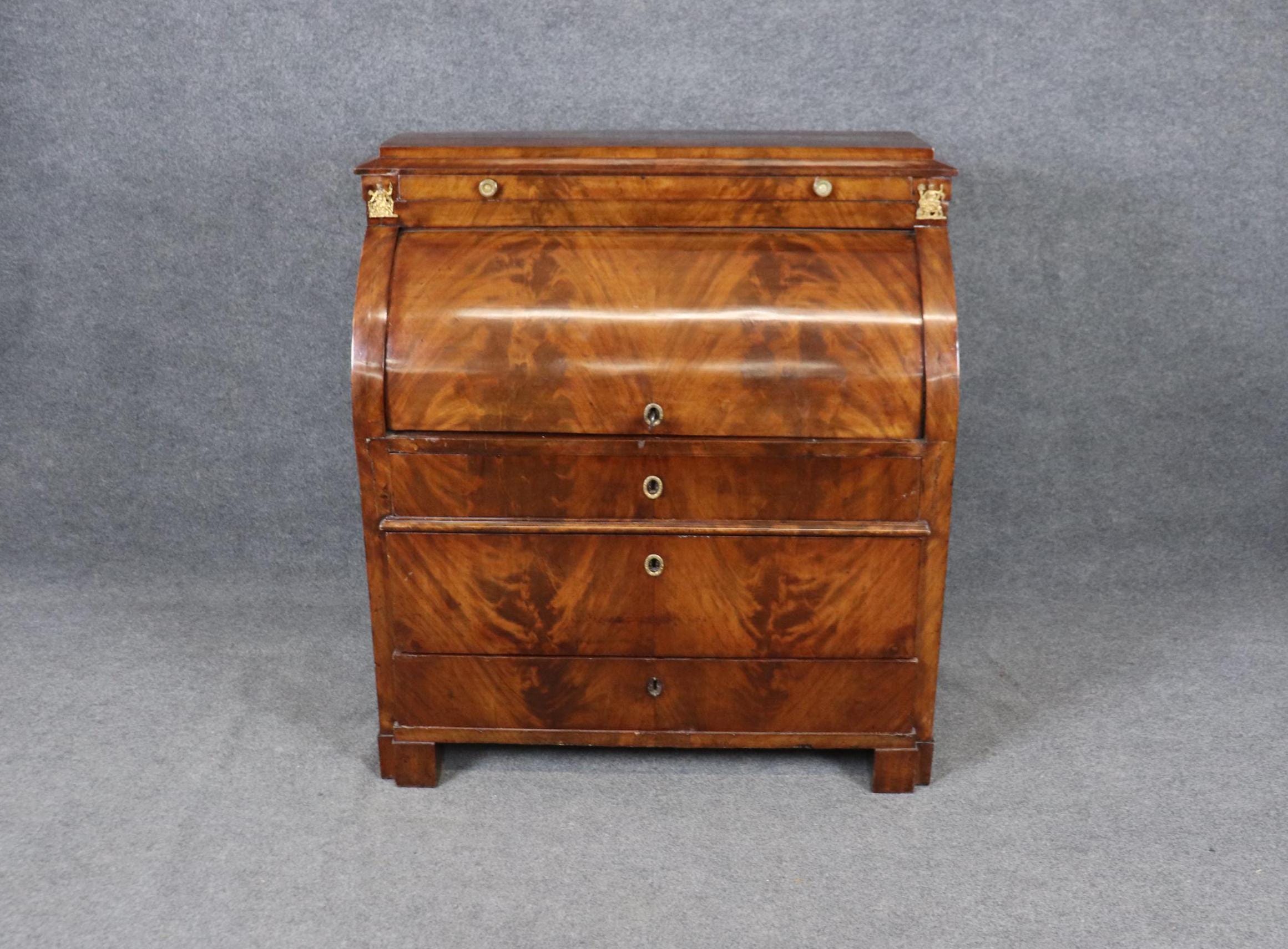 This antique late 19th Century French Empire style cylinder desk is really unique and made of the highest quality! If you look at the photos provided, you can see that the cylinder top opens to a leather top writing desk. This piece is equipped with 3 drawers, perfect for keeping your personal belongings safe and out of reach. This piece is perfect for use as a decorative object or can be used as a desk in your bedroom, entryway, office or place of your choosing! Antique furniture and vintage pieces have stood the test of time and this cylinder desk is no exception! With its quality materials and great craftsmanship this piece is bound to last you and your family for many years to come! This piece is in antique condition with age related wear and a missing escutcheon, but otherwise good condition.