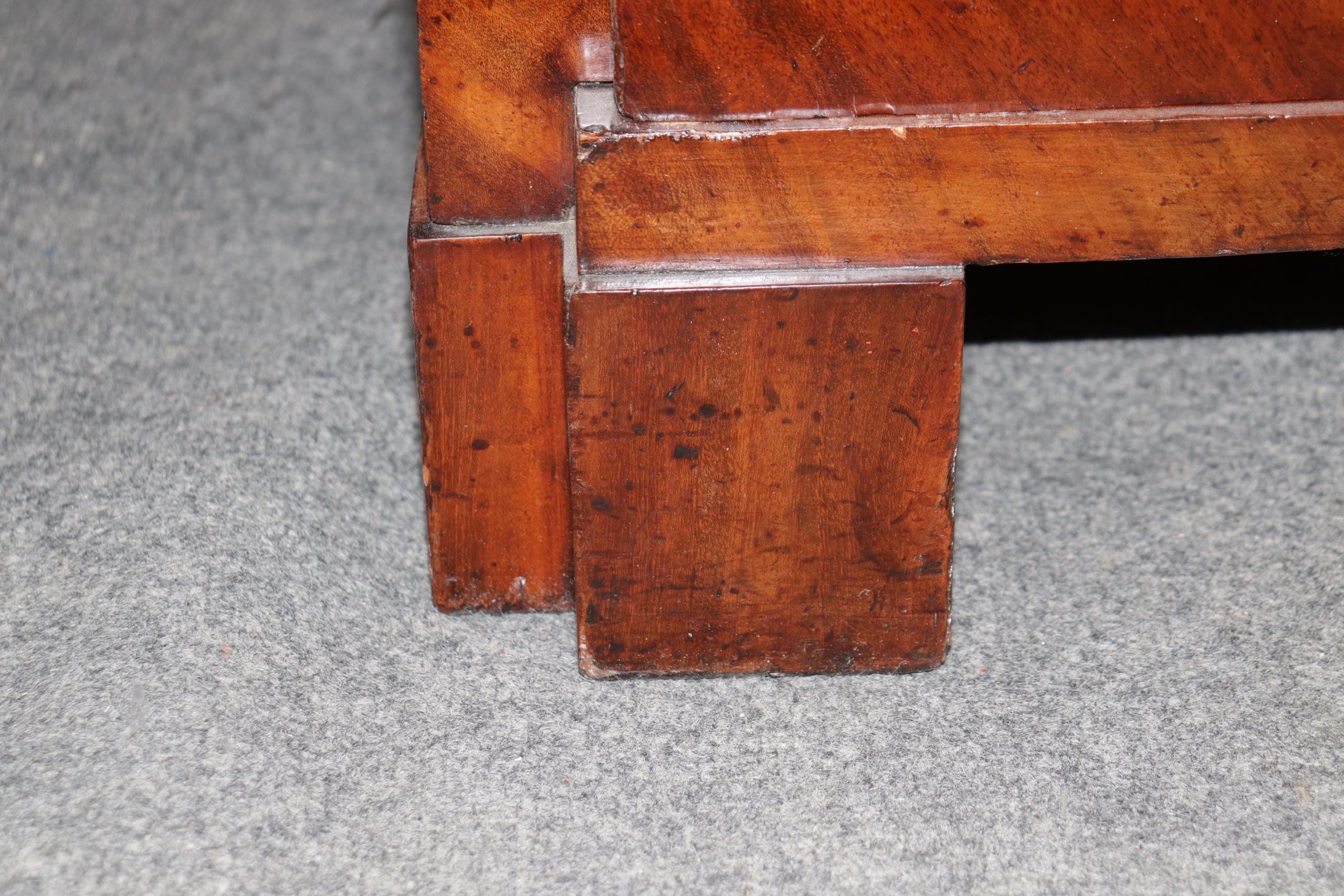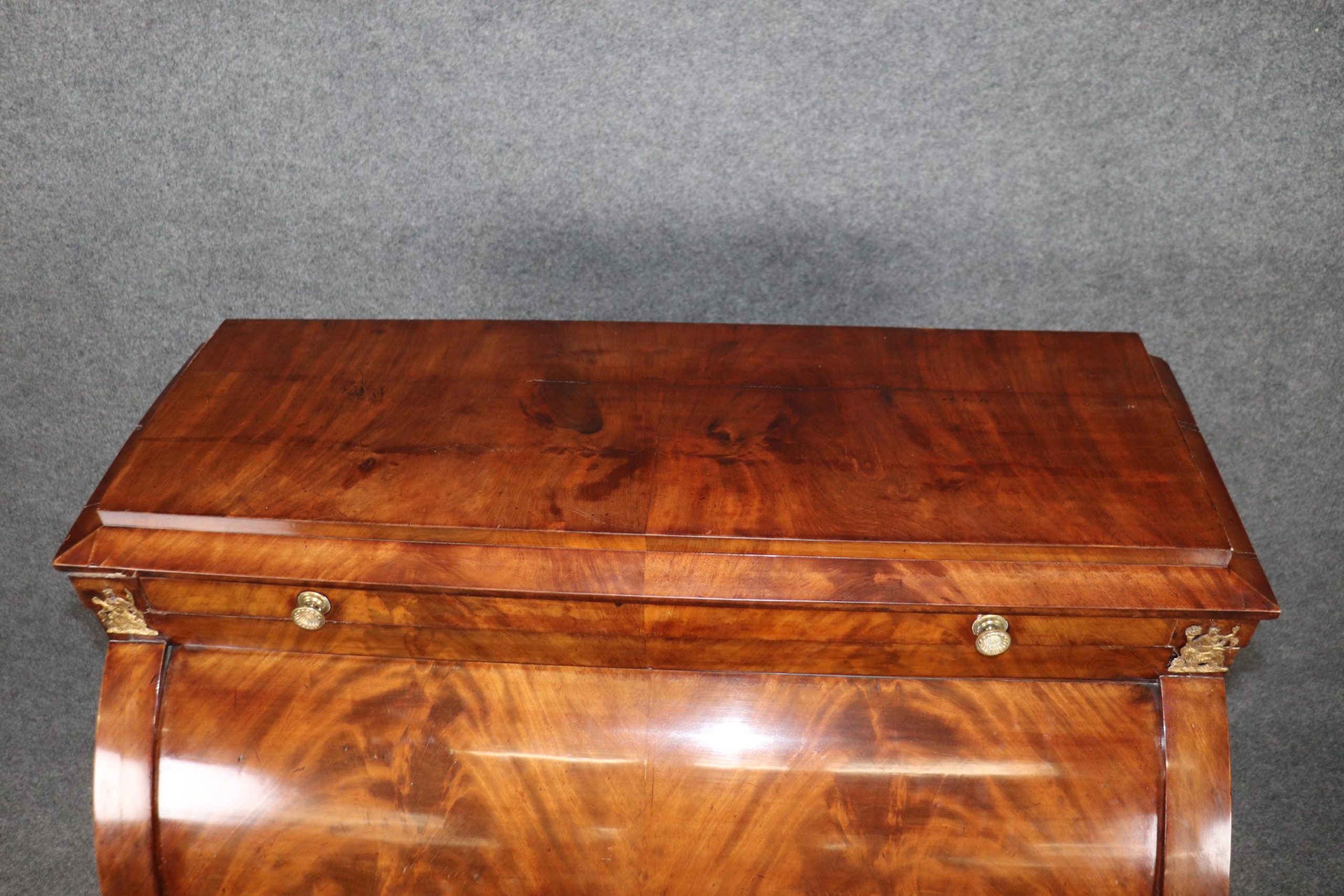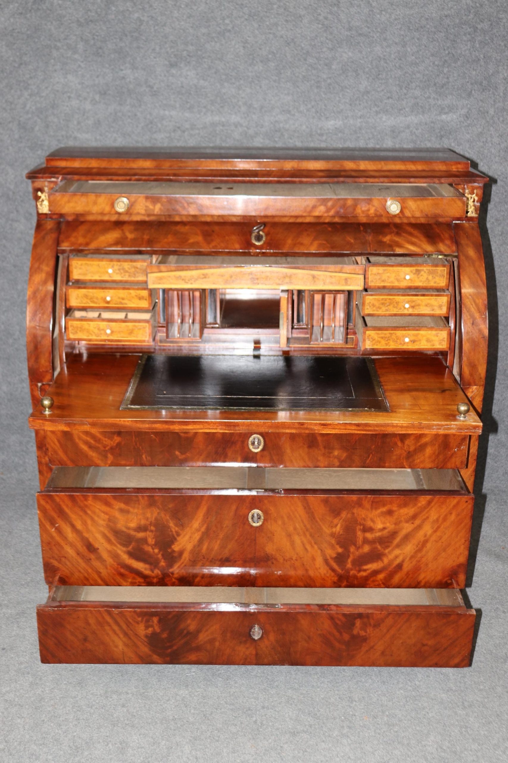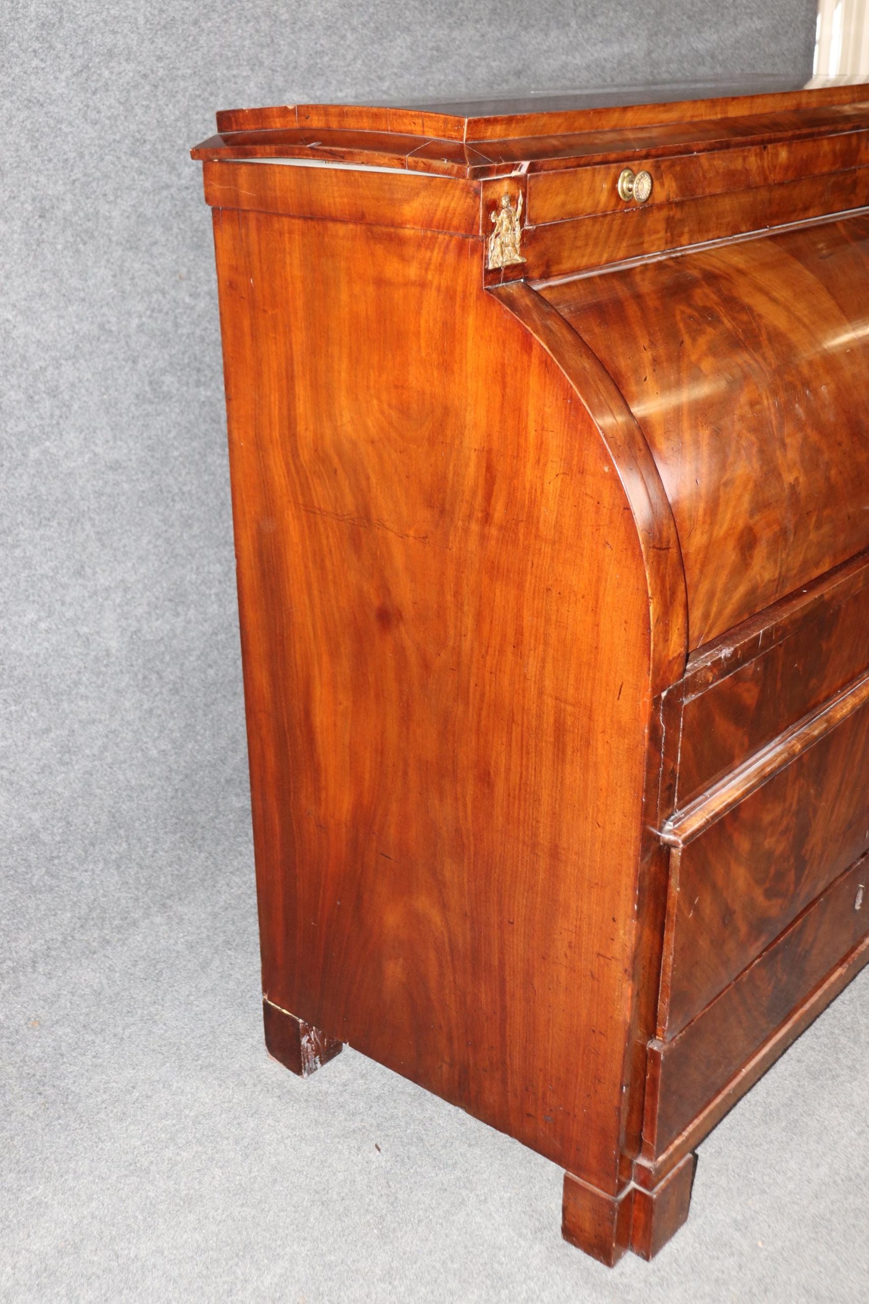 This antique late 19th Century French Empire style cylinder desk is really unique and made of the highest quality! If you look at the photos provided, you can see that the cylinder top opens to a leather top writing desk. This piece is equipped with 3 drawers, perfect for keeping your personal belongings safe and out of reach. This piece is perfect for use as a decorative object or can be used as a desk in your bedroom, entryway, office or place of your choosing! Antique furniture and vintage pieces have stood the test of time and this cylinder desk is no exception! With its quality materials and great craftsmanship this piece is bound to last you and your family for many years to come! This piece is in antique condition with age related wear and a missing escutcheon, but otherwise good condition.