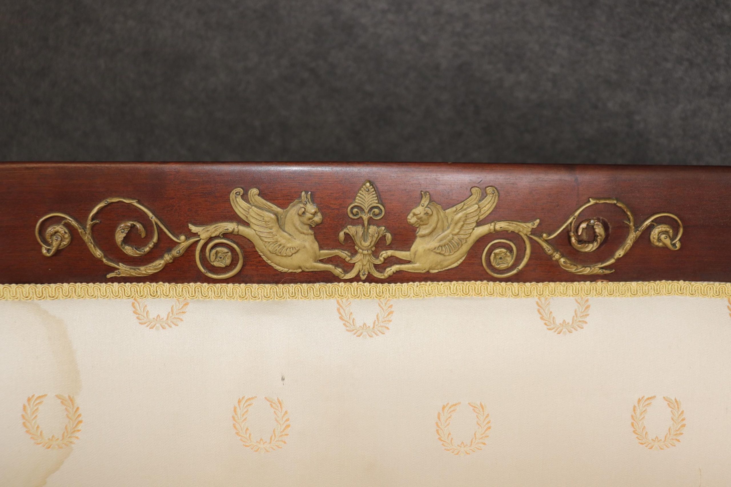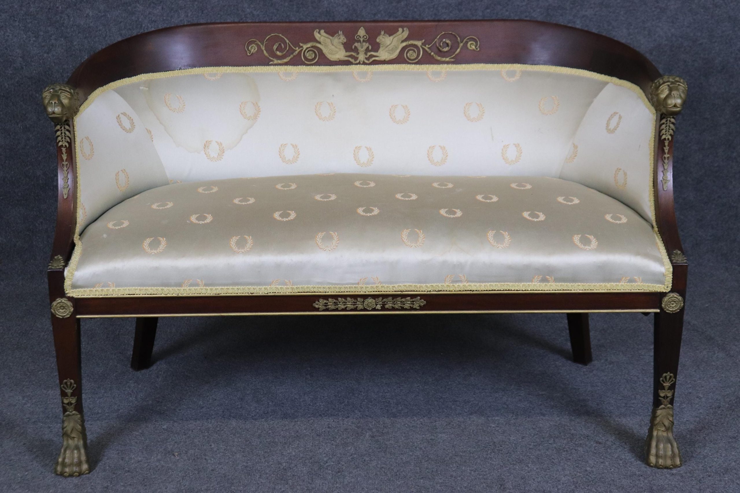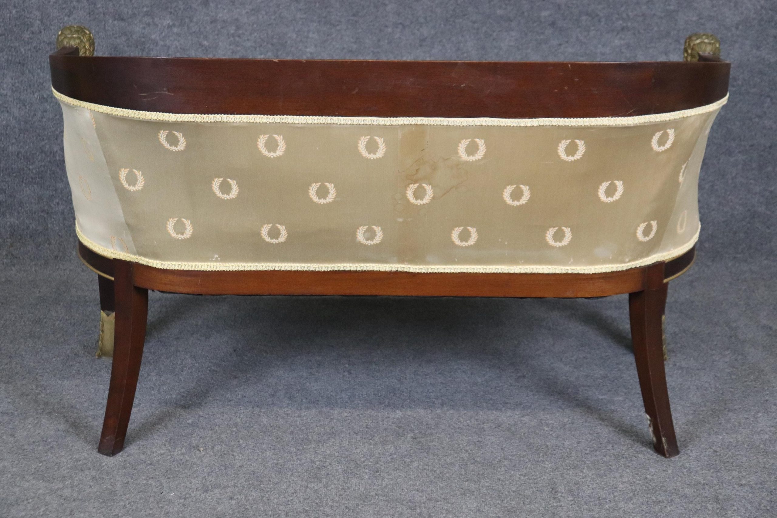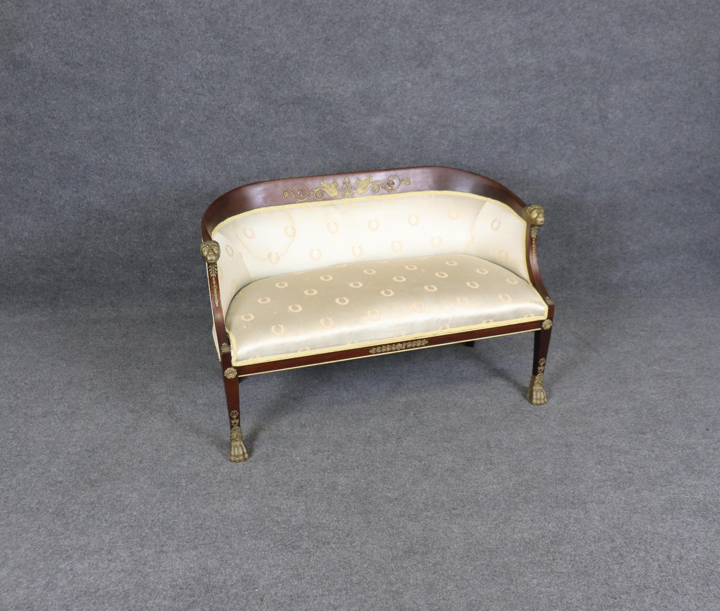 This antique French Empire style bronze mounted settee loveseat is made of the highest quality! This piece is perfect for any living room, den, foyer, entryway or office and gives off a sense of class and sophistication like you wouldn’t believe! This piece can also be paired with a variety of other styles you may already have in your home due to its simple yet luxurious design and color way. This settee is ideal for anyone in an apartment or any smaller space that wants to add character into their home due to its size and design. Antique furniture and vintage pieces have stood the test of time and this settee is no exception! With its quality materials and great craftsmanship this piece is bound to last you and your family for many years to come. This piece is in good antique condition with some surface scratches and minor chips as to be expected with an item from the 1920’s! The gold striped silk upholstery has staining (as shown), reupholstery is recommended.