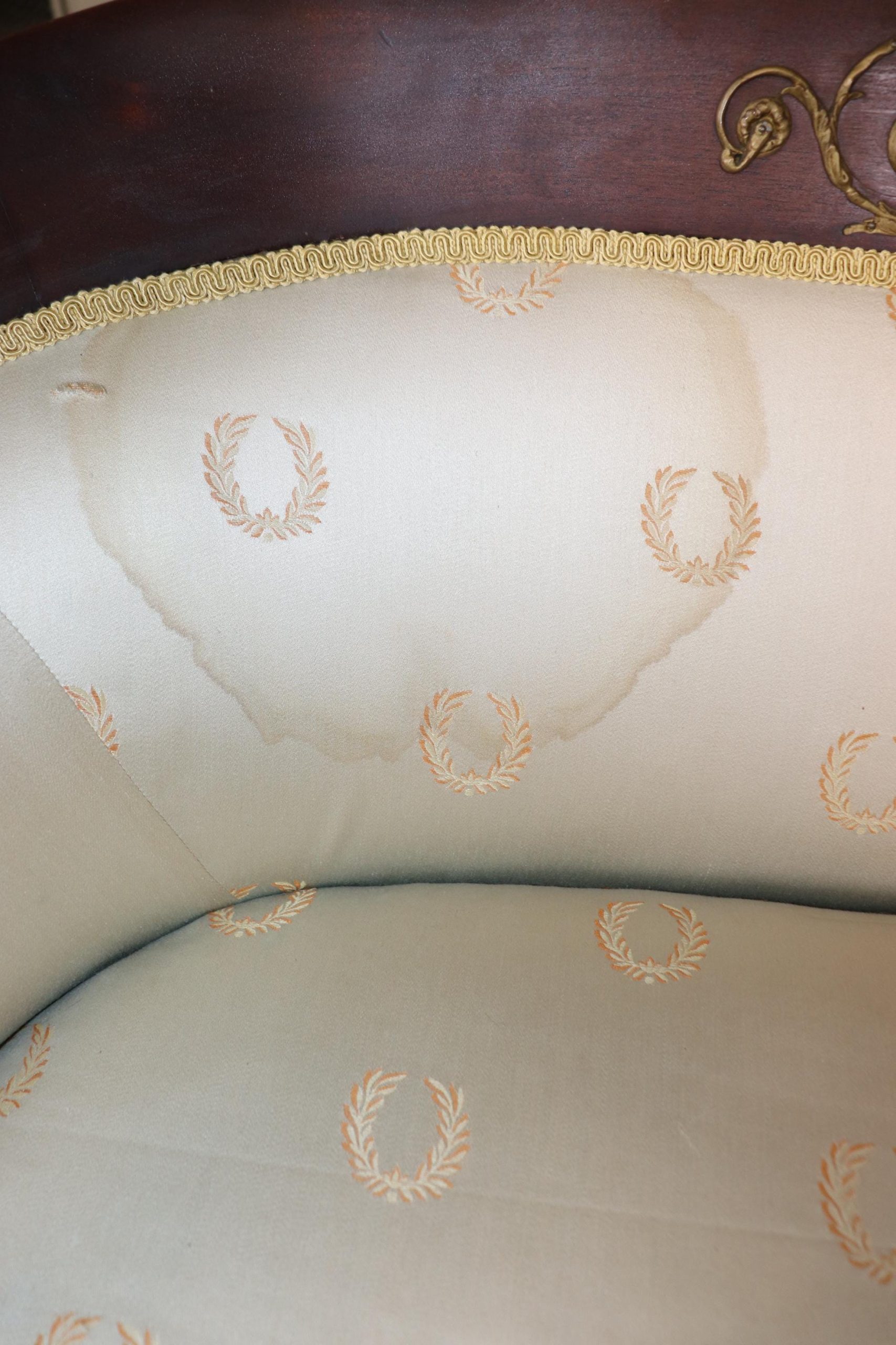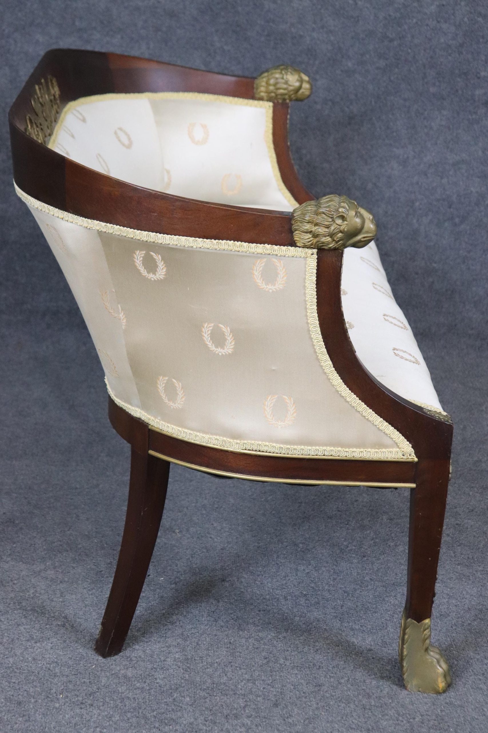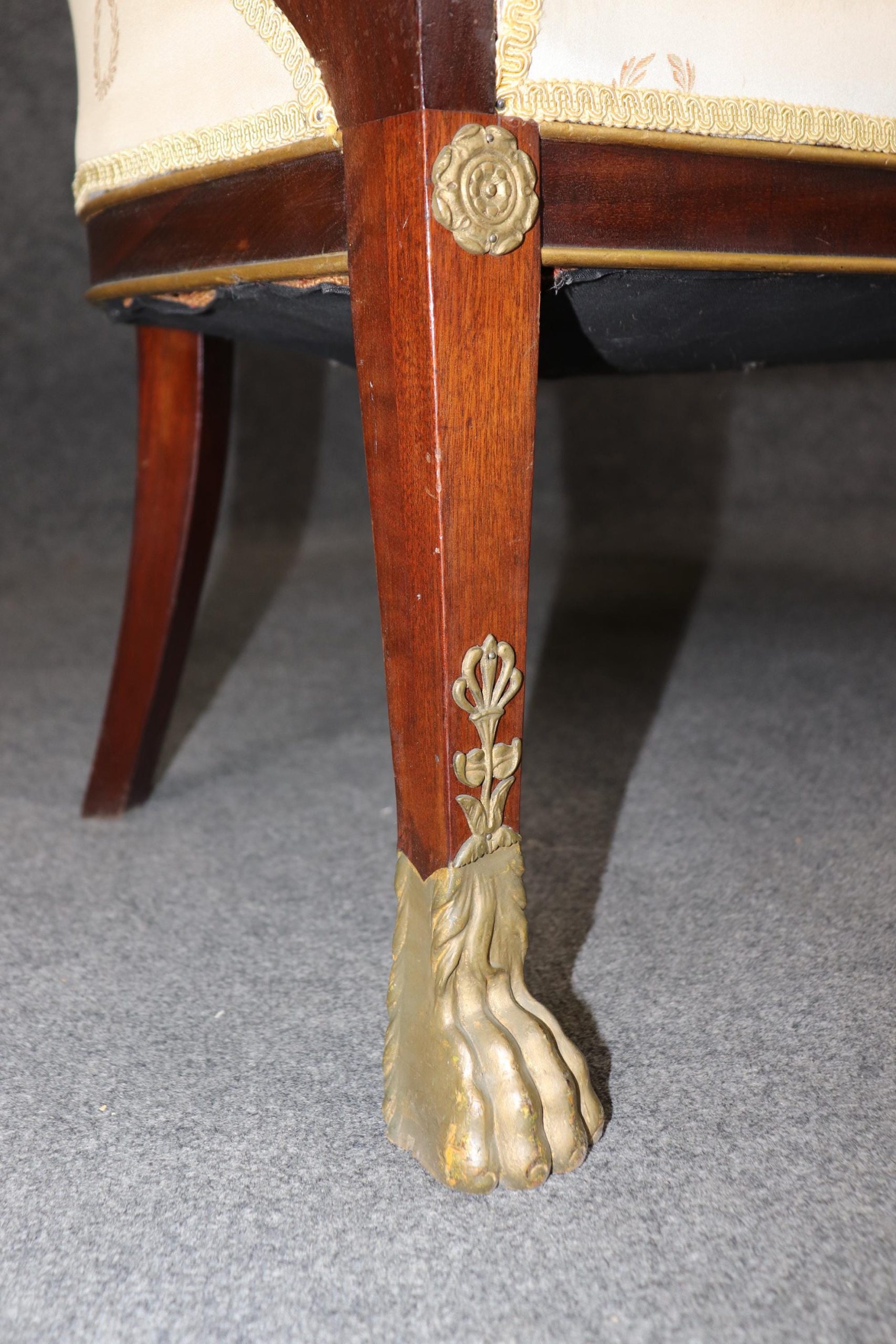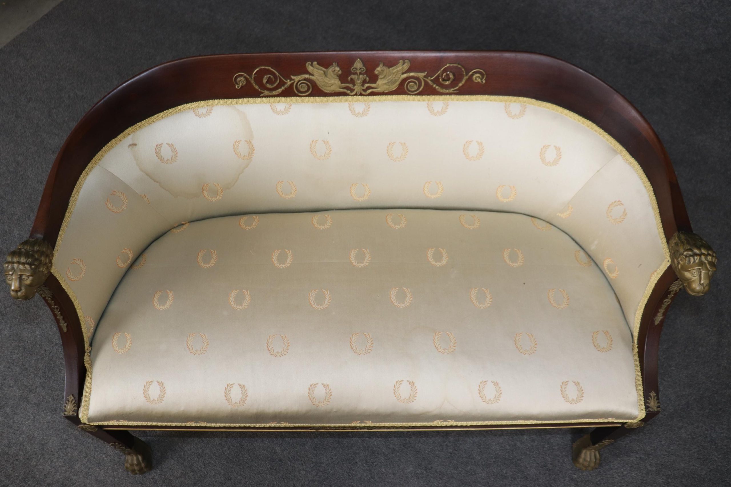This antique French Empire style bronze mounted settee loveseat is made of the highest quality! This piece is perfect for any living room, den, foyer, entryway or office and gives off a sense of class and sophistication like you wouldn’t believe! This piece can also be paired with a variety of other styles you may already have in your home due to its simple yet luxurious design and color way. This settee is ideal for anyone in an apartment or any smaller space that wants to add character into their home due to its size and design. Antique furniture and vintage pieces have stood the test of time and this settee is no exception! With its quality materials and great craftsmanship this piece is bound to last you and your family for many years to come. This piece is in good antique condition with some surface scratches and minor chips as to be expected with an item from the 1920’s! The gold striped silk upholstery has staining (as shown), reupholstery is recommended.