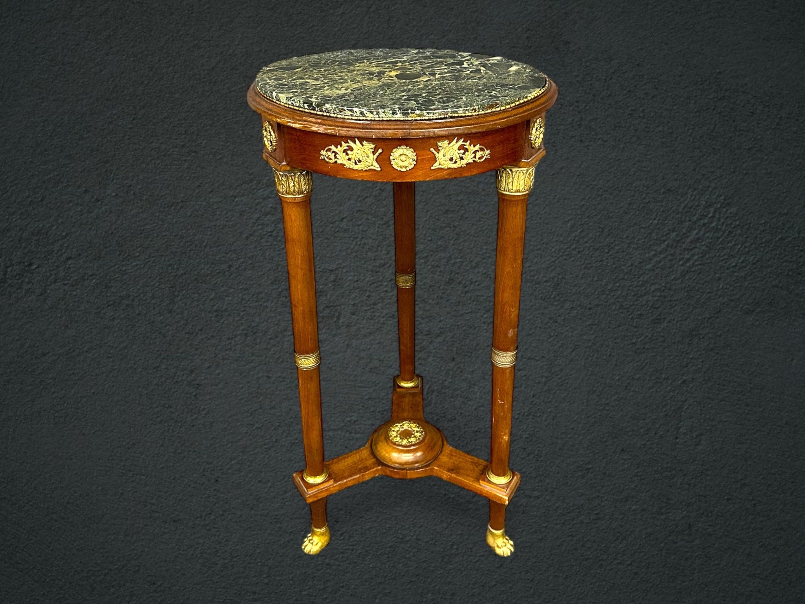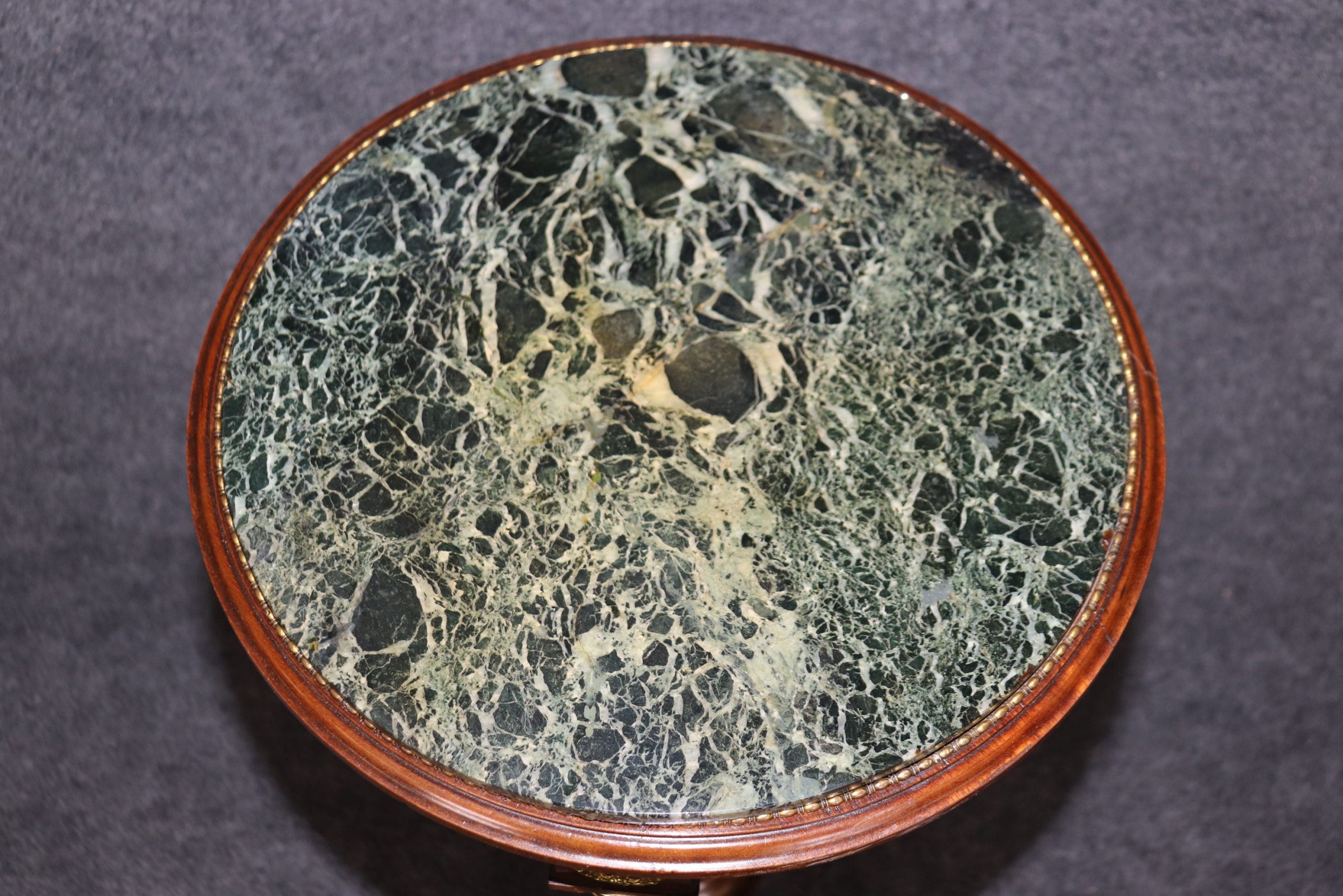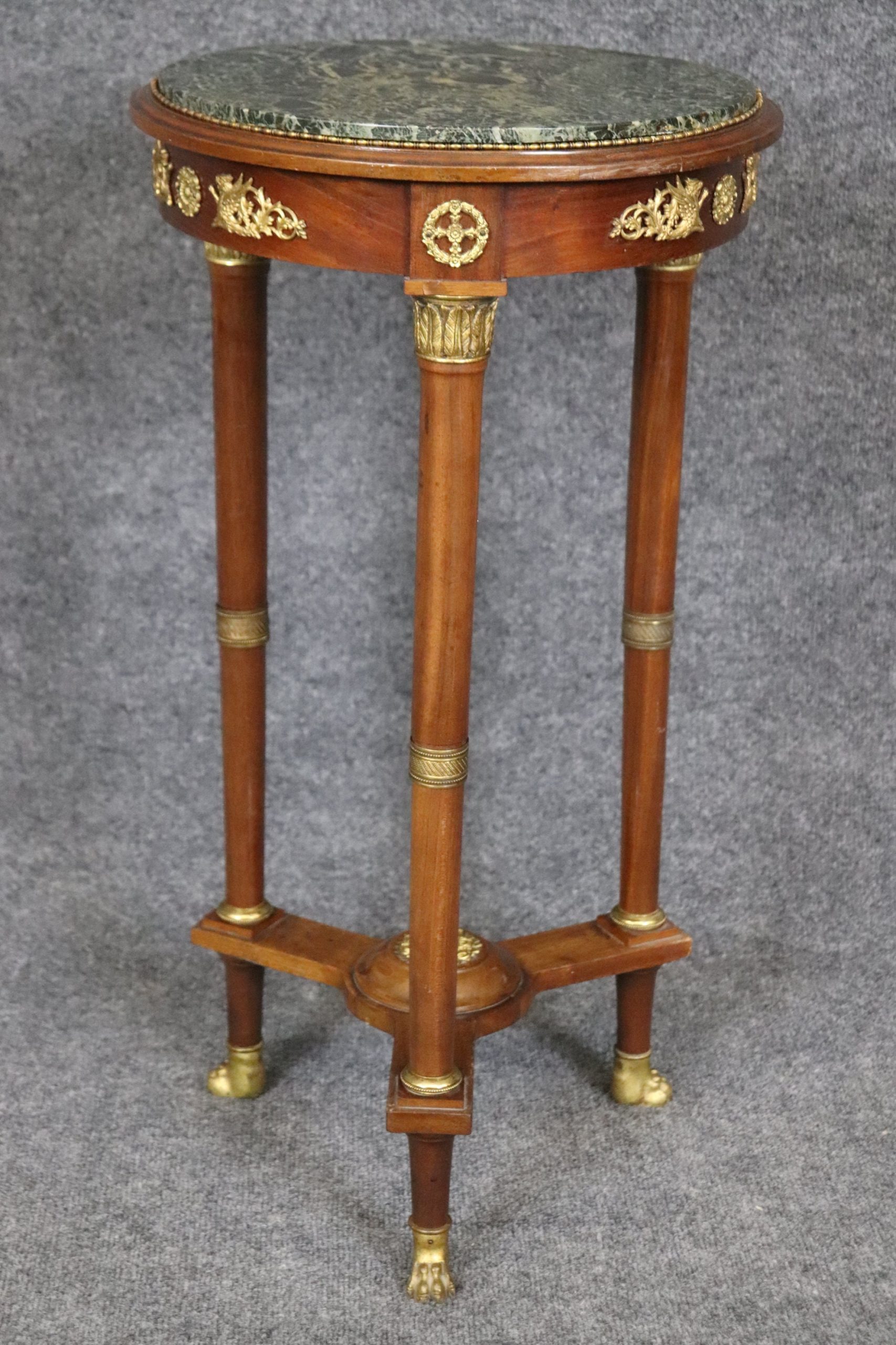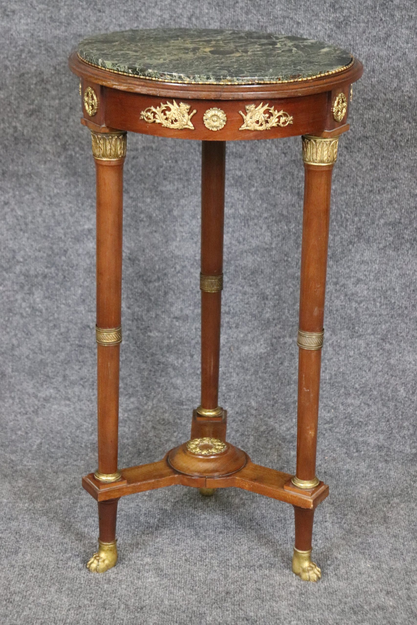 This French Empire style marble top end table accent table is an exceptional example of fine early 20th century French furniture! If you look at the photos provided, you can see the attention to detail in the bronze decorations. This will certainly be a conversation piece in your entryway, office, living room, bedroom, dining room or place of your choosing! The table is in good antique condition with minor surface scratches as well as some imperfections to the marble as to be expected with an antique item!
