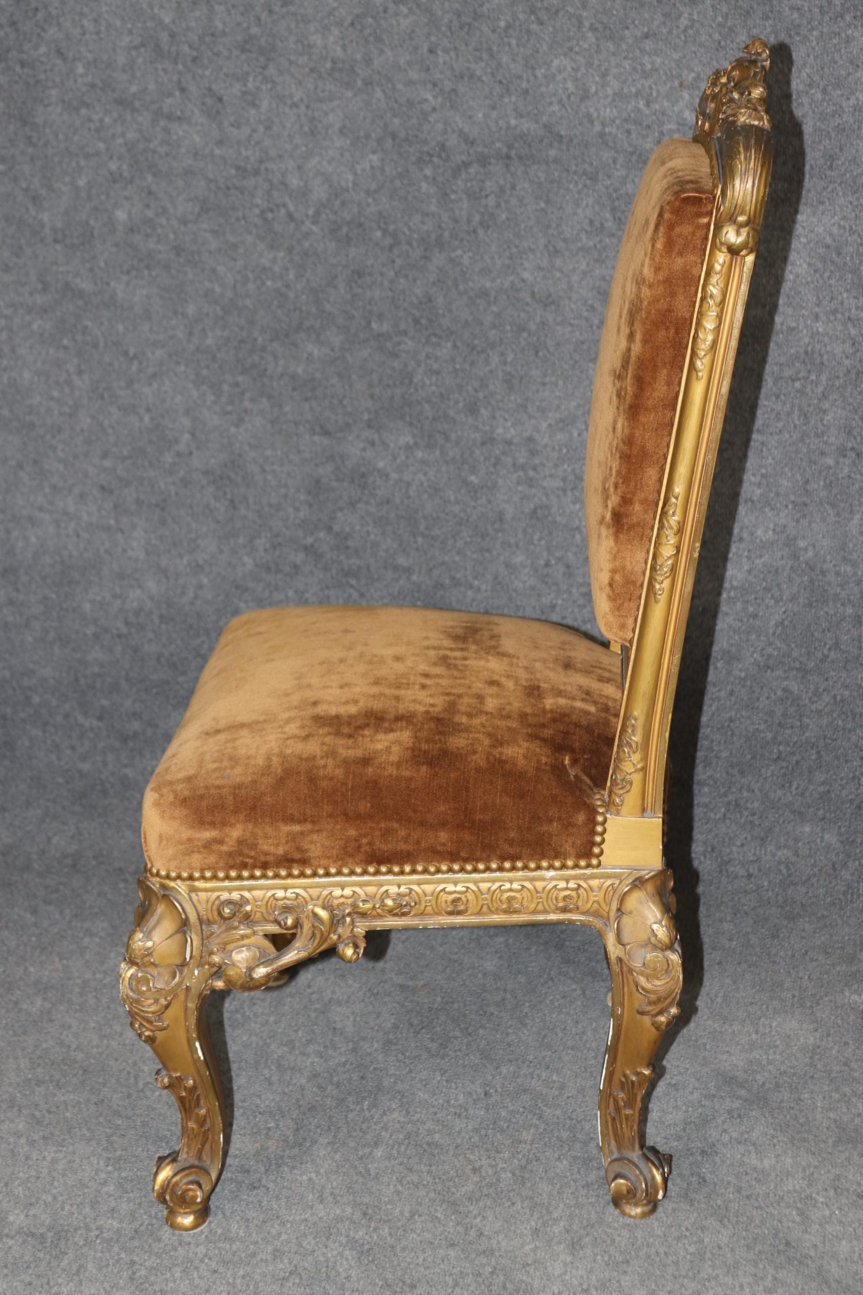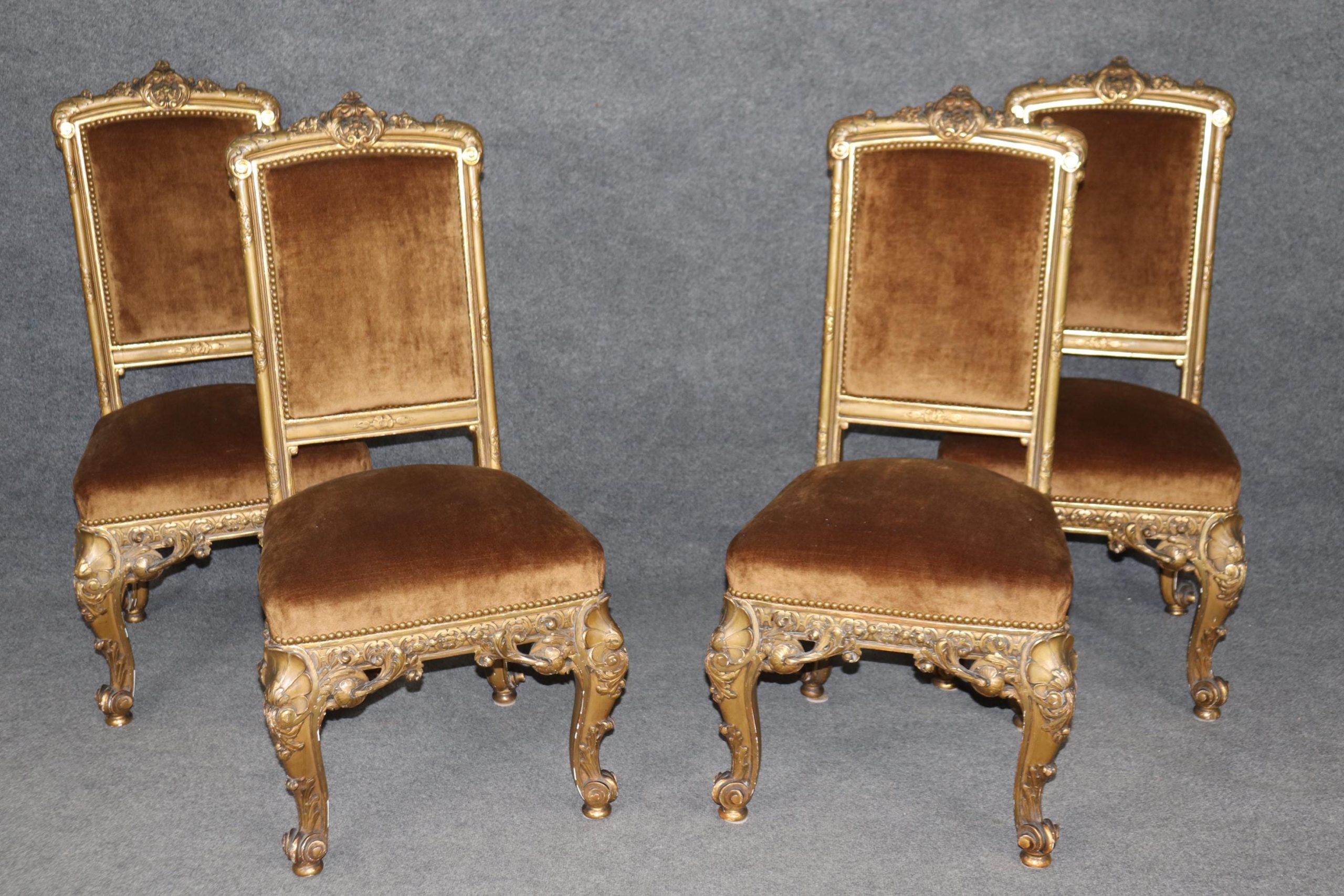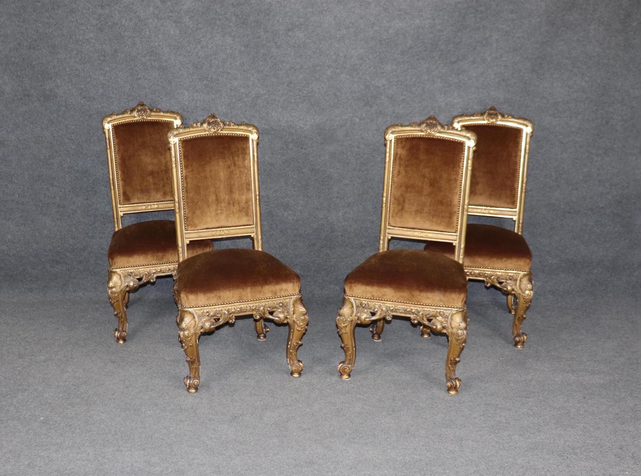 This antique turn of the century set of 4 French Louis XV style side chairs is made with immense detail and of the highest quality! If you look at the photos provided, you can see the beautifully carved frames along with the luxurious upholstery. These chairs are perfect for you and your home, and will bring a sense of luxury and sophistication into your home or place of choosing! These chairs can be used as dining room chairs, as kitchen chairs, or office chairs. (FYI all chairs are side chairs). One nice aspect is that not only do the chairs look good but they can also be used on a daily basis as they are sturdy and strong. Antique furniture in general has stood the test of time and this set of chairs is no exception! The chairs are in good antique condition with light surface scratches, minor finish loss as to be expected! The upholstery appears to be in good condition, but may show minor signs of wear. Otherwise, good condition.
