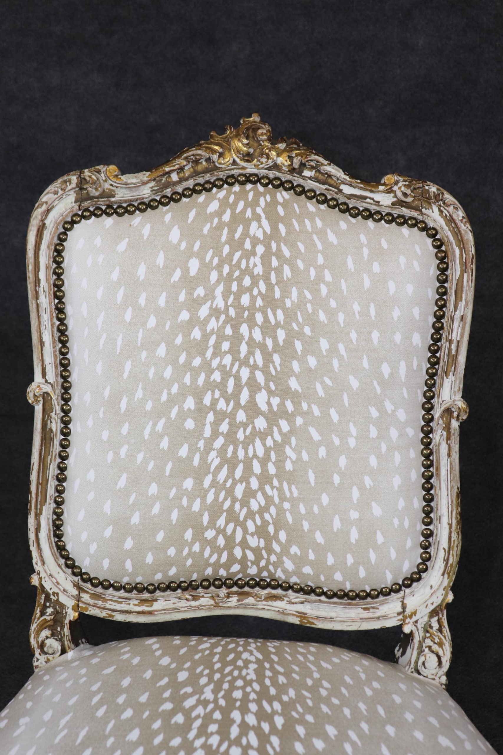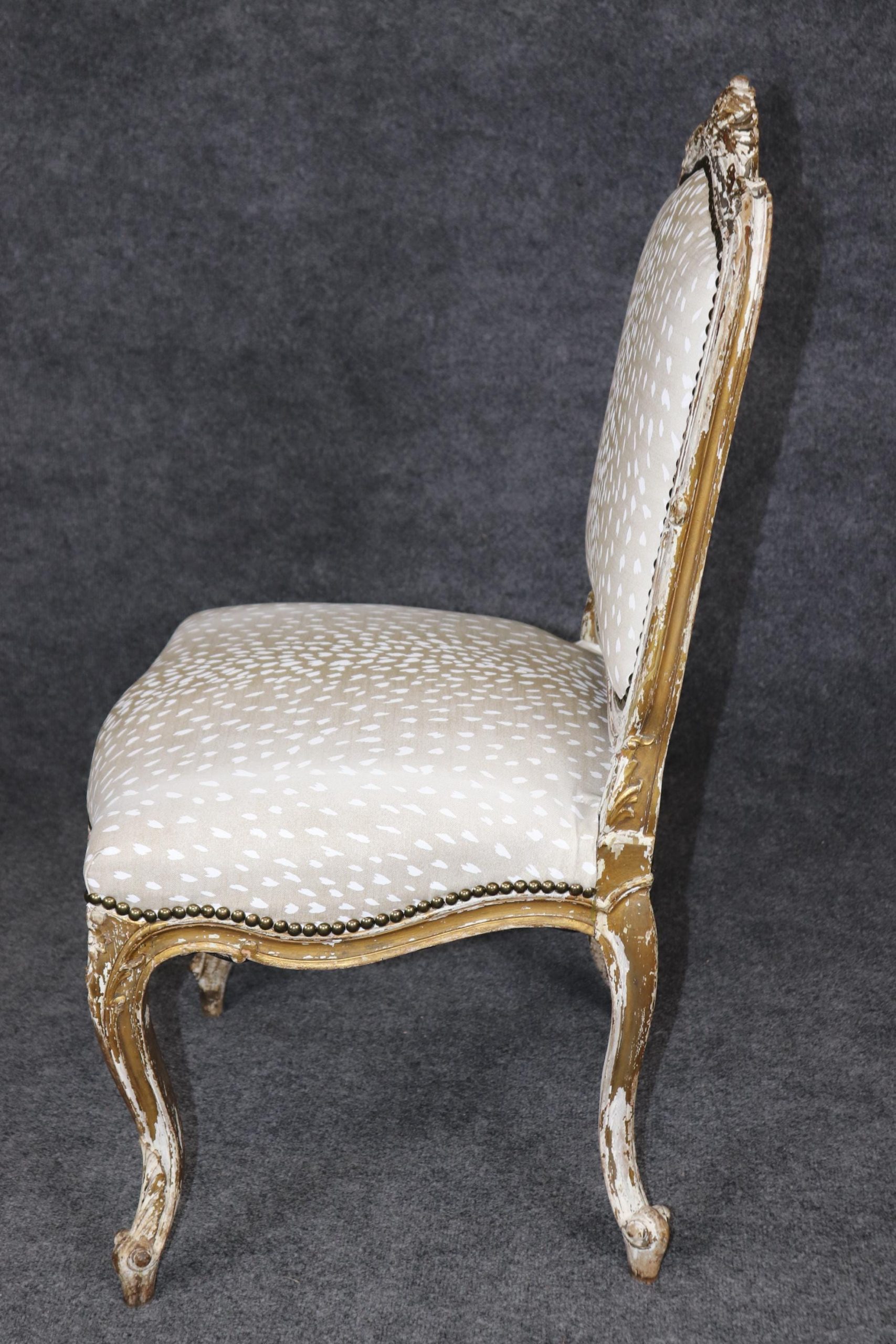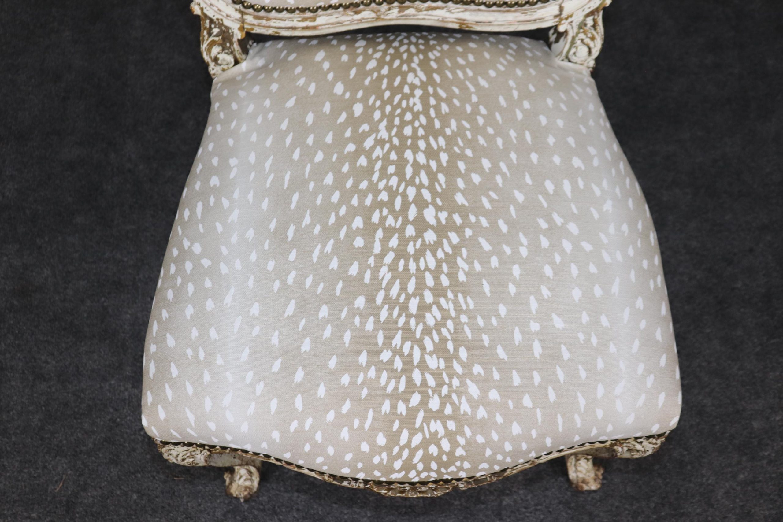 This antique French Louis XVI style distressed paint decorated side chair is made of the highest quality! If you look at the photos provided you will see the nail head trim adorning the sophisticated leopard print upholstery. This chair is perfect for any entryway, living room or office and can be used as a great piece of decor! One nice aspect to this chair is not only its age but its ability to be paired with a variety of other styles you may already have in your home or place of choosing. Antique furniture and vintage pieces have stood the test of time and this chair is no exception! With its quality materials and great craftsmanship this piece is bound to last you and your family for many years to come. The chair is in good antique condition with finish loss and a crack in the frame, as to be expected with items of age and use. The chair was reupholstered at one point, and is in good condition with minor wear.