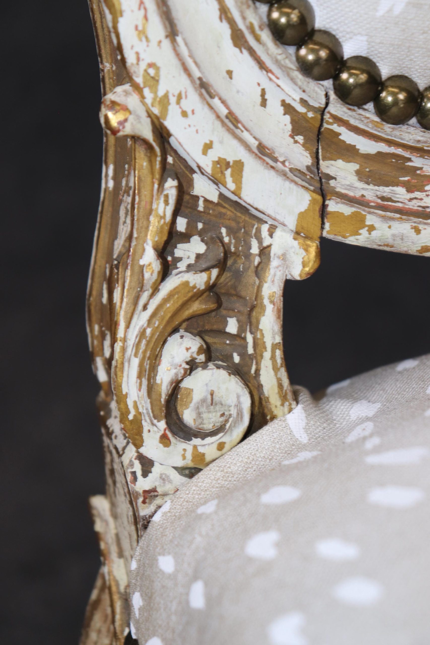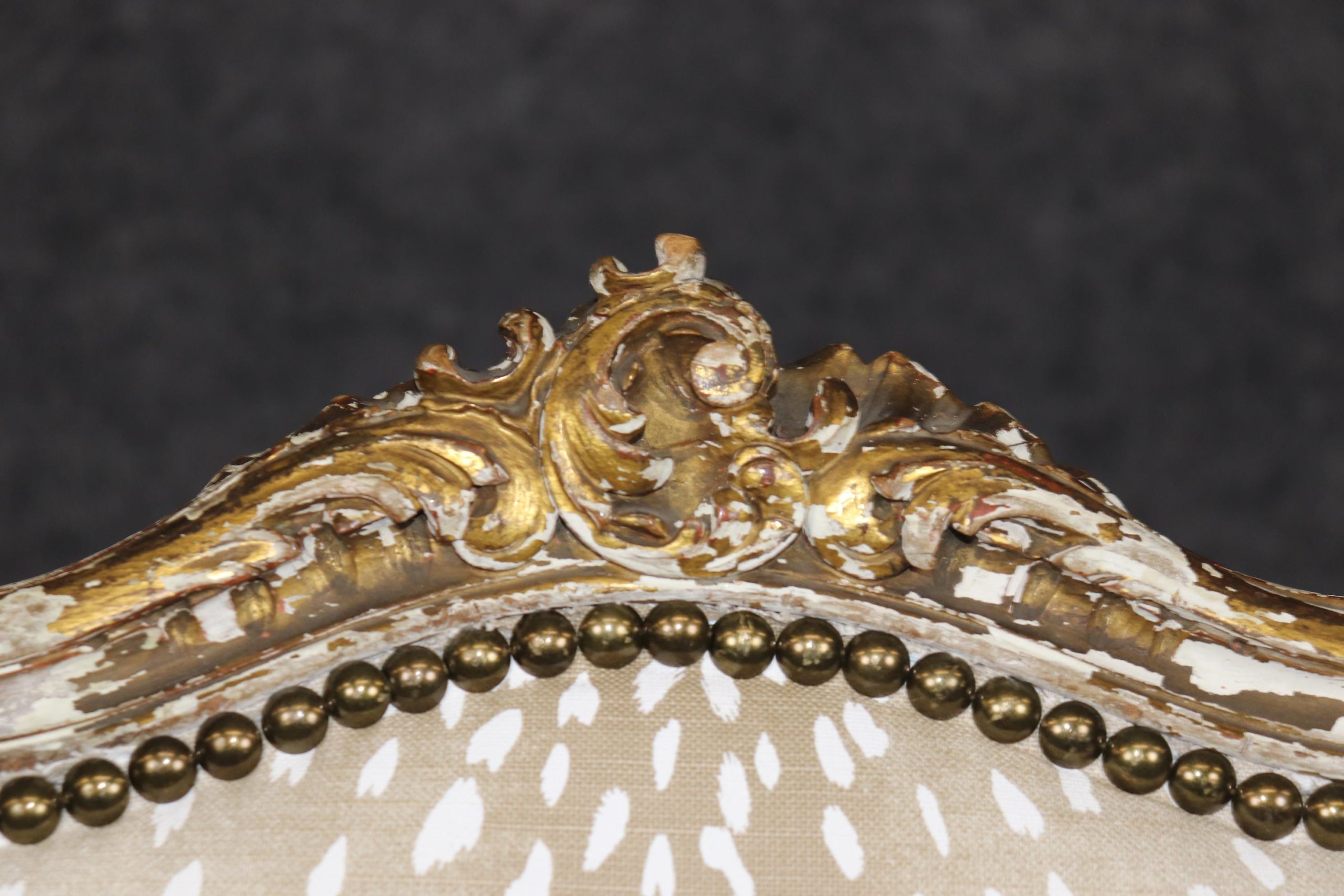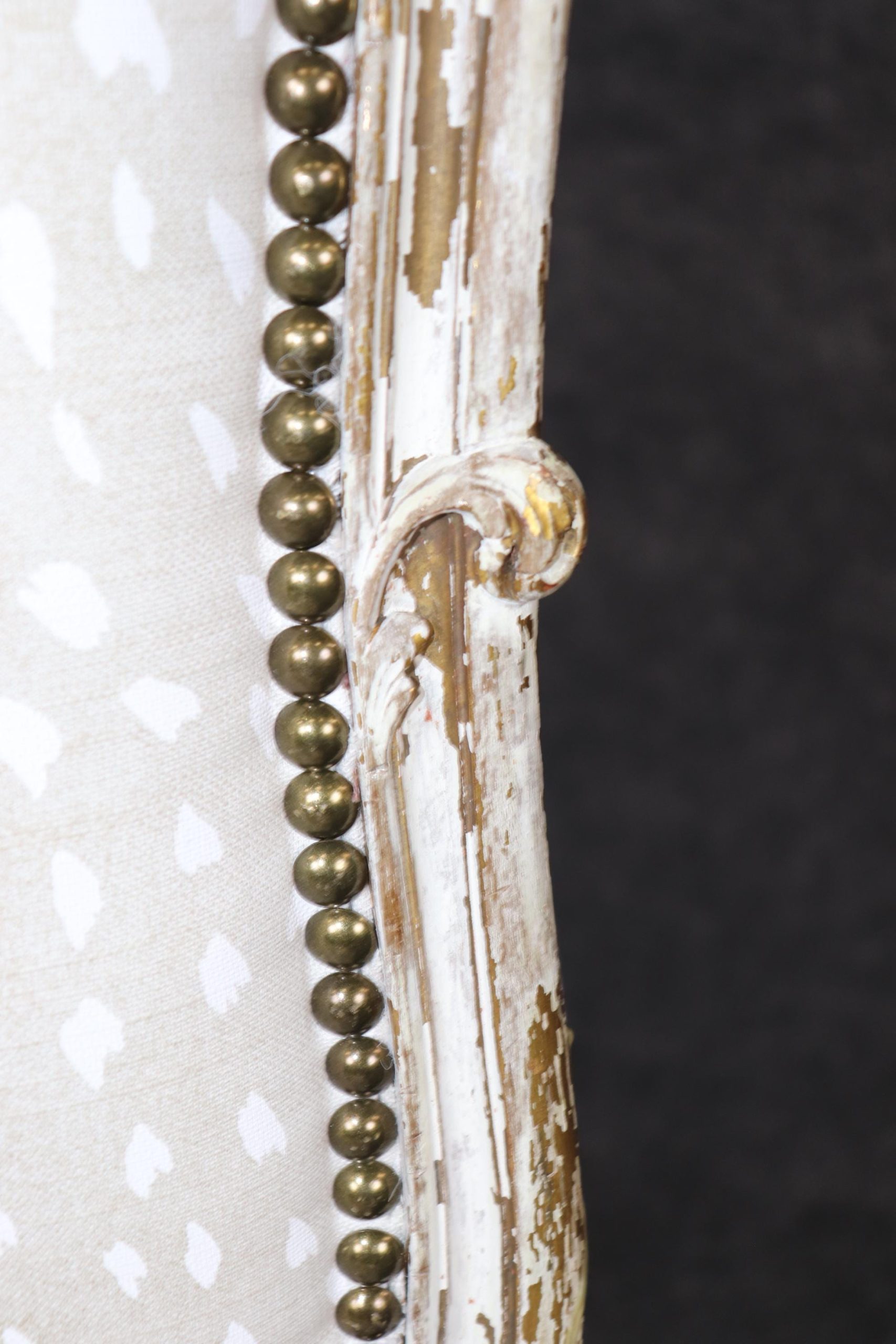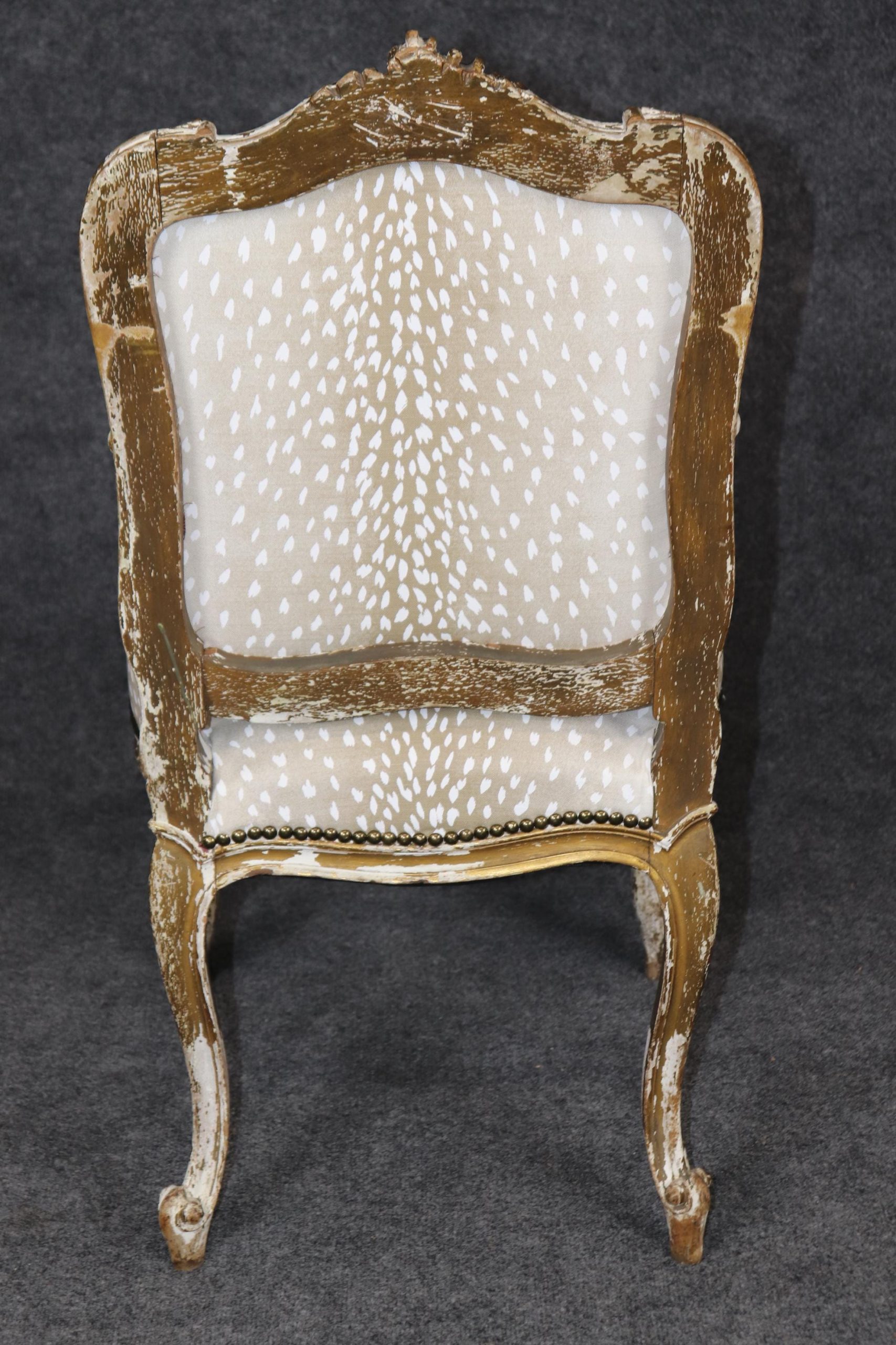 This antique French Louis XVI style distressed paint decorated side chair is made of the highest quality! If you look at the photos provided you will see the nail head trim adorning the sophisticated leopard print upholstery. This chair is perfect for any entryway, living room or office and can be used as a great piece of decor! One nice aspect to this chair is not only its age but its ability to be paired with a variety of other styles you may already have in your home or place of choosing. Antique furniture and vintage pieces have stood the test of time and this chair is no exception! With its quality materials and great craftsmanship this piece is bound to last you and your family for many years to come. The chair is in good antique condition with finish loss and a crack in the frame, as to be expected with items of age and use. The chair was reupholstered at one point, and is in good condition with minor wear.