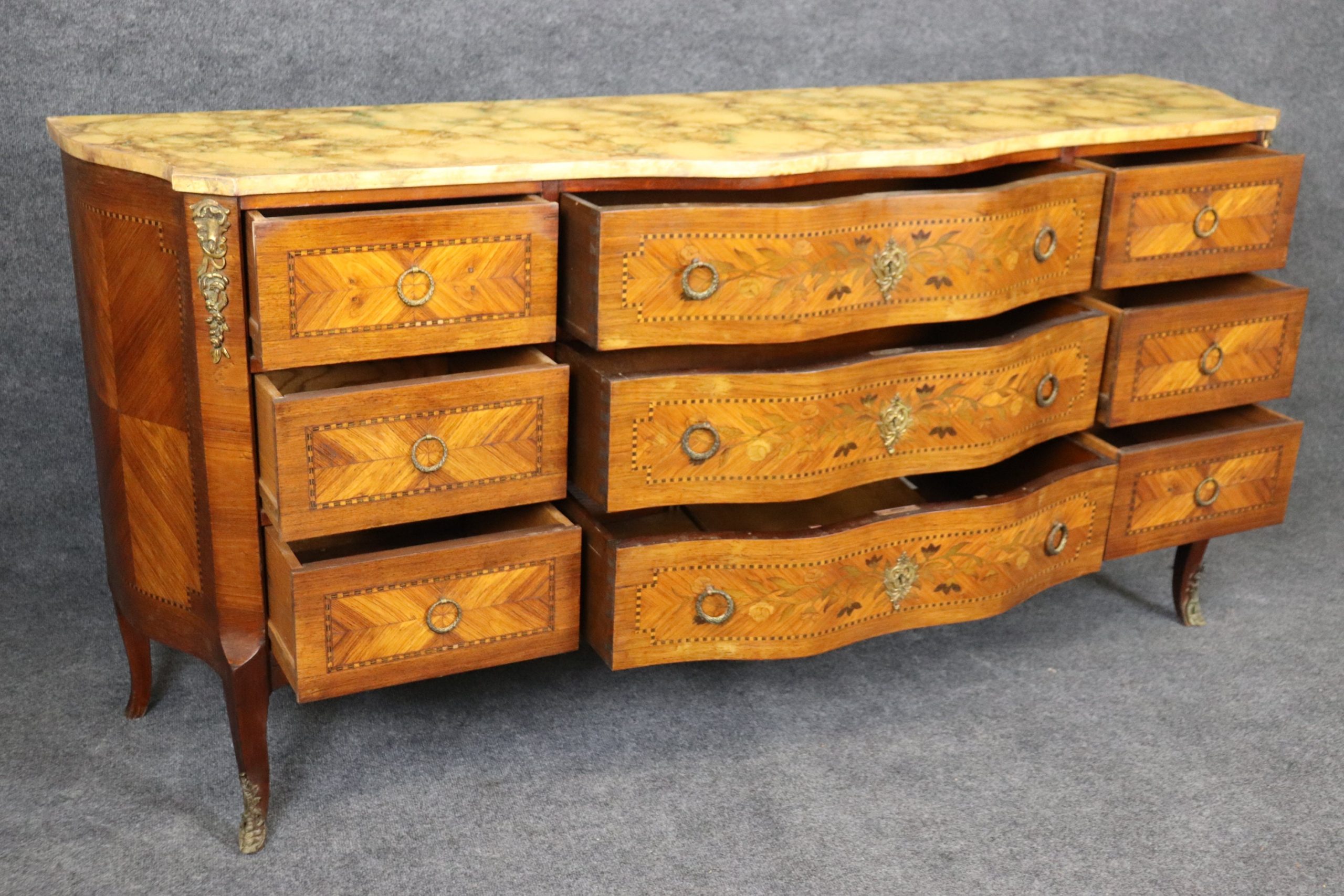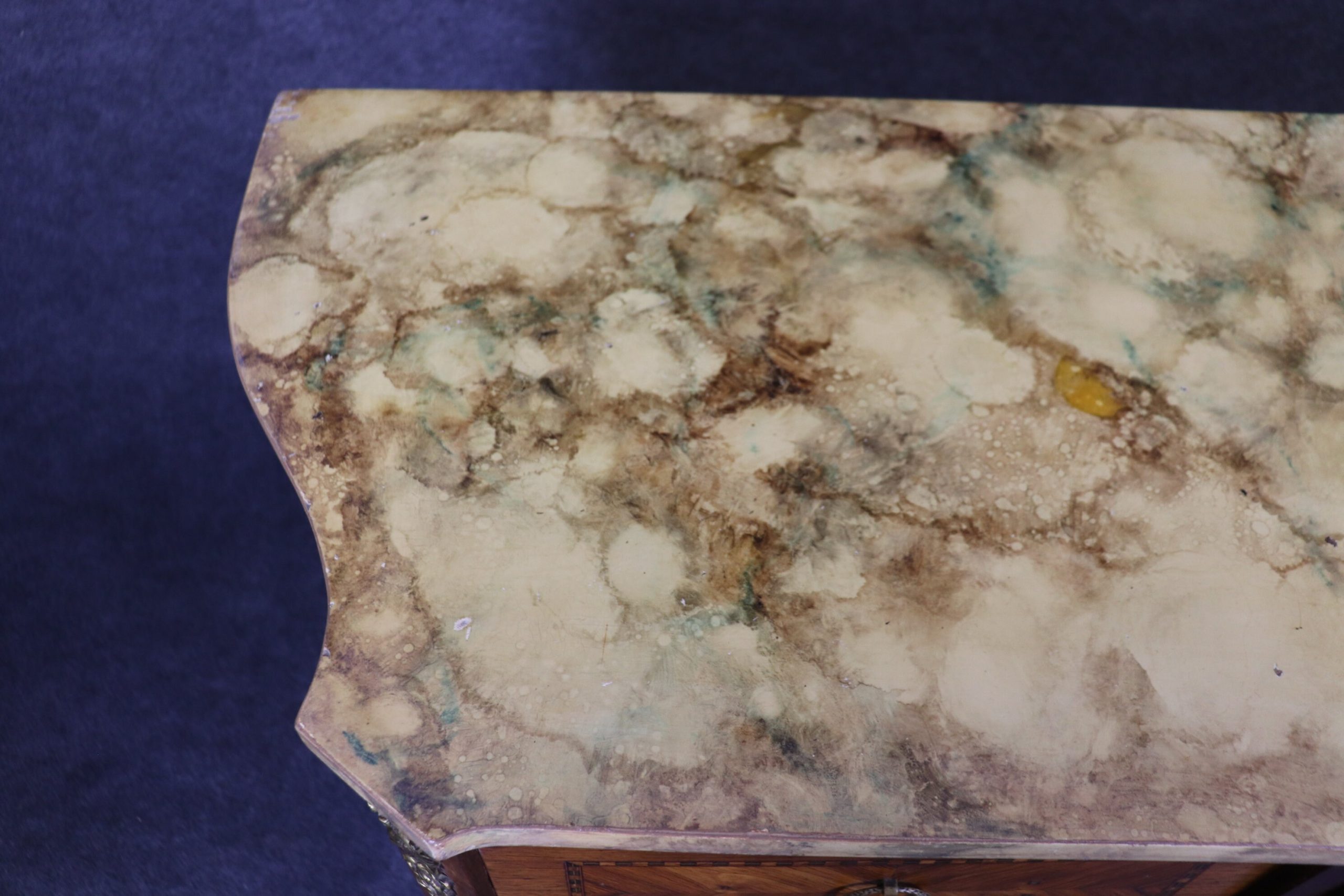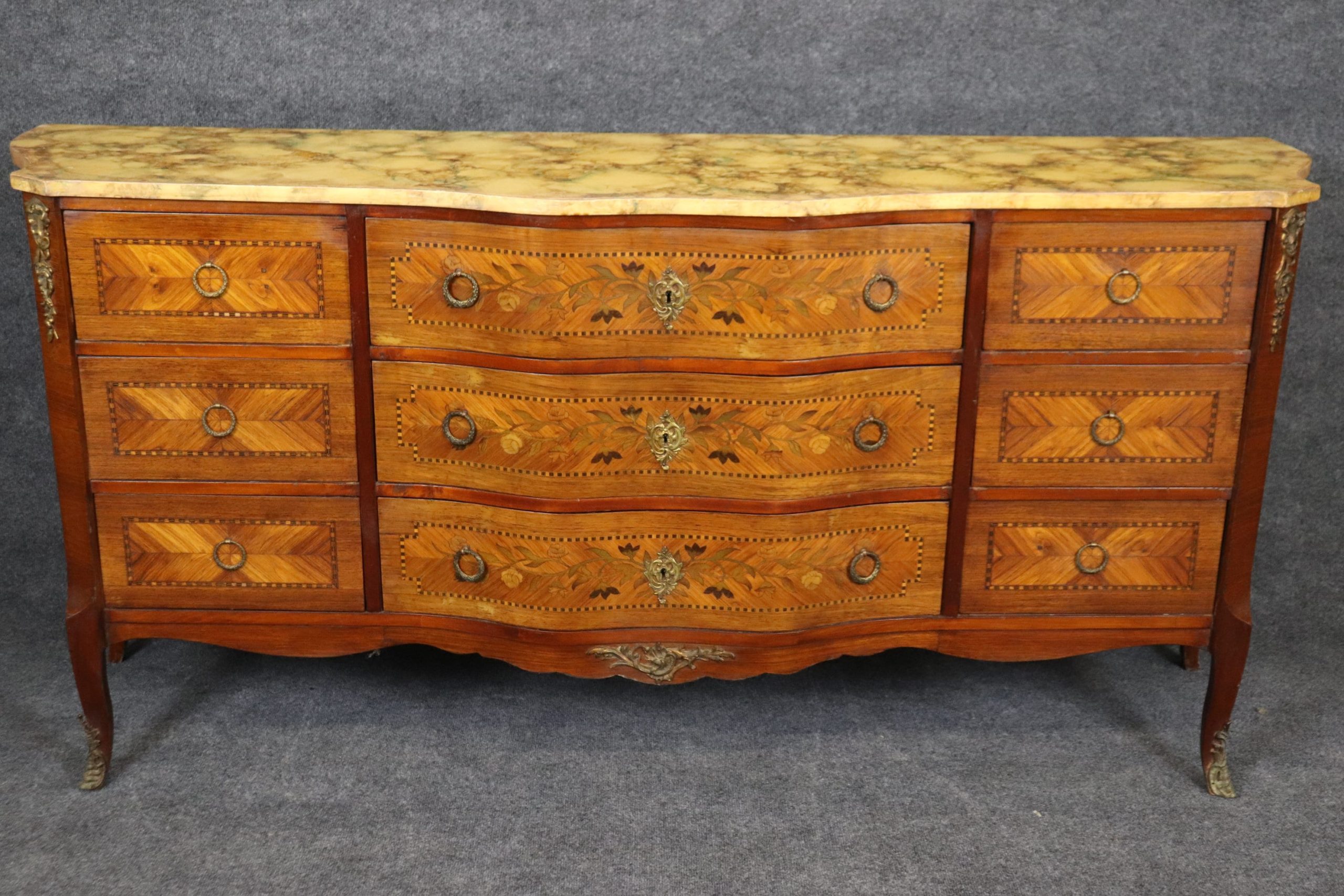 This antique French Louis XV style inlaid faux marble top dresser, chest of drawers is a great example of quality French furniture! If you look at the photos provided, you will see the detail in the beautiful inlay. There are 9 drawers, perfect for storing your personal belongings and keeping them safe. This is a piece that will last you for many years and will add a sense of luxury into your entryway, living room, office or place of your choosing! The dresser is in good antique condition considering the age with some minor surface scratches and blemishes to the finish, otherwise good condition for an item from the 1920s.