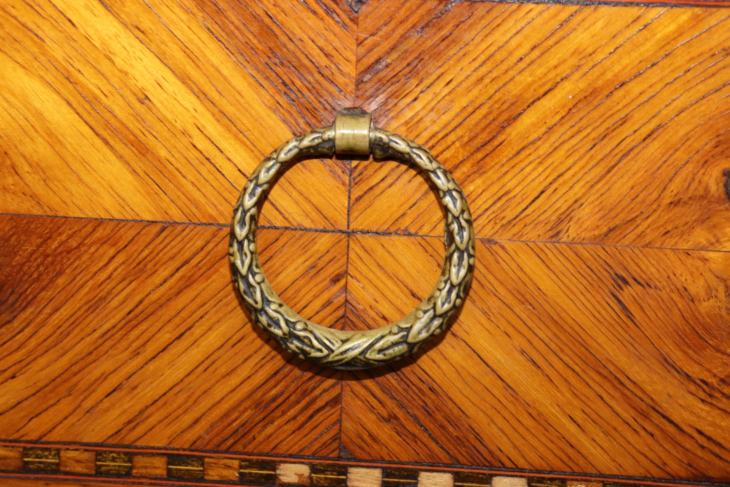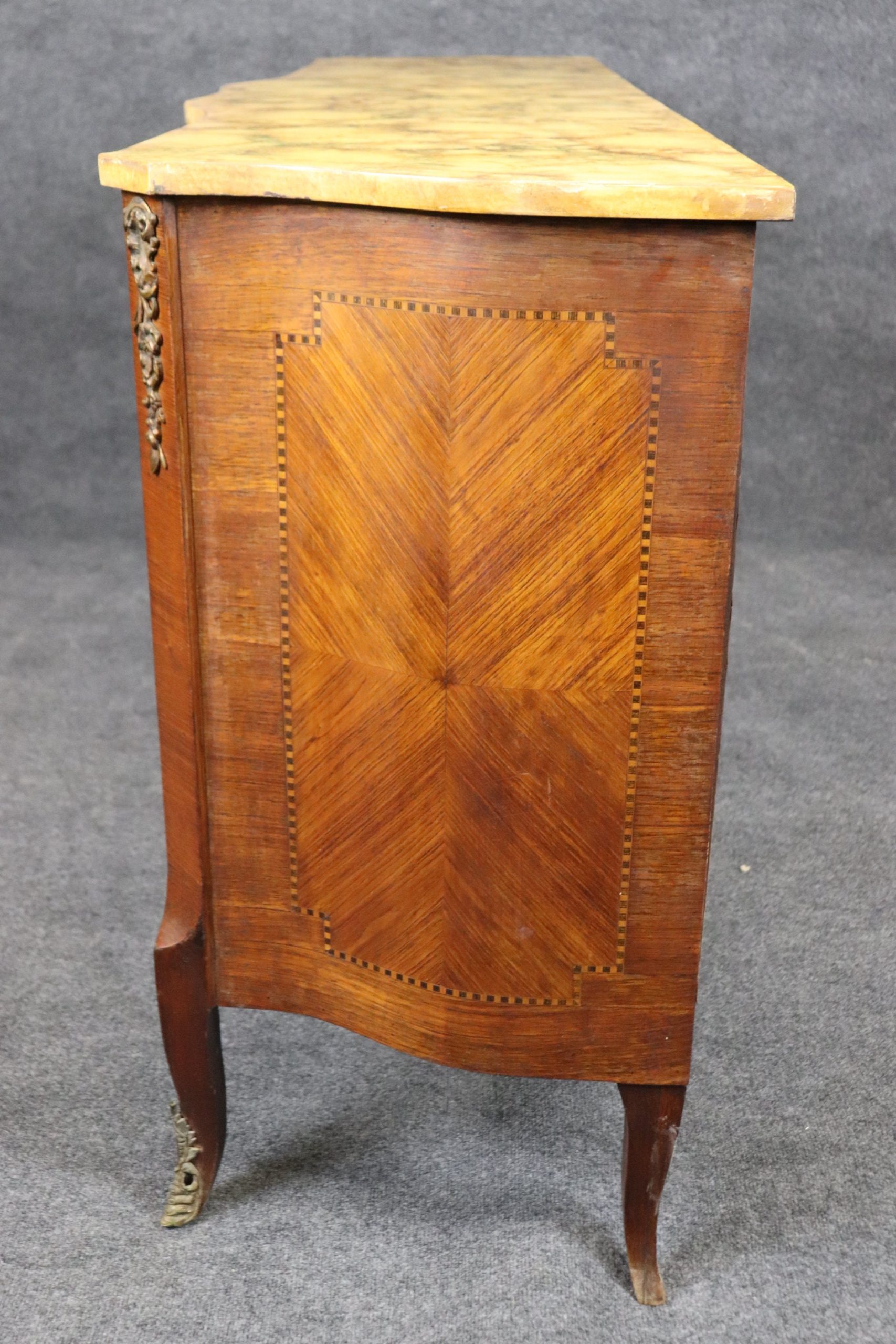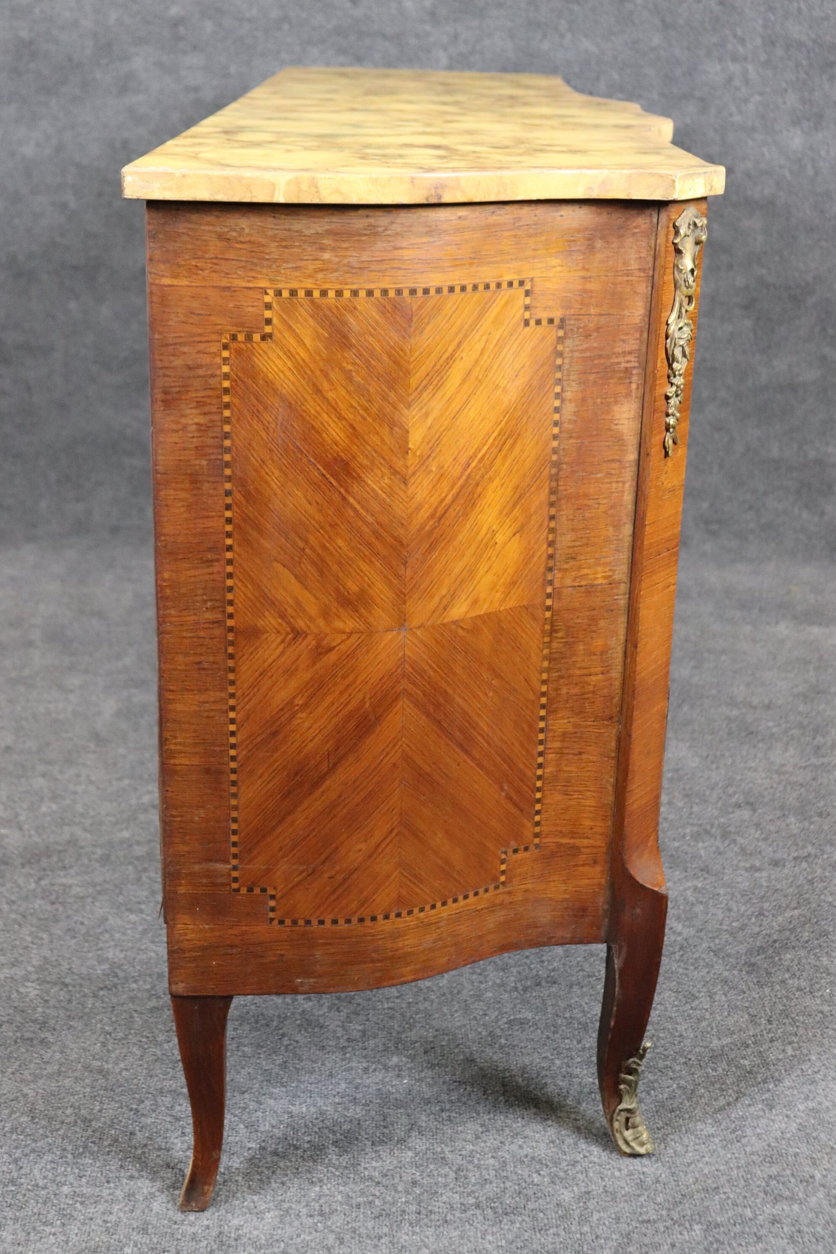 This antique French Louis XV style inlaid faux marble top dresser, chest of drawers is a great example of quality French furniture! If you look at the photos provided, you will see the detail in the beautiful inlay. There are 9 drawers, perfect for storing your personal belongings and keeping them safe. This is a piece that will last you for many years and will add a sense of luxury into your entryway, living room, office or place of your choosing! The dresser is in good antique condition considering the age with some minor surface scratches and blemishes to the finish, otherwise good condition for an item from the 1920s.