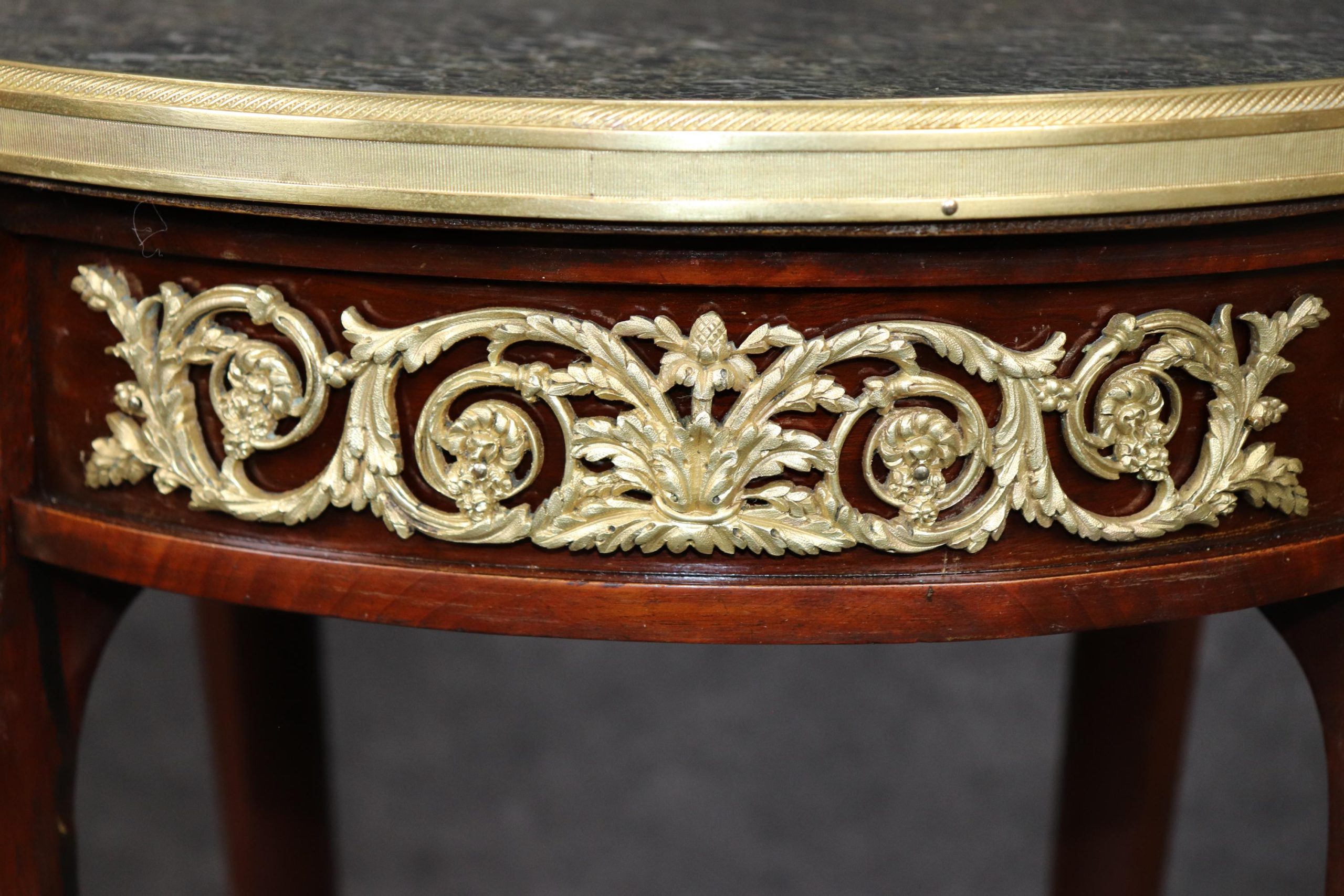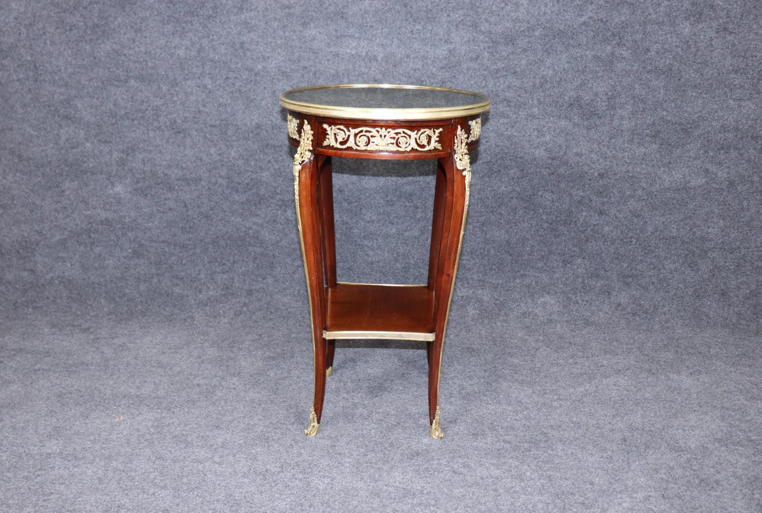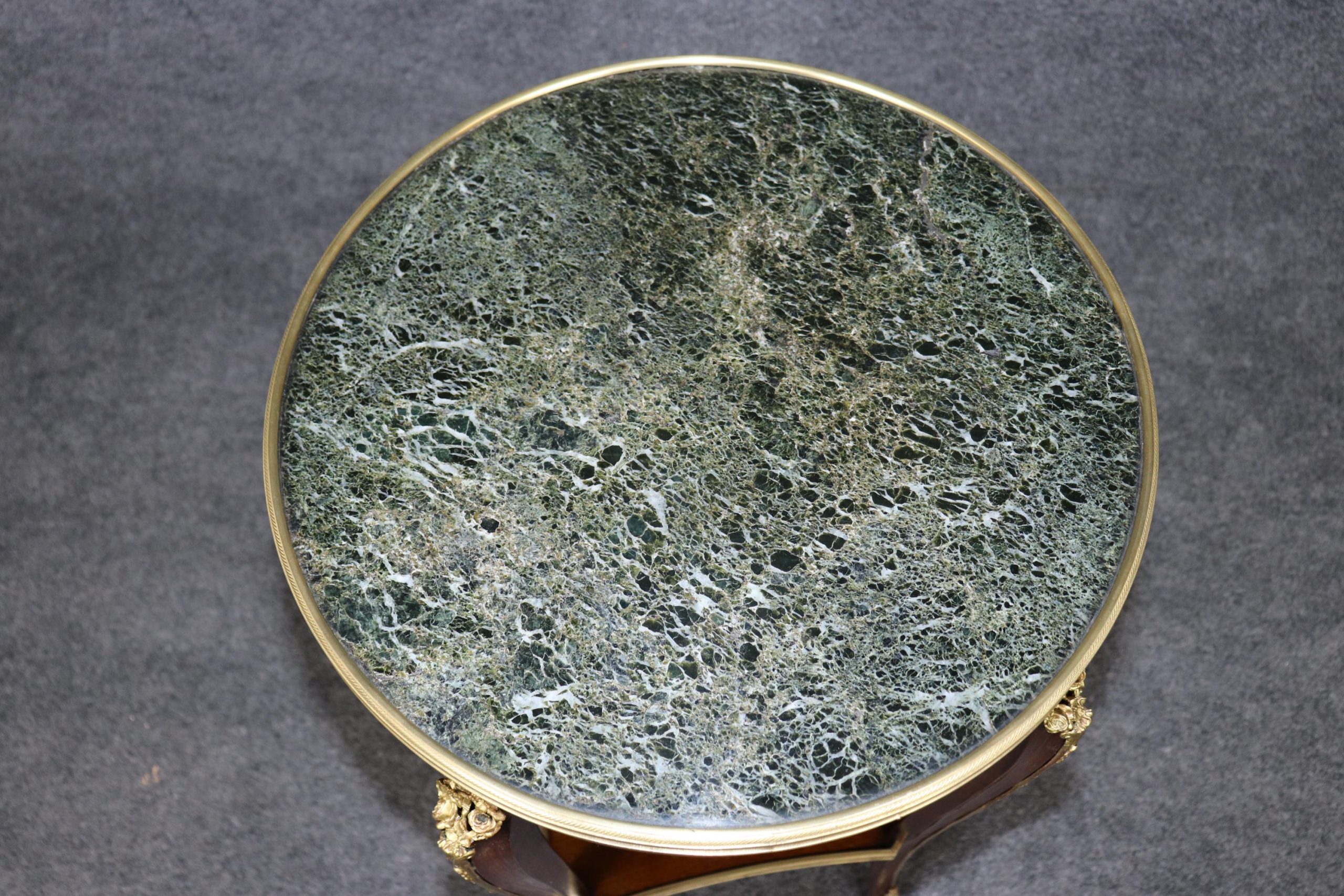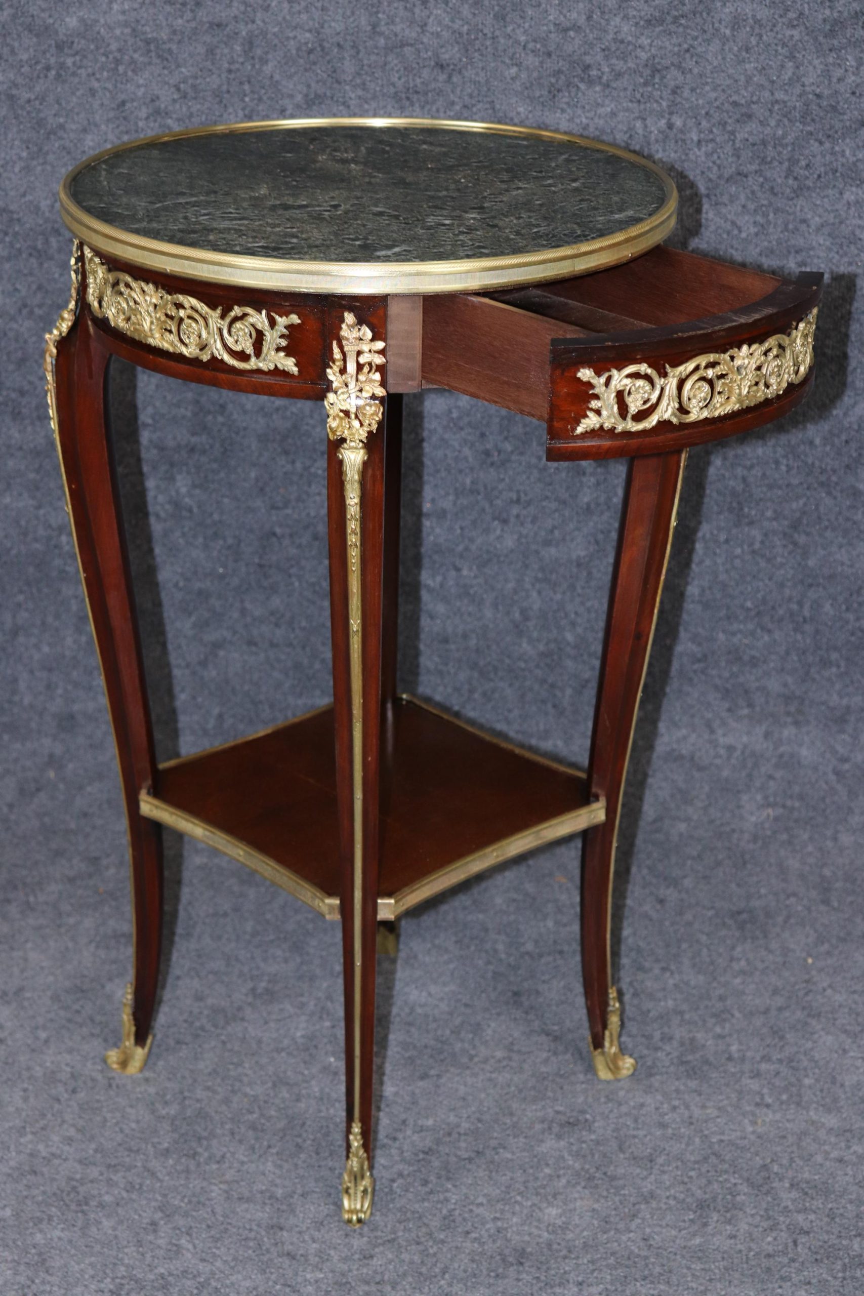 This antique French Louis XV style marble top end table, in the manner of Francois Linke, is made of the highest quality and is bound to bring class and character into your home or place of choosing! François Linke was a leading Parisian ébéniste of the late 19th and early 20th centuries. If you look at the photos provided, you will see the beautiful verdi green marble. The table is equipped with one small pull out drawer this piece can be used functionally on a daily basis. This is perfect for any entryway, bedroom, living room, hallway or office all while bringing a sense of luxury and character. Antique furniture and vintage pieces have stood the test of time and this end table is no exception. With its quality materials and great craftsmanship this piece is bound to last you and your family for many years to come. The table is in fine quality antique condition with some minor surface scratches as to be expected of an item from the 1920s.