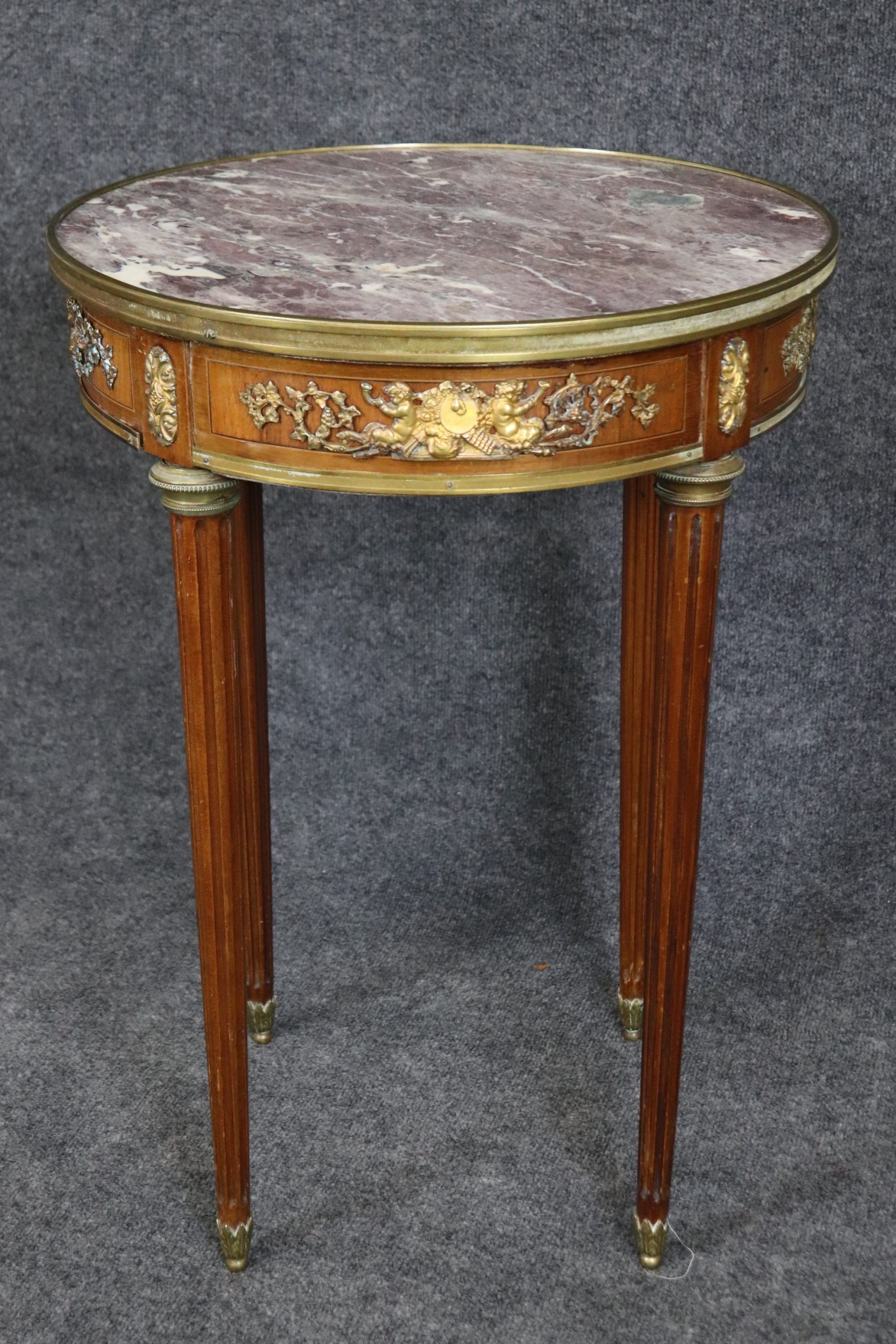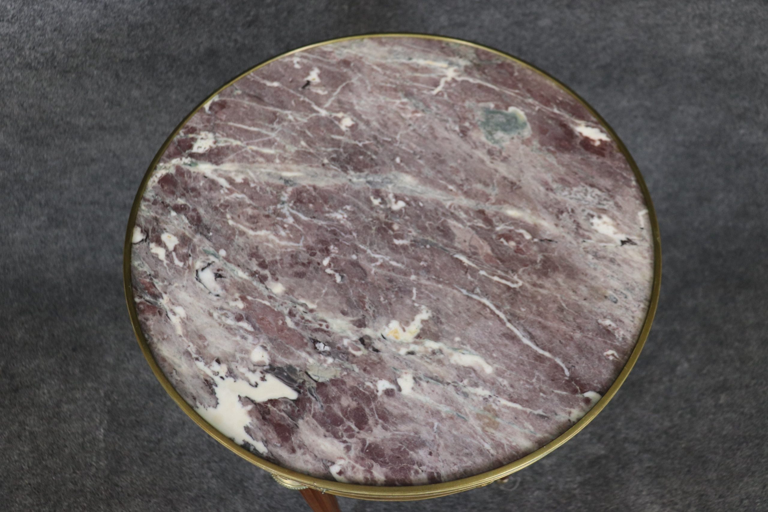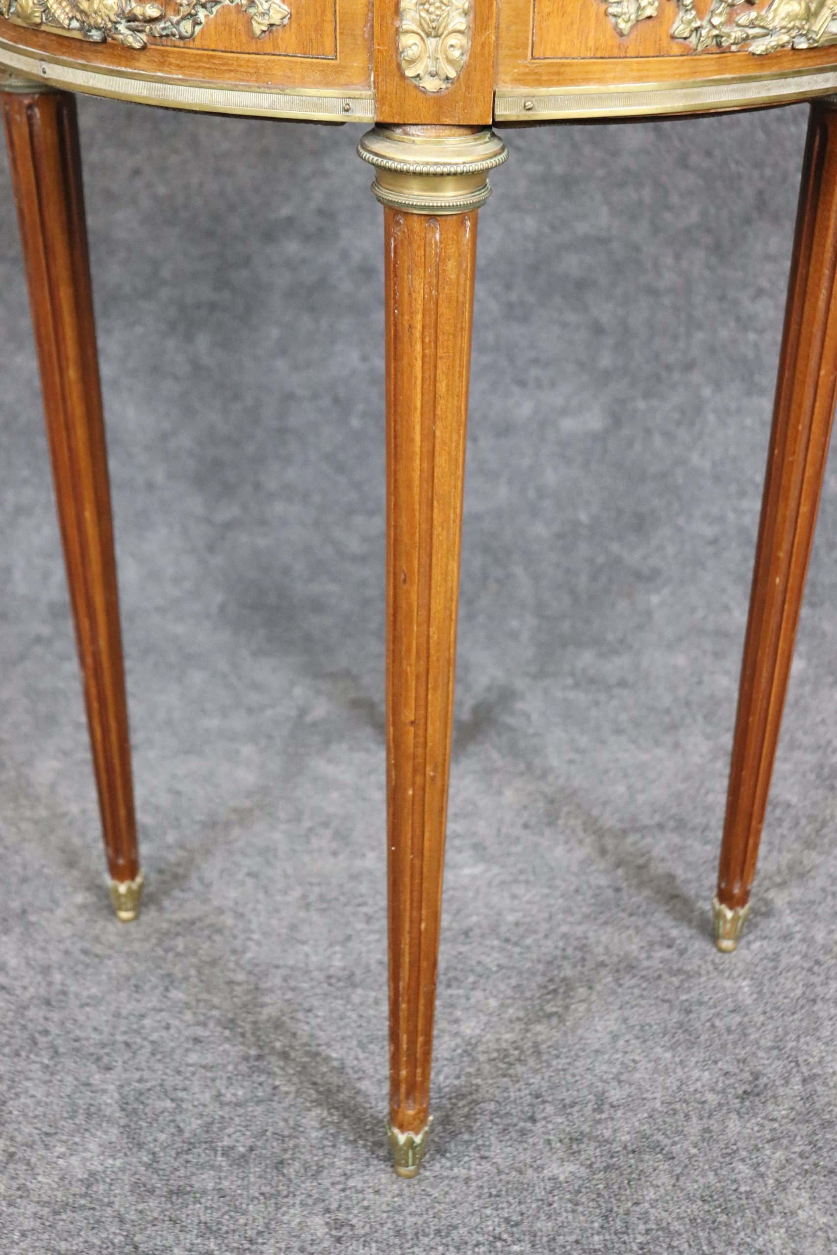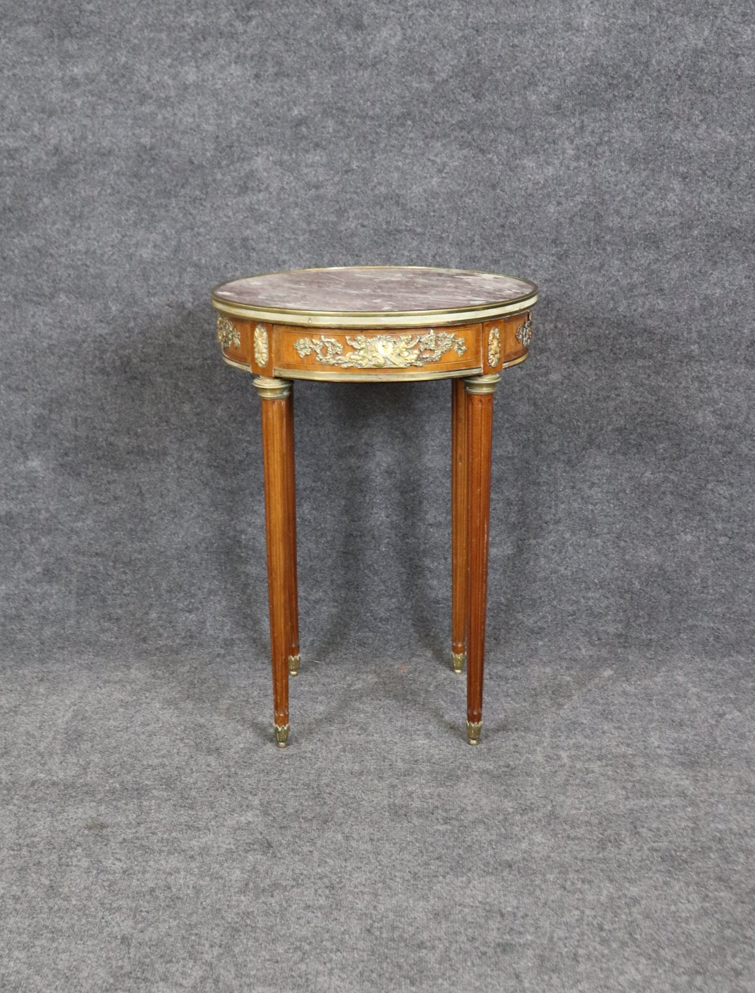 This vintage French Louis XVI Directoire style marble top end table, side table is made of the highest quality and is truly remarkable! Although small, this little side/end table packs a punch, and will most definitely be a conversation starter! If you look at the photos provided, you can see the outstanding design in the brass accents and the “Made in France” stamp. This french table can be paired with just about any style you may already have in your entryway, living room, dining room, bedroom, office or place of choosing and can be placed just about anywhere due to its size! This piece gives off an overwhelming sense of character and luxury and tells its own story as people catch themselves staring at it! The table is in good vintage condition with minor surface scratches, finish loss and some oxidation as to be expected with an item of this age! Otherwise good condition.
