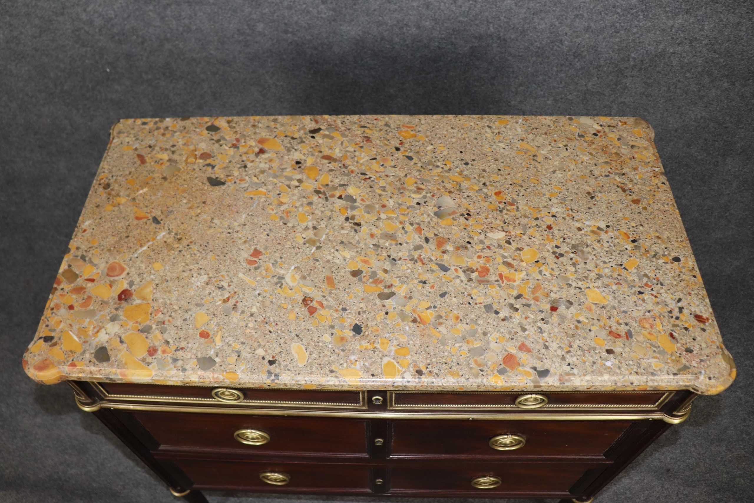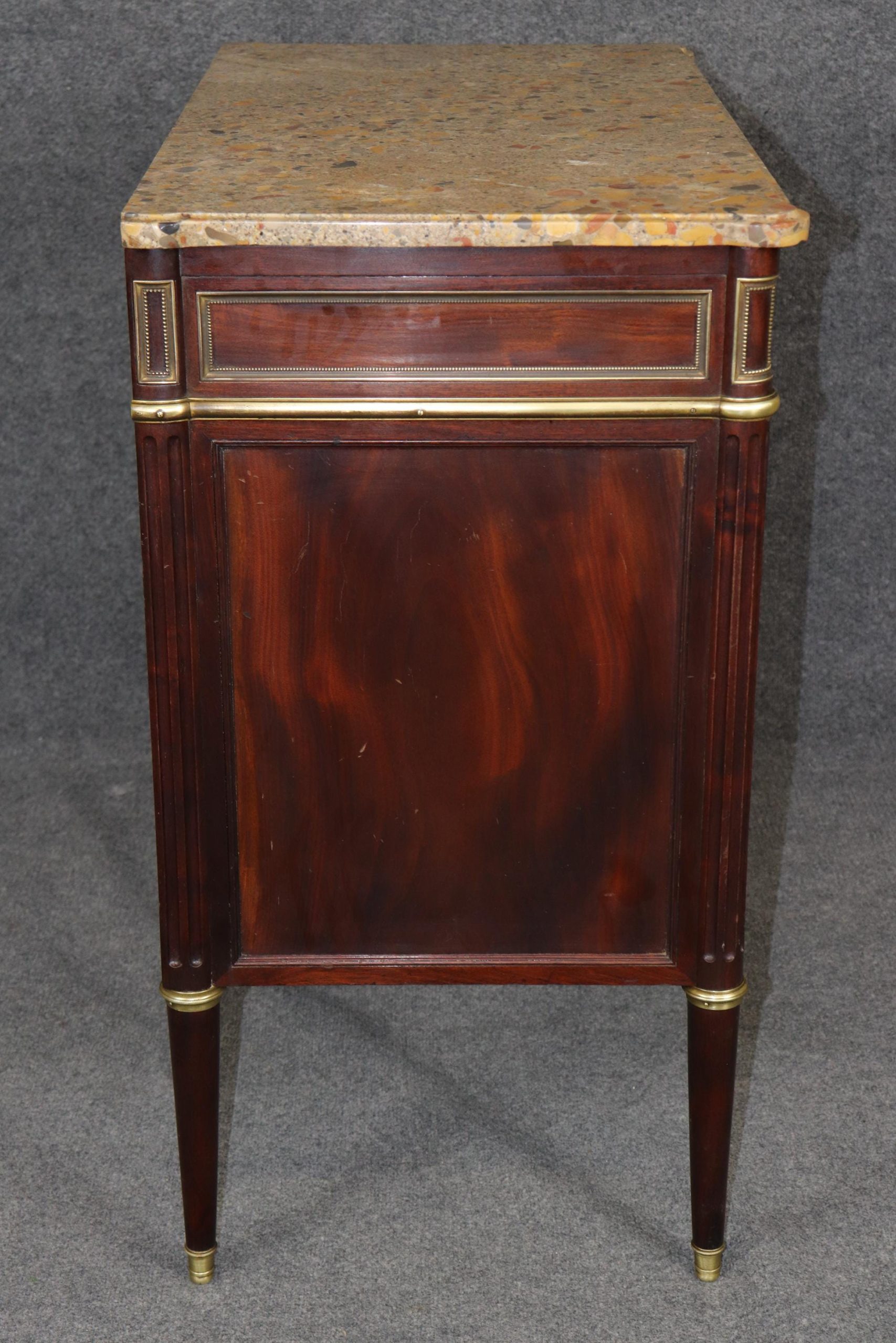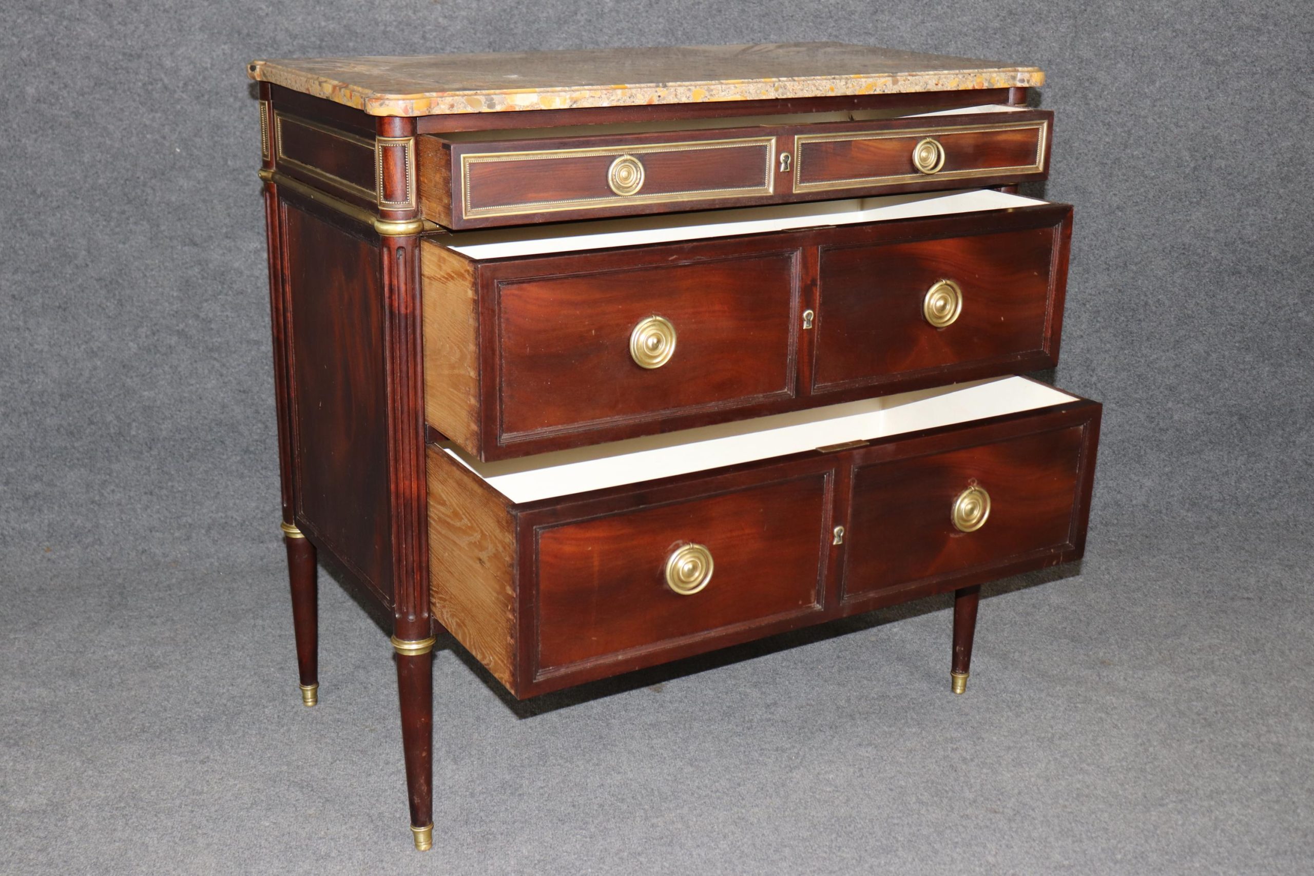 This antique French 19th century Louis XVI style marble top commode by Maison Carlhian is nothing but exceptional! This piece is made of the highest quality! This piece has stood the test of time and still looks incredible! If you look at the photos provided, you can see this piece is signed under the marble (as shown). The commode is equipped with 3 locking drawers, perfect for storing your personal items safely. This piece is perfect for your living room, bedroom, dining room, foyer or office and will certainly bring a sense of sophistication and luxury into your home or place of choosing! This is not a piece you want…. Its a piece you need… This is something that has acquired character throughout its existence and has a history! Antique furniture and vintage pieces have stood the test of time and this commode is no exception! With its quality materials and great craftsmanship this is bound to last you and your family for many years to come. The commode is in good antique condition and has finish loss and surface scratches, as to be expected for an item over 100 years old!