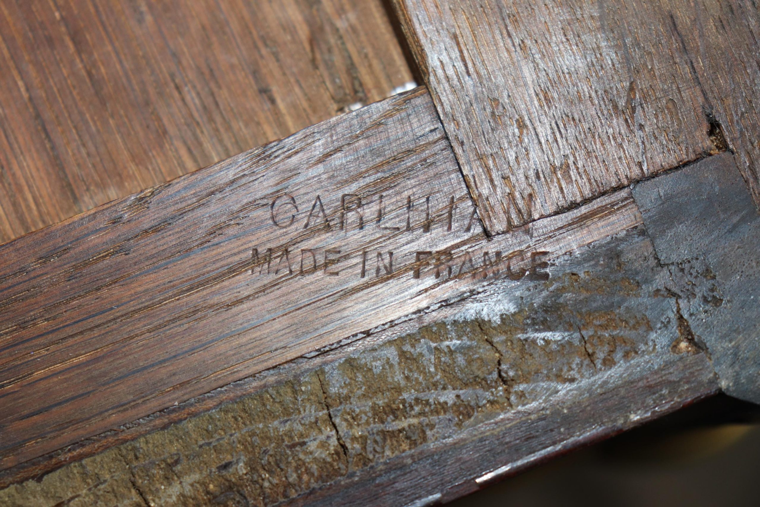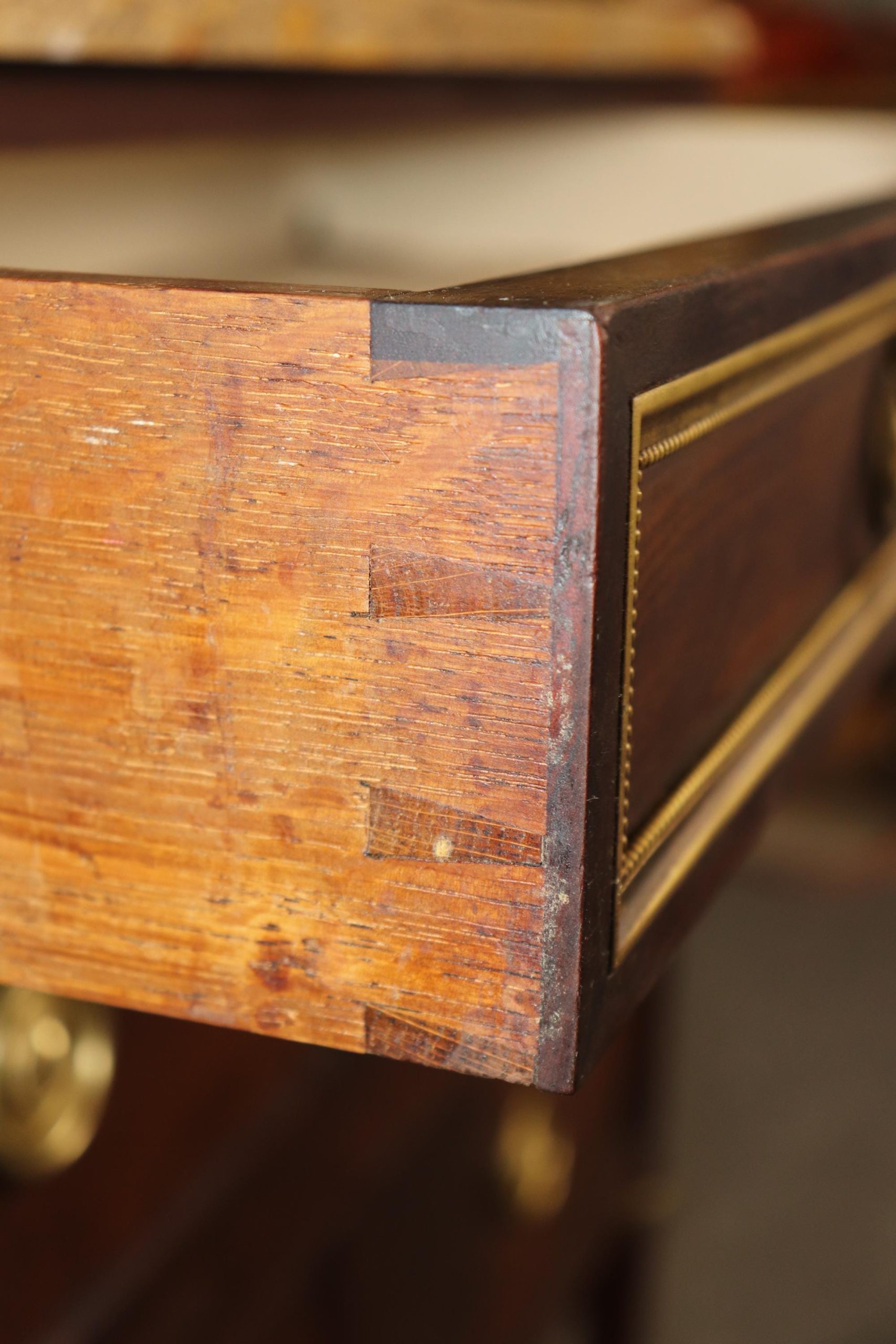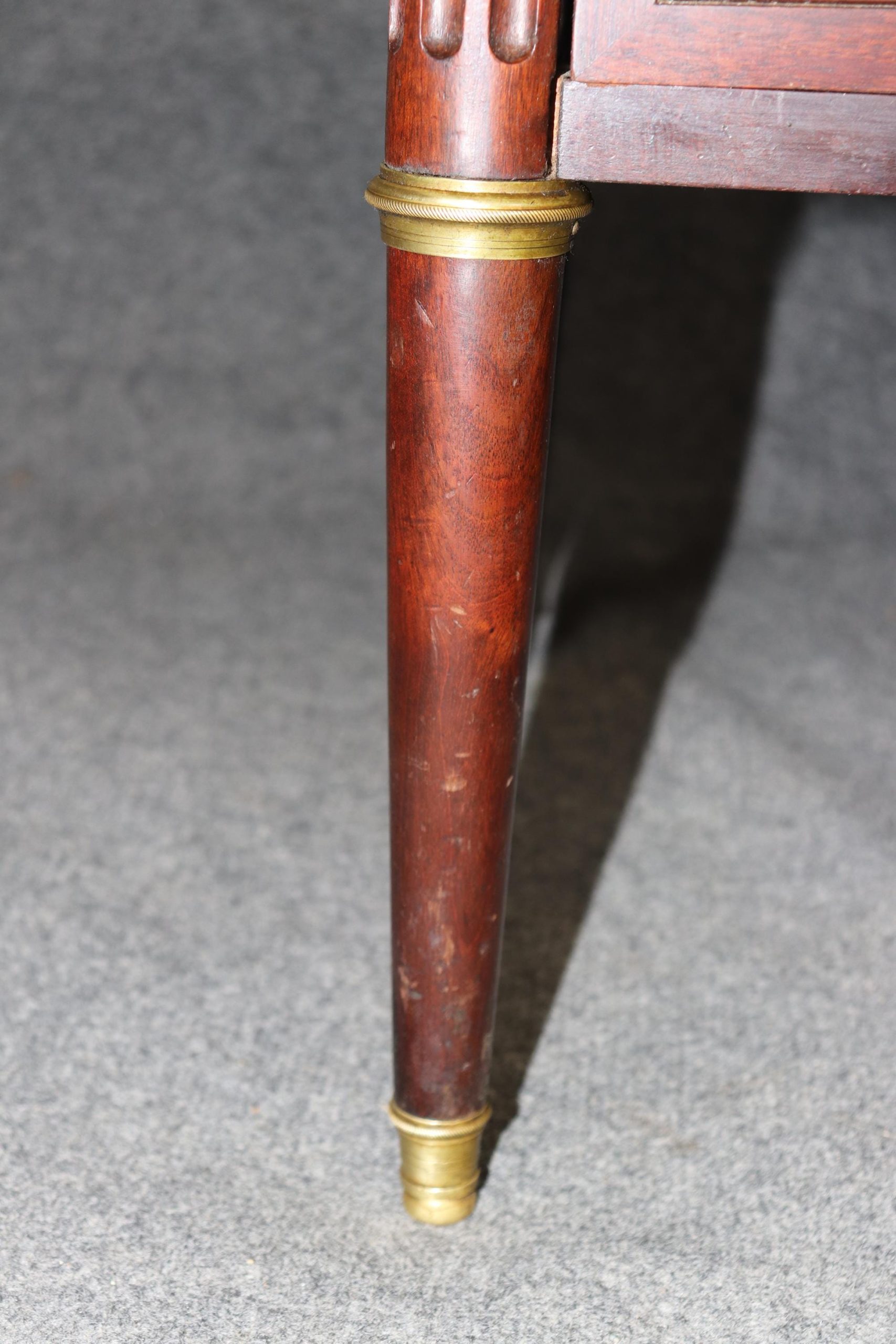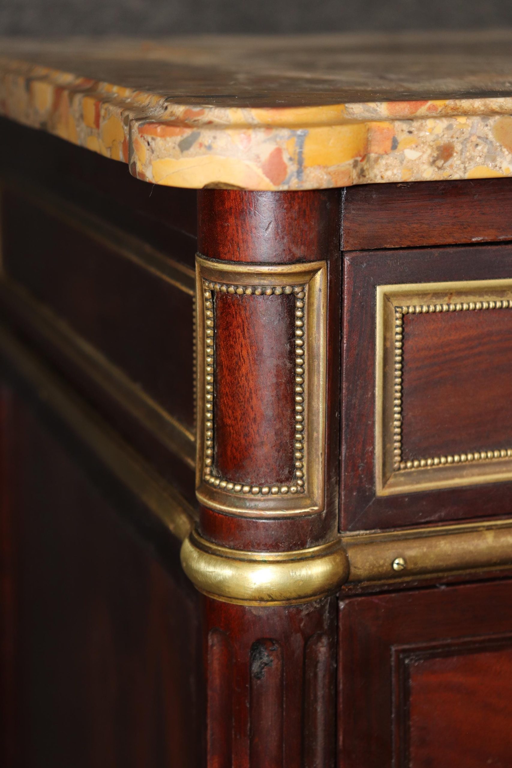This antique French 19th century Louis XVI style marble top commode by Maison Carlhian is nothing but exceptional! This piece is made of the highest quality! This piece has stood the test of time and still looks incredible! If you look at the photos provided, you can see this piece is signed under the marble (as shown). The commode is equipped with 3 locking drawers, perfect for storing your personal items safely. This piece is perfect for your living room, bedroom, dining room, foyer or office and will certainly bring a sense of sophistication and luxury into your home or place of choosing! This is not a piece you want…. Its a piece you need… This is something that has acquired character throughout its existence and has a history! Antique furniture and vintage pieces have stood the test of time and this commode is no exception! With its quality materials and great craftsmanship this is bound to last you and your family for many years to come. The commode is in good antique condition and has finish loss and surface scratches, as to be expected for an item over 100 years old!
