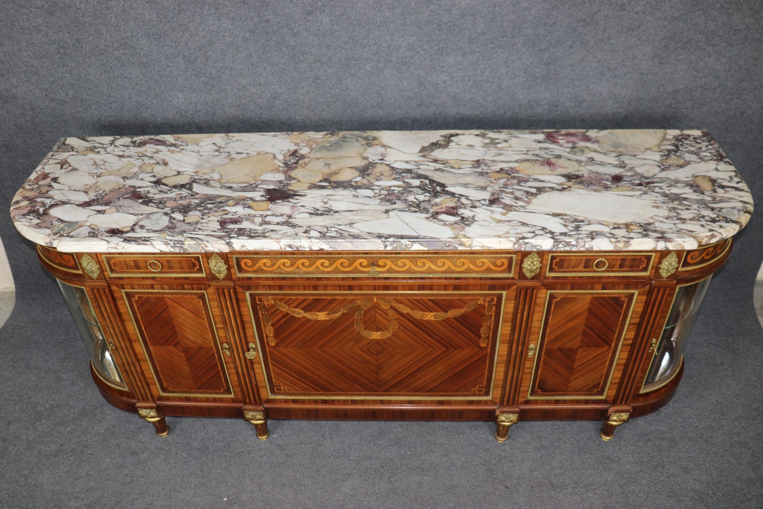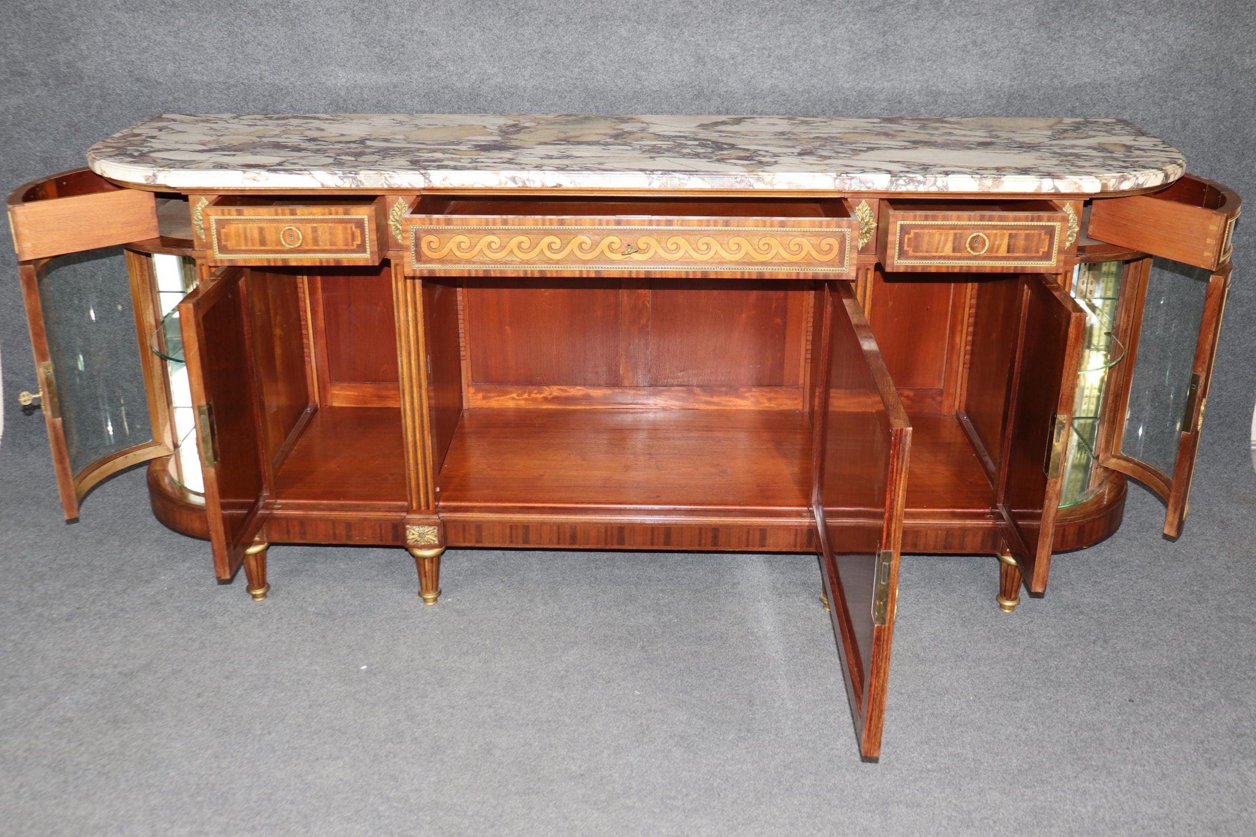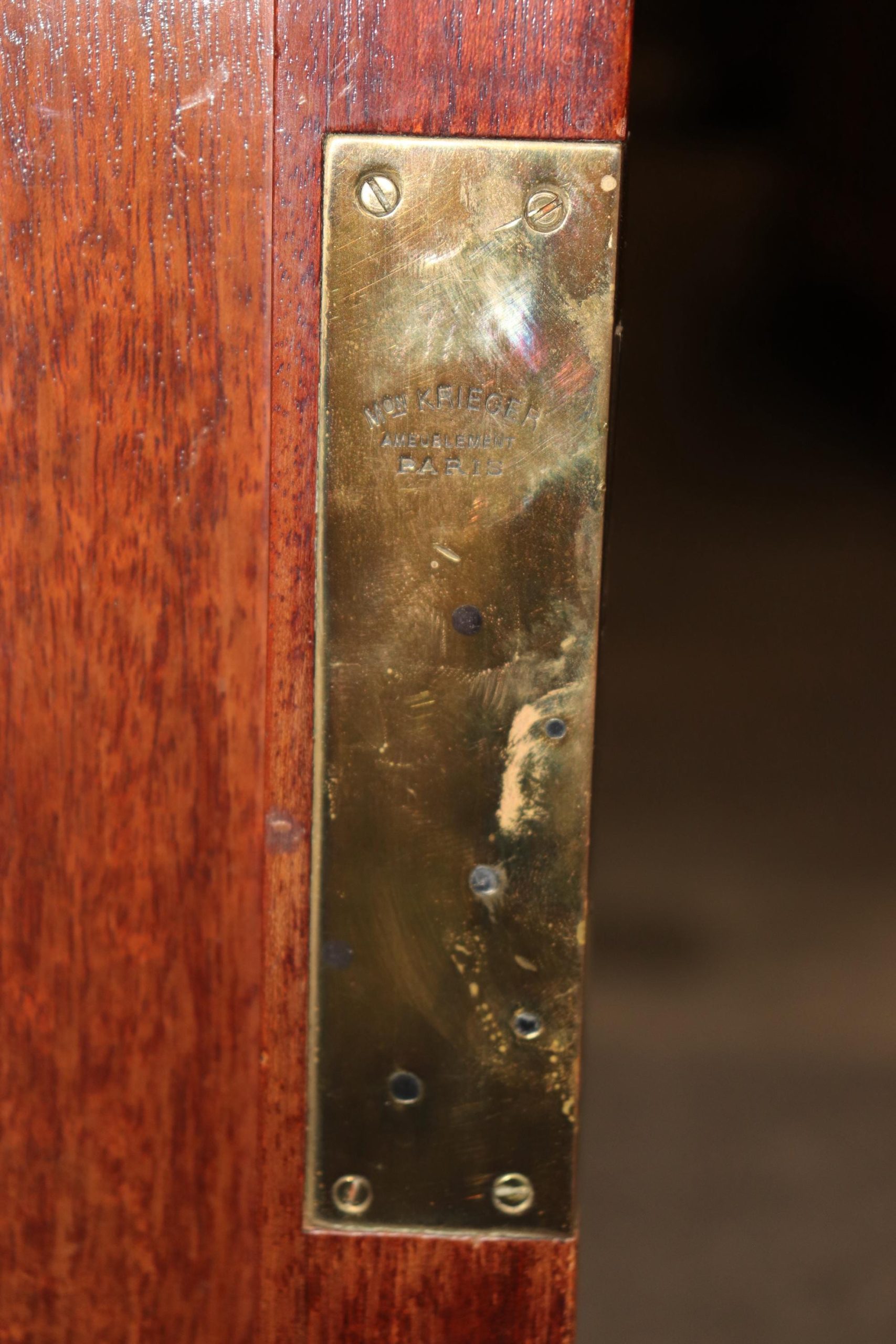 Functionality is seamlessly integrated with its design. The sideboard is equipped with five drawers, offering ample storage for linens, silverware, or other valuables. Below, the piece features three large doors, each adorned with finely crafted ormolu escutcheons. Inside, there is generous storage space, making this sideboard as practical as it is beautiful. Providing an ideal space for displaying fine china or other collectibles. Each of the locks are signed “Mon Krieger Ameublement Paris”