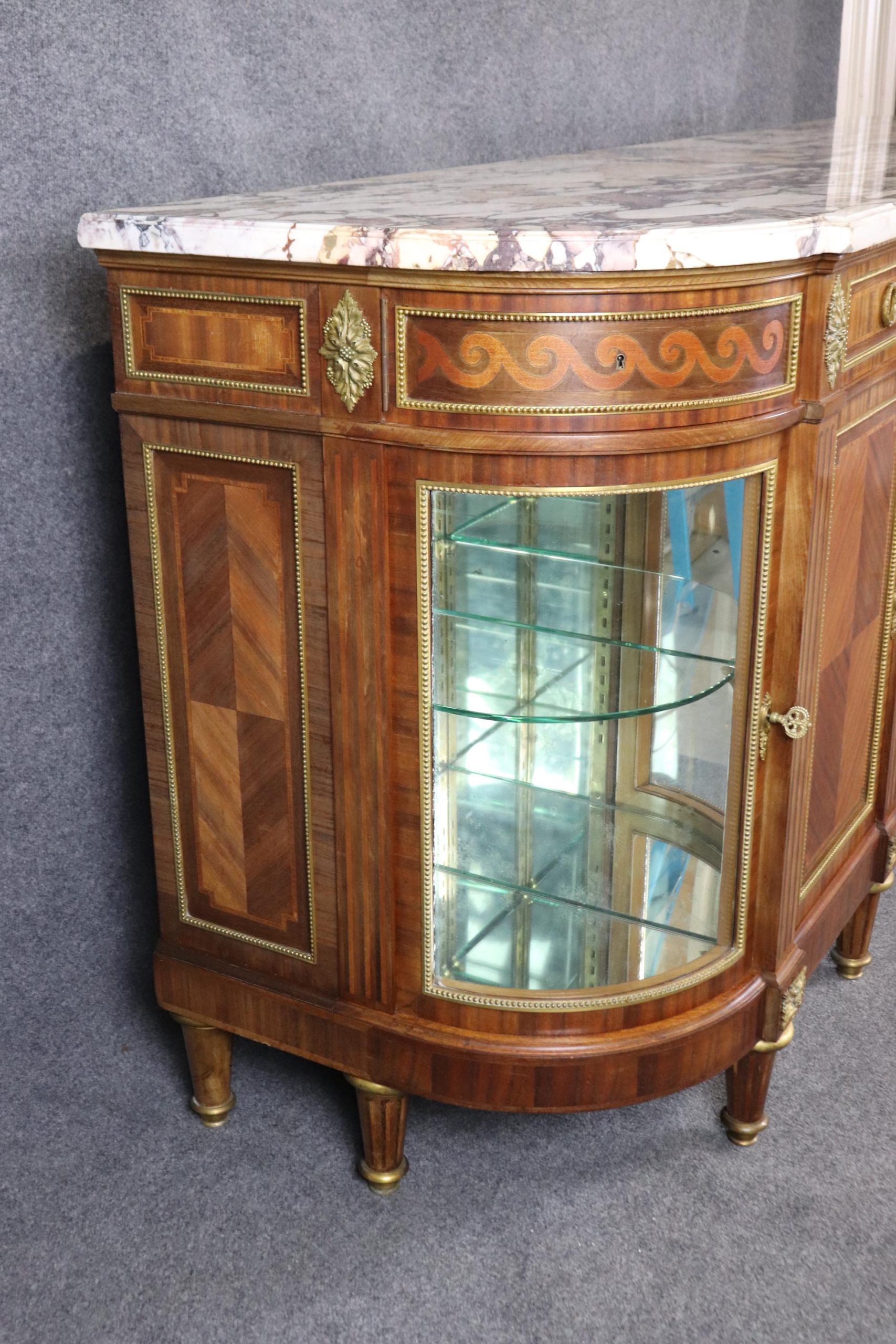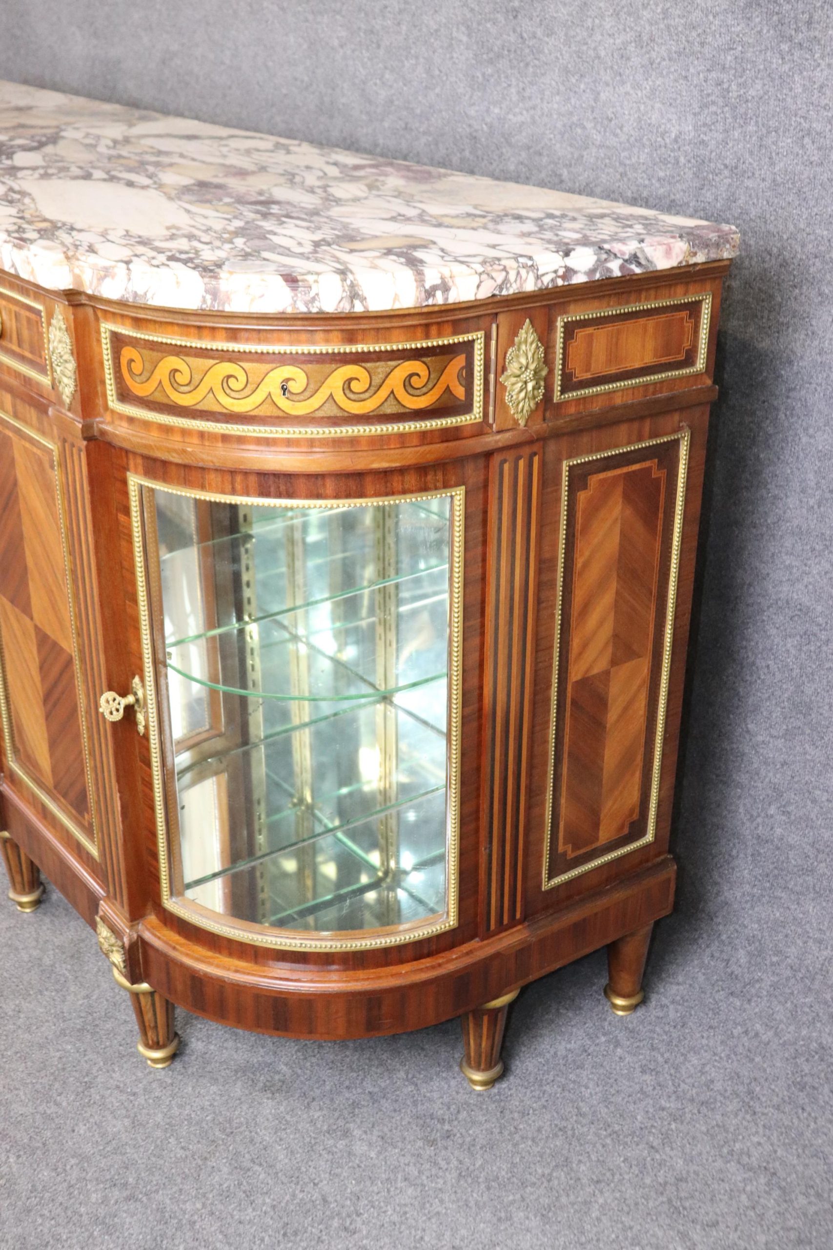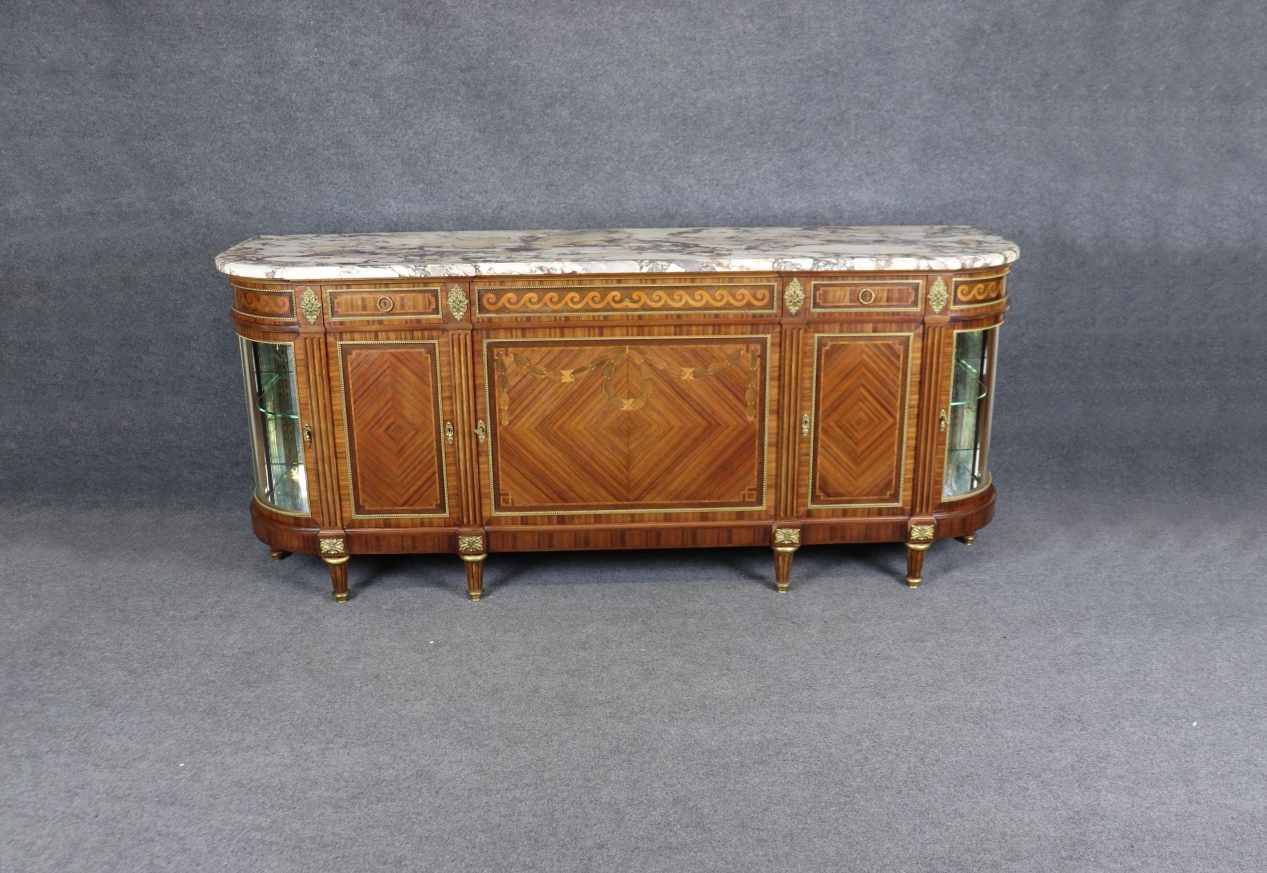 Functionality is seamlessly integrated with its design. The sideboard is equipped with five drawers, offering ample storage for linens, silverware, or other valuables. Below, the piece features three large doors, each adorned with finely crafted ormolu escutcheons. Inside, there is generous storage space, making this sideboard as practical as it is beautiful. Providing an ideal space for displaying fine china or other collectibles. Each of the locks are signed “Mon Krieger Ameublement Paris”