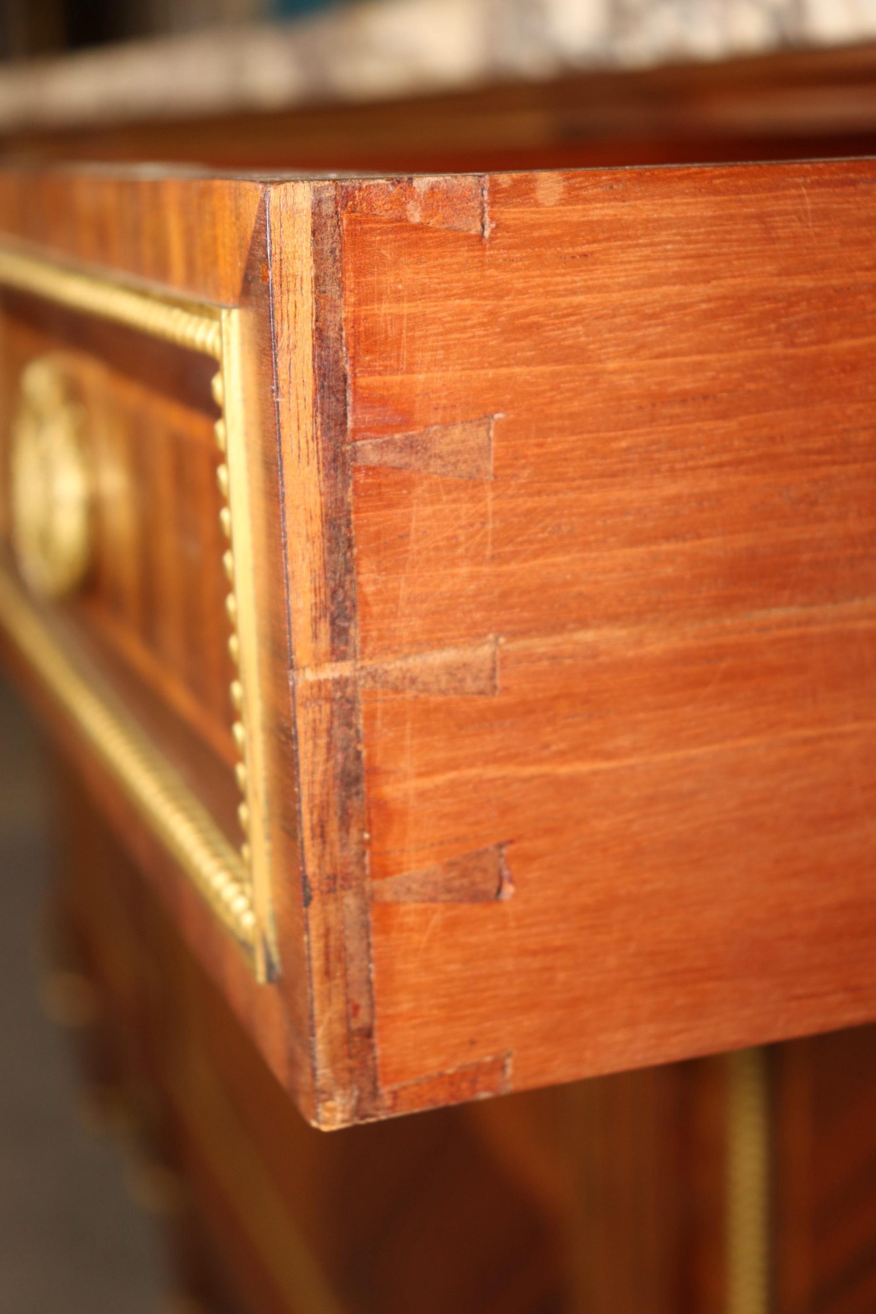 The overall design of this sideboard reflects the elegance and symmetry of Louis XVI style, with straight lines, fluted columns, and a balanced composition that conveys both grandeur and refinement. The quality of craftsmanship is evident in every detail, from the precision of the ormolu mounts to the rich, polished finish of the wood, which is likely made from rich Walnut With Oak secondaries. All of the drawers are also dovetailed.