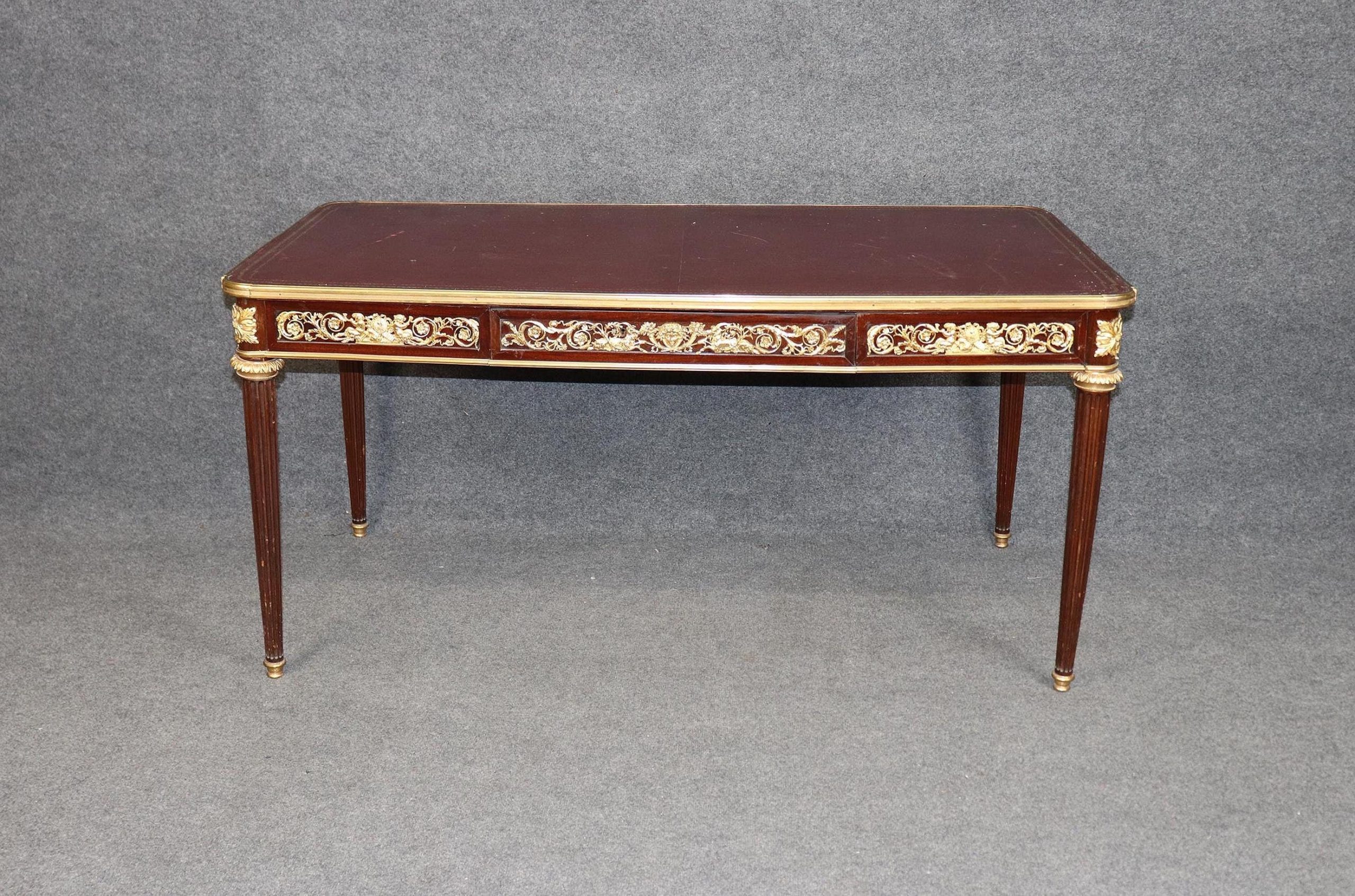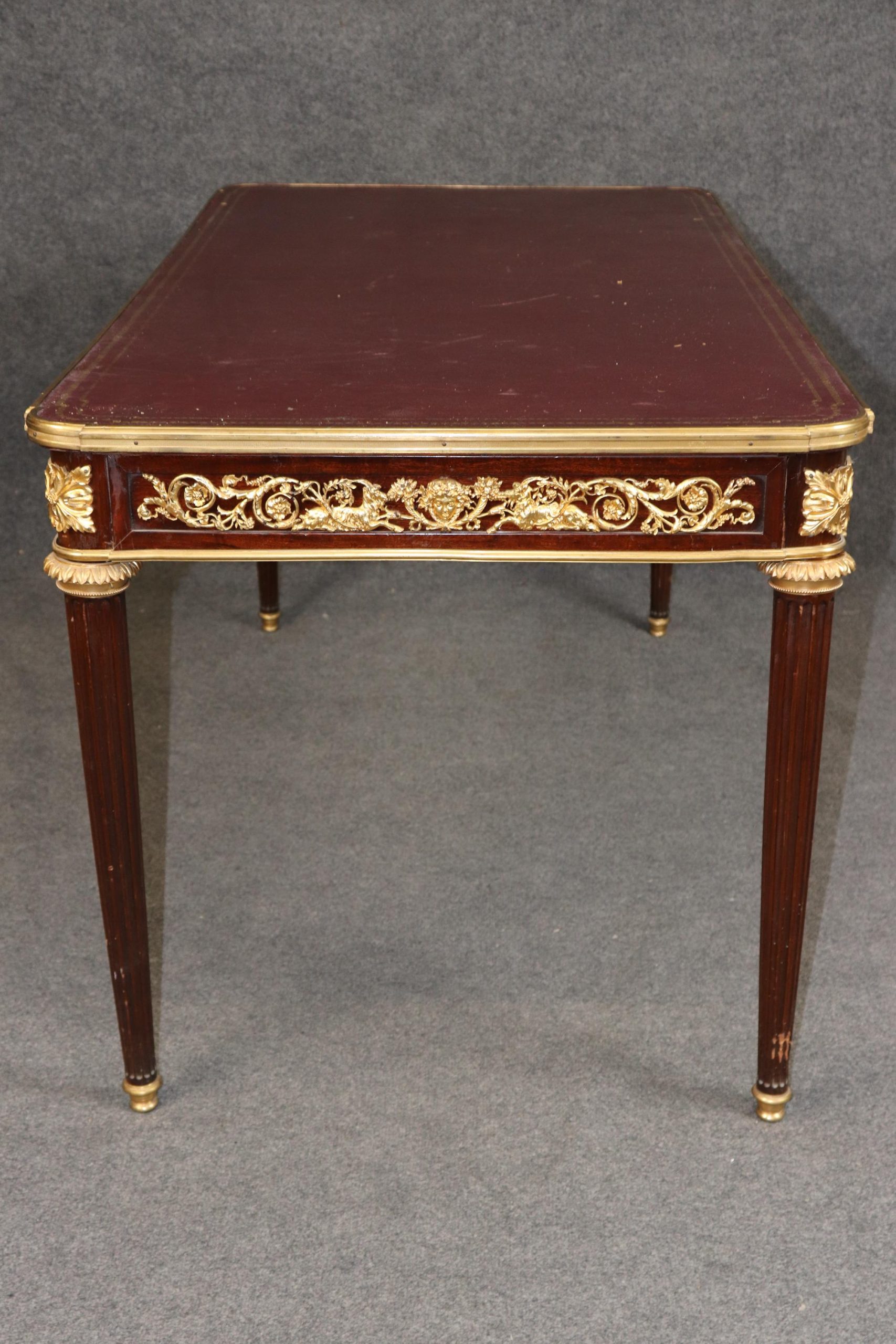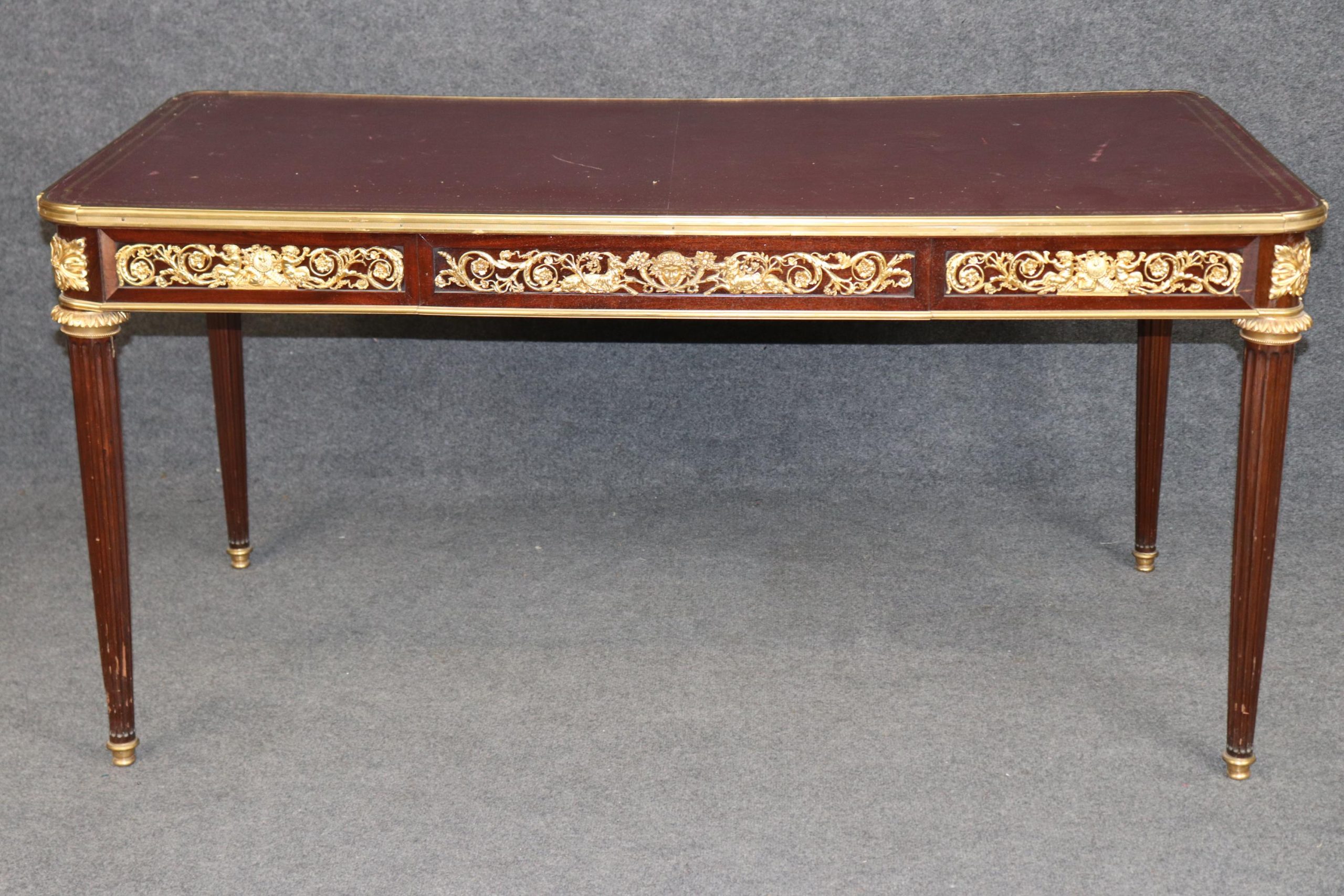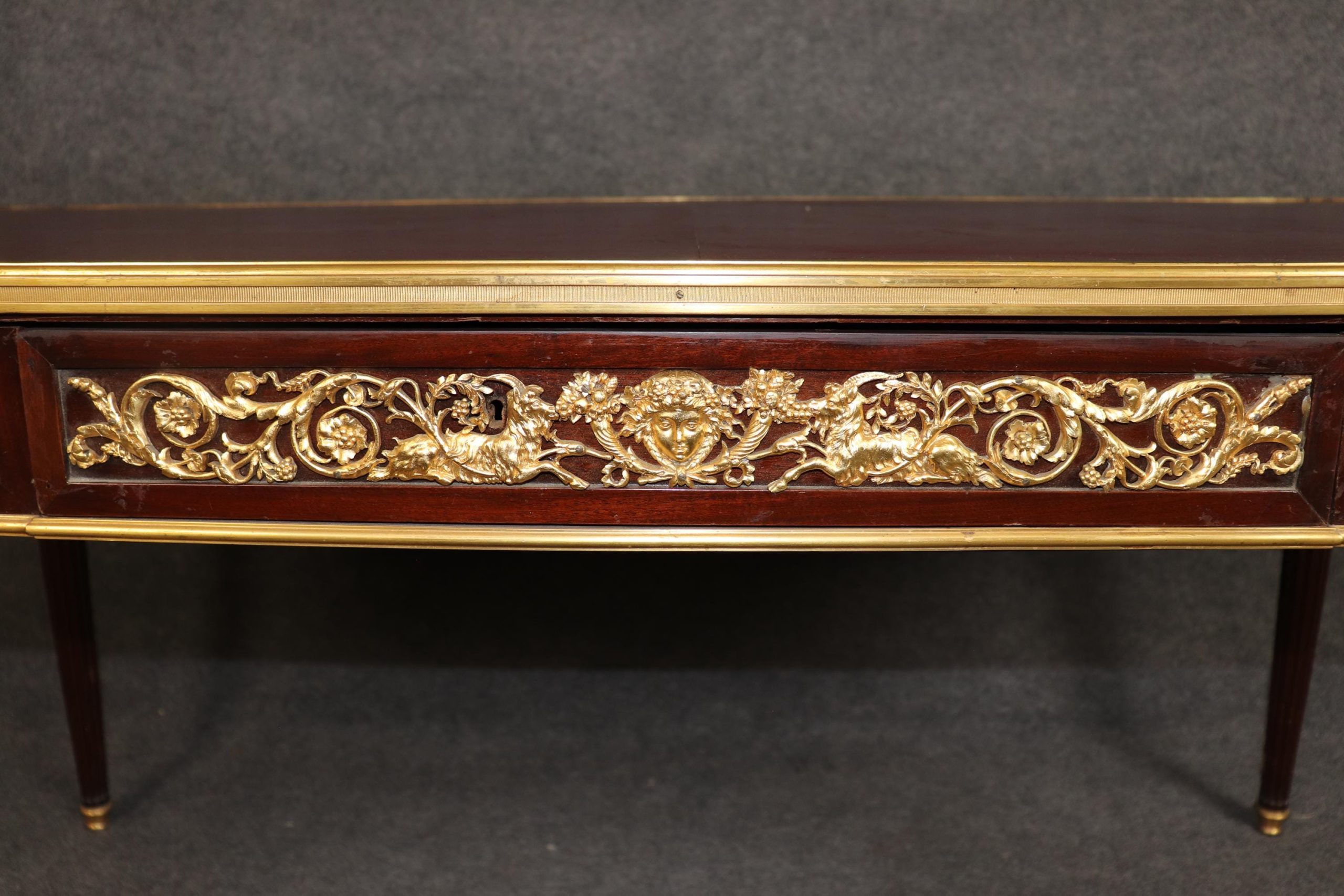 Antique furniture and vintage pieces have stood the test of time and this desk is no exception. With its quality materials and great craftsmanship this is bound to last you and your family for many years to come. The table is in good antique condition with minor surface scratches and wear to the leather as well as some minor tarnishing to the bronze mounts, as to be expected with an item of this age! Otherwise good condition.