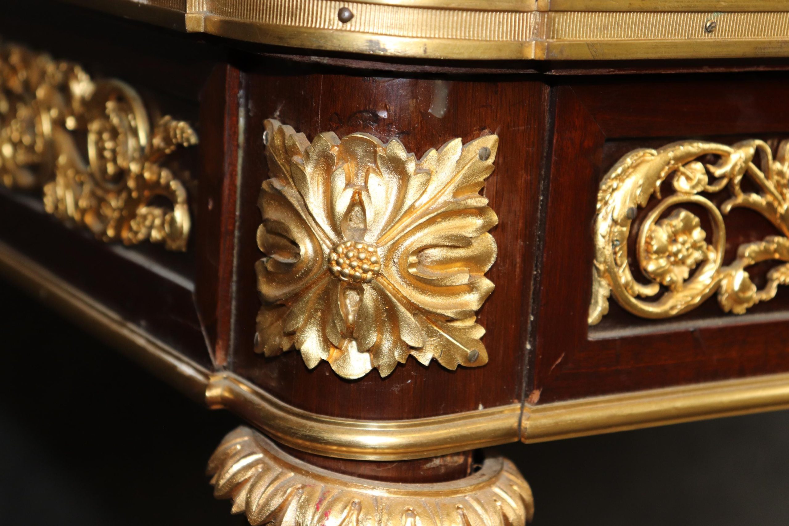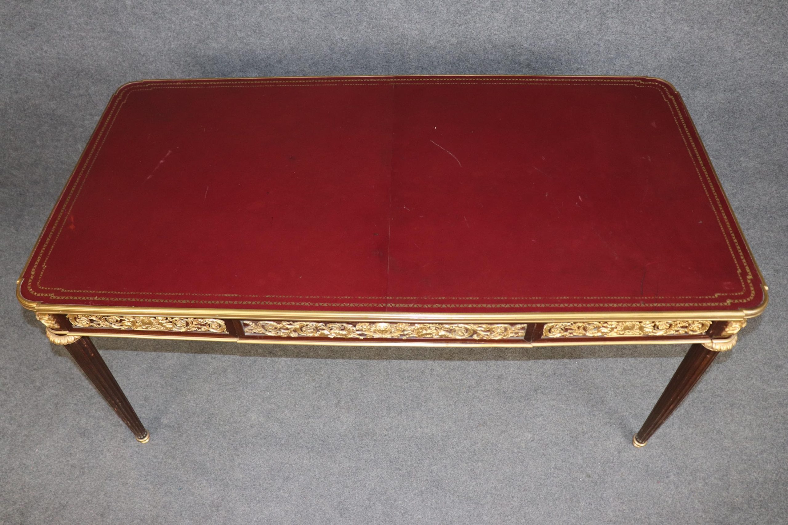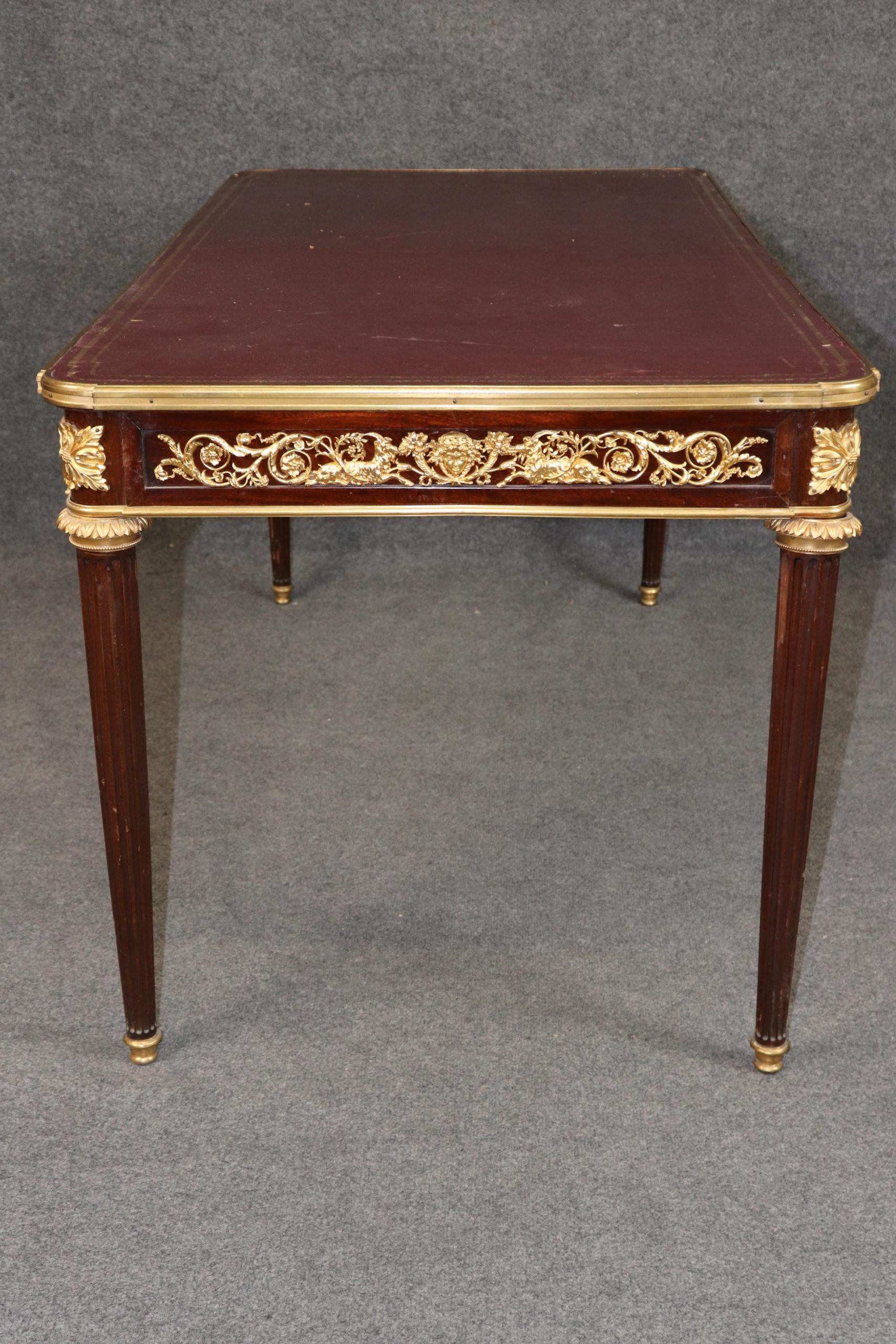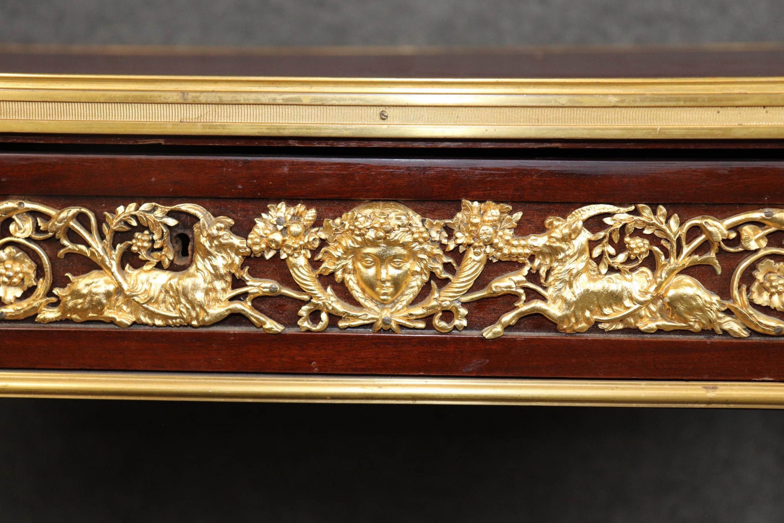 Antique furniture and vintage pieces have stood the test of time and this desk is no exception. With its quality materials and great craftsmanship this is bound to last you and your family for many years to come. The table is in good antique condition with minor surface scratches and wear to the leather as well as some minor tarnishing to the bronze mounts, as to be expected with an item of this age! Otherwise good condition.