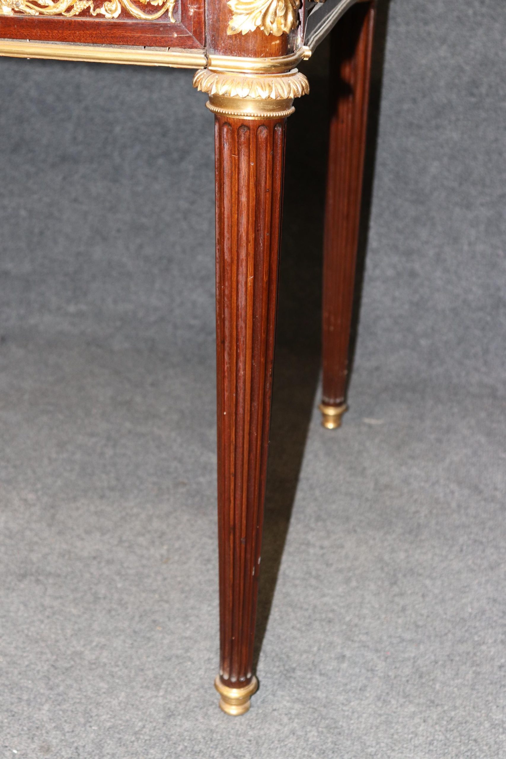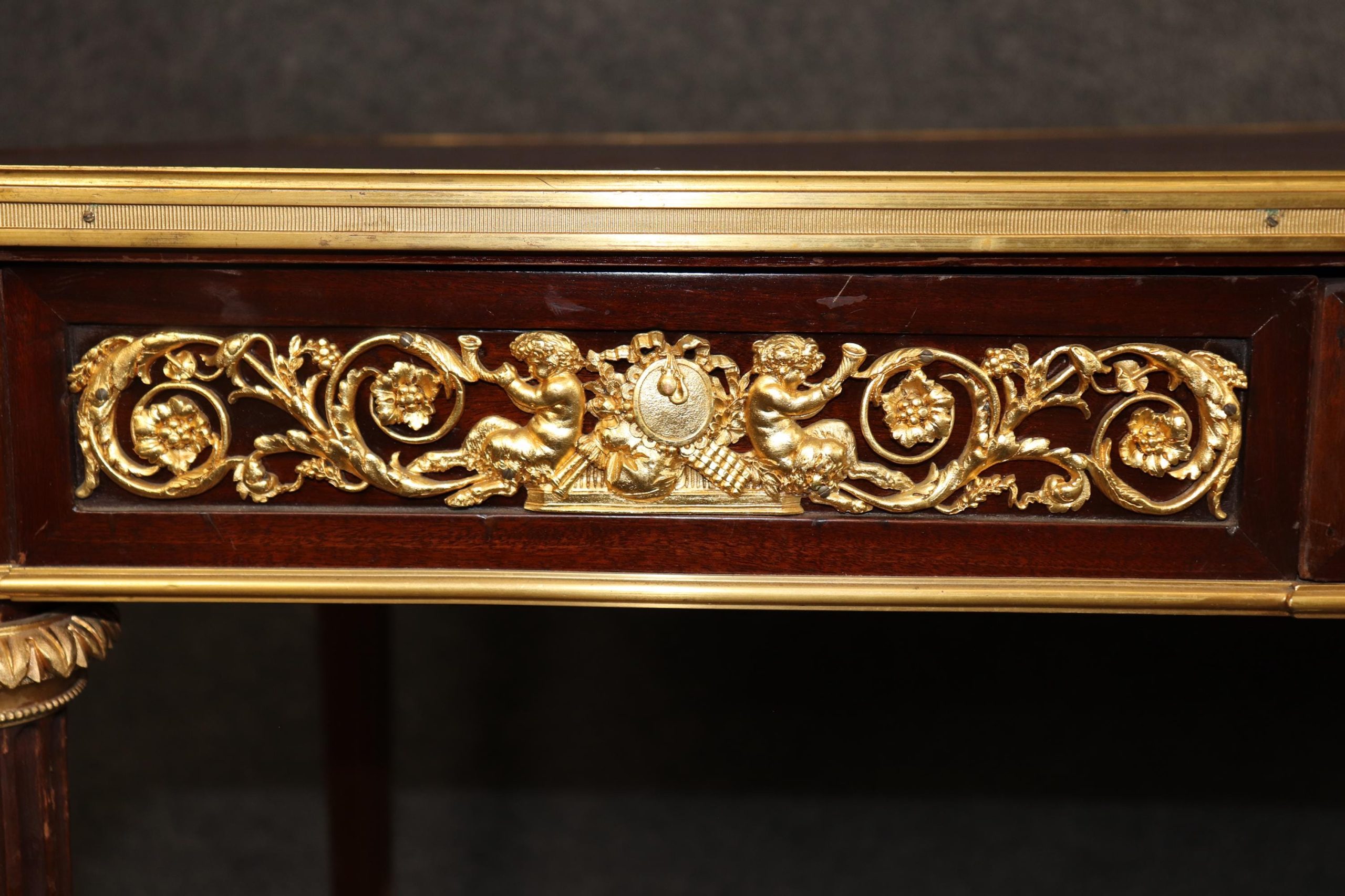 The desk also includes a discreet pull-out drawer, ideal for storing writing instruments, documents, and personal accessories. The drawer glides smoothly, reflecting the superior workmanship for which Maison Millet was celebrated. The clean lines of the frame, fluted legs, and classical bronze mounts—featuring floral swags, ribbon motifs, and neoclassical ornamentation—enhance the desk’s architectural symmetry and timeless elegance.