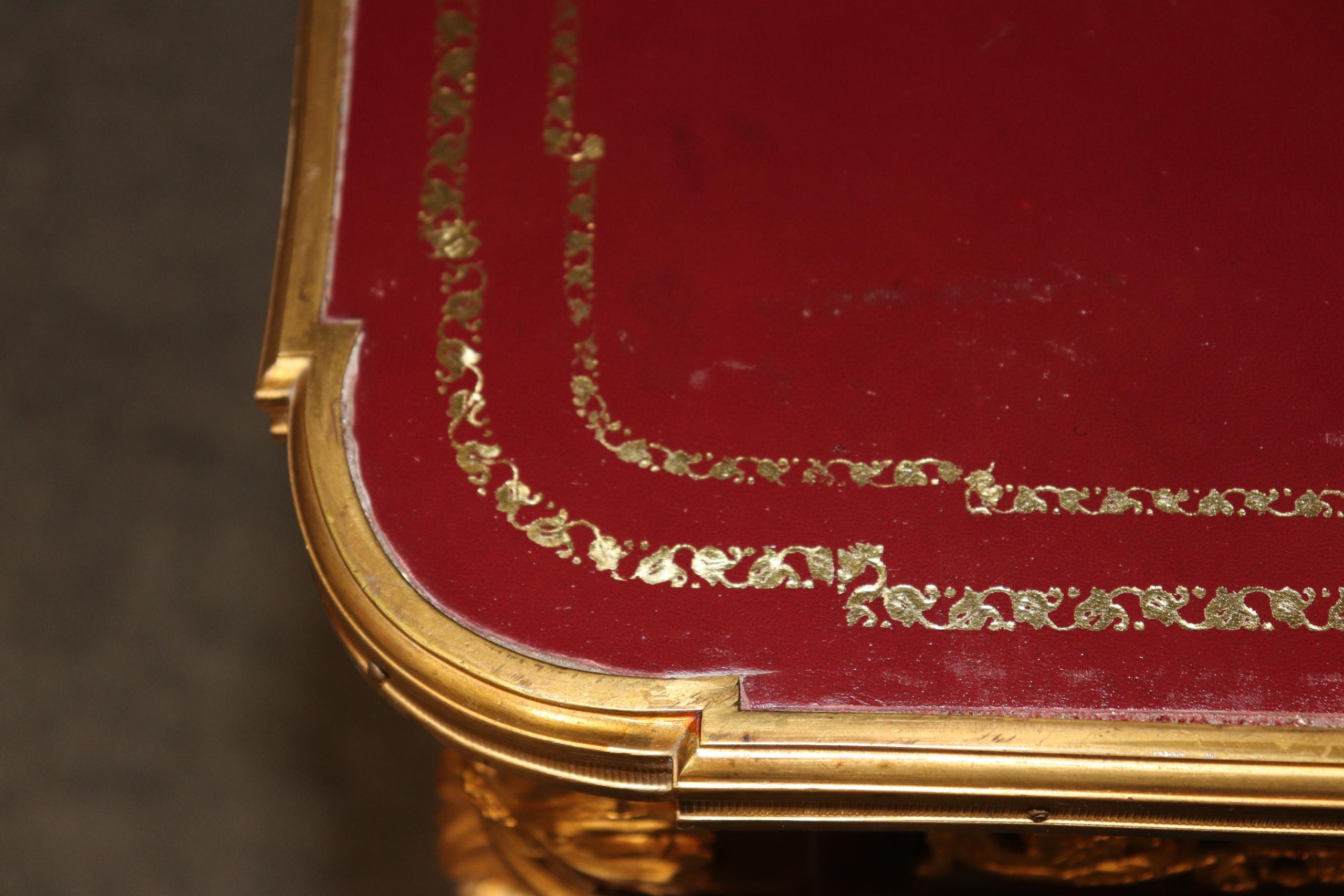 Elegantly proportioned and richly ornamented, this writing desk / executive desk features a beautifully preserved embossed scarlet leather top, framed by a molded border and accented with exquisite gilt-bronze (ormolu) mounts. The deep red leather surface, decorated with gold tooling, adds warmth and character, creating a striking contrast against the refined wooden case. This combination of richly colored leather and luminous bronze is quintessentially Louis XVI—both stately and understated, luxurious yet dignified.