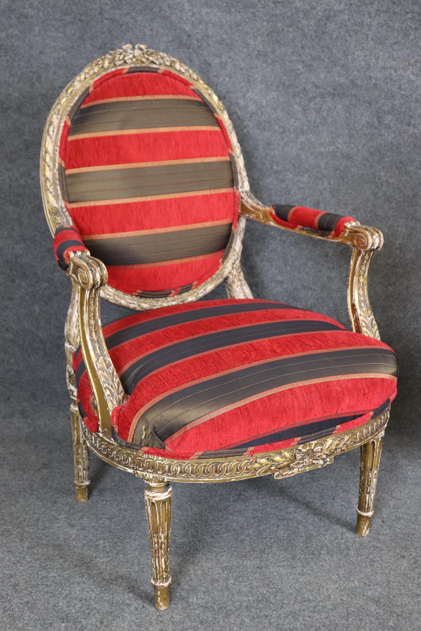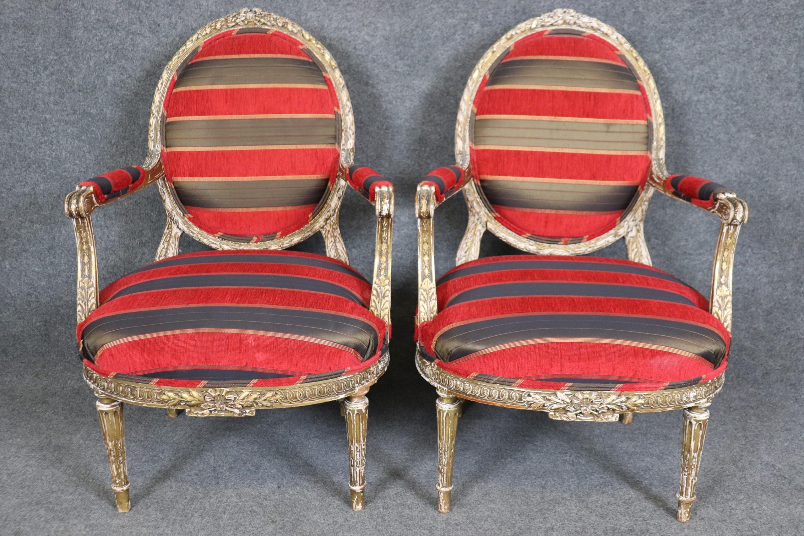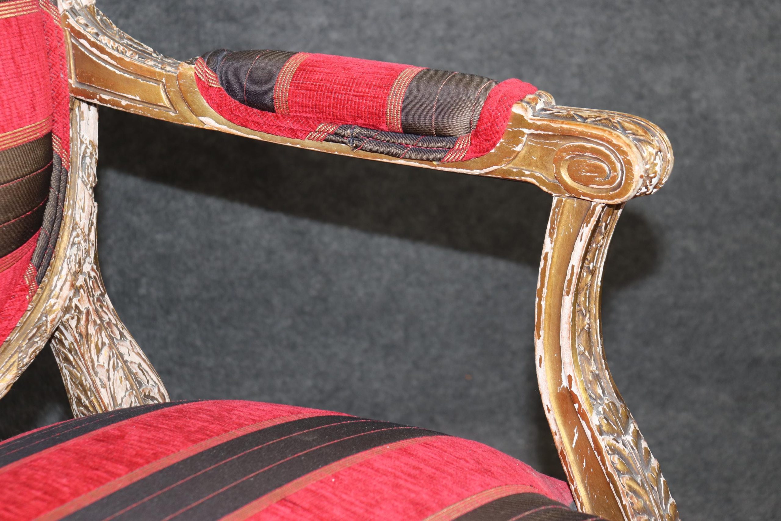 This pair of antique, turn of the century, French Louis XVI style carved gilt armchairs is perfect for you and your home and is a lovely example of high quality furniture from the early 20th century! If you look at the photos provided, you will see the luxurious upholstery and the detail in the carving of the frames. Another nice aspect is the naturally distressed frames something that was acquired through age and use. This pair is perfect for any entryway, living room, bedroom or office and is bound to bring that little extra sense of character and class into your home! One nice thing about this pair is the ability to be paired with a variety of other styles including Art Deco, Art Nouveau, Louis XV, Louis XVI, Mid Century Modern and Contemporary! Antique furniture and vintage pieces have stood the test of time and this pair of chairs is no exception! With their quality materials and great craftsmanship this pair will last you and your family for many years to come. The chairs are in good antique condition with surface scratches and finish loss to the frames as to be expected of items of this age. Upholstery appears to be in good condition.