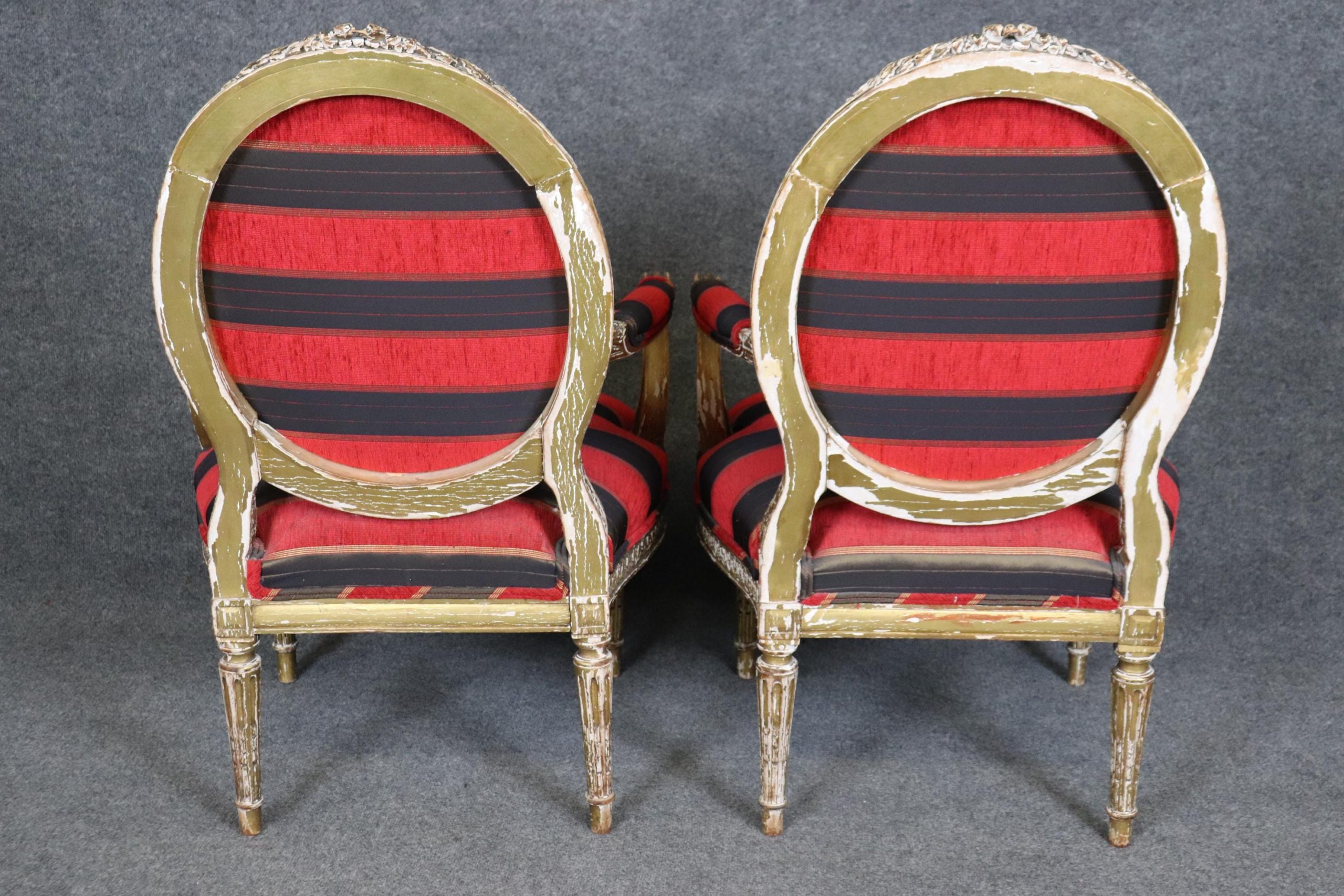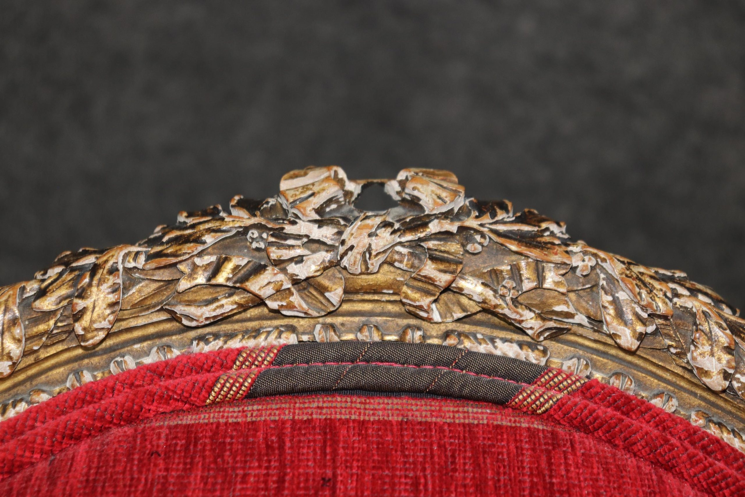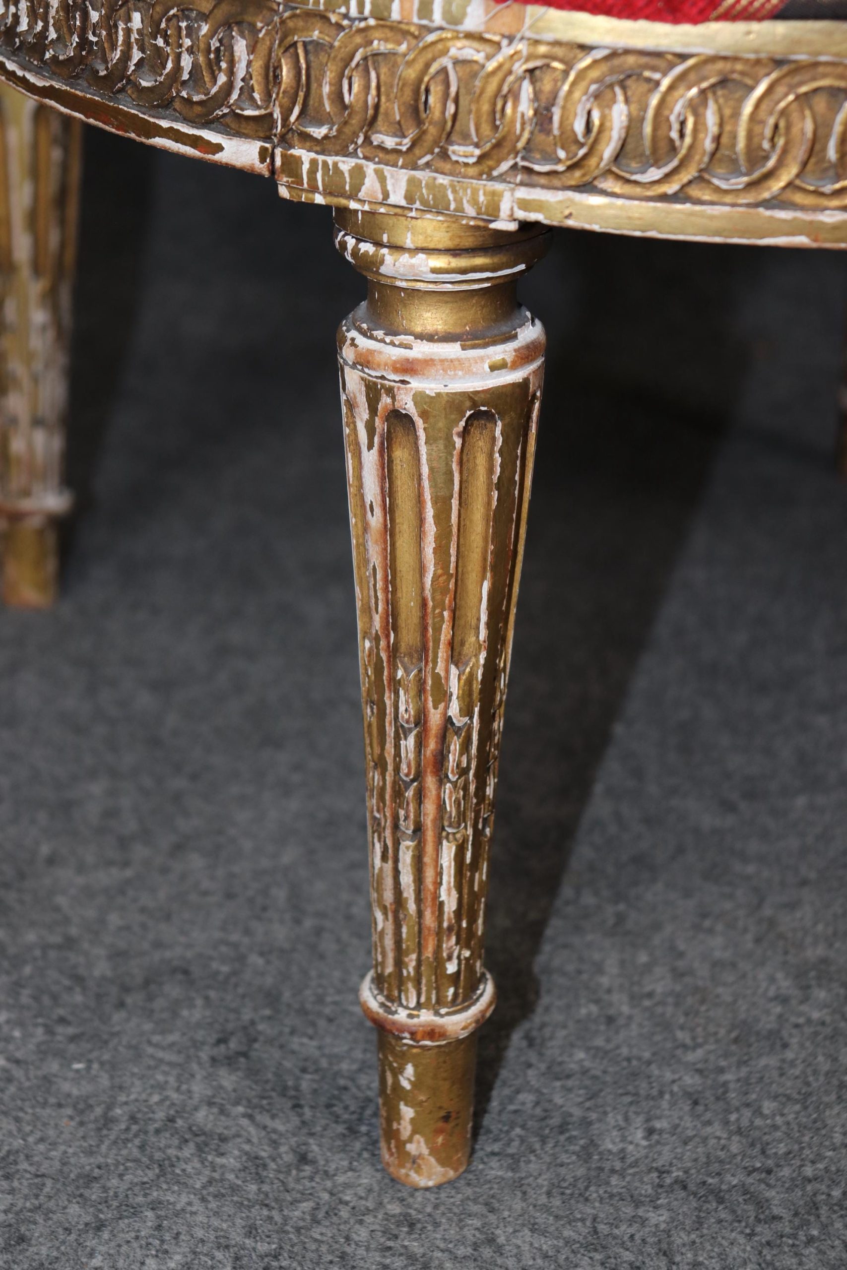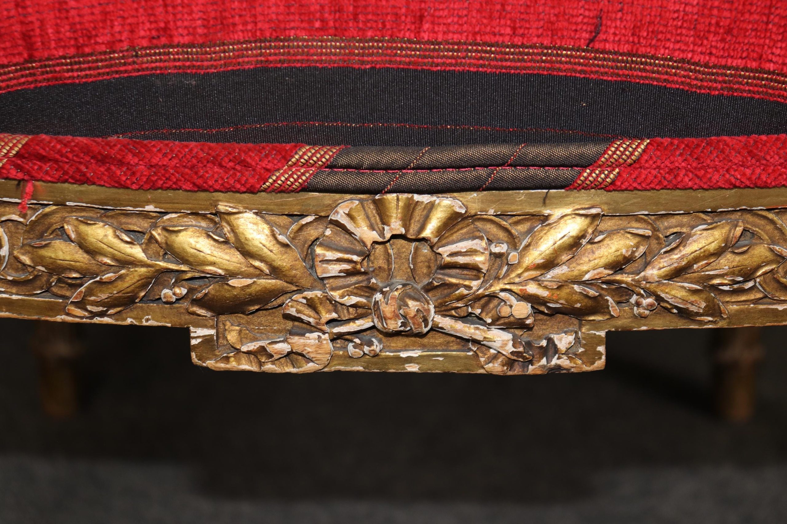 This pair of antique, turn of the century, French Louis XVI style carved gilt armchairs is perfect for you and your home and is a lovely example of high quality furniture from the early 20th century! If you look at the photos provided, you will see the luxurious upholstery and the detail in the carving of the frames. Another nice aspect is the naturally distressed frames something that was acquired through age and use. This pair is perfect for any entryway, living room, bedroom or office and is bound to bring that little extra sense of character and class into your home! One nice thing about this pair is the ability to be paired with a variety of other styles including Art Deco, Art Nouveau, Louis XV, Louis XVI, Mid Century Modern and Contemporary! Antique furniture and vintage pieces have stood the test of time and this pair of chairs is no exception! With their quality materials and great craftsmanship this pair will last you and your family for many years to come. The chairs are in good antique condition with surface scratches and finish loss to the frames as to be expected of items of this age. Upholstery appears to be in good condition.