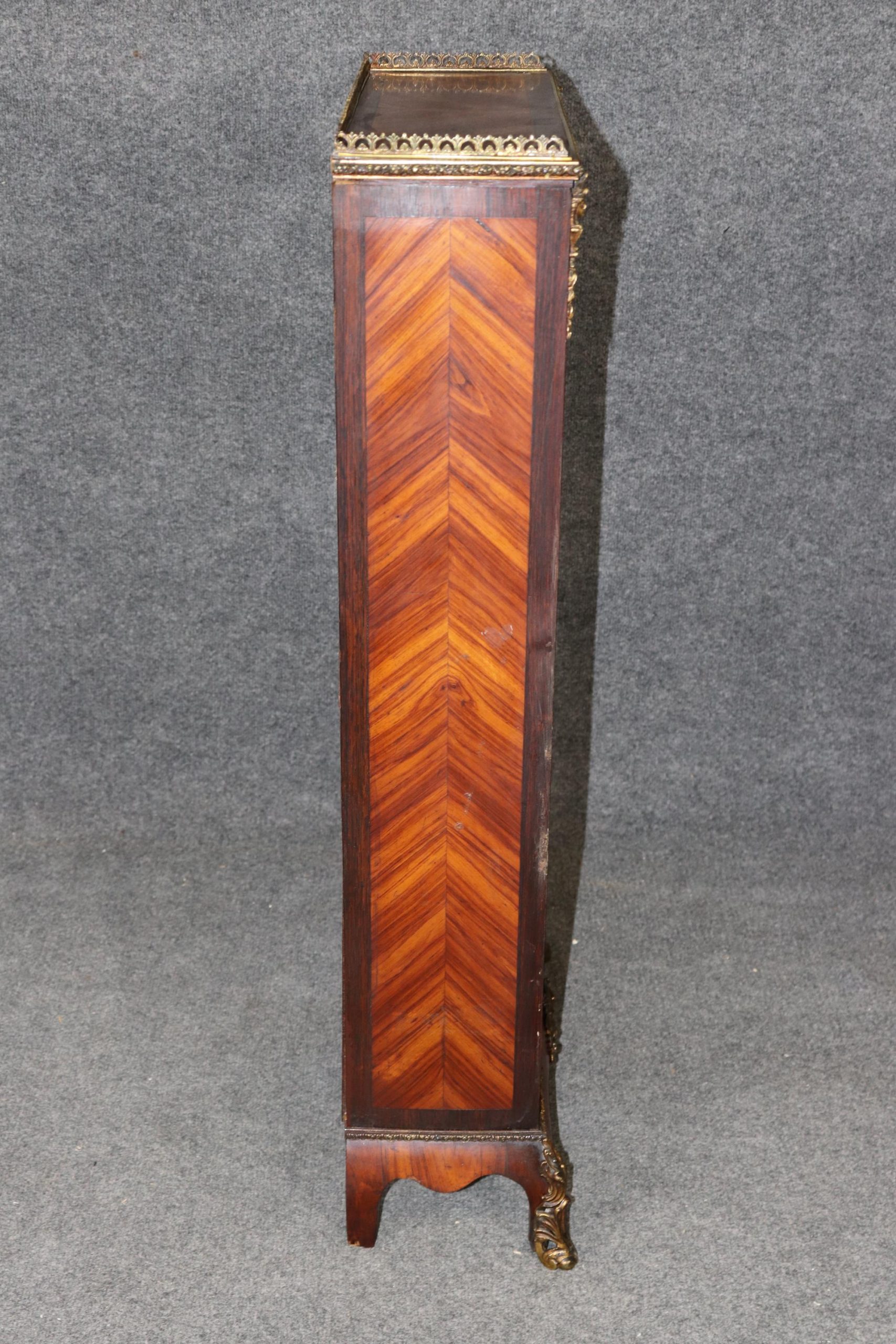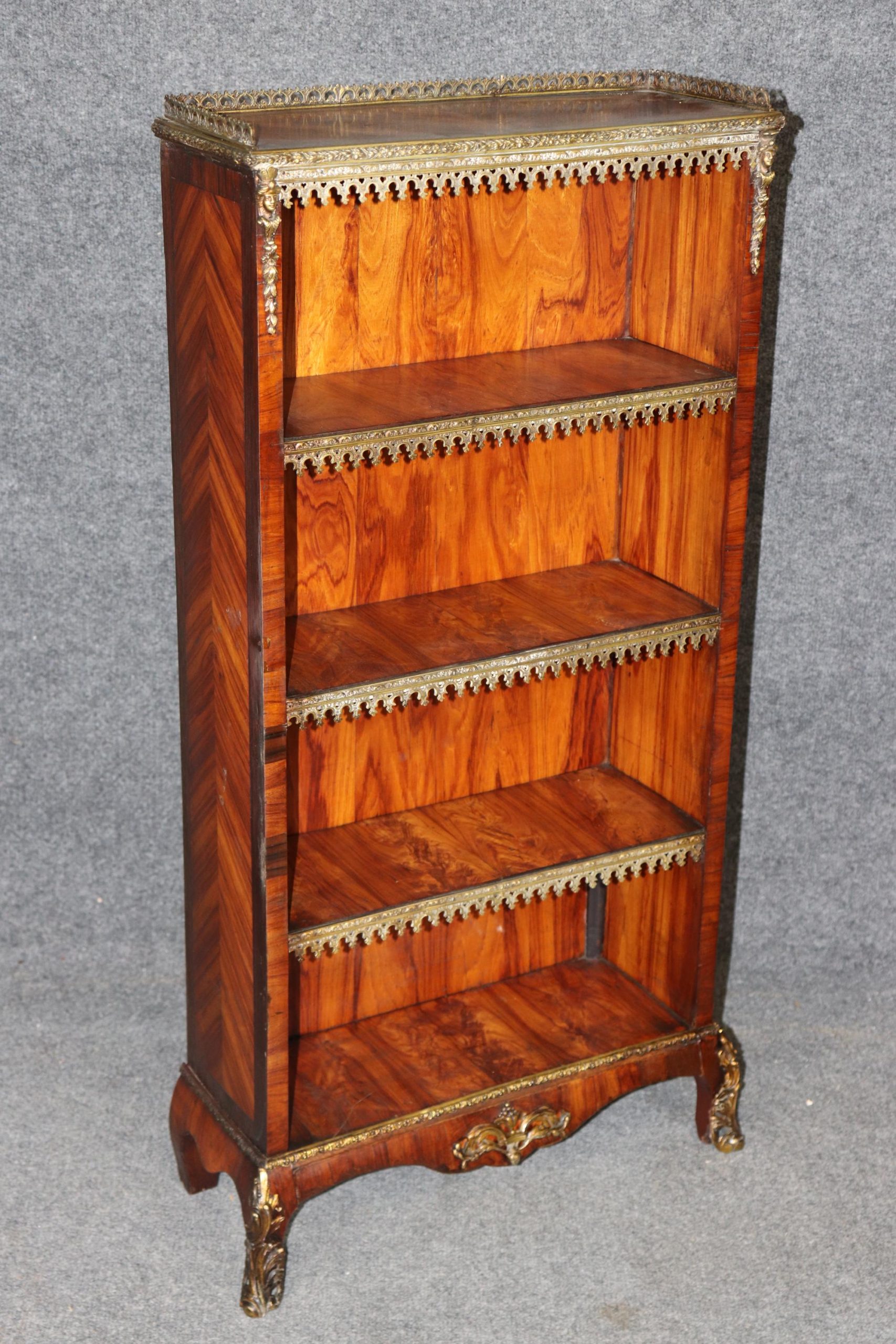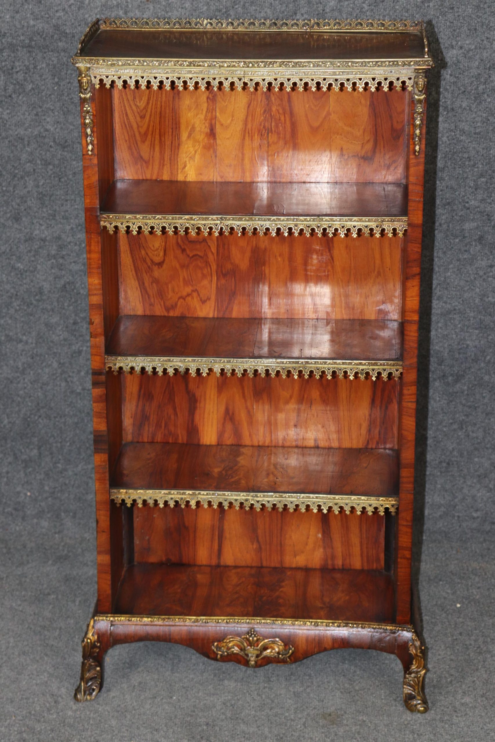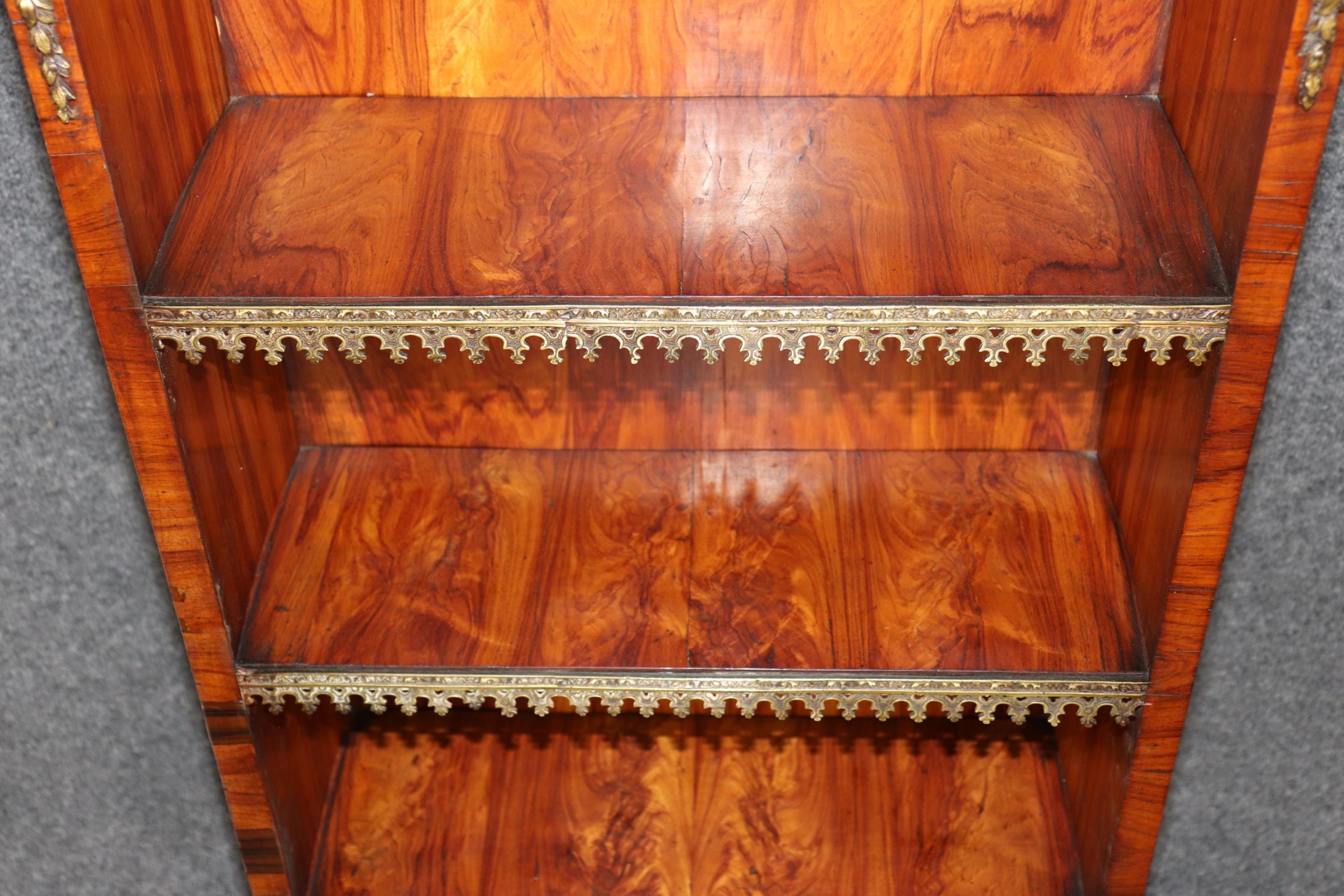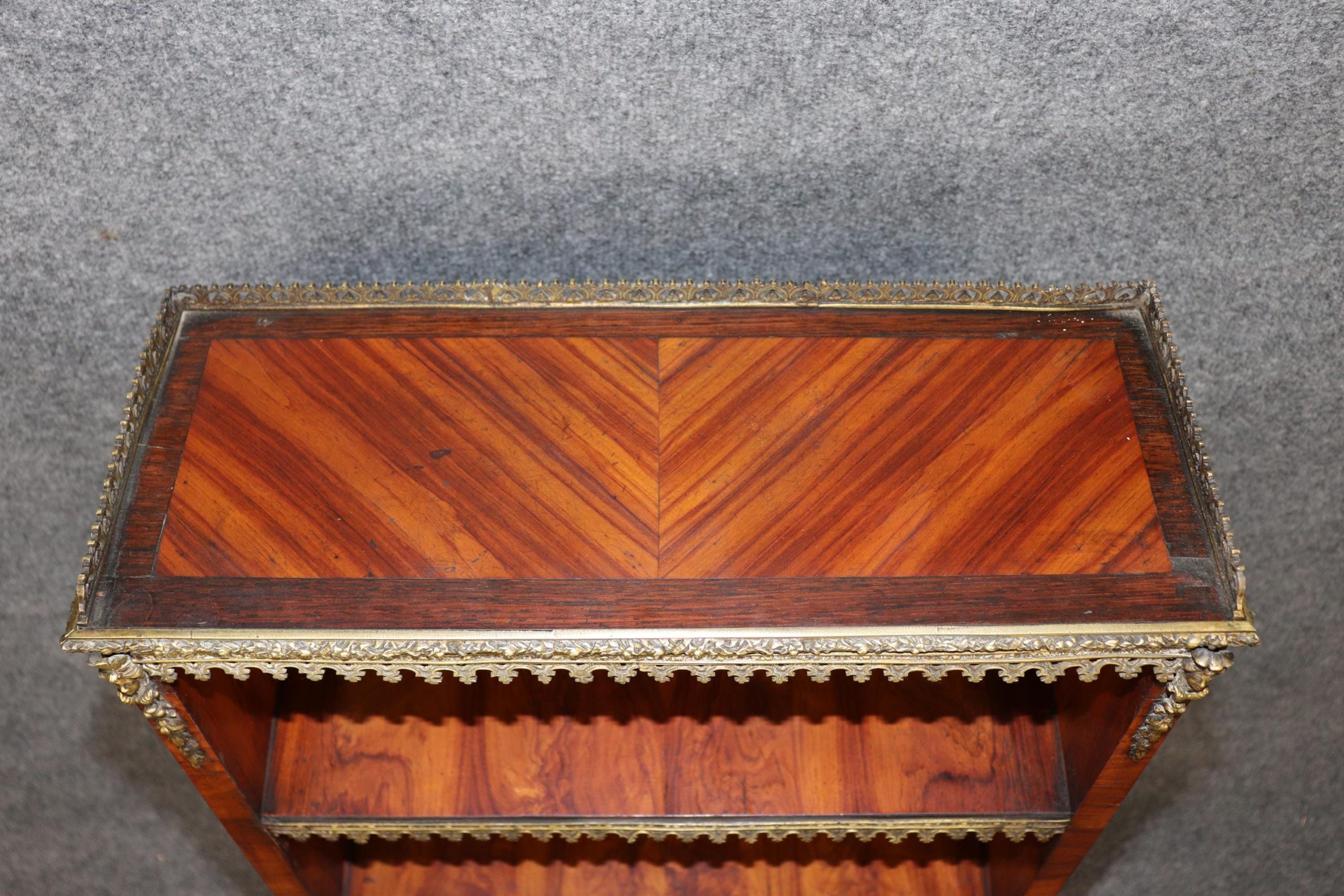 This antique 19th French Napoleonic sytle Rosewood brass mounted bookcase! This bookcase is equipped with three spacious shelves, perfect for showcasing your belongings. If you look closely at the brass mounts, you will see the outstanding craftsmanship used in order to create the mounts. This is a great opportunity to own a piece of investment grade french furniture at a reasonable price. Antique furniture and vintage pieces have stood the test of time and this bookcase is no exception! With its quality materials and great craftsmanship this piece is bound to last you and your family for many years to come. This piece is in great antique condition with light surface scratches and some minor finish loss, but otherwise good condition. There are no significant imperfections to note.