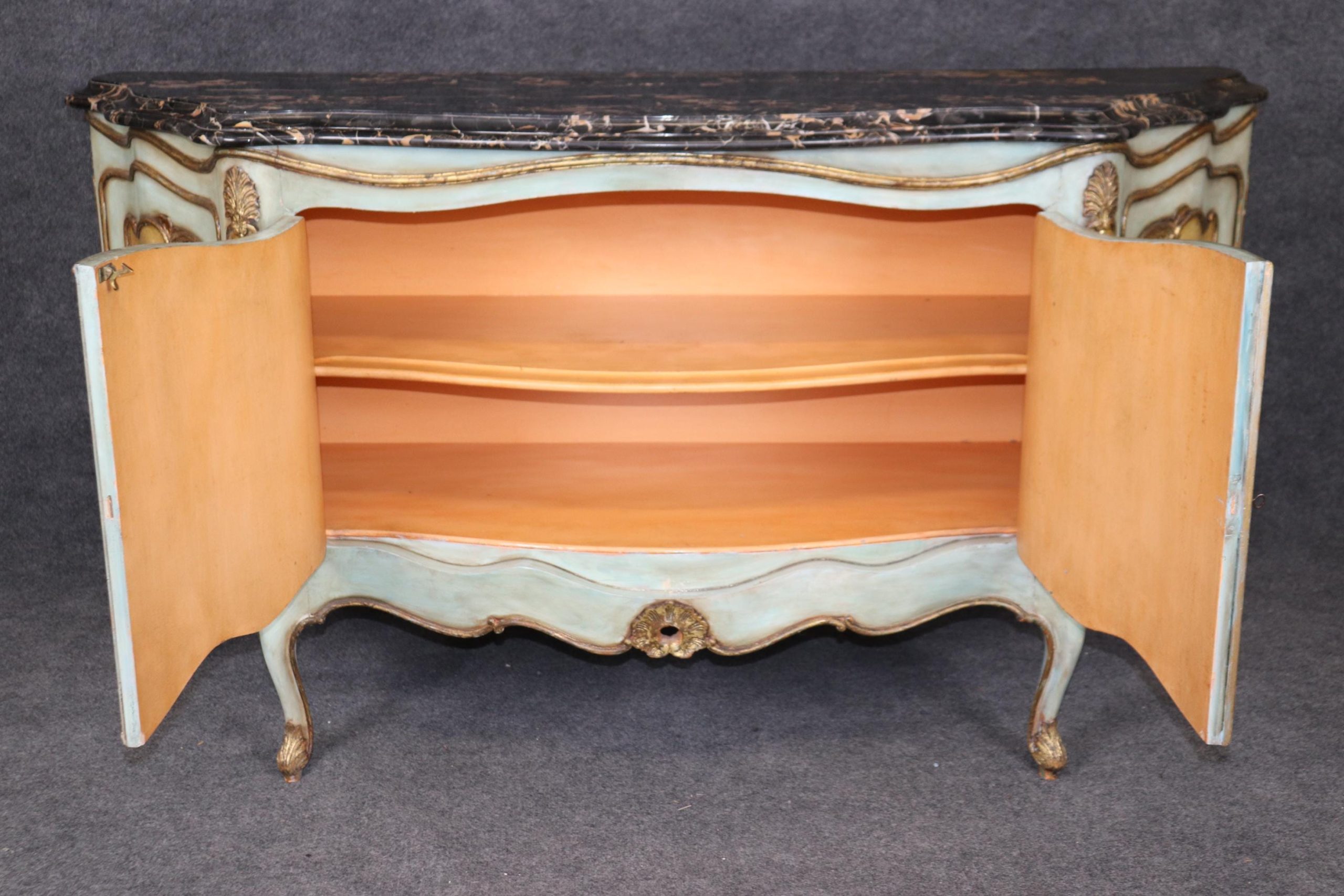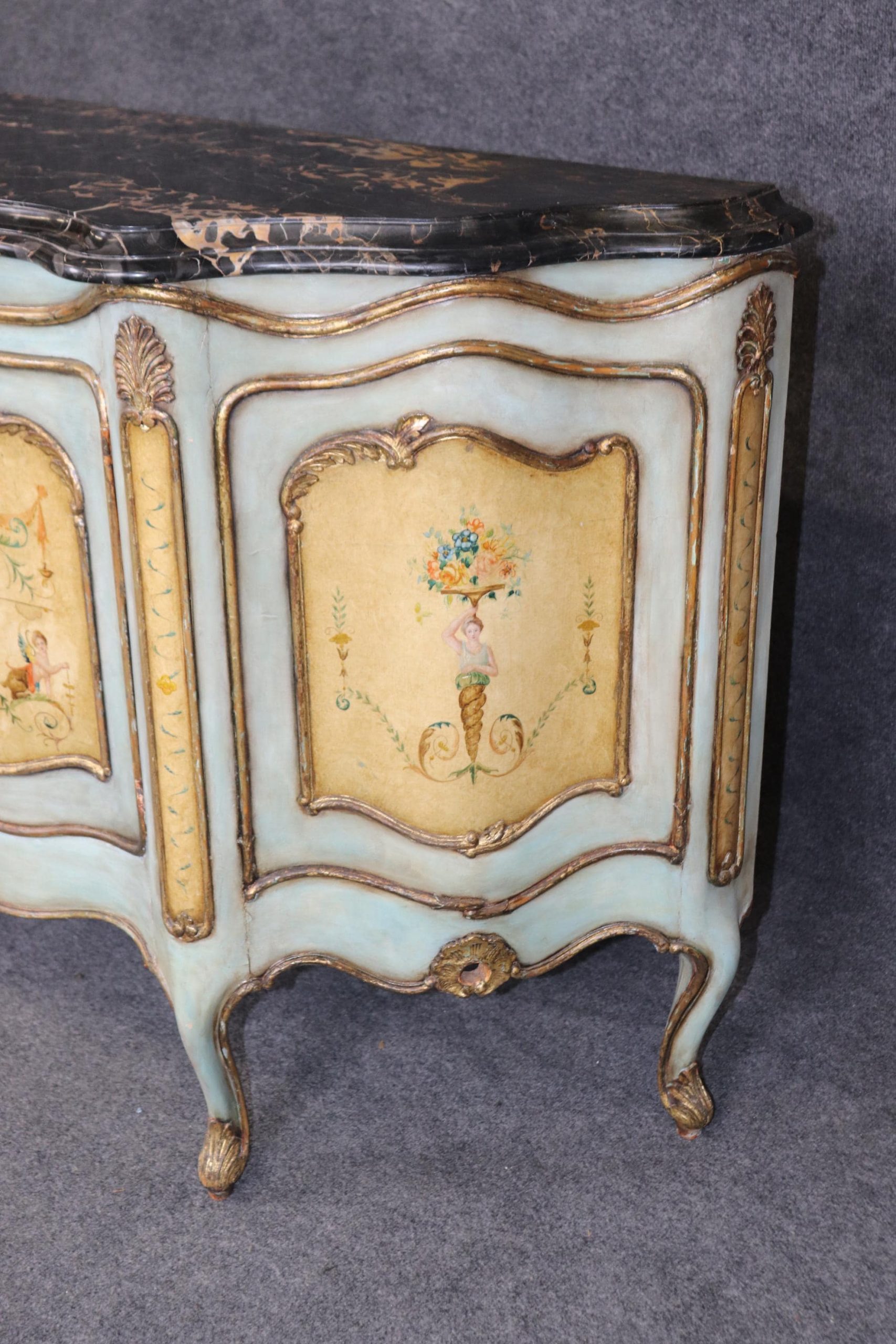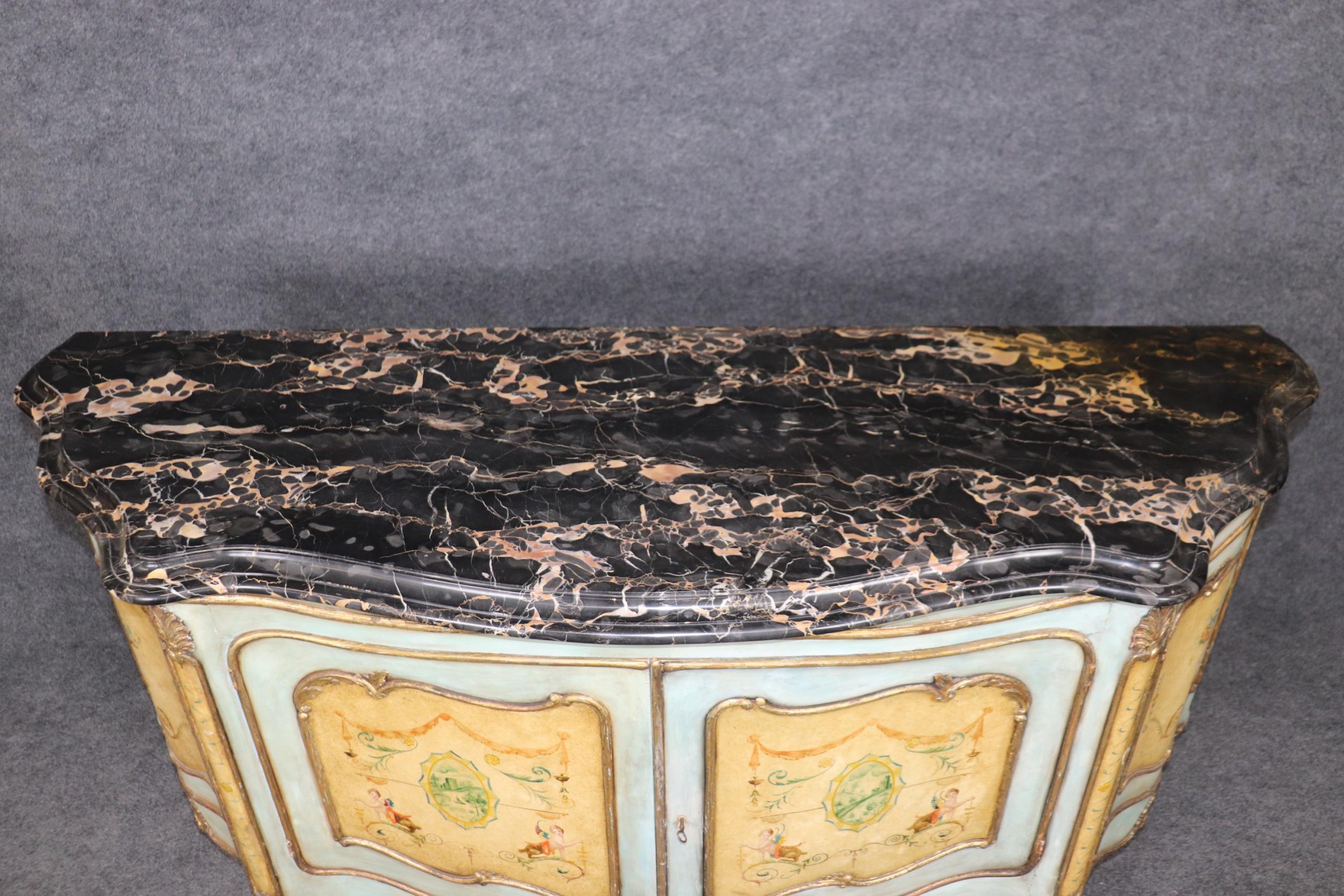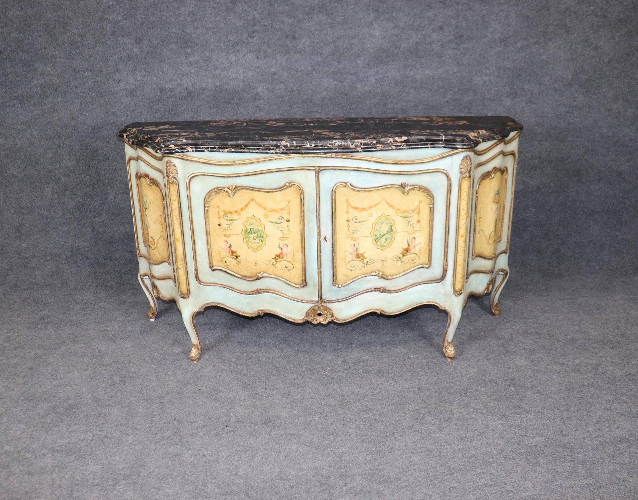 This antique Italian Venetian style paint decorated commode is made of the highest quality and is done very nicely! If you look at the photos provided, you will see the beautiful Italian Potoro marble top (One of the rarest and most expensive marbles in the world) and paint decoration. This commode is perfect for any living room, bedroom, office or entryway and combines elegance with functionality. With two doors opening to a large storage area with a shelf makes this piece perfect for storing any of your personal belongings This piece will most certainly be a conversation starter and add a sense of luxury into your home! Antique furniture and vintage pieces have stood the test of time and this commode is no exception! With its quality materials and great craftsmanship this is bound to last you and your family for many years to come. The commode is in good condition with minor surface scratching and minor finish loss as to be expected with age. The marble has been repaired, but otherwise good condition.