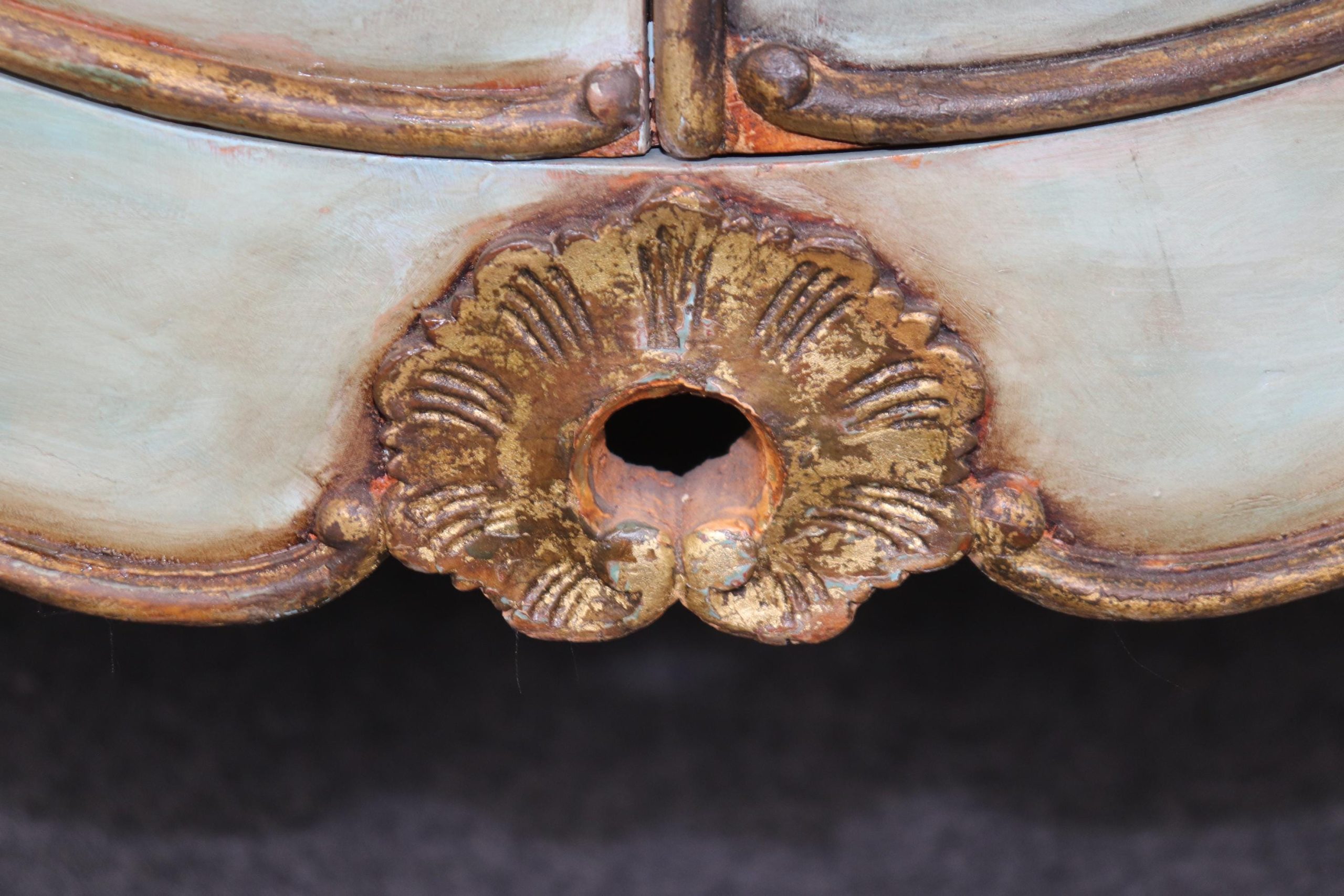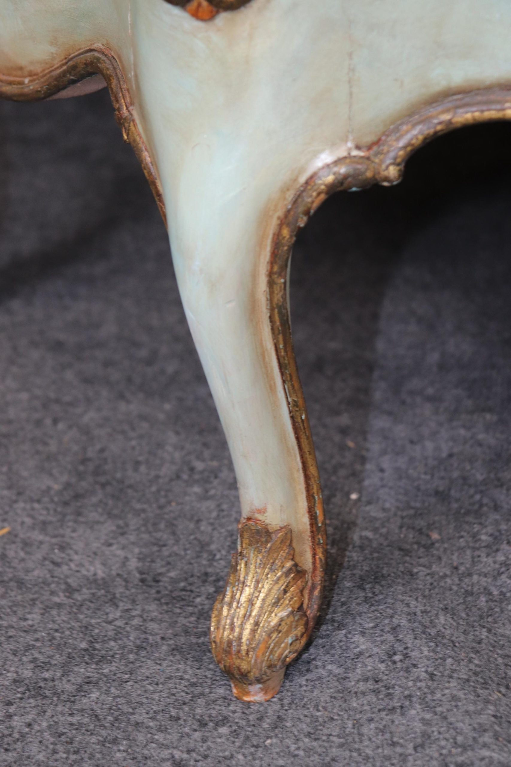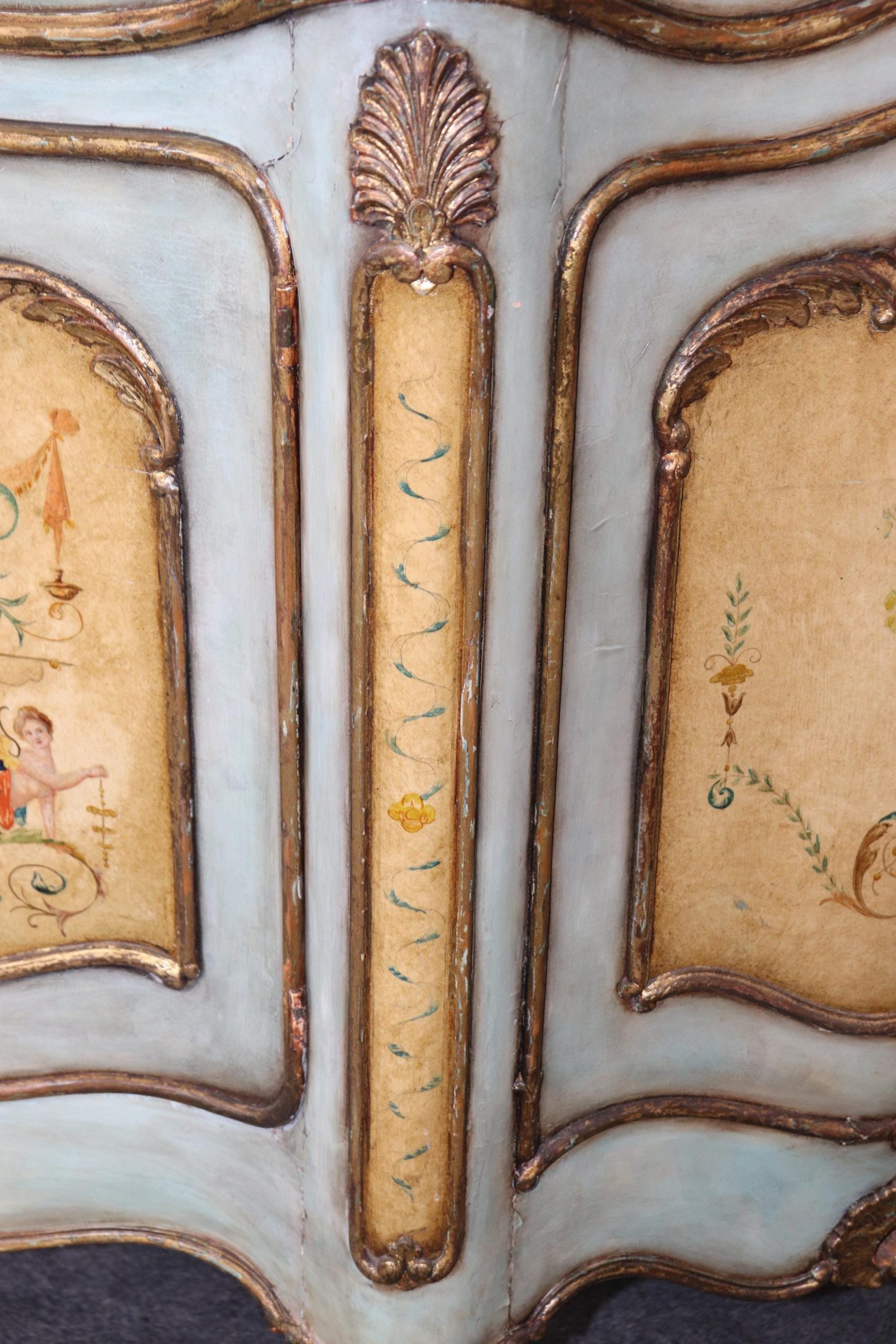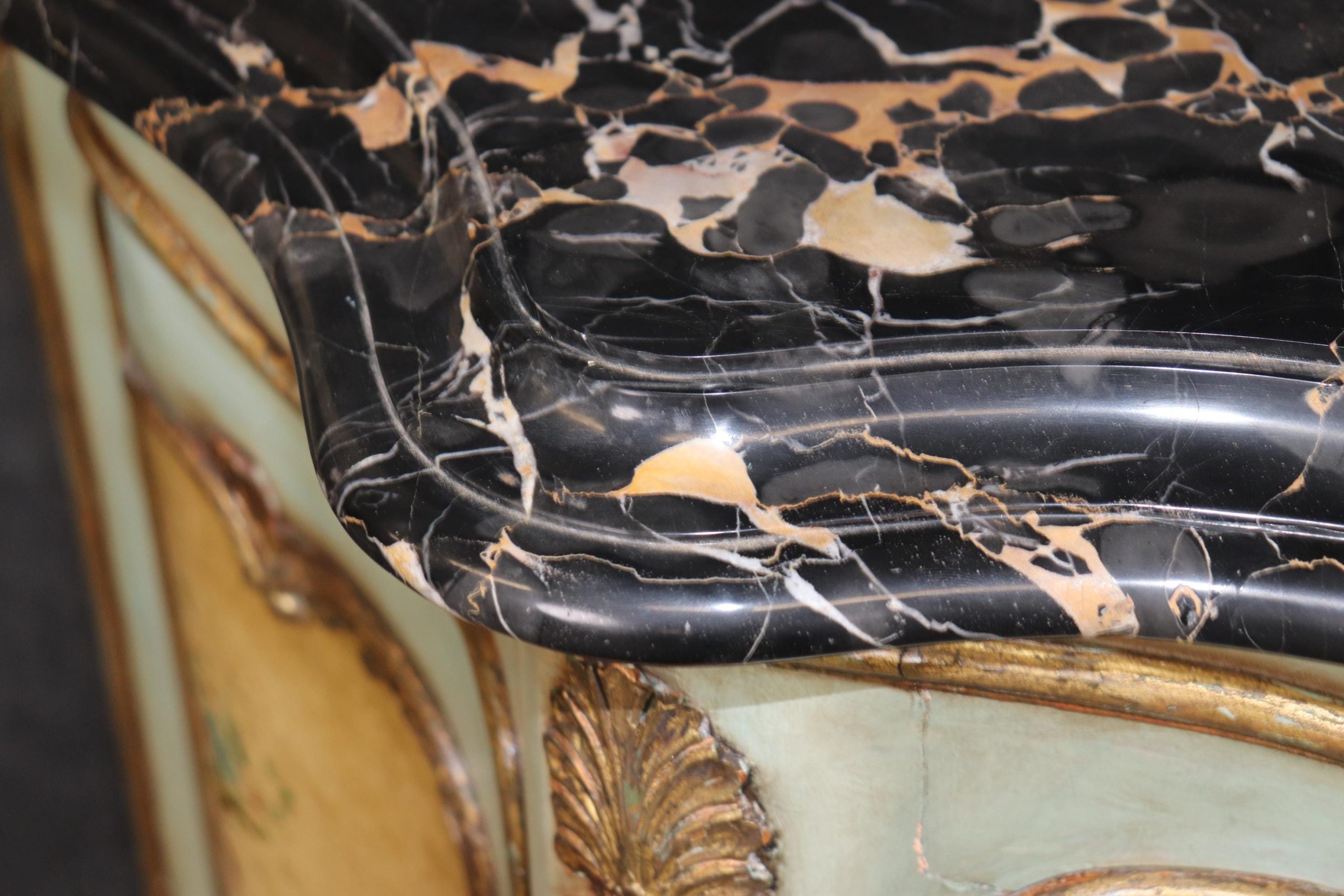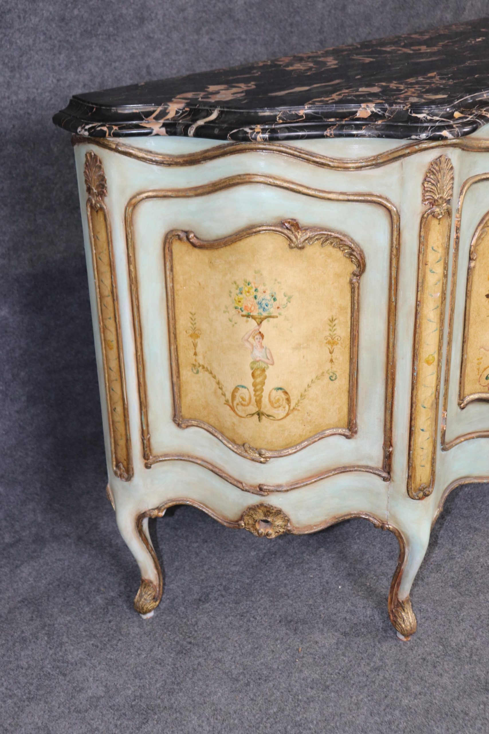 This antique Italian Venetian style paint decorated commode is made of the highest quality and is done very nicely! If you look at the photos provided, you will see the beautiful Italian Potoro marble top (One of the rarest and most expensive marbles in the world) and paint decoration. This commode is perfect for any living room, bedroom, office or entryway and combines elegance with functionality. With two doors opening to a large storage area with a shelf makes this piece perfect for storing any of your personal belongings This piece will most certainly be a conversation starter and add a sense of luxury into your home! Antique furniture and vintage pieces have stood the test of time and this commode is no exception! With its quality materials and great craftsmanship this is bound to last you and your family for many years to come. The commode is in good condition with minor surface scratching and minor finish loss as to be expected with age. The marble has been repaired, but otherwise good condition.