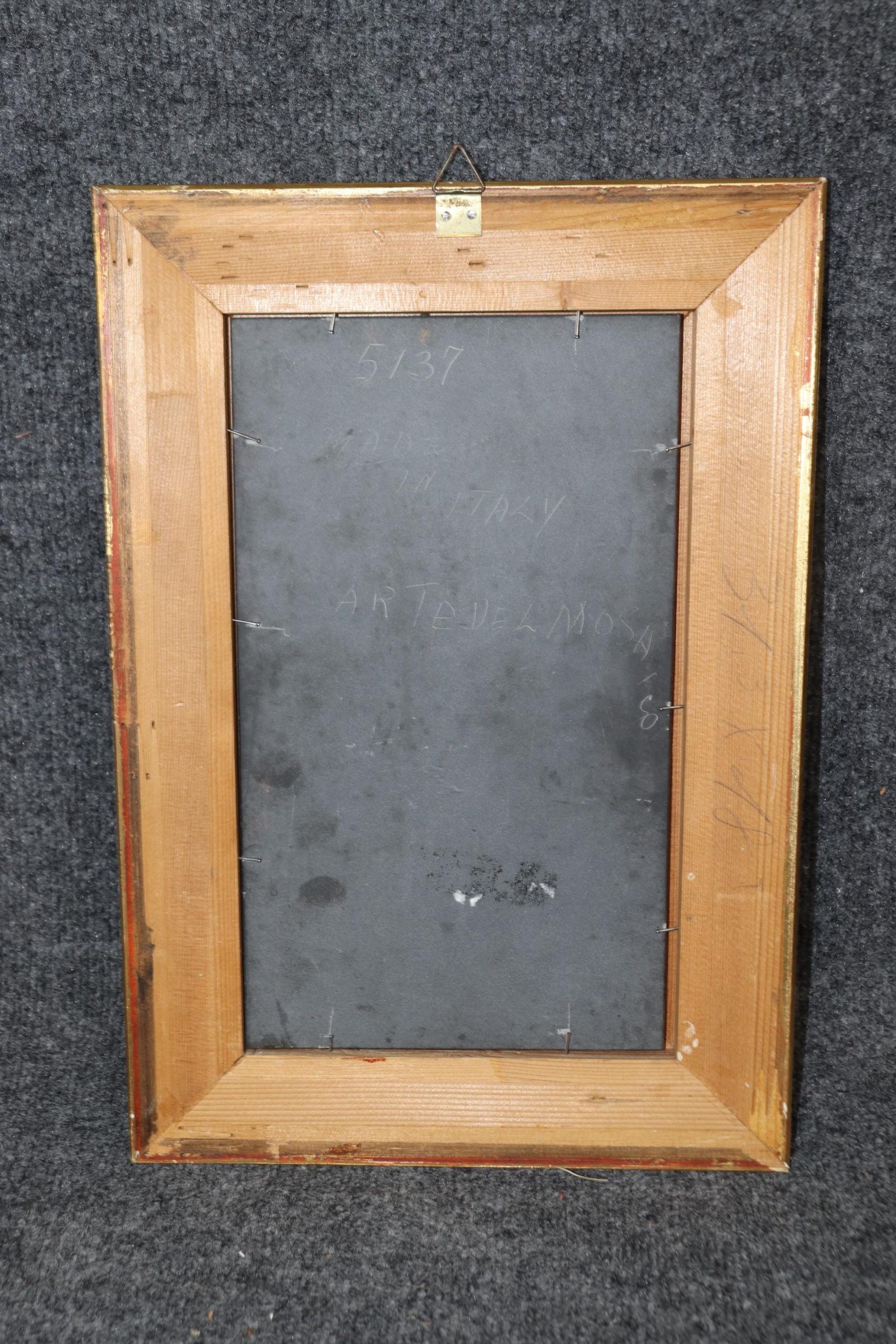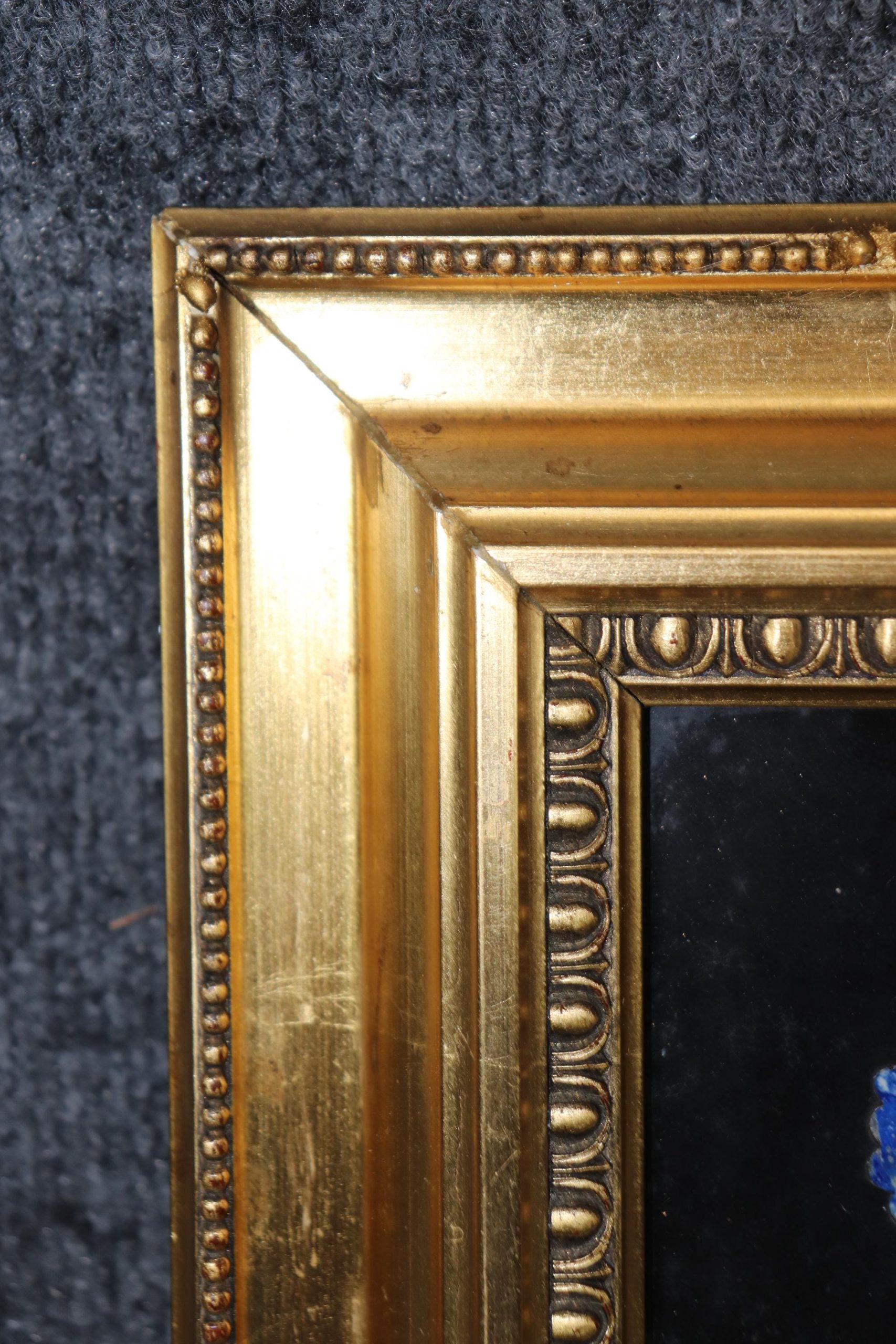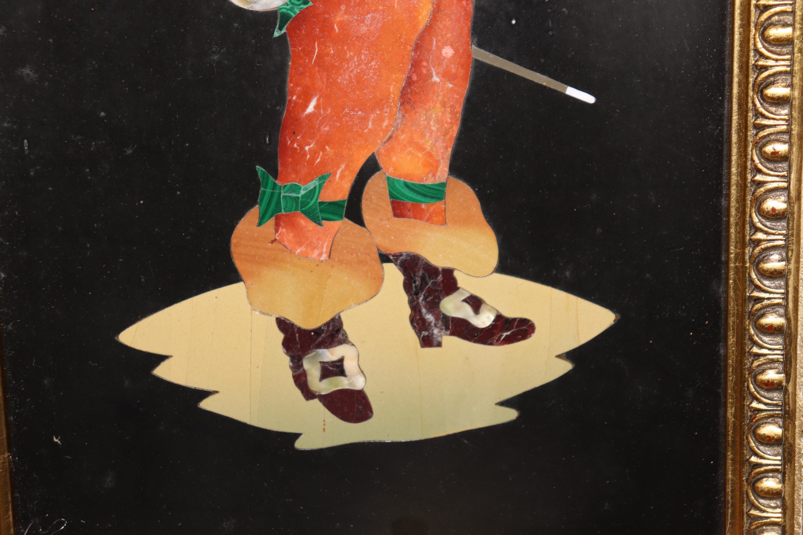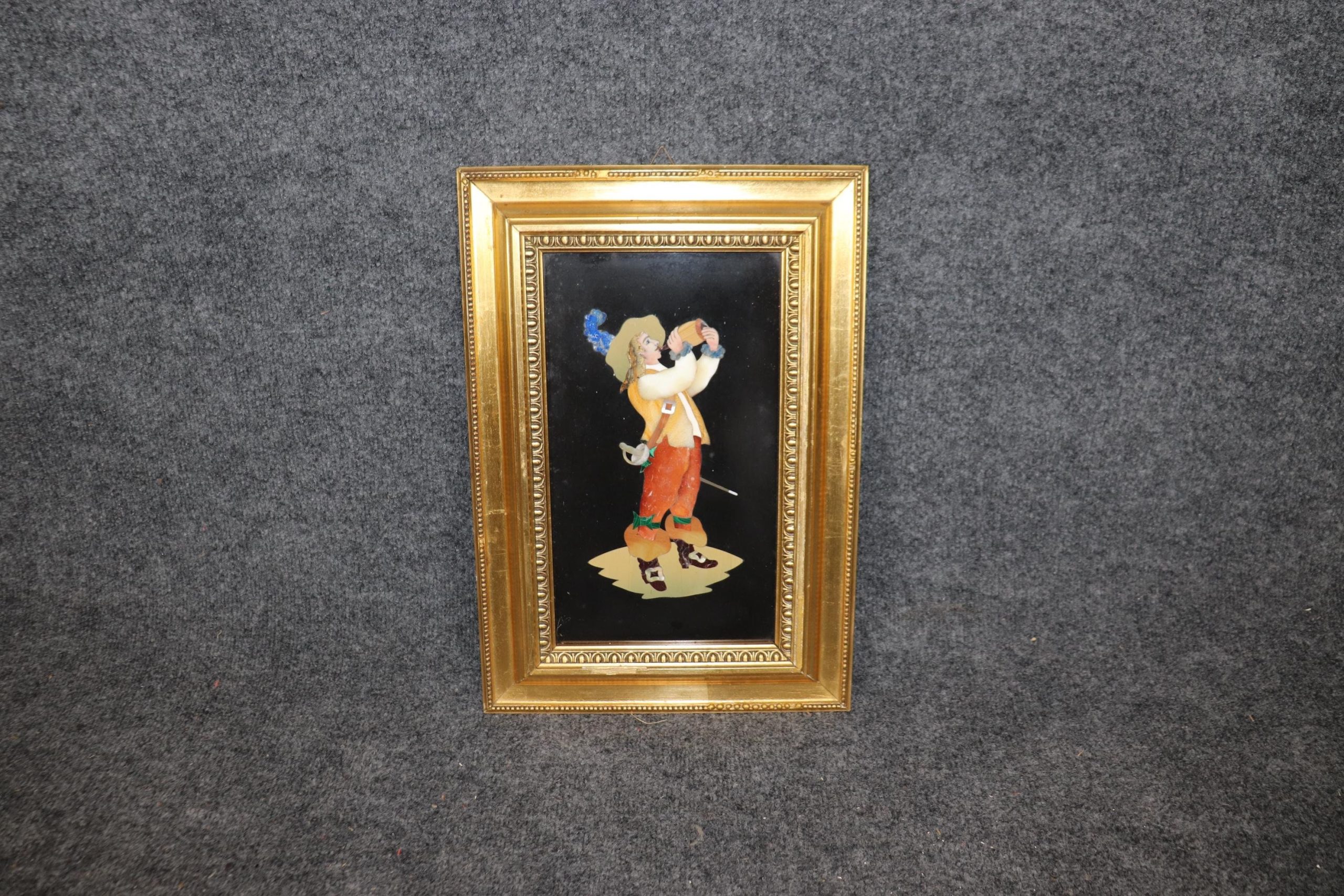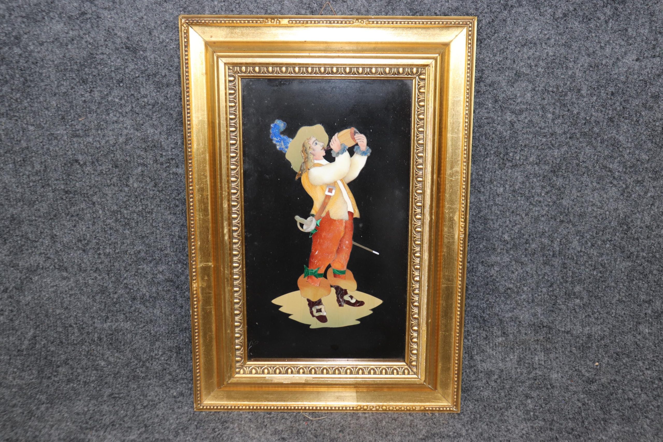 The plaque is framed in a gilded, carved wood frame, adding a layer of opulence and refinement to the piece. The frame’s intricate carvings and rich gold gilt finish complement the artistry of the Pietra Dura inlay, creating a harmonious balance between the decorative stonework and the frame. The gilding enhances the overall aesthetic, bringing out the vivid colors of the inlay while lending a sense of grandeur to the piece.