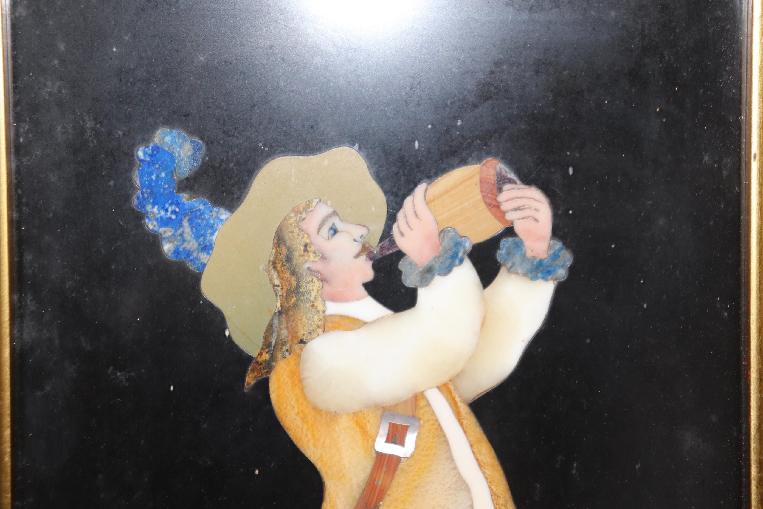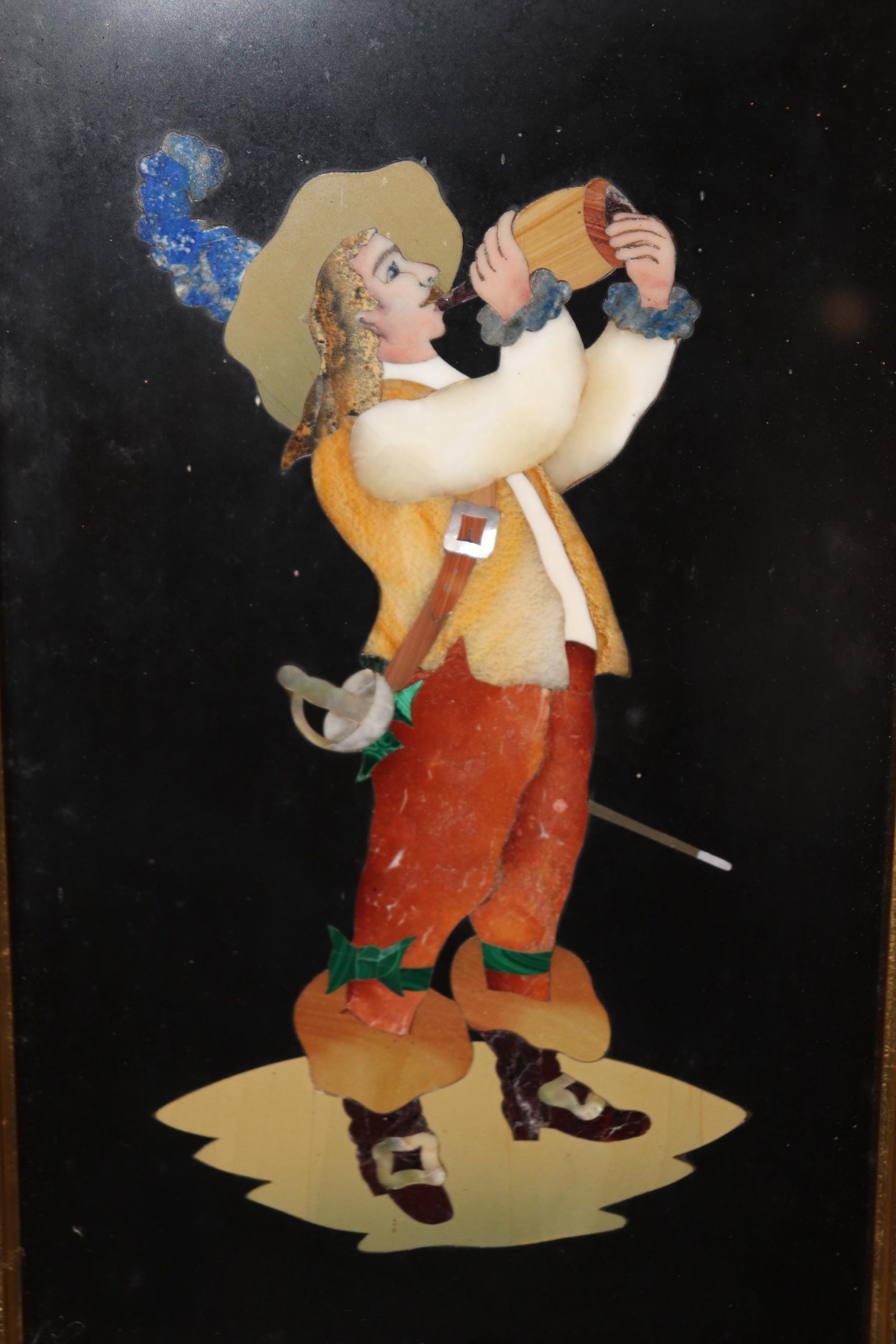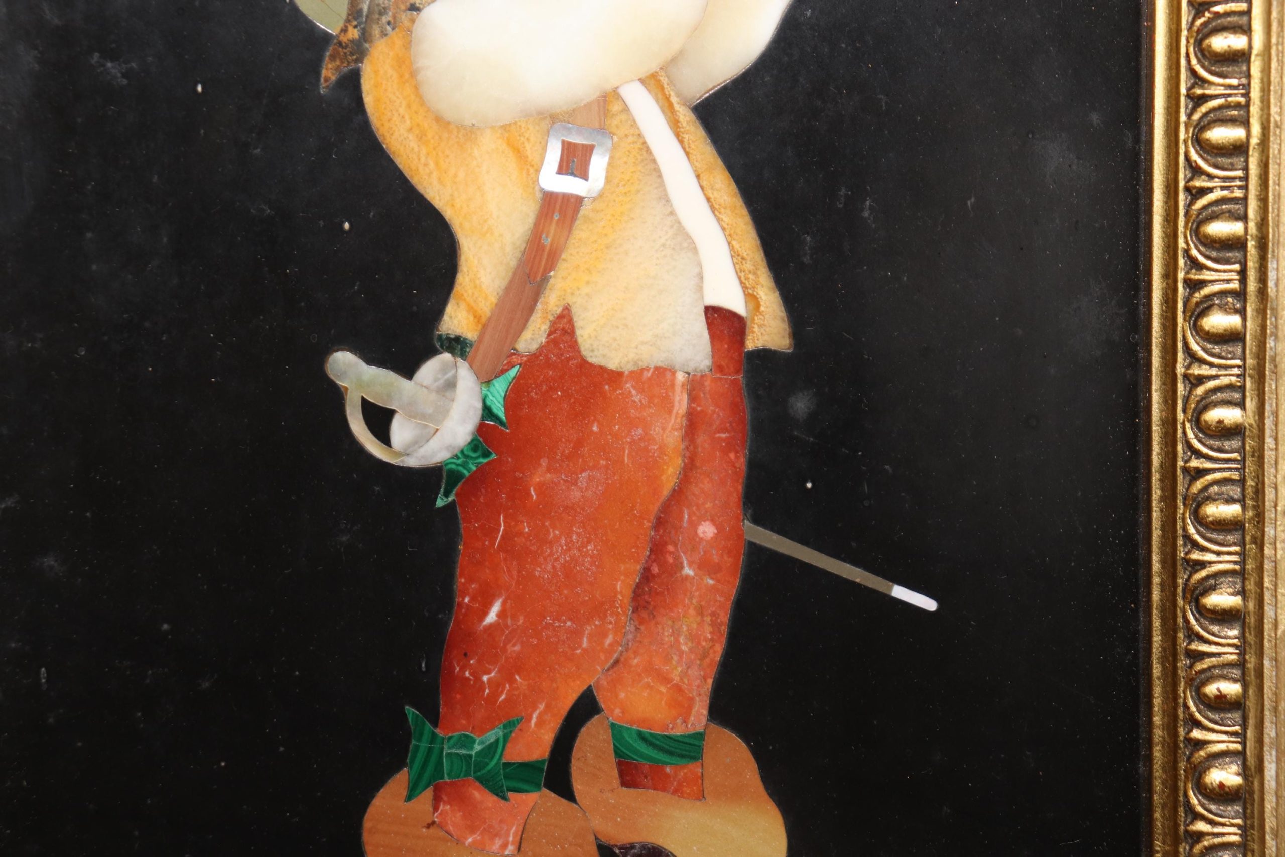The portrait’s vibrant colors and textures are achieved through the careful arrangement of various natural stones, including agate, malachite, lapis lazuli, onyx, and marble, which have been meticulously cut and shaped to form the face, attire, and surroundings of the figure. The Spaniard is depicted with striking realism, showcasing the mastery of the artist and the painstaking labor required to complete this exceptional work.